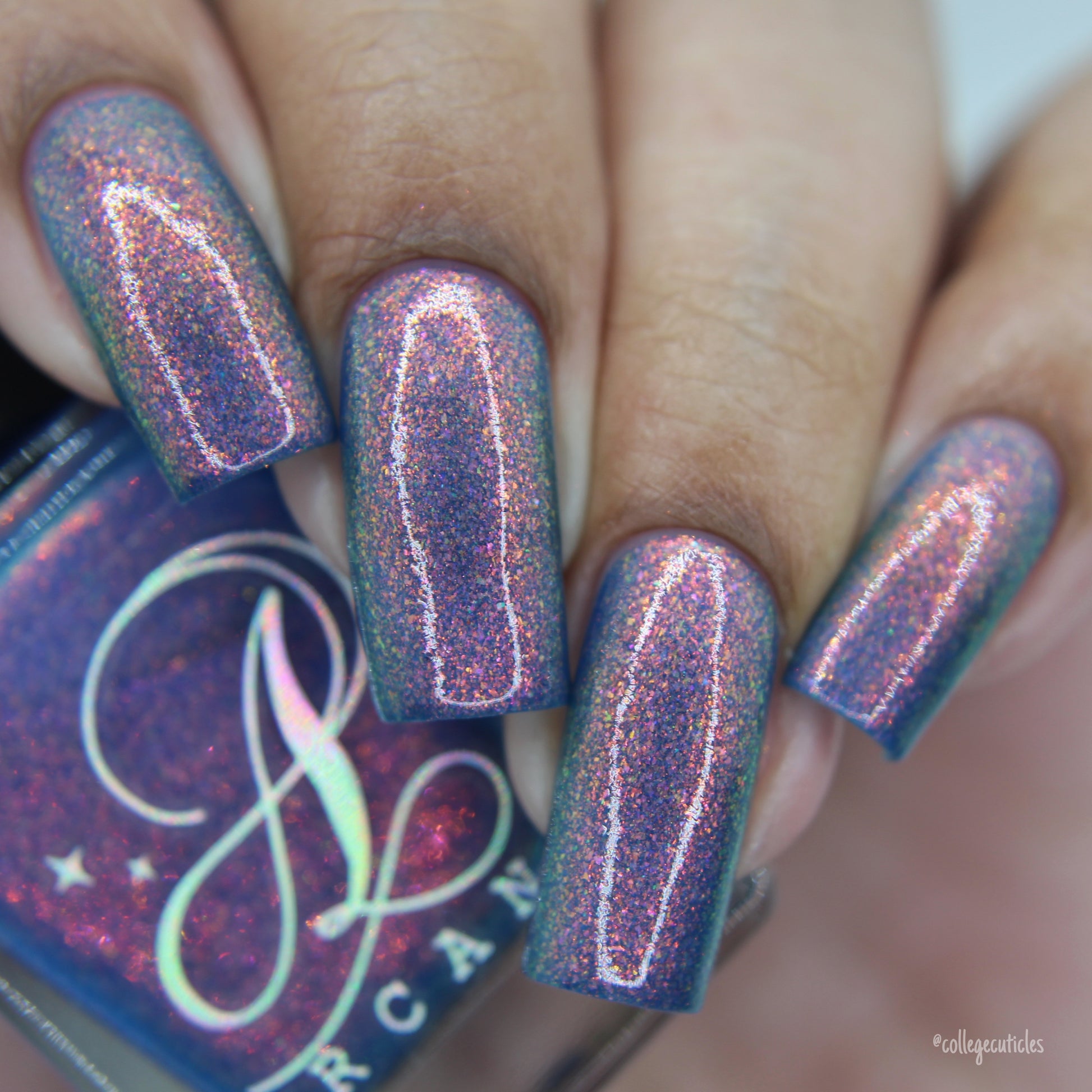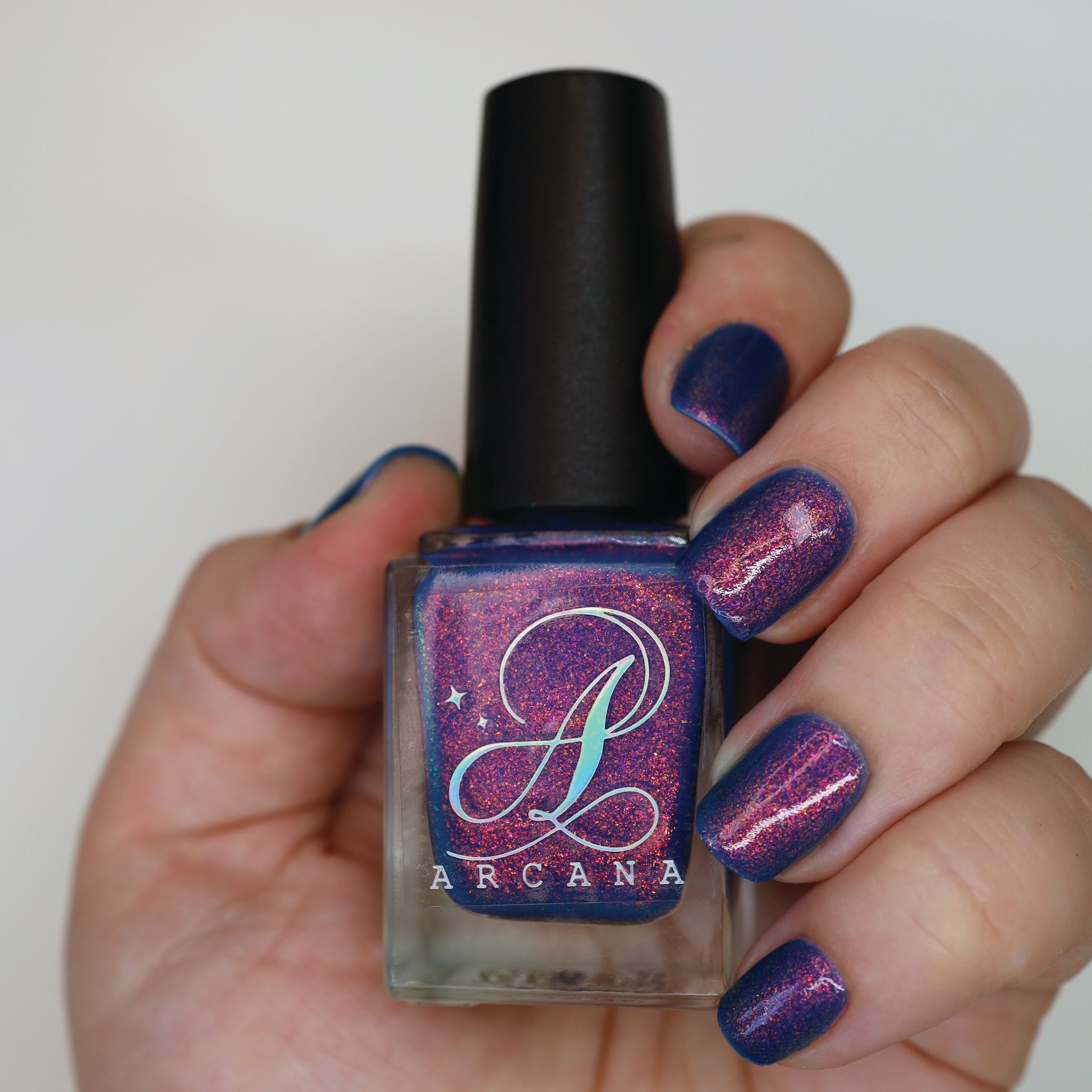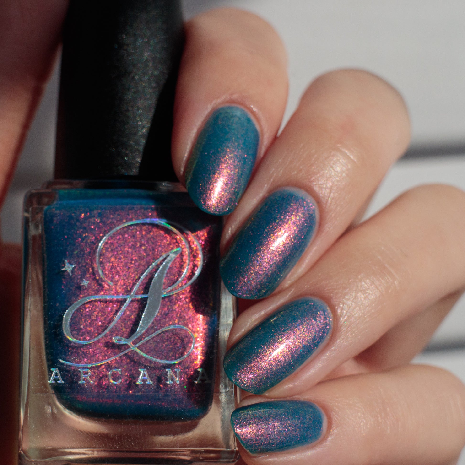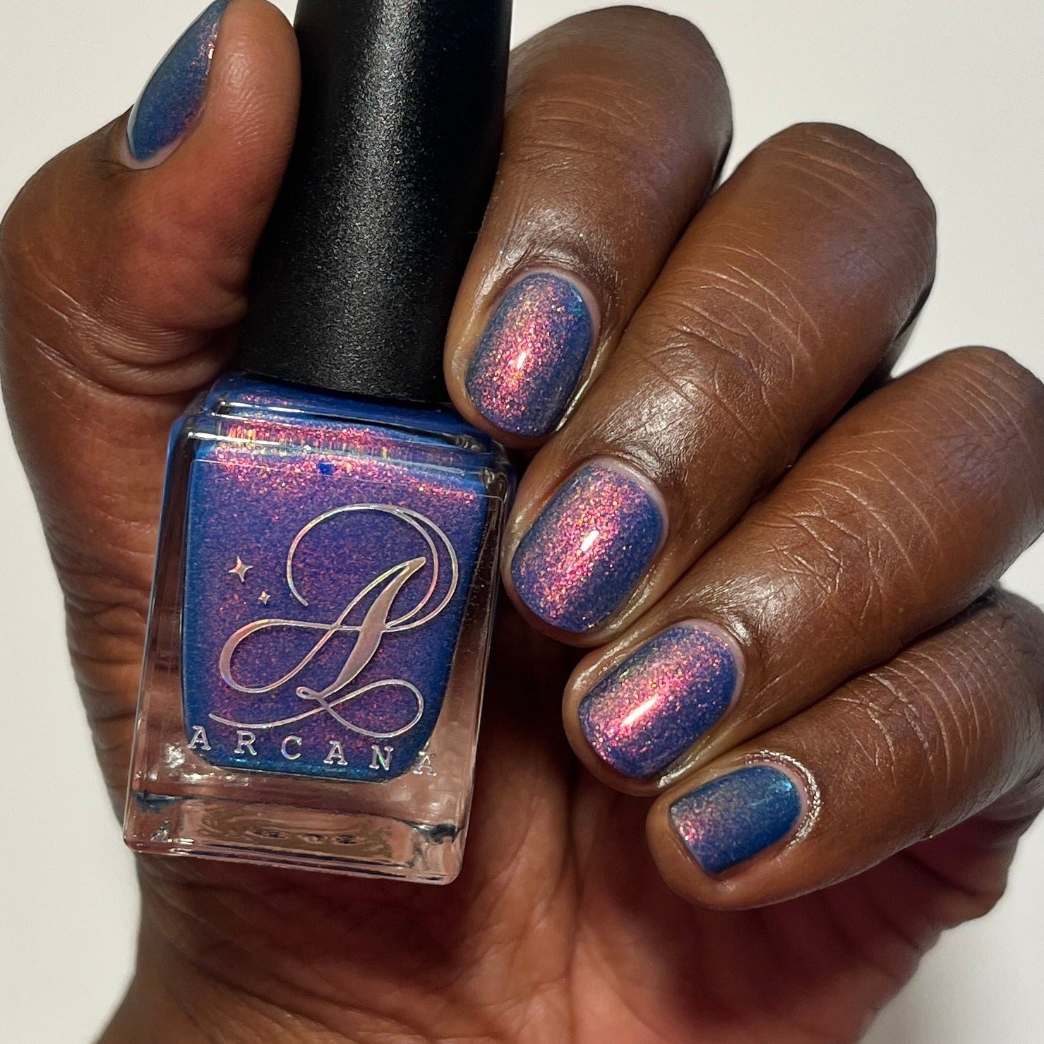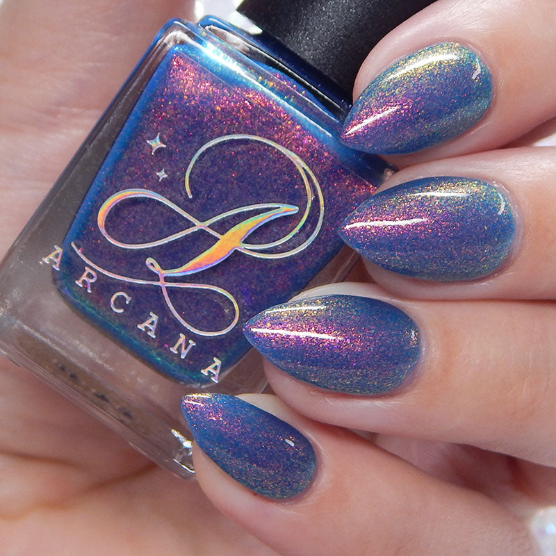 This polish has a neon blue base with pink-orange-yellow large particle shimmer!