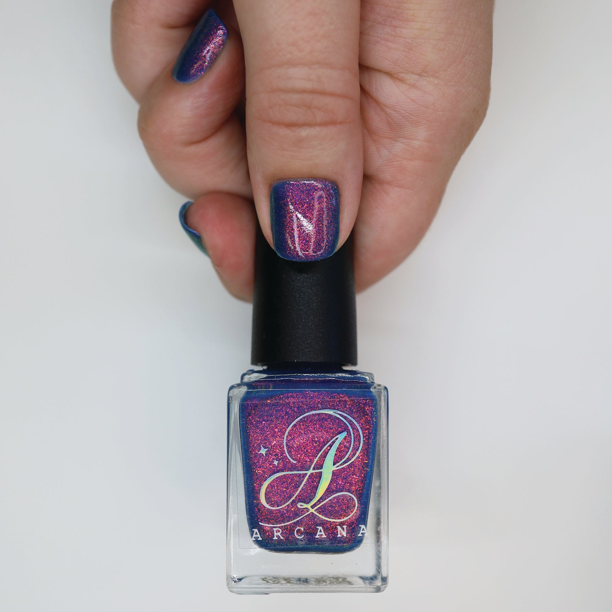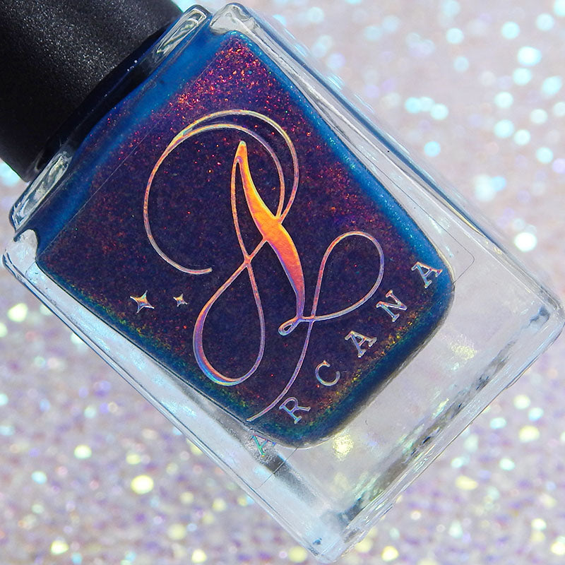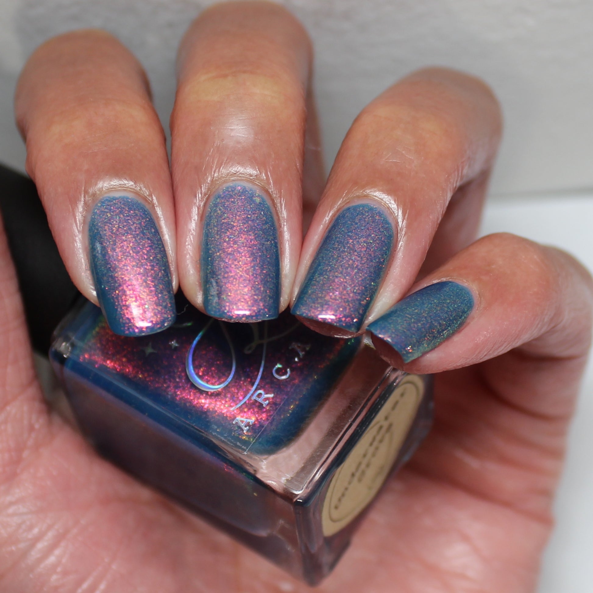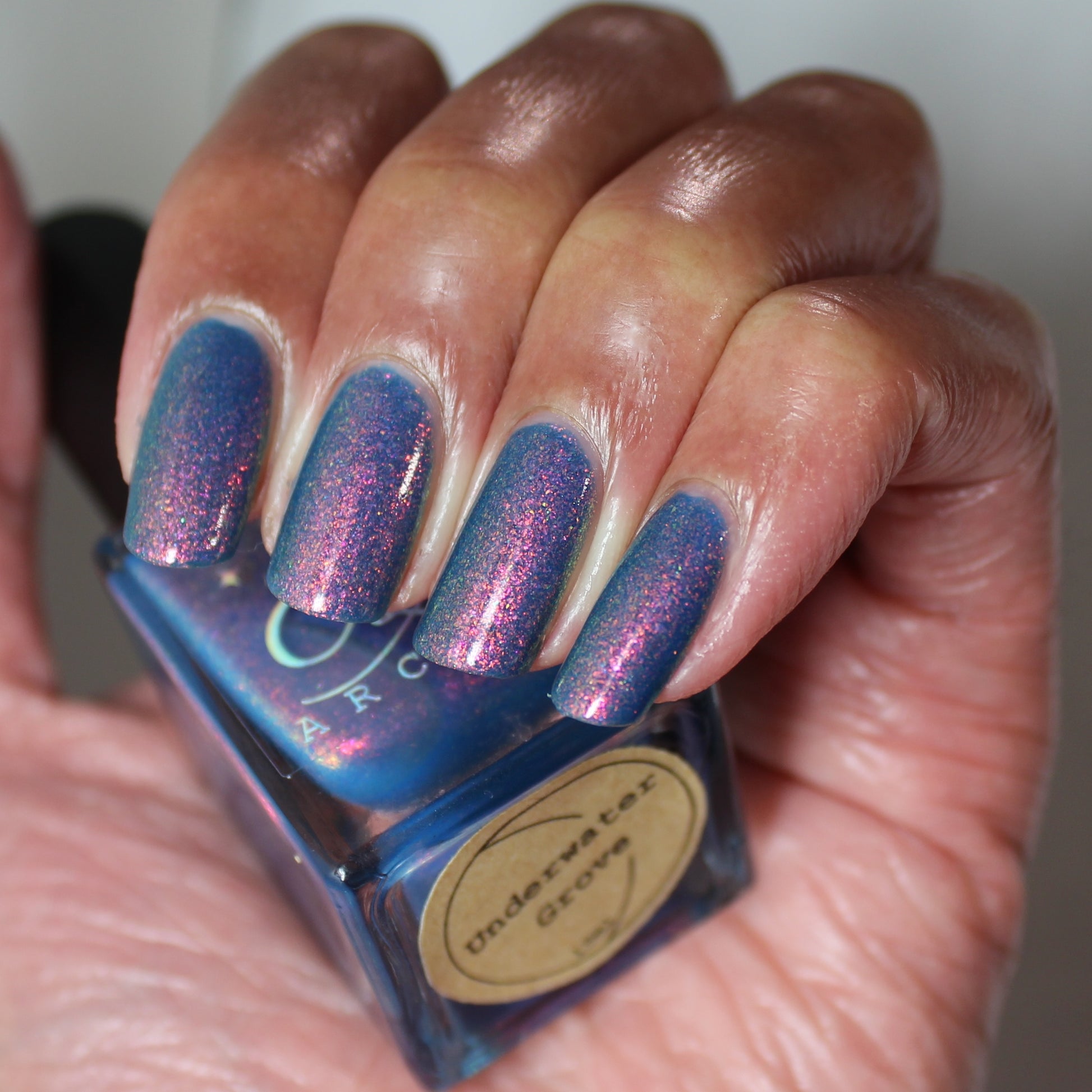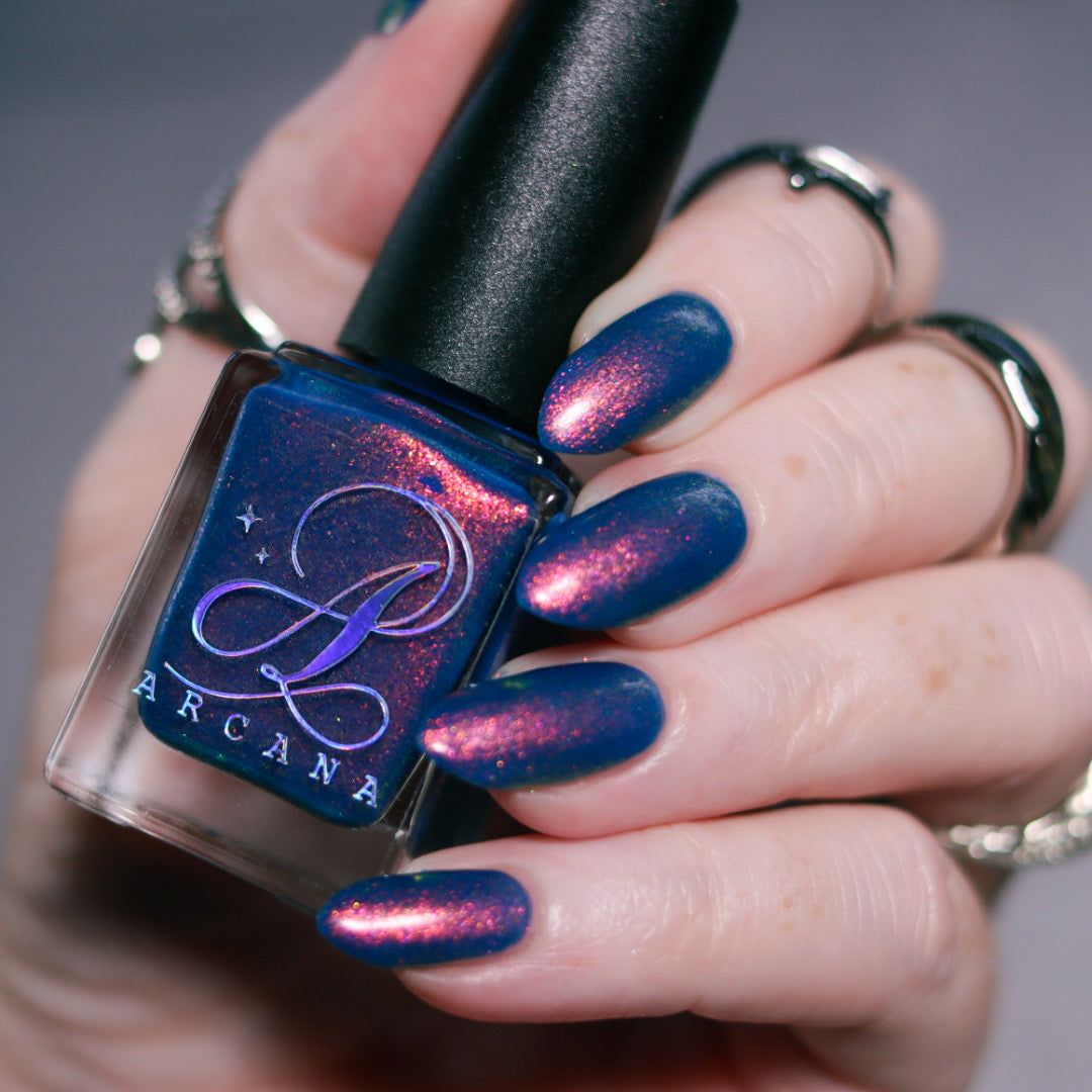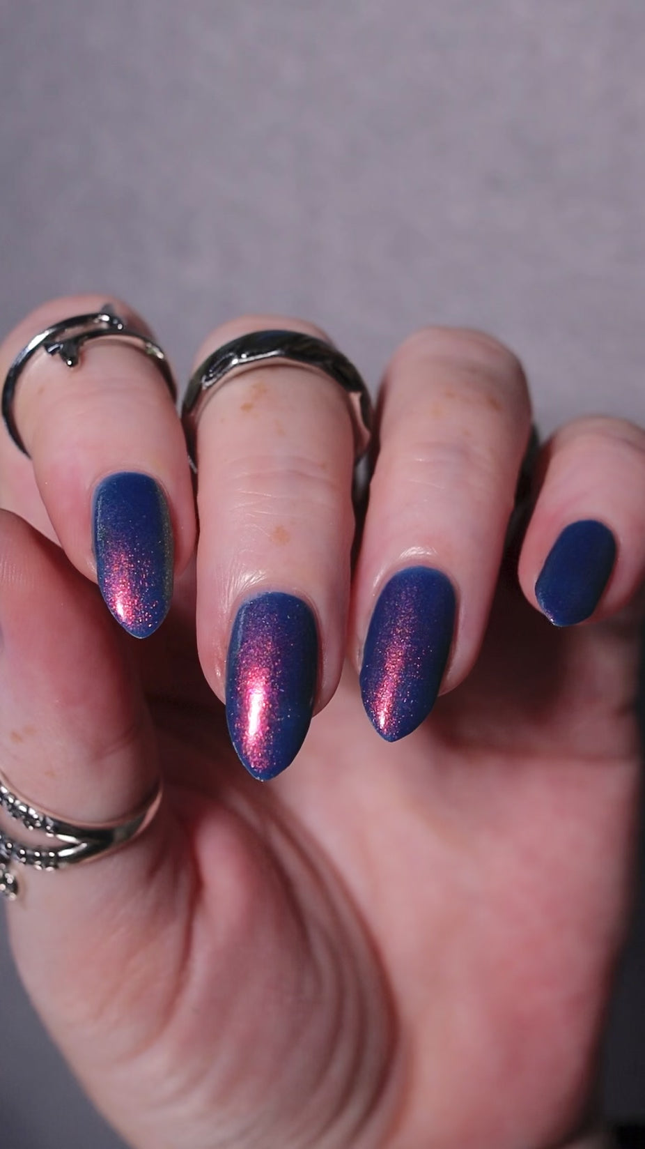 This polish has a neon blue base with pink-orange-yellow large particle shimmer!