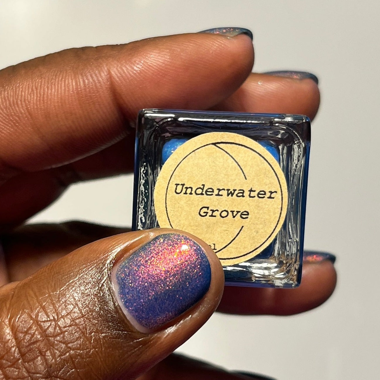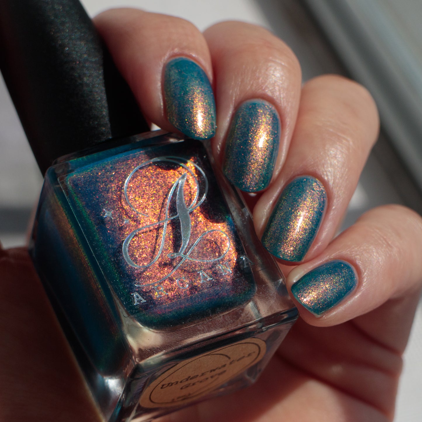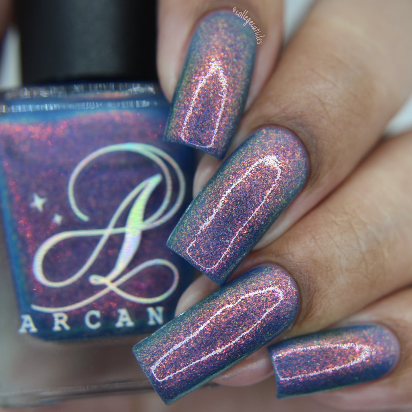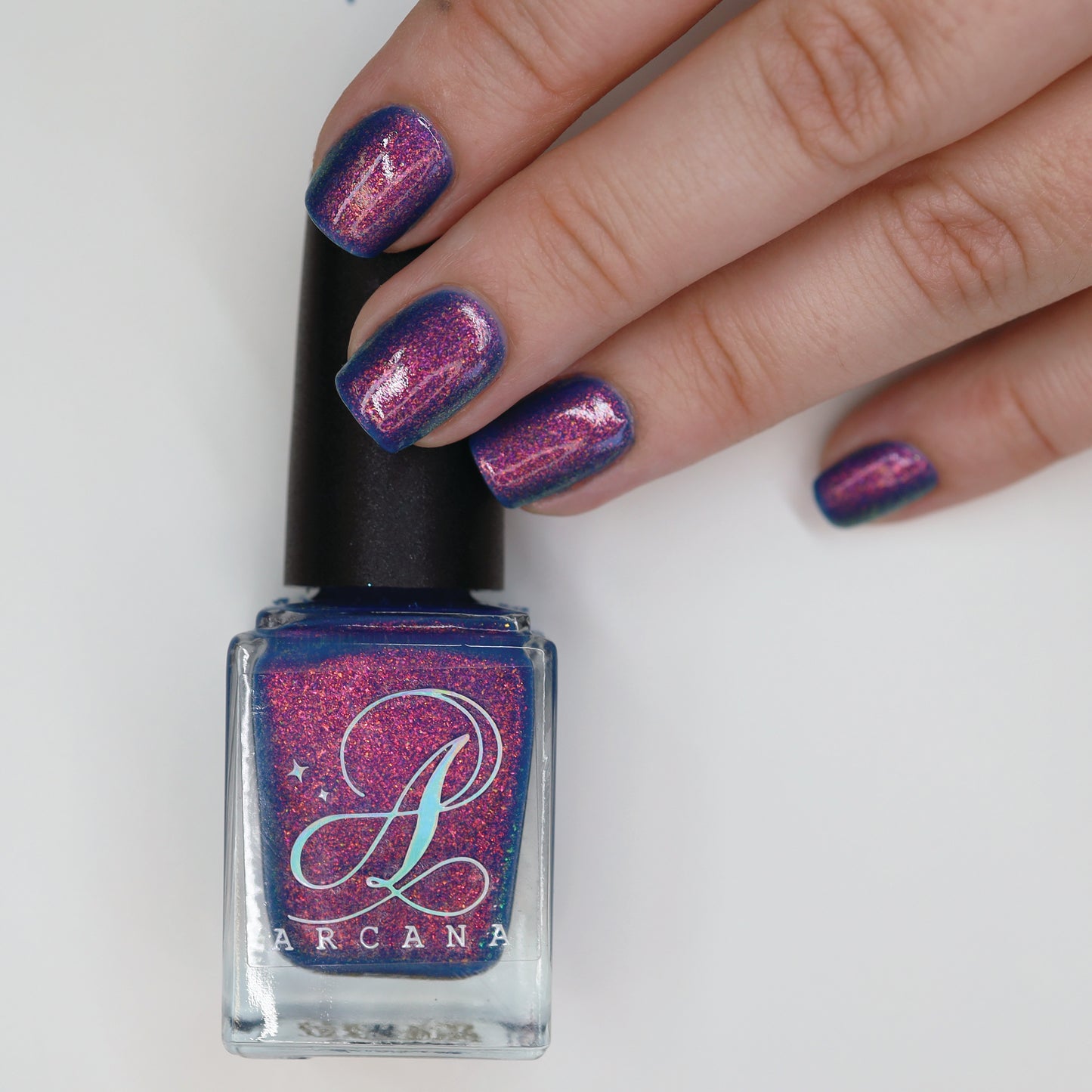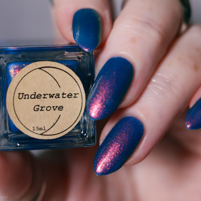 This polish has a neon blue base with pink-orange-yellow large particle shimmer!