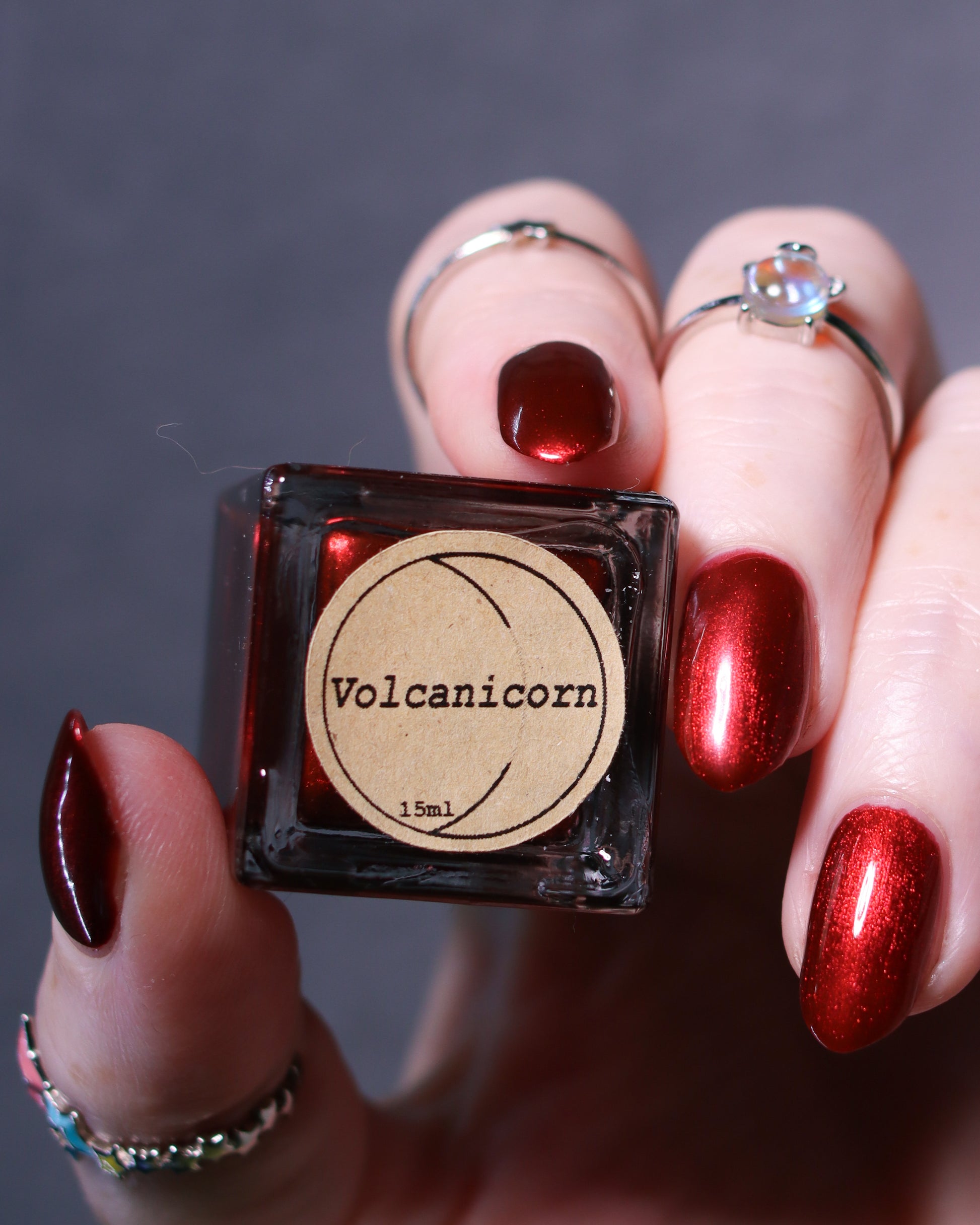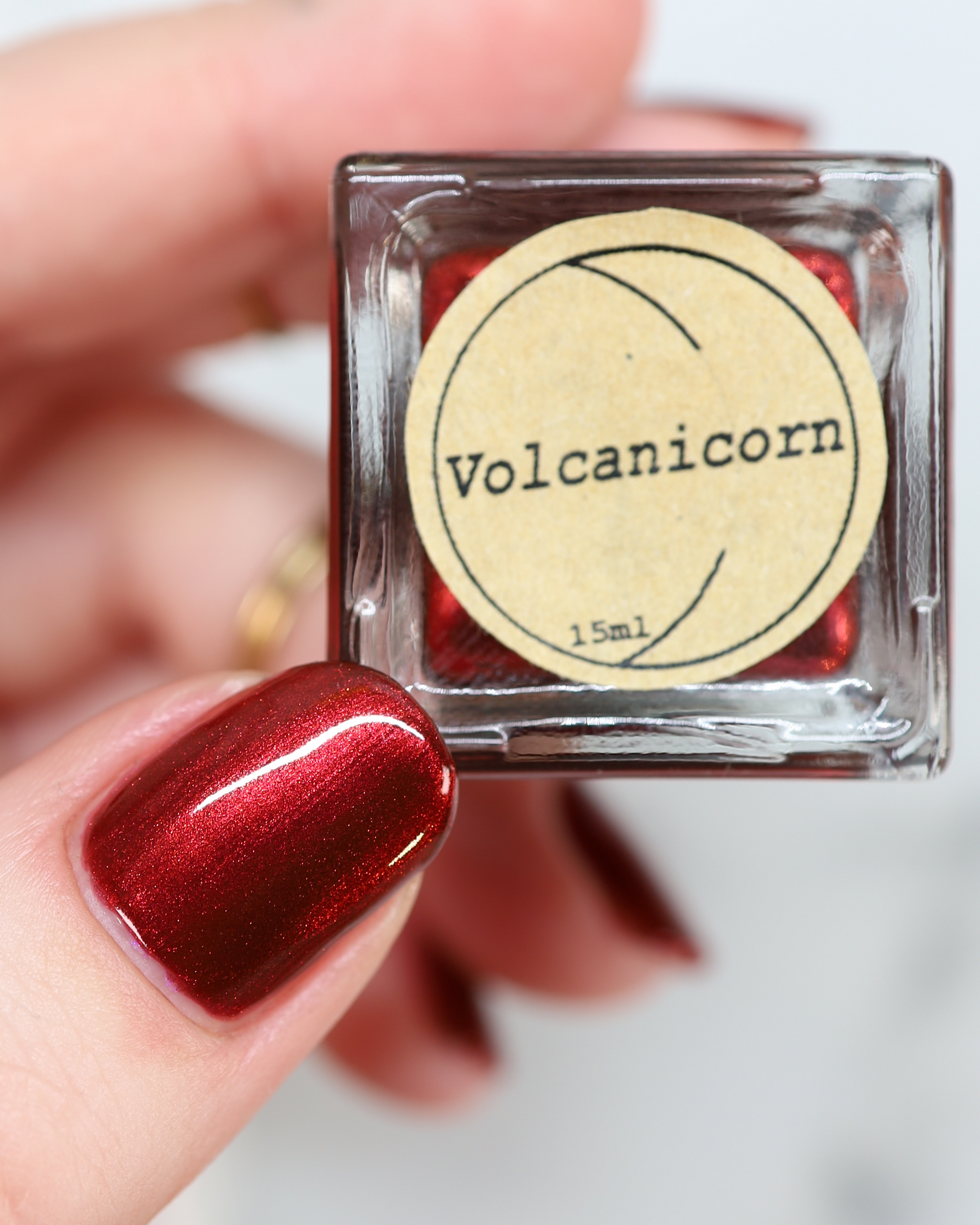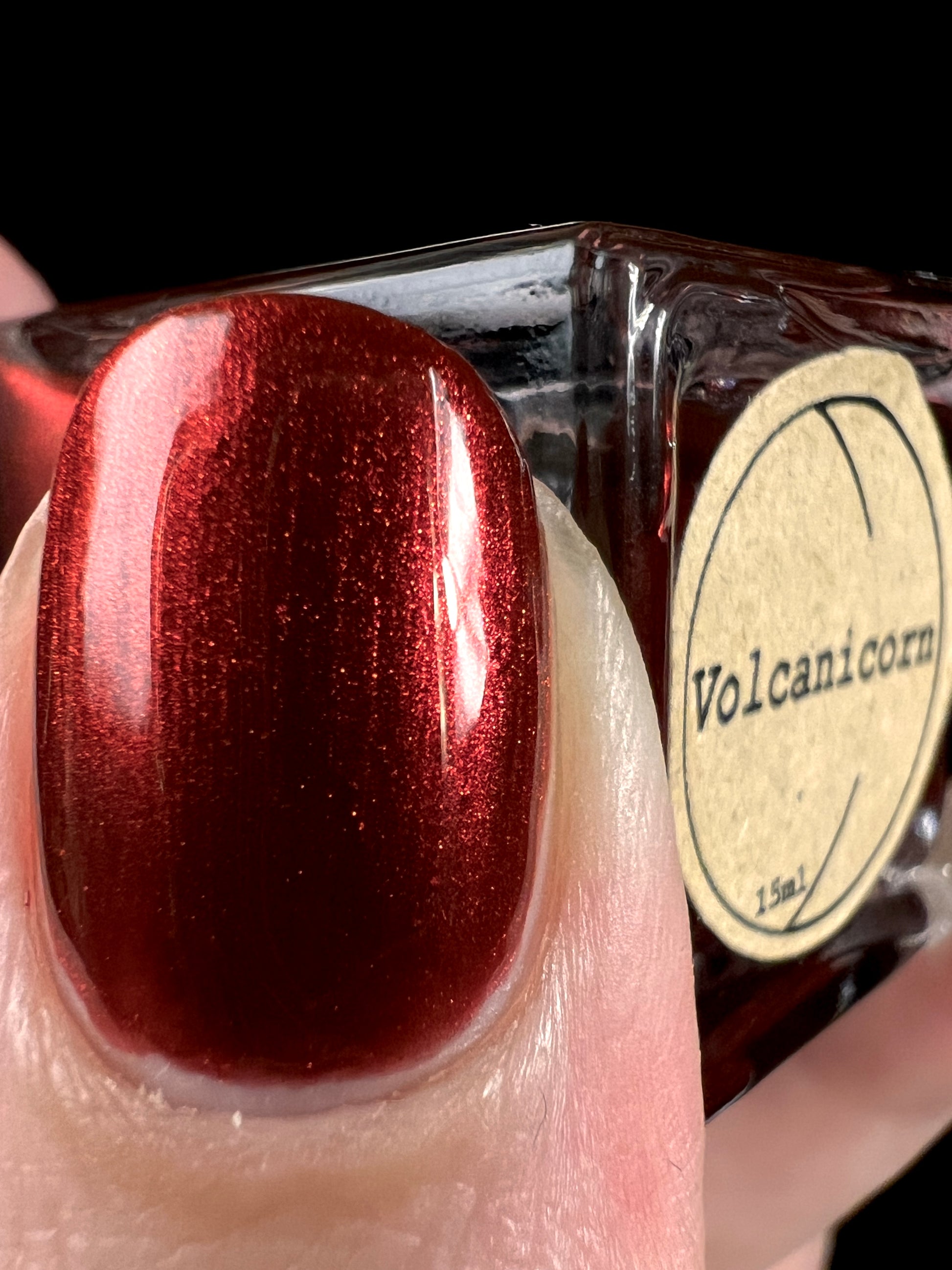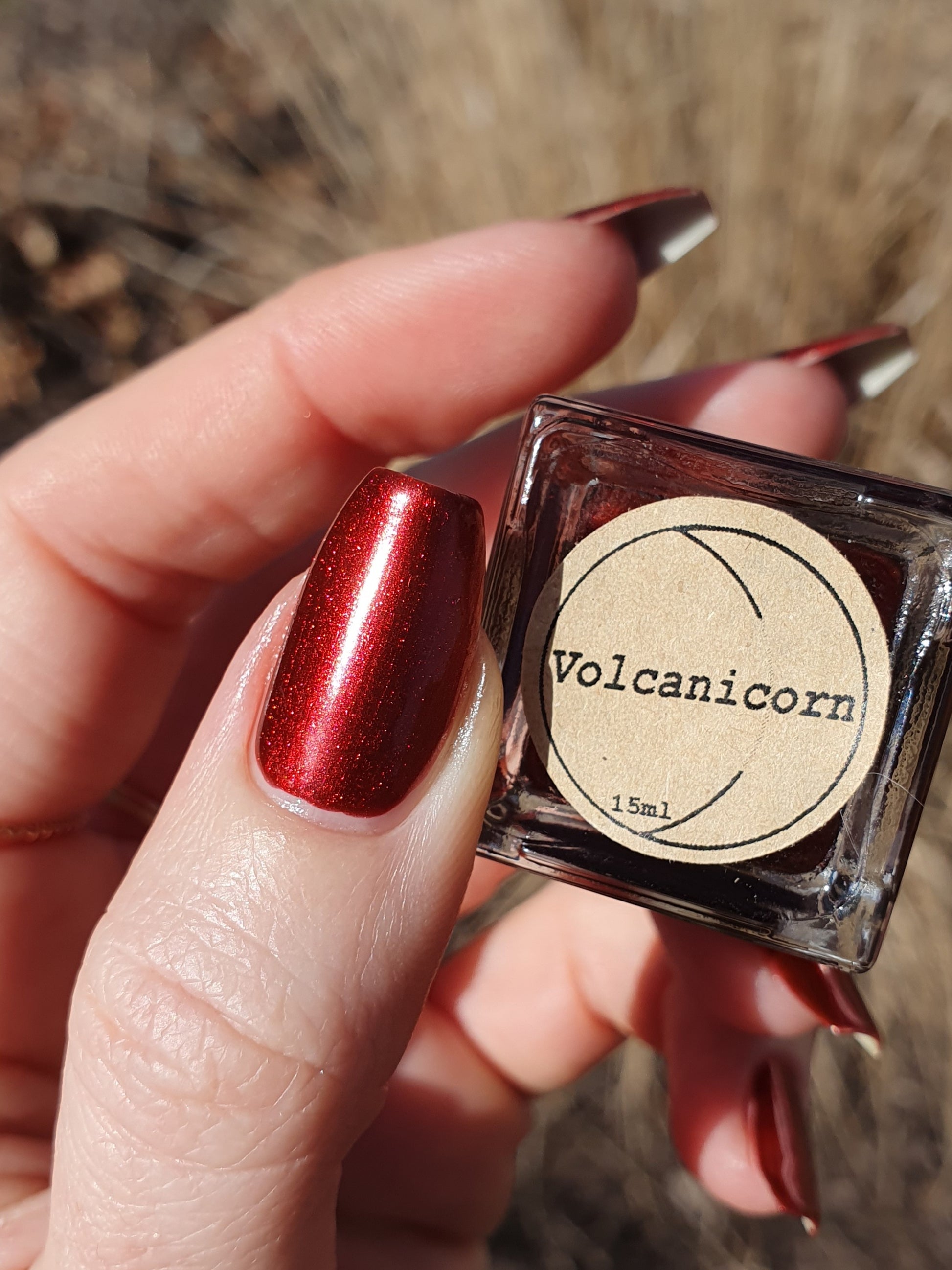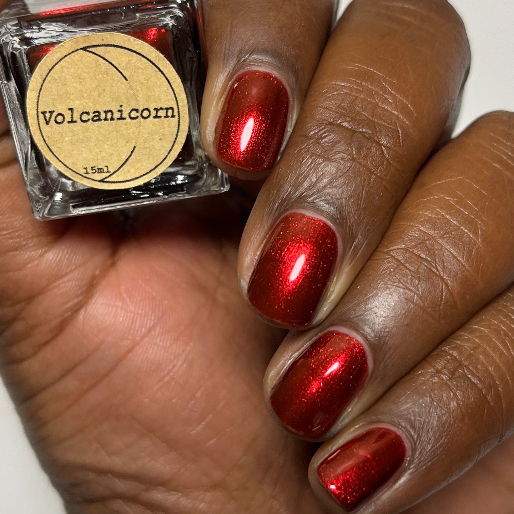 Volcanicorn has a dark red base with a red pearlescent shimmer!