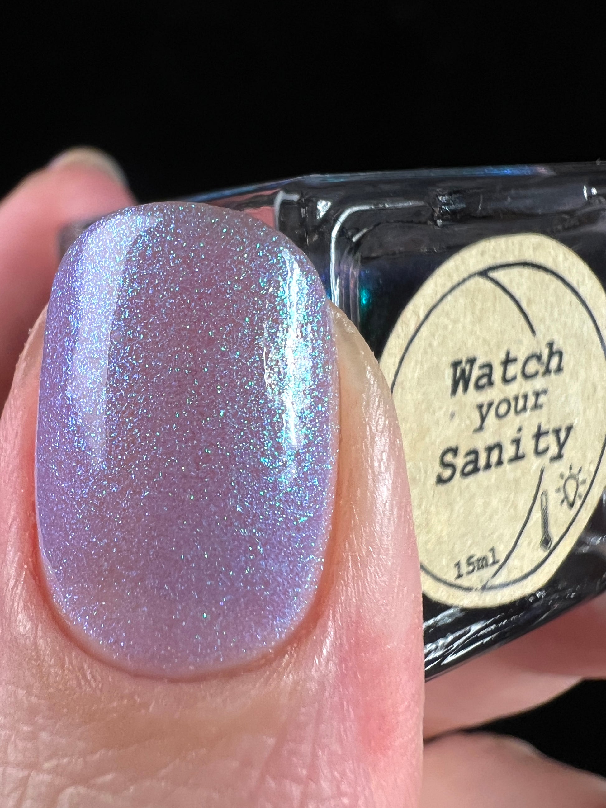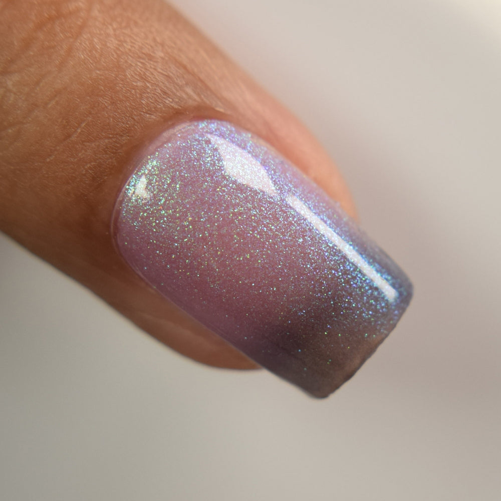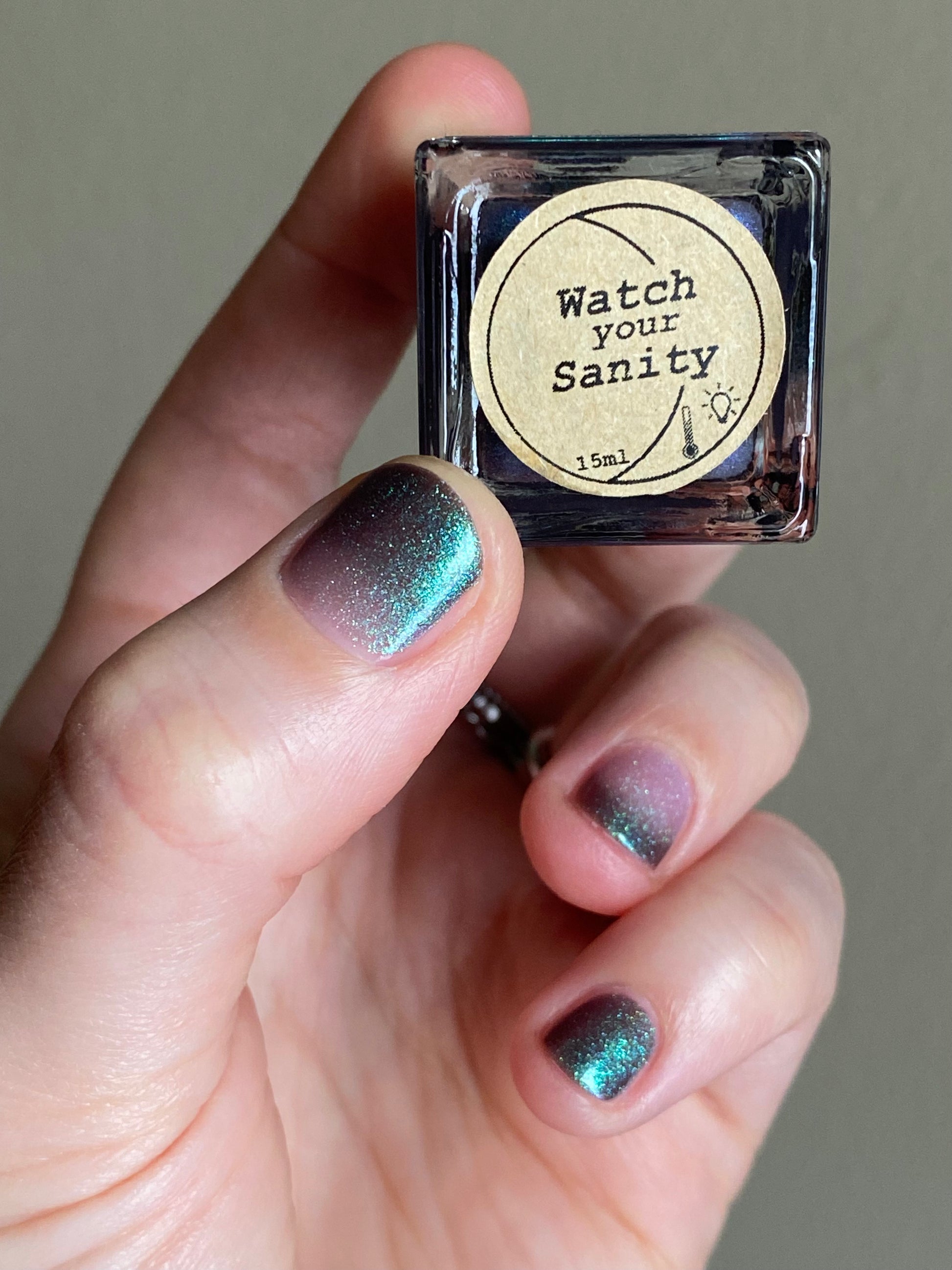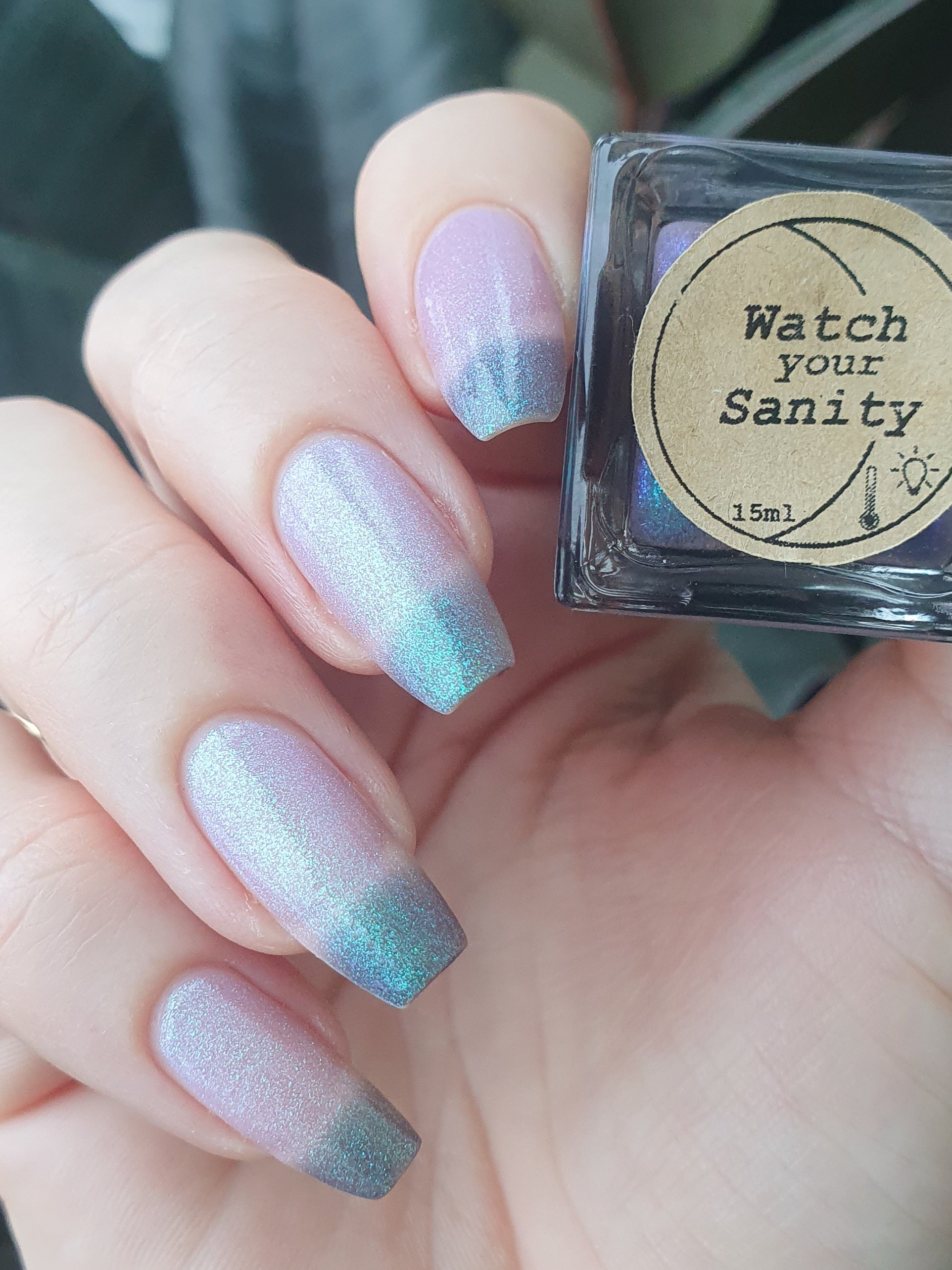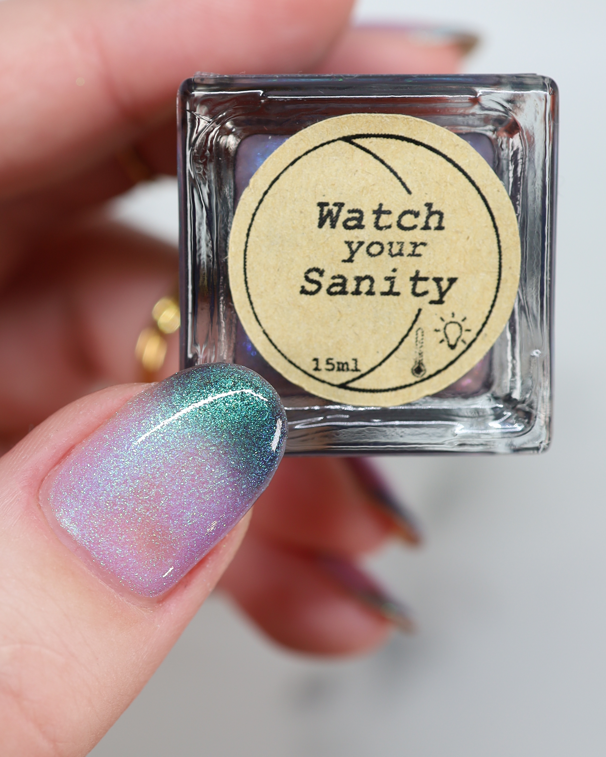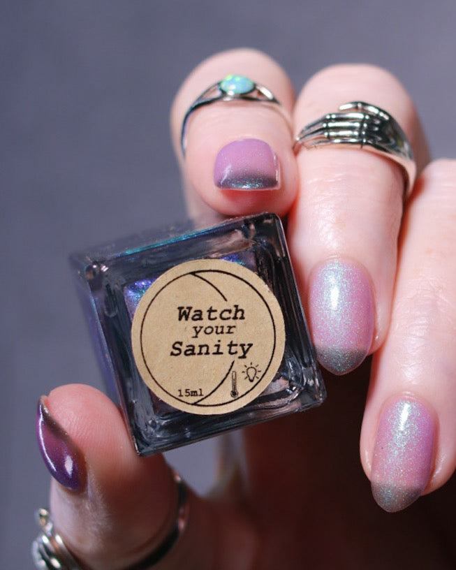 Watch your Sanity is a thermal glow in the dark polish that goes from light pinkish/purple (warm) to very dark purple (cold) with purple glow in the dark pigment and green to blue to purple large particle shimmer!