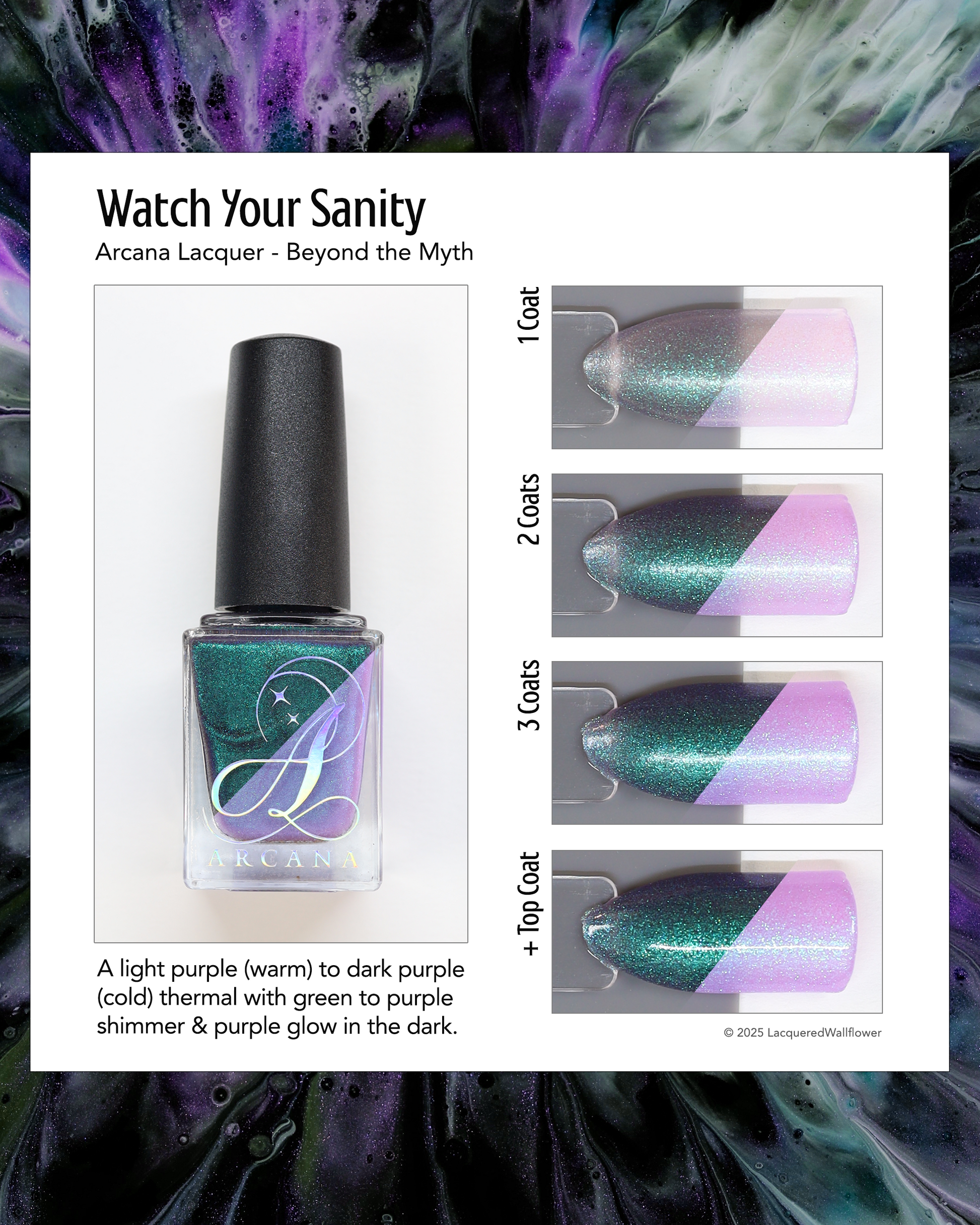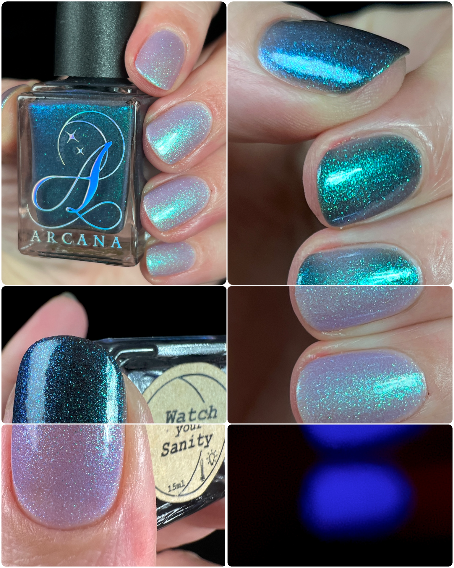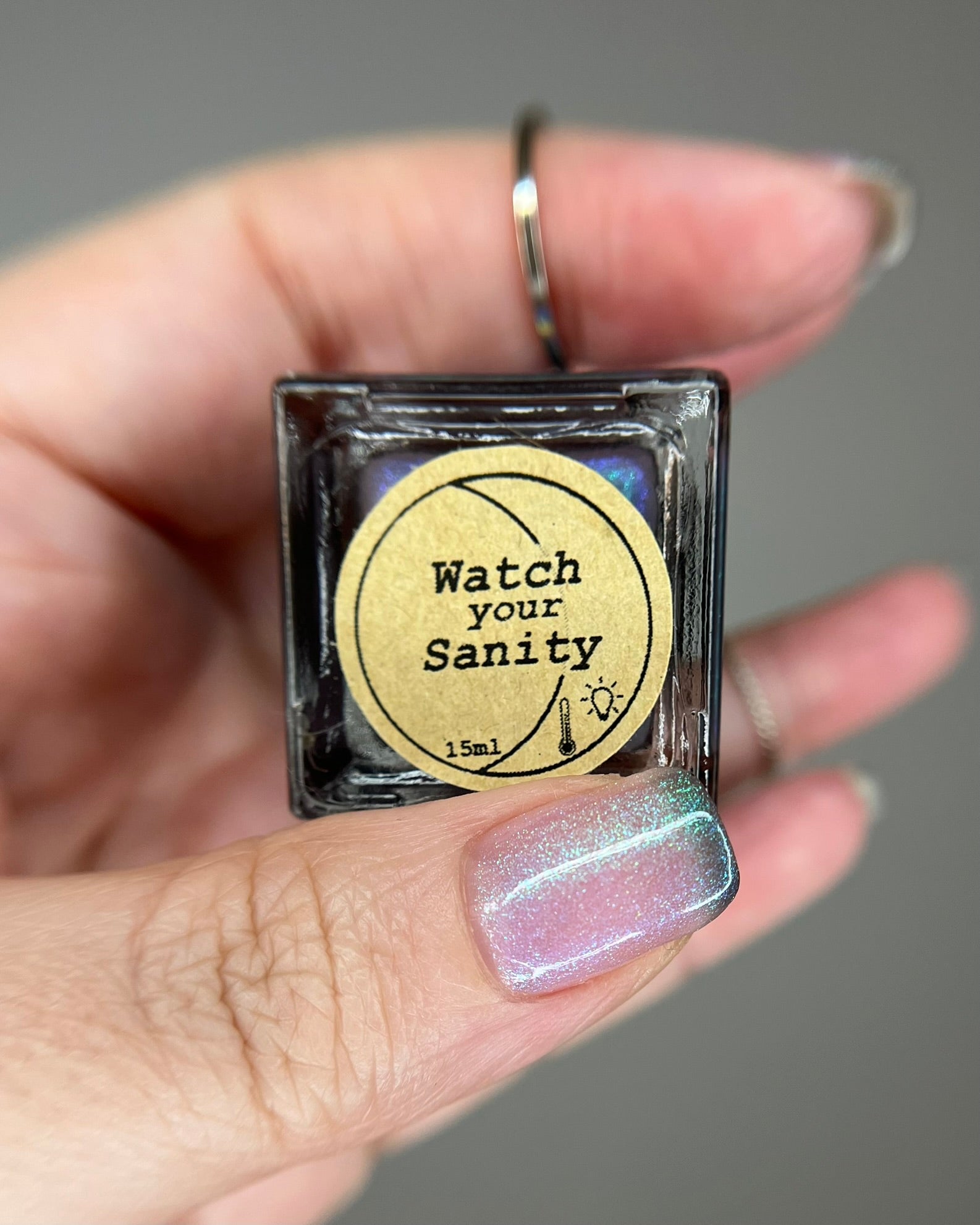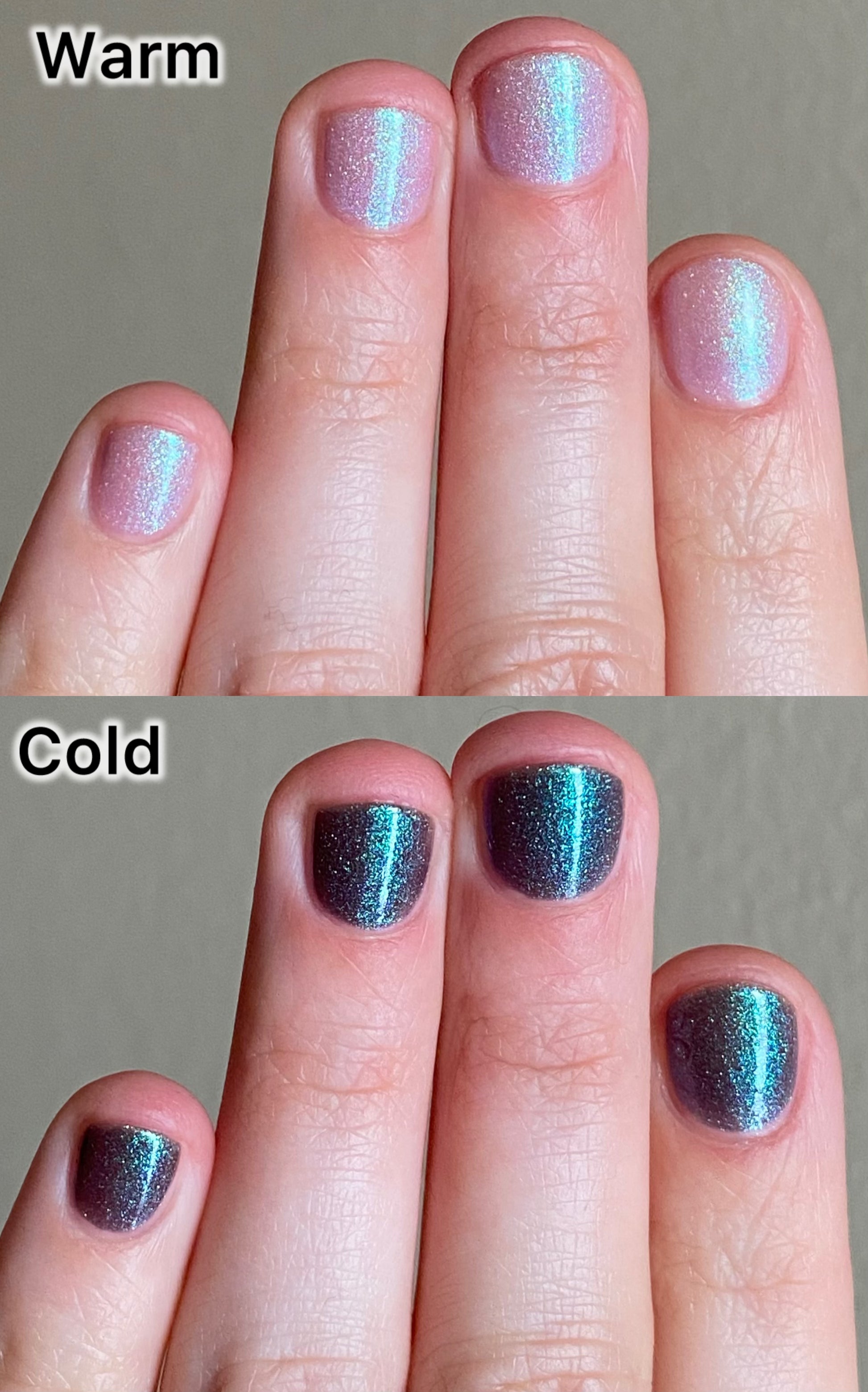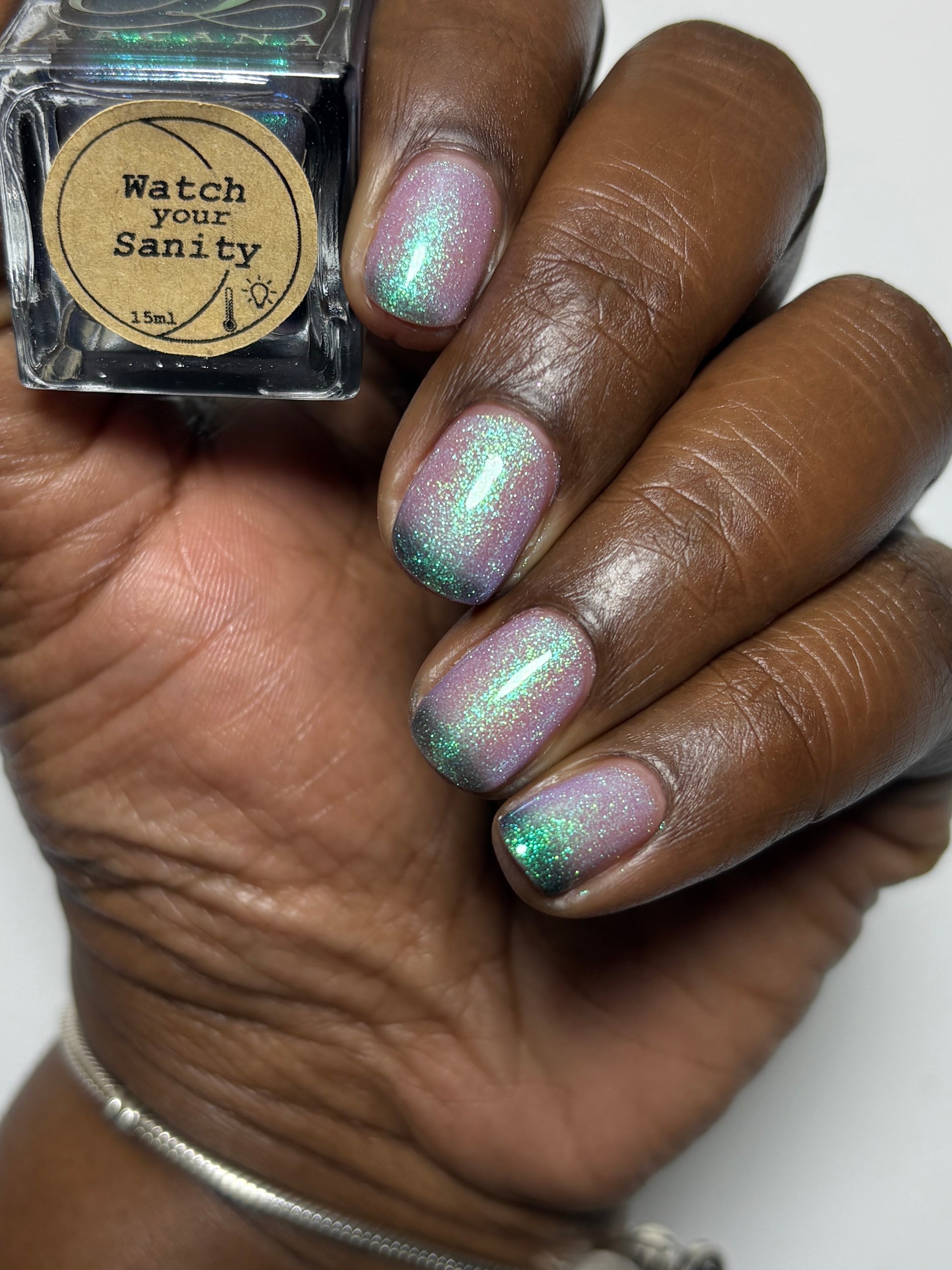 Watch your Sanity is a thermal glow in the dark polish that goes from light pinkish/purple (warm) to very dark purple (cold) with purple glow in the dark pigment and green to blue to purple large particle shimmer!