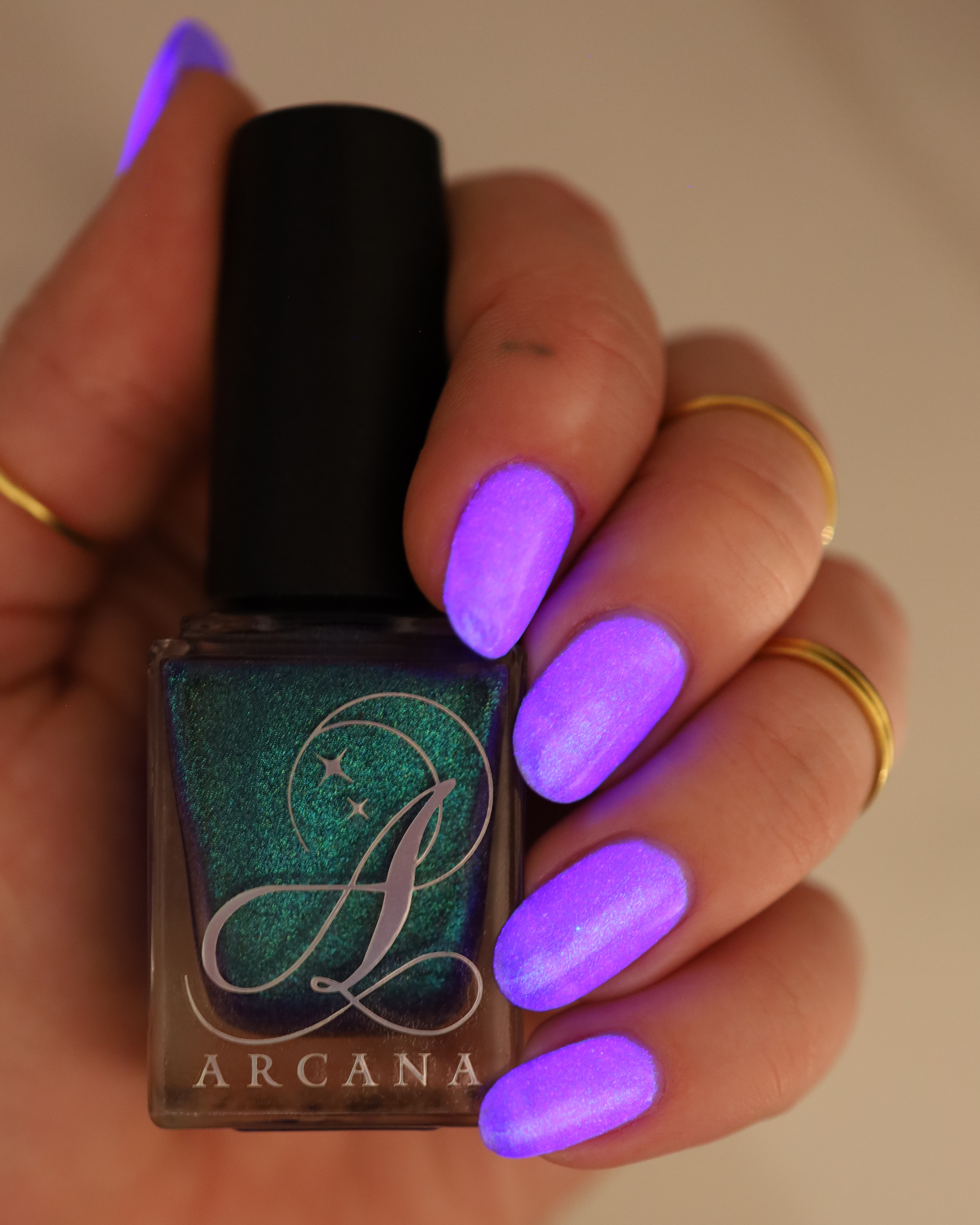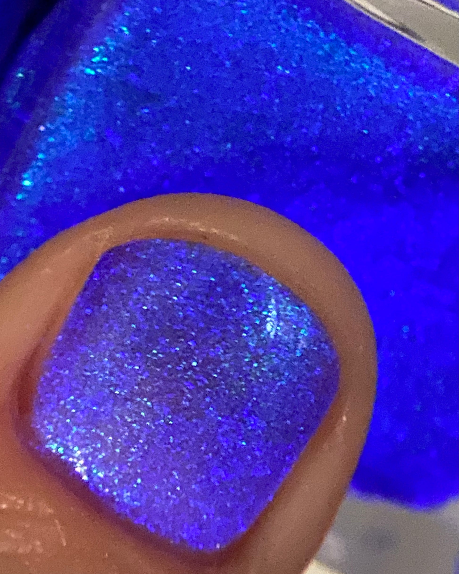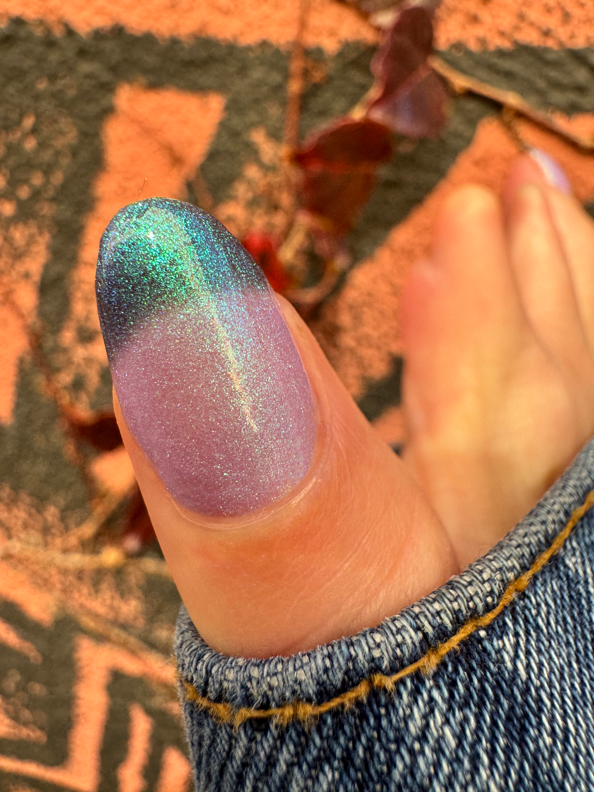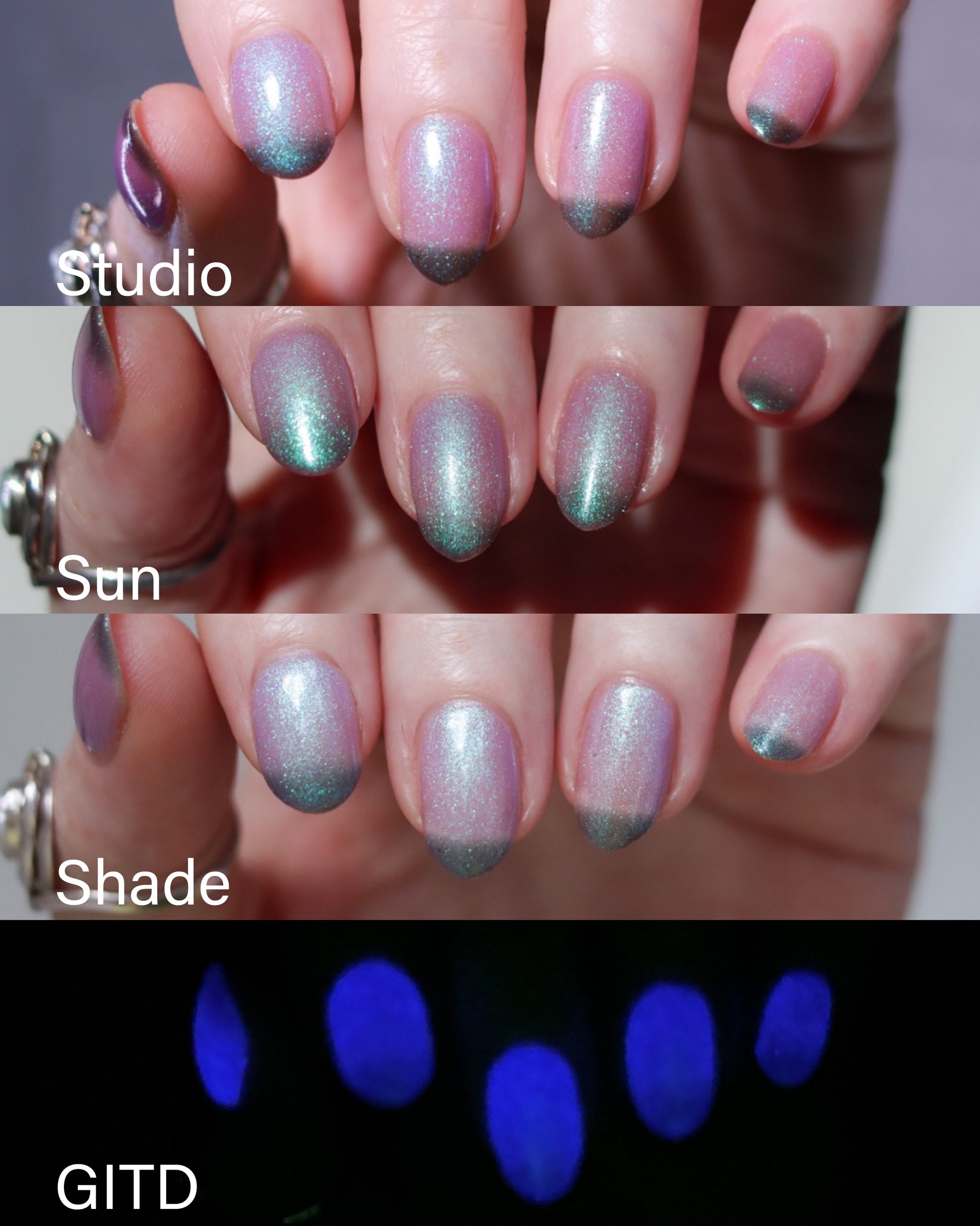 Watch your Sanity is a thermal glow in the dark polish that goes from light pinkish/purple (warm) to very dark purple (cold) with purple glow in the dark pigment and green to blue to purple large particle shimmer!