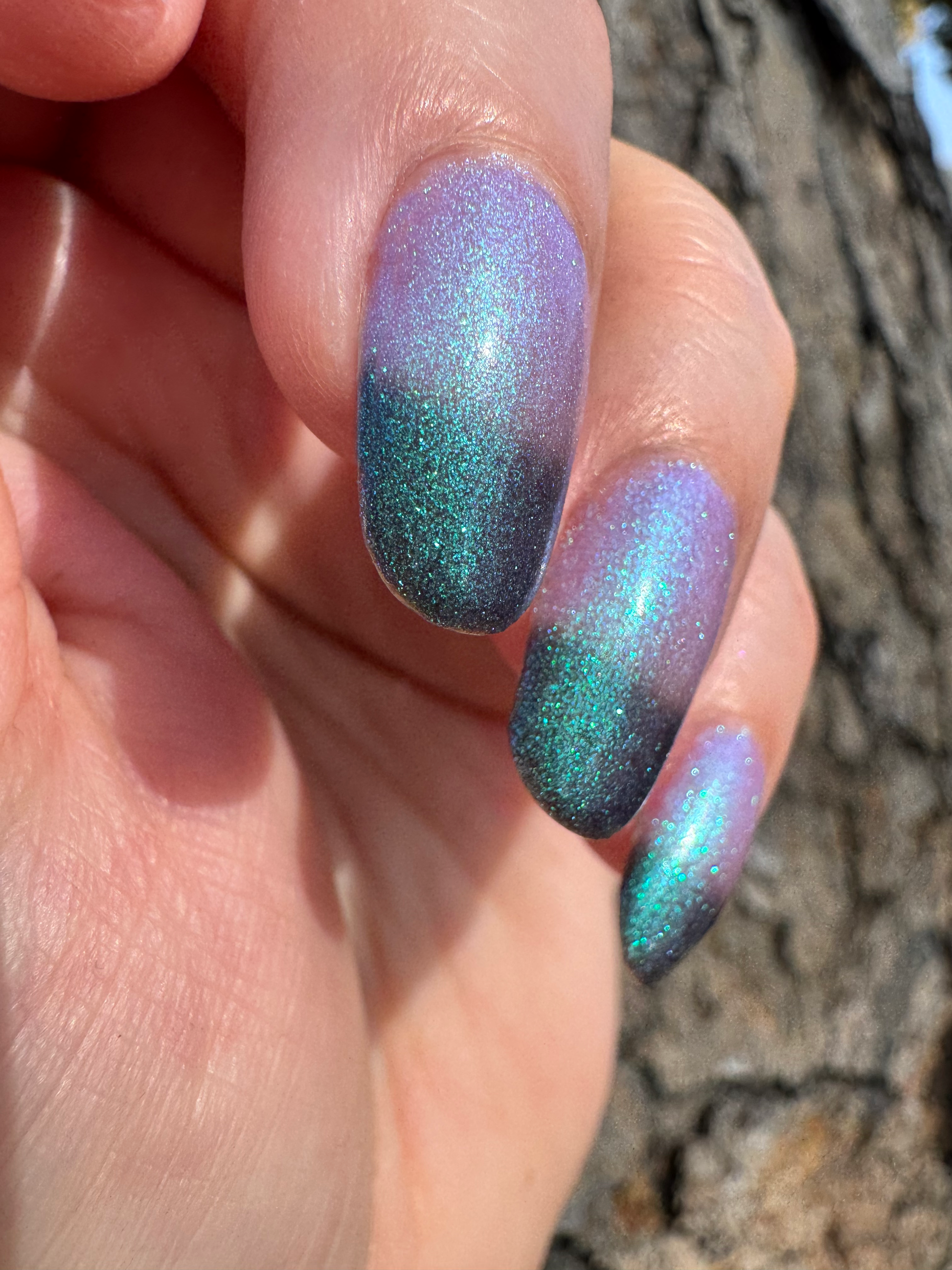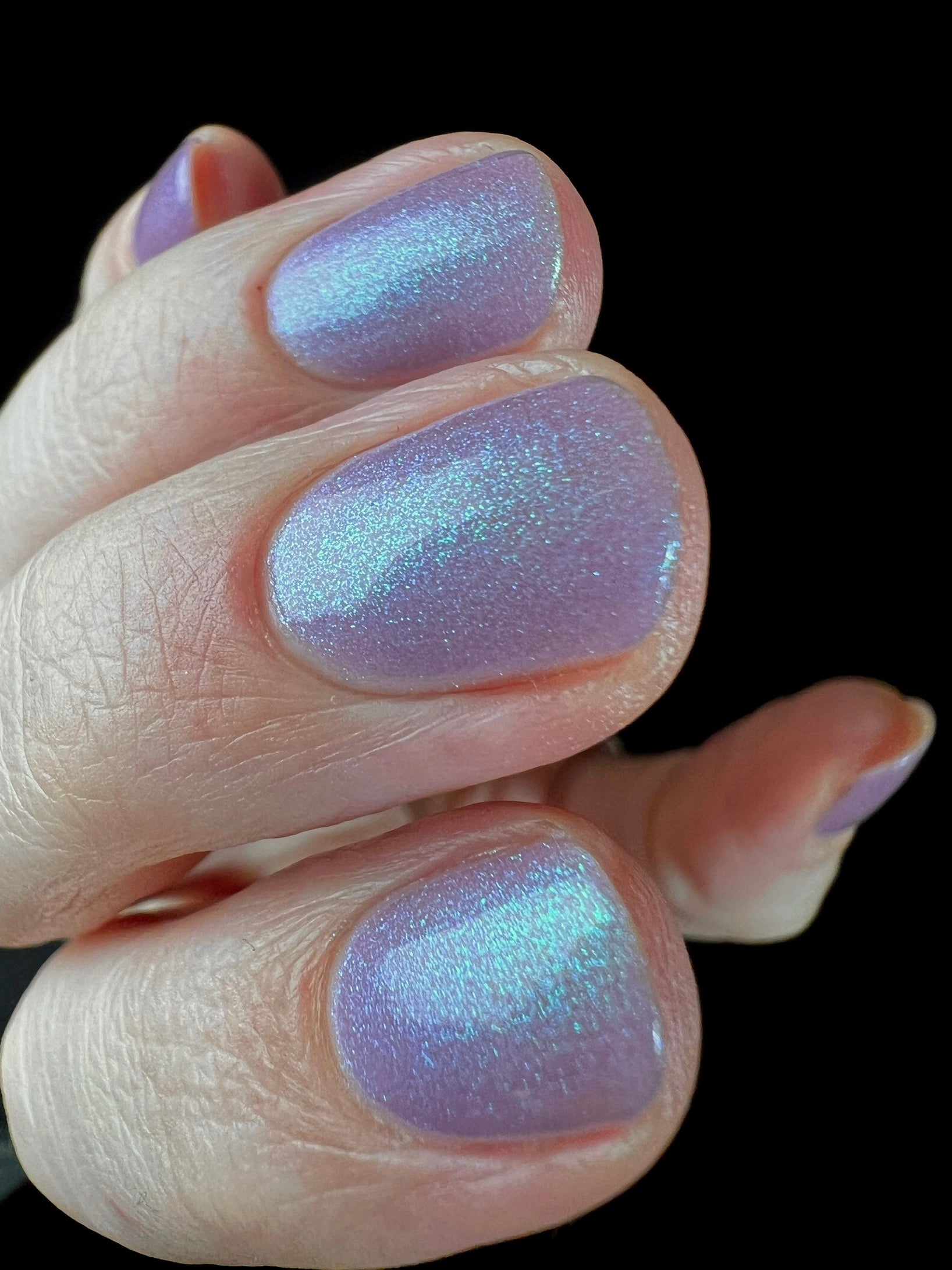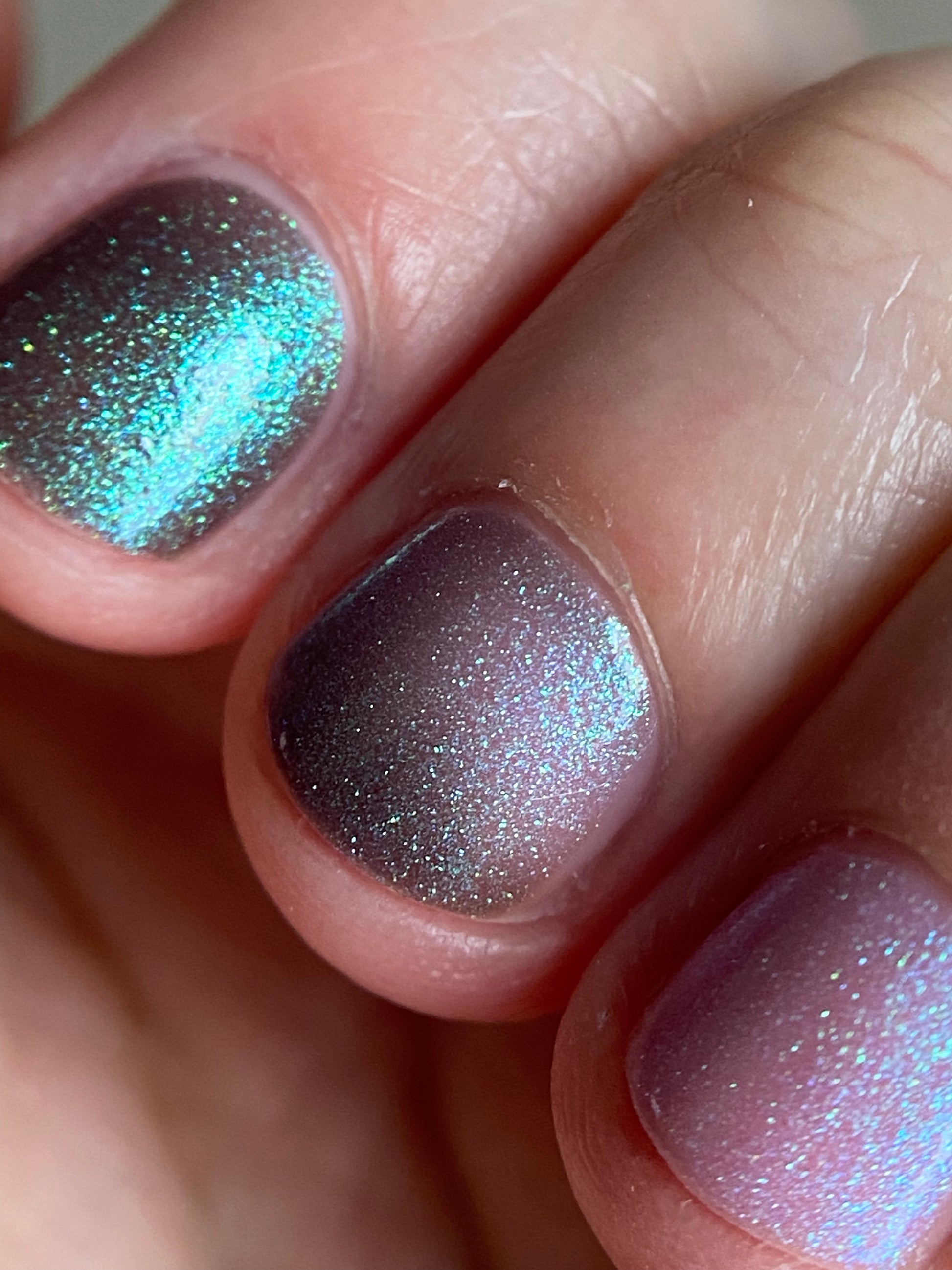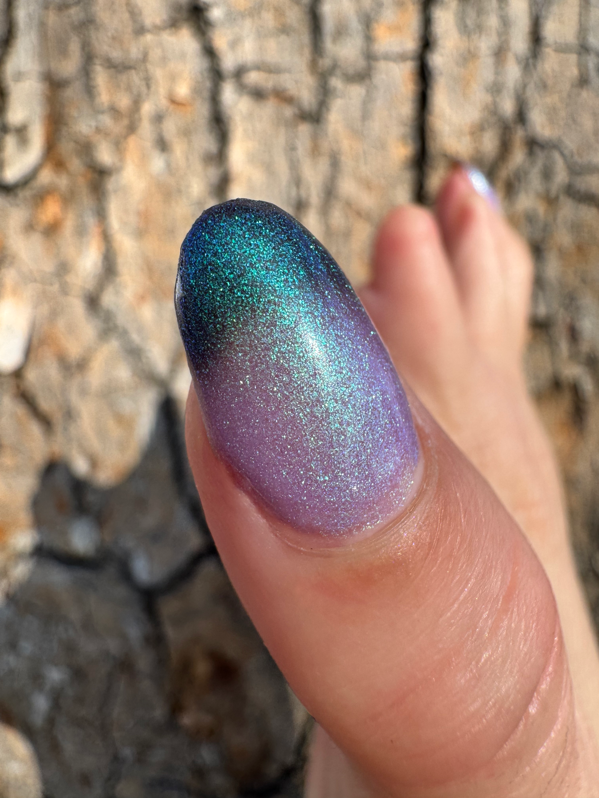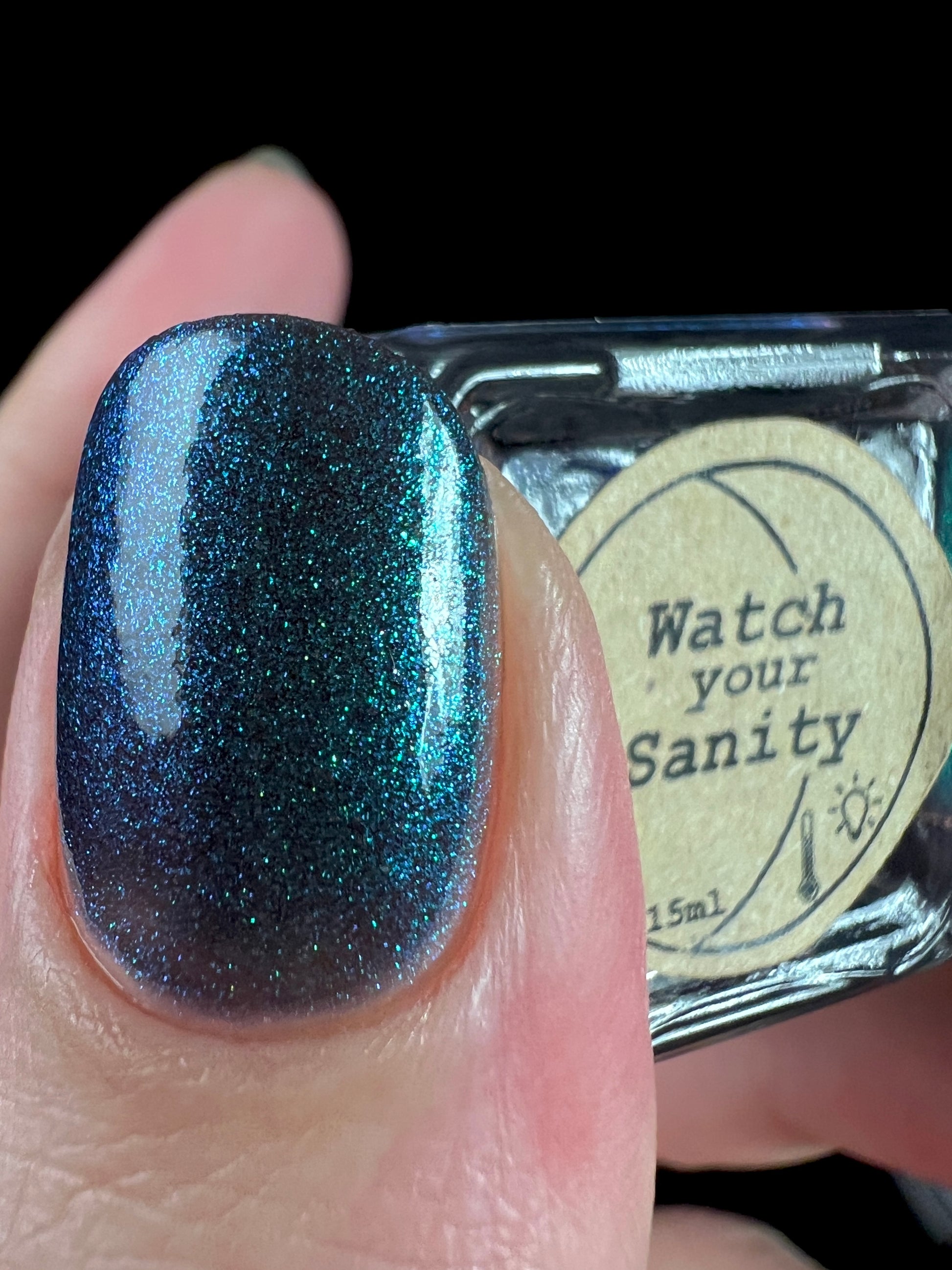Watch your Sanity is a thermal glow in the dark polish that goes from light pinkish/purple (warm) to very dark purple (cold) with purple glow in the dark pigment and green to blue to purple large particle shimmer!