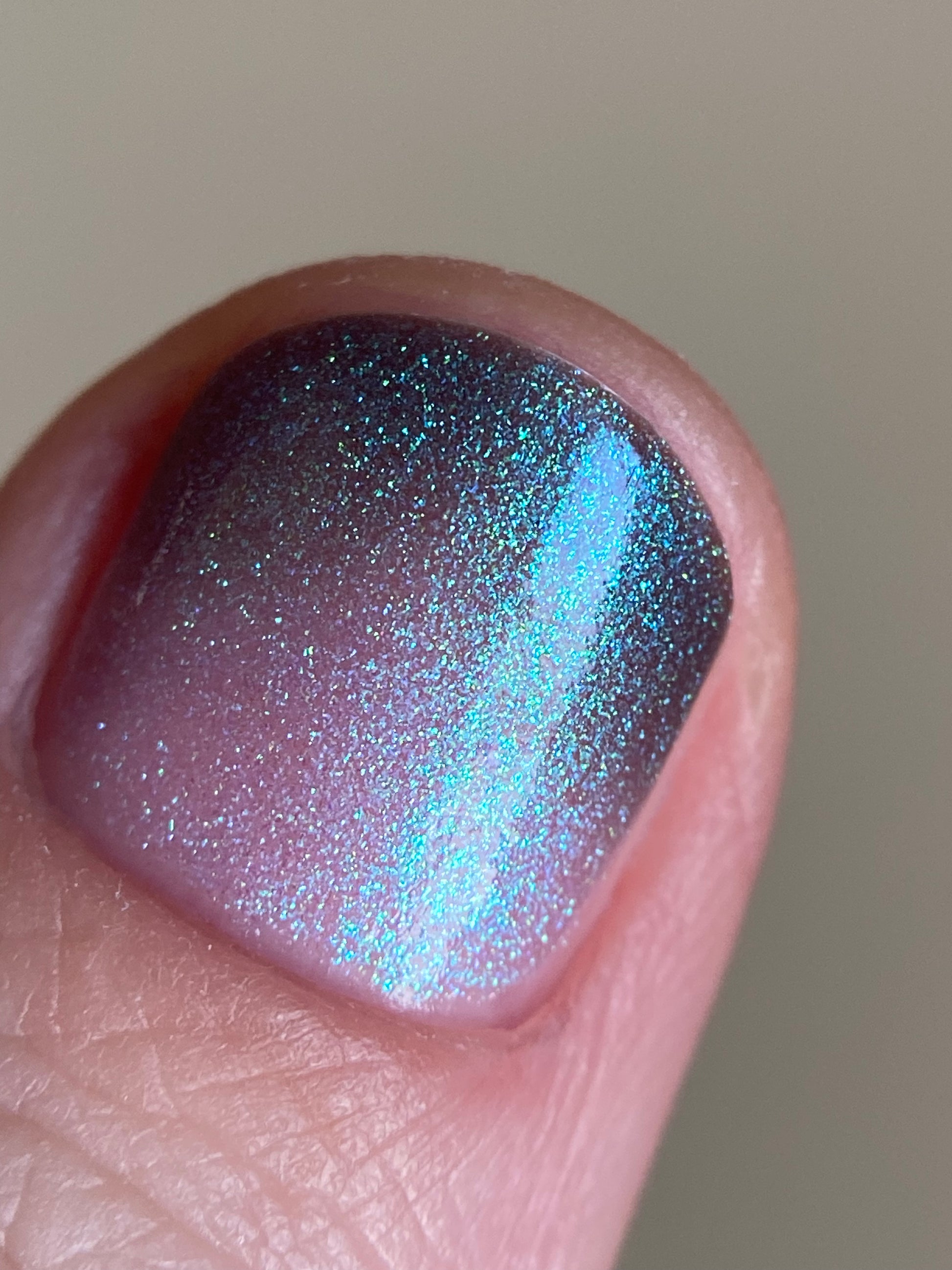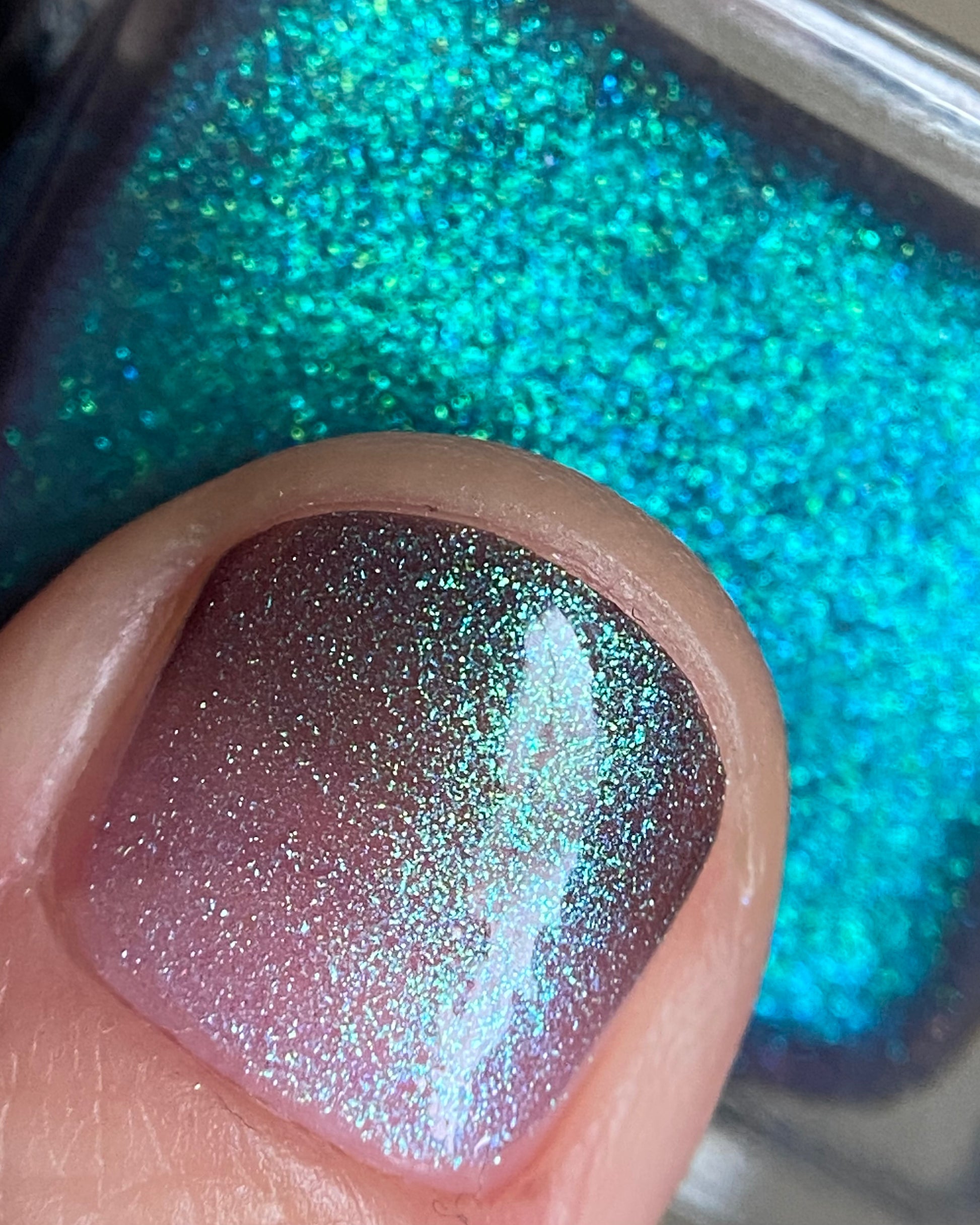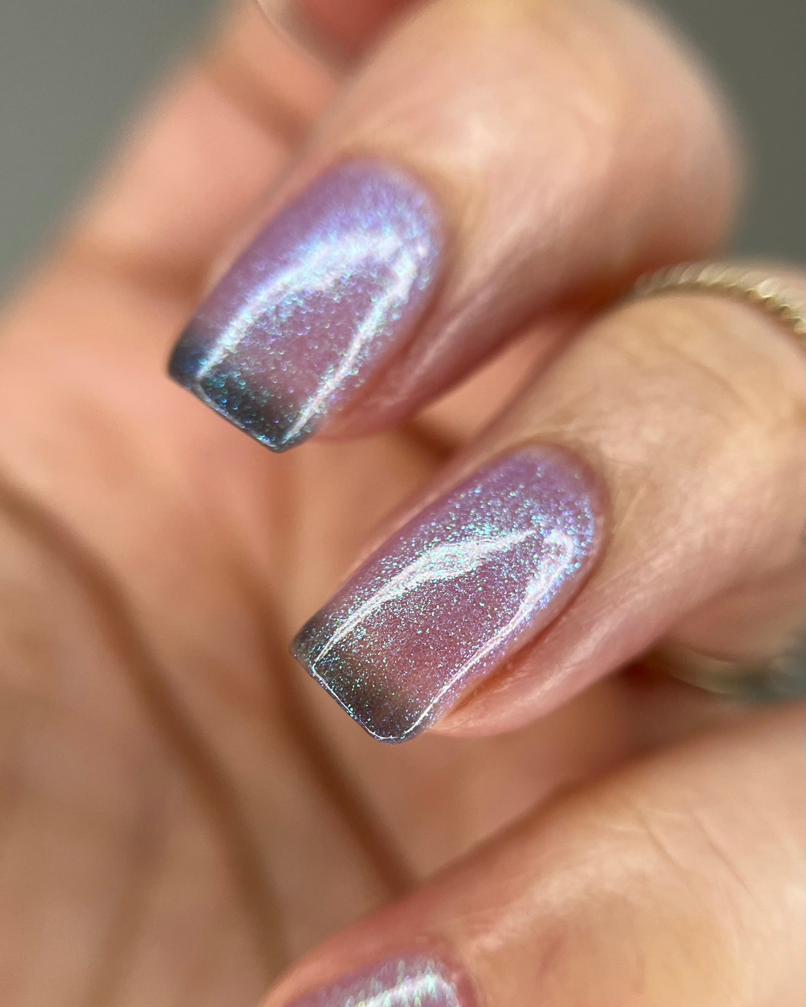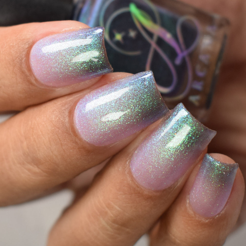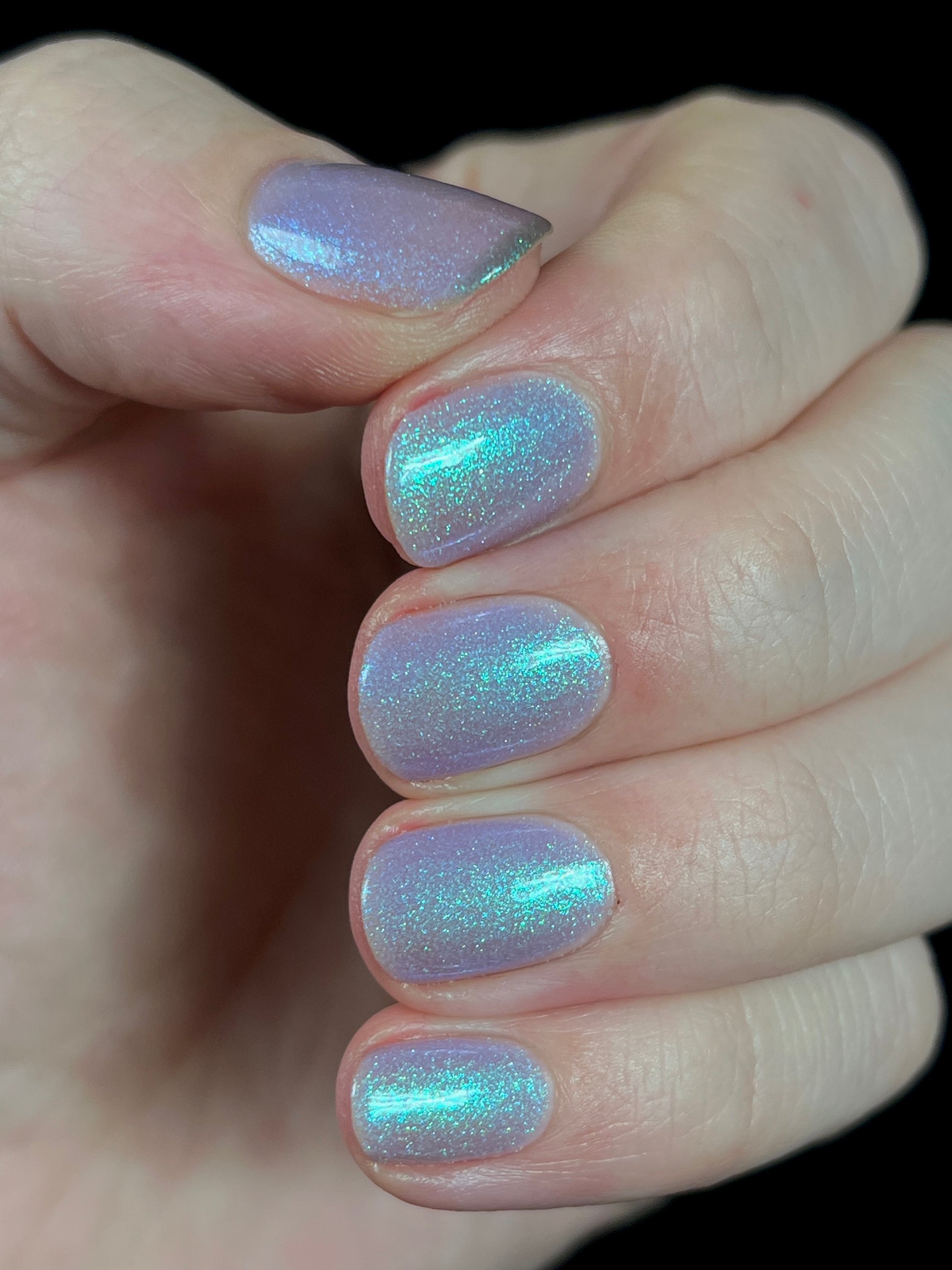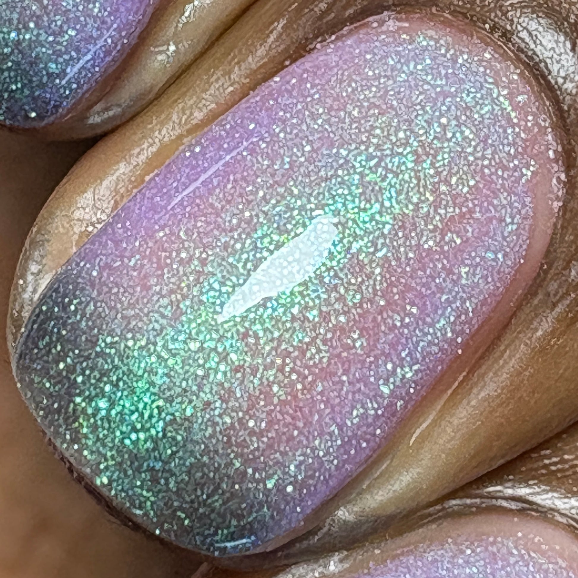 Watch your Sanity is a thermal glow in the dark polish that goes from light pinkish/purple (warm) to very dark purple (cold) with purple glow in the dark pigment and green to blue to purple large particle shimmer!