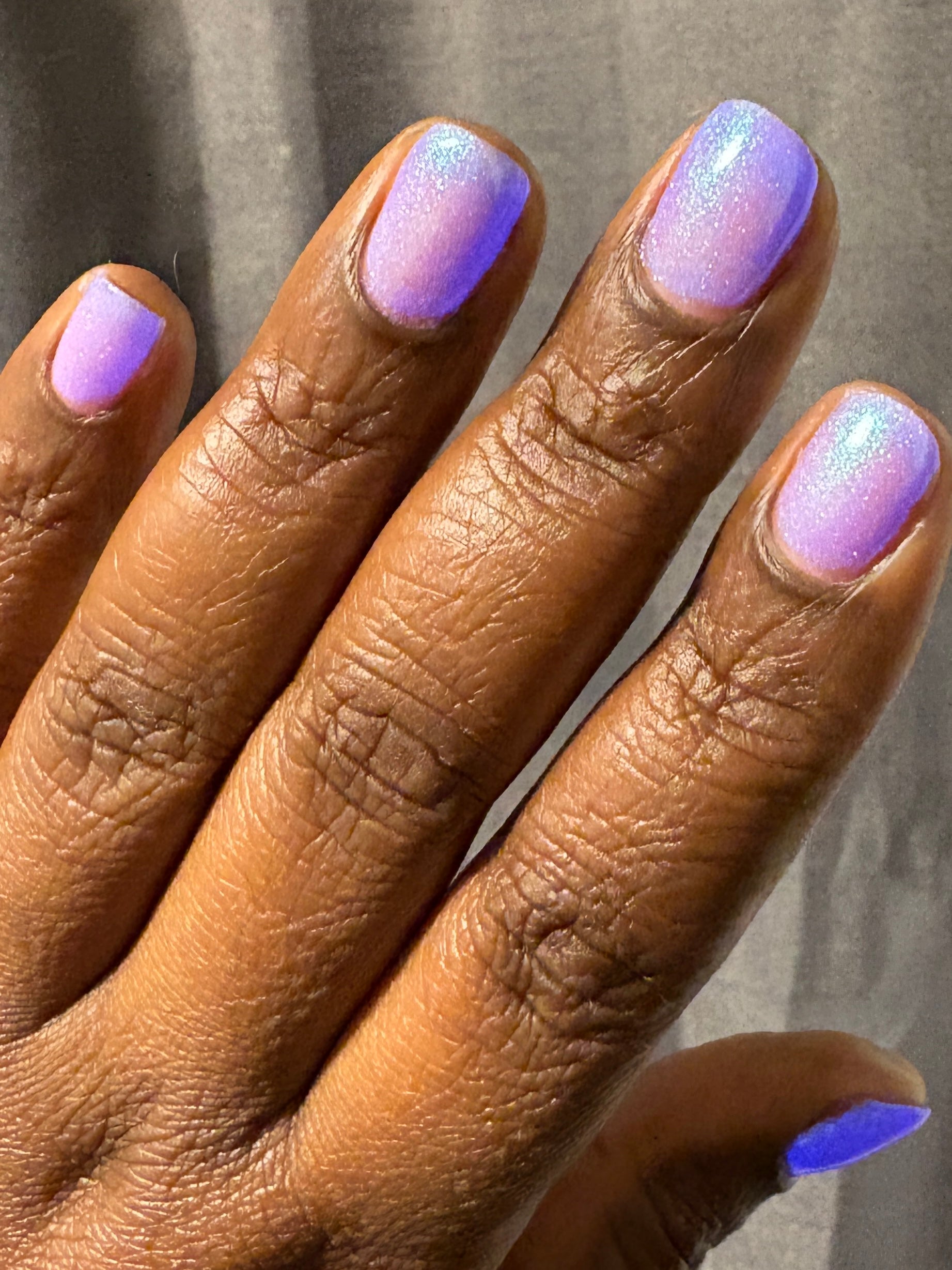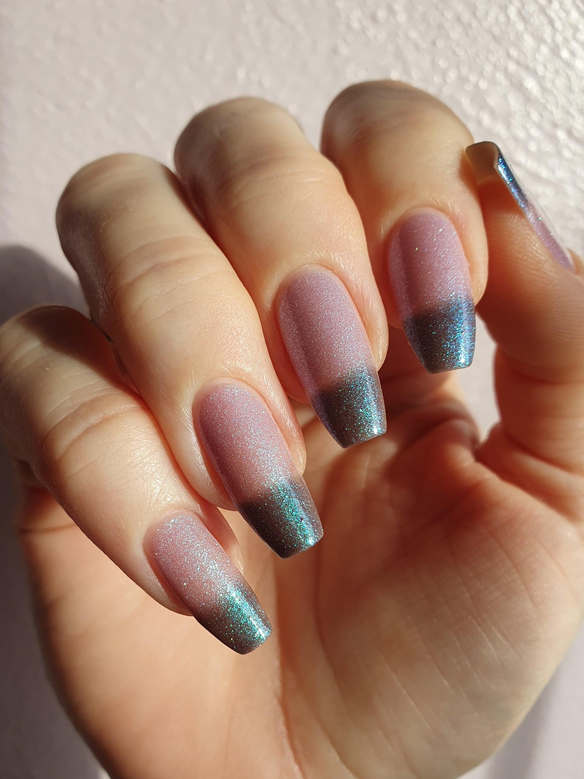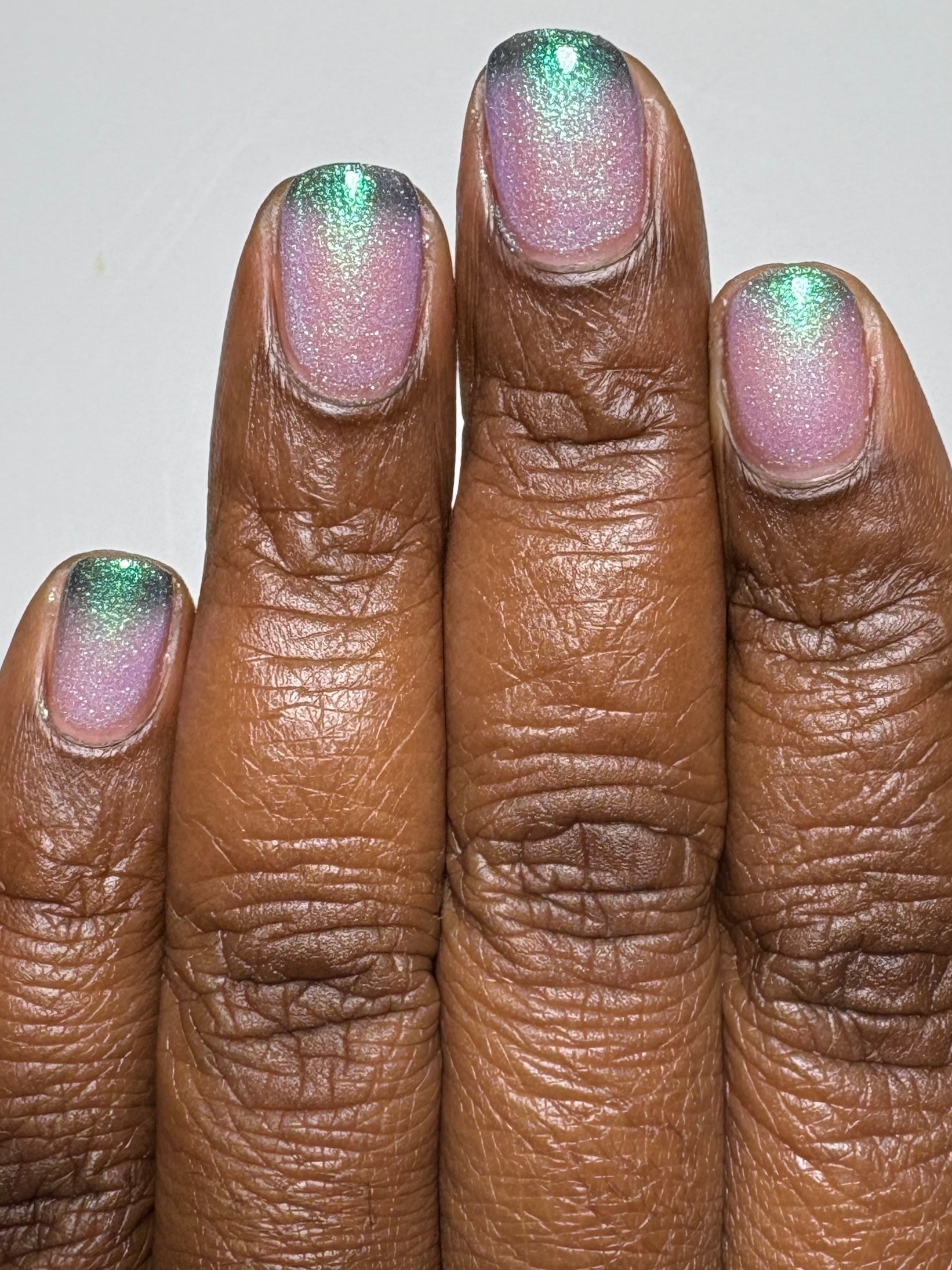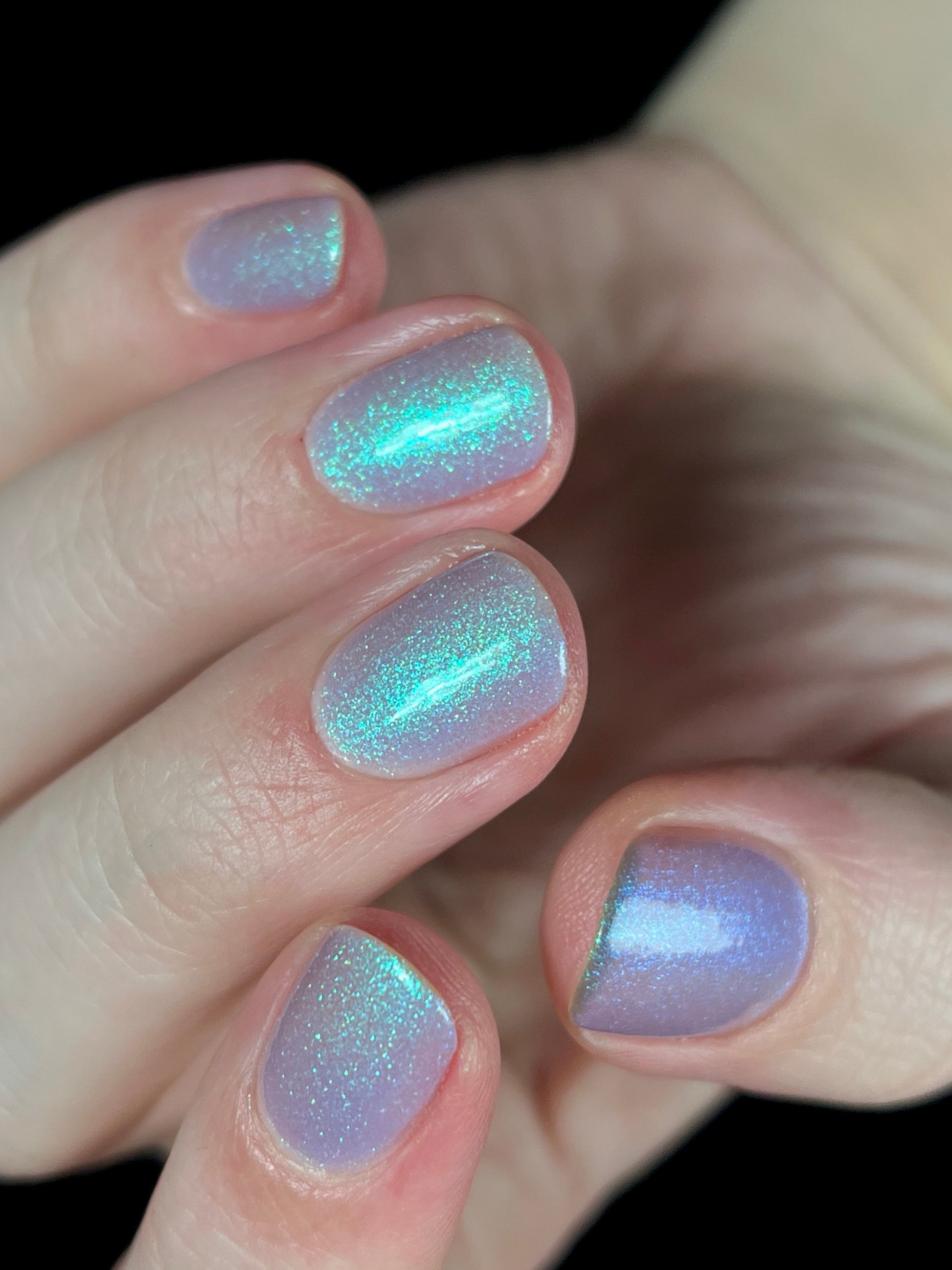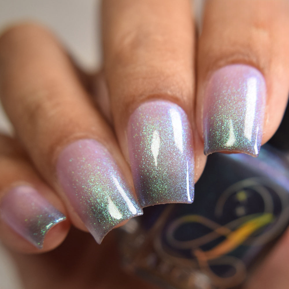 Watch your Sanity is a thermal glow in the dark polish that goes from light pinkish/purple (warm) to very dark purple (cold) with purple glow in the dark pigment and green to blue to purple large particle shimmer!