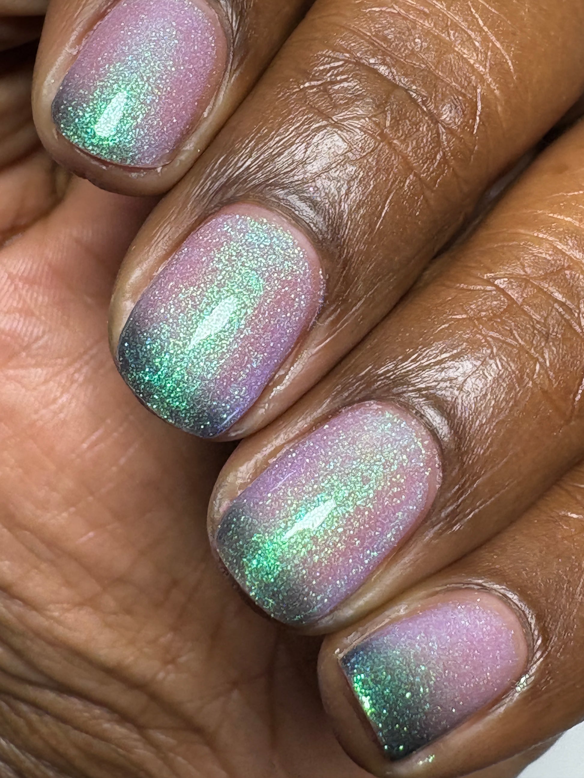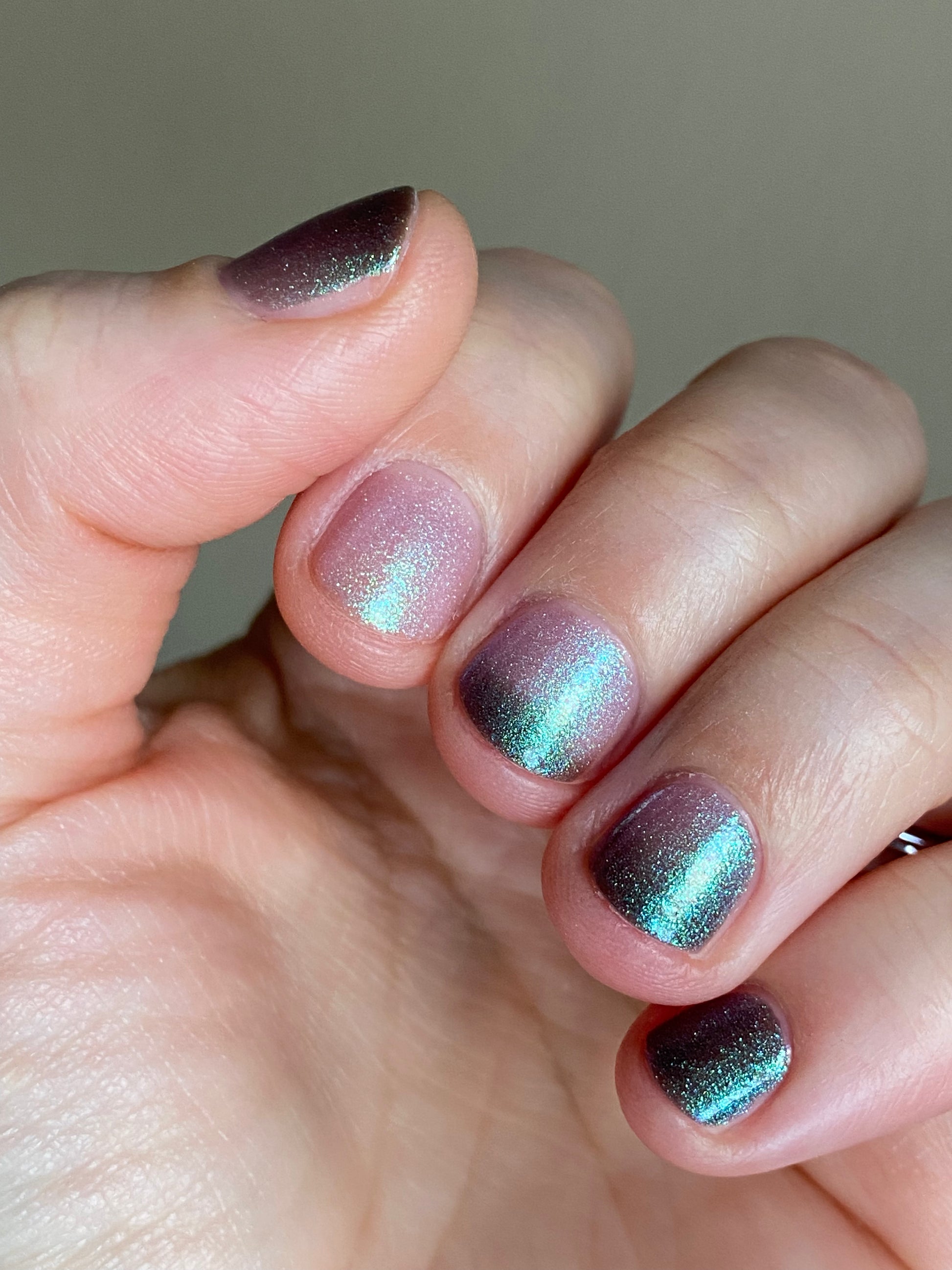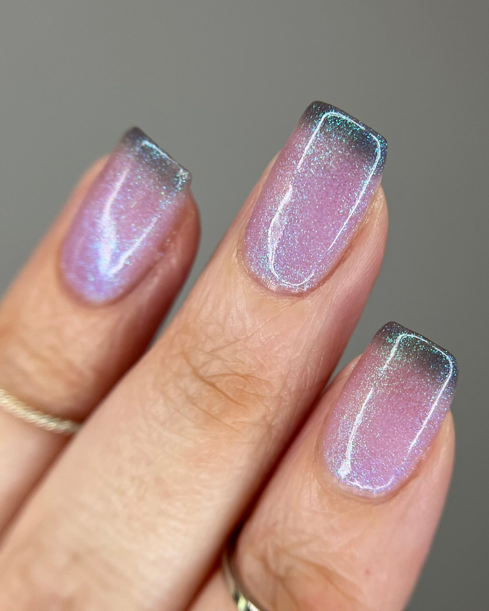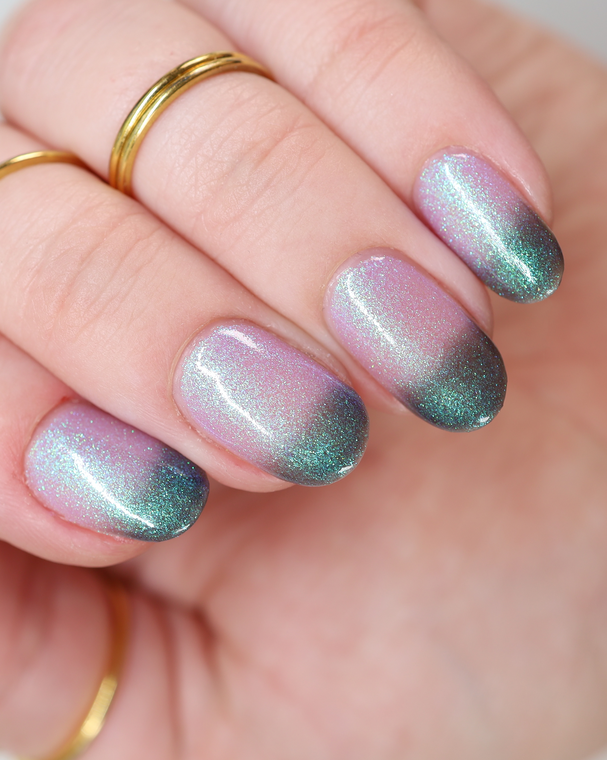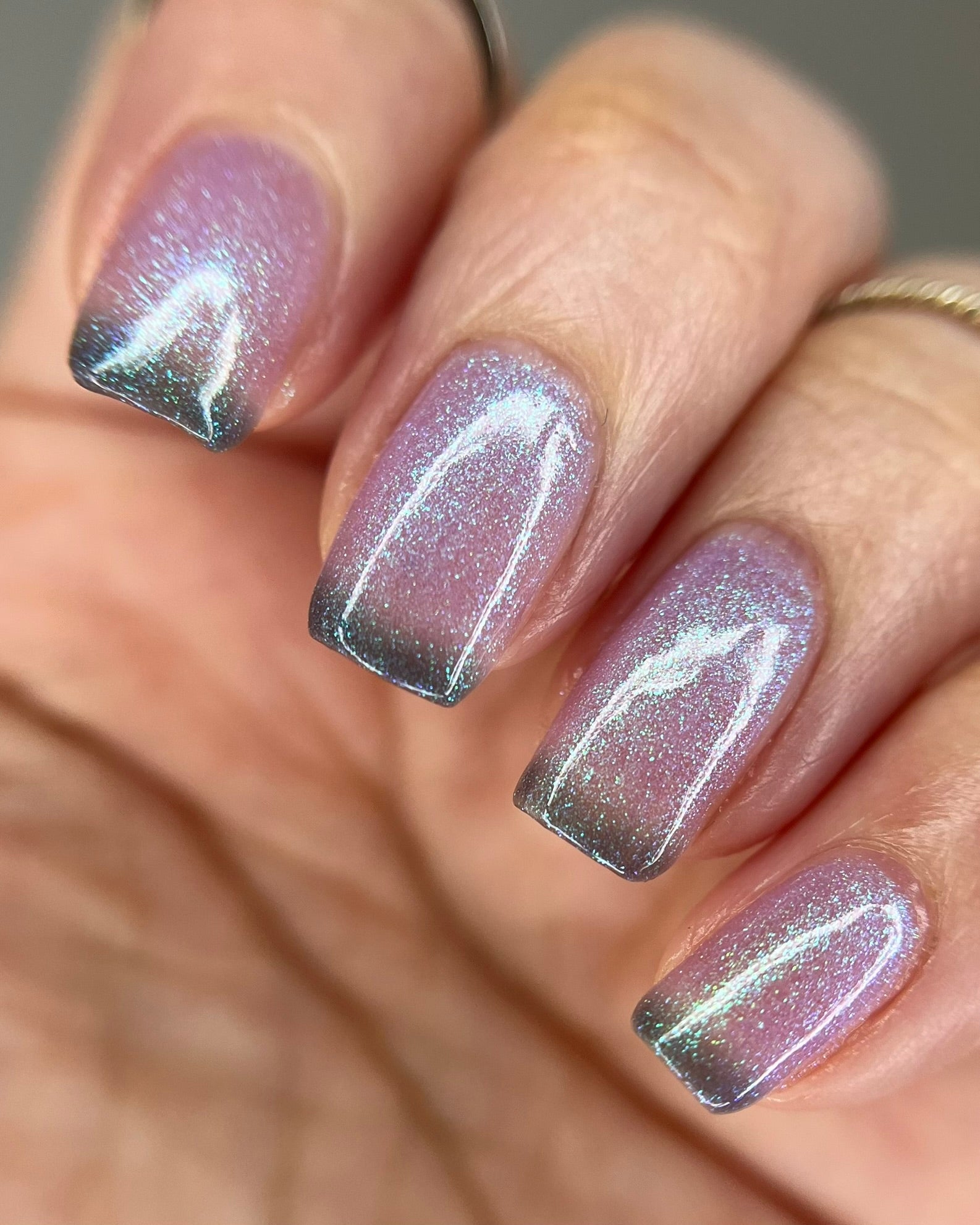 Watch your Sanity is a thermal glow in the dark polish that goes from light pinkish/purple (warm) to very dark purple (cold) with purple glow in the dark pigment and green to blue to purple large particle shimmer!