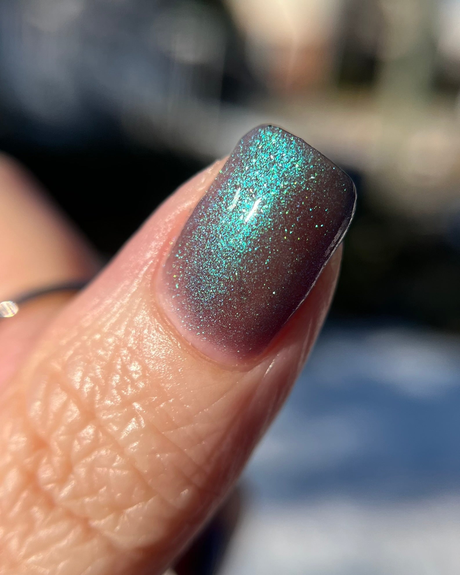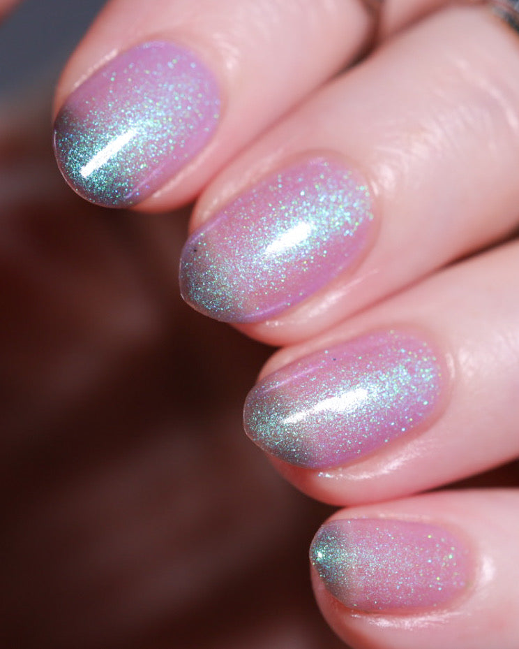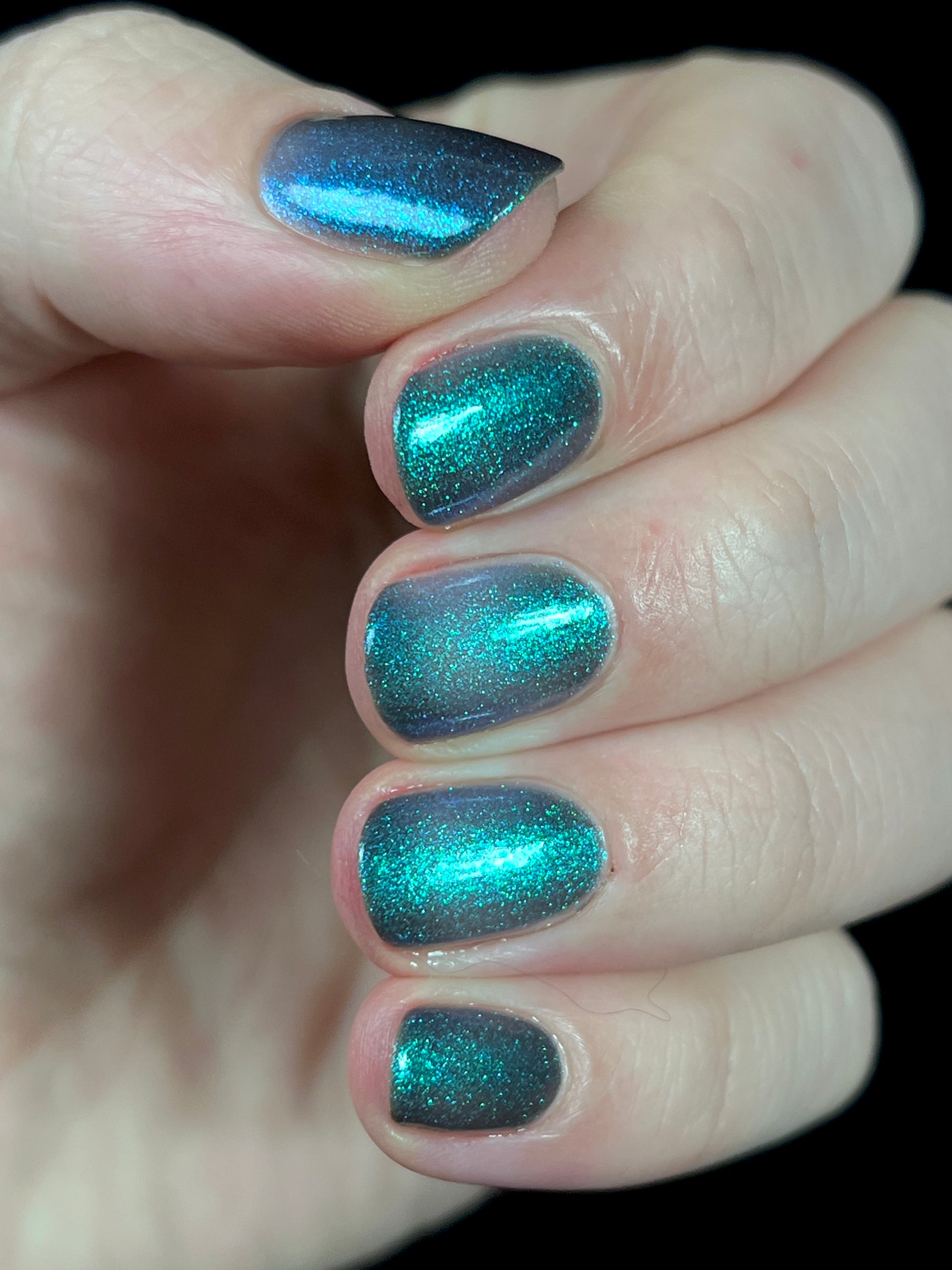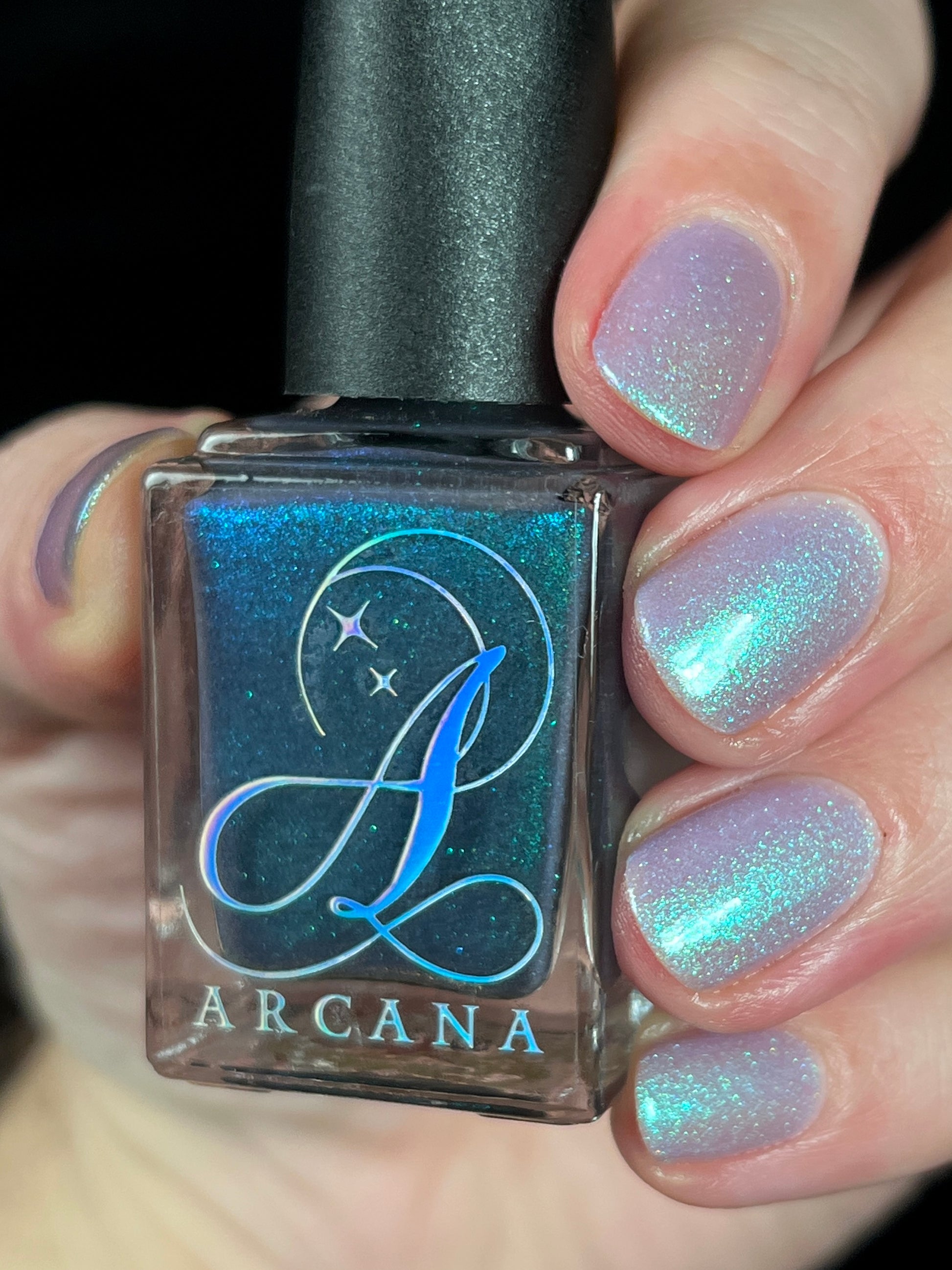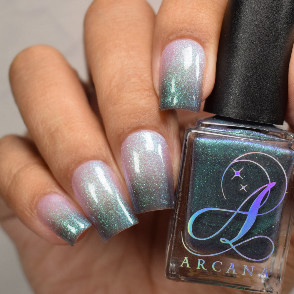 Watch your Sanity is a thermal glow in the dark polish that goes from light pinkish/purple (warm) to very dark purple (cold) with purple glow in the dark pigment and green to blue to purple large particle shimmer!