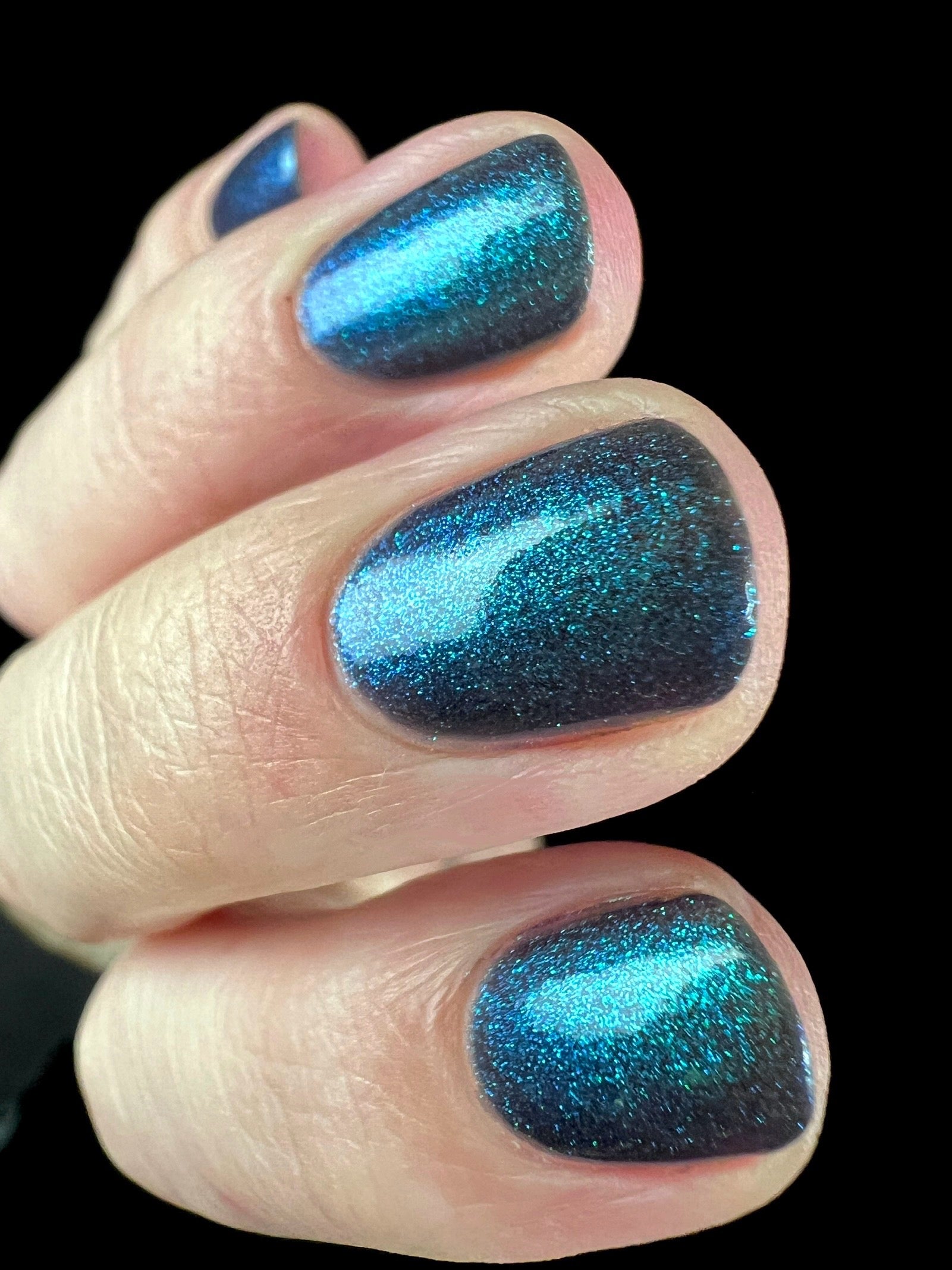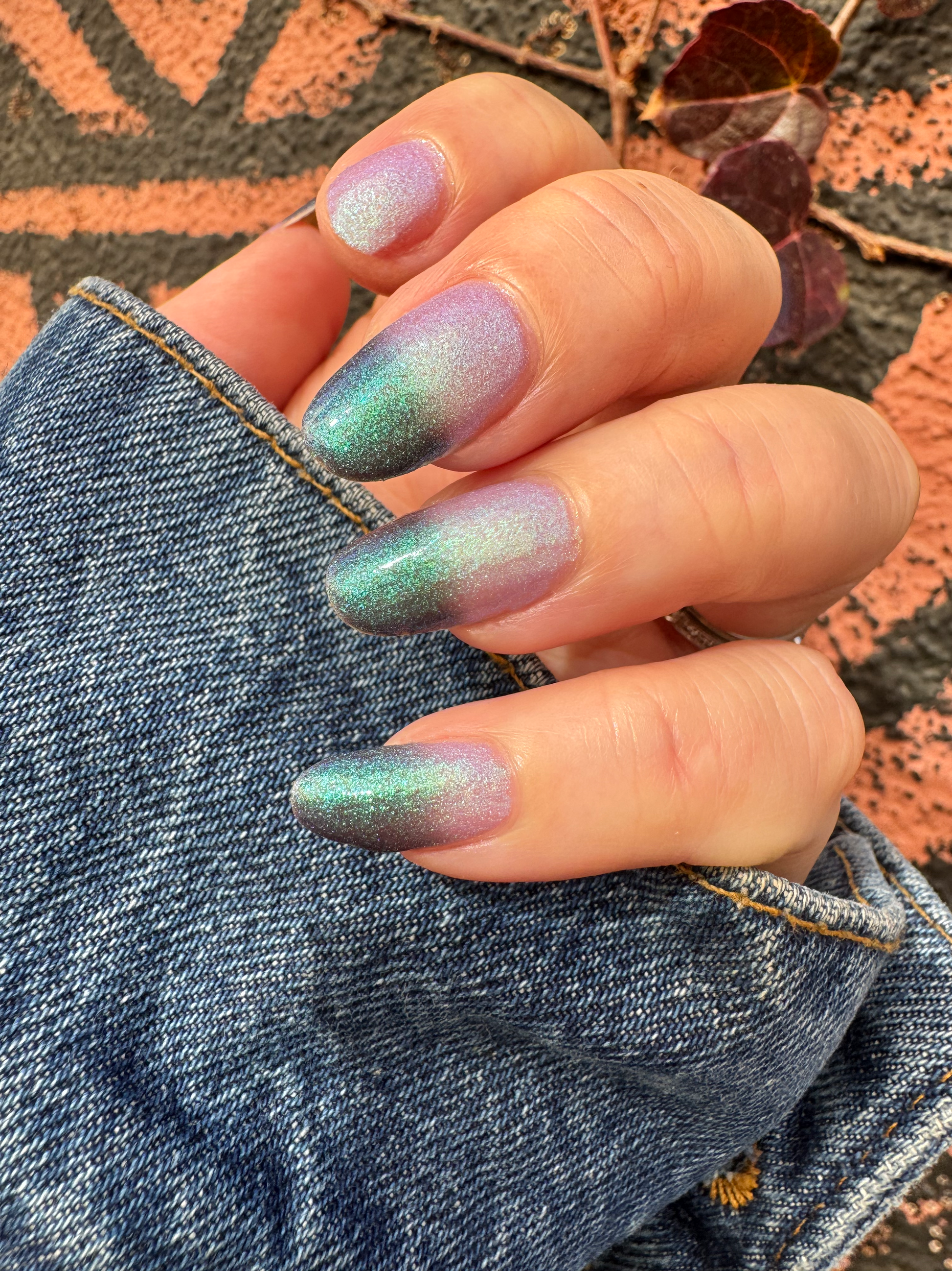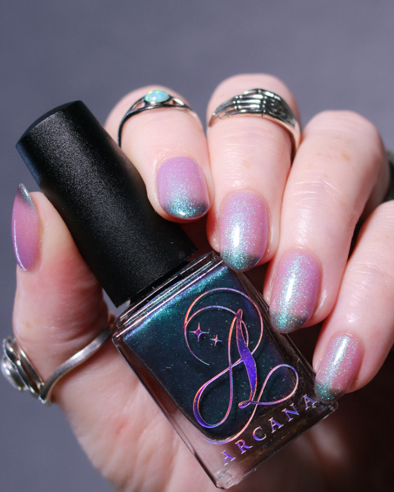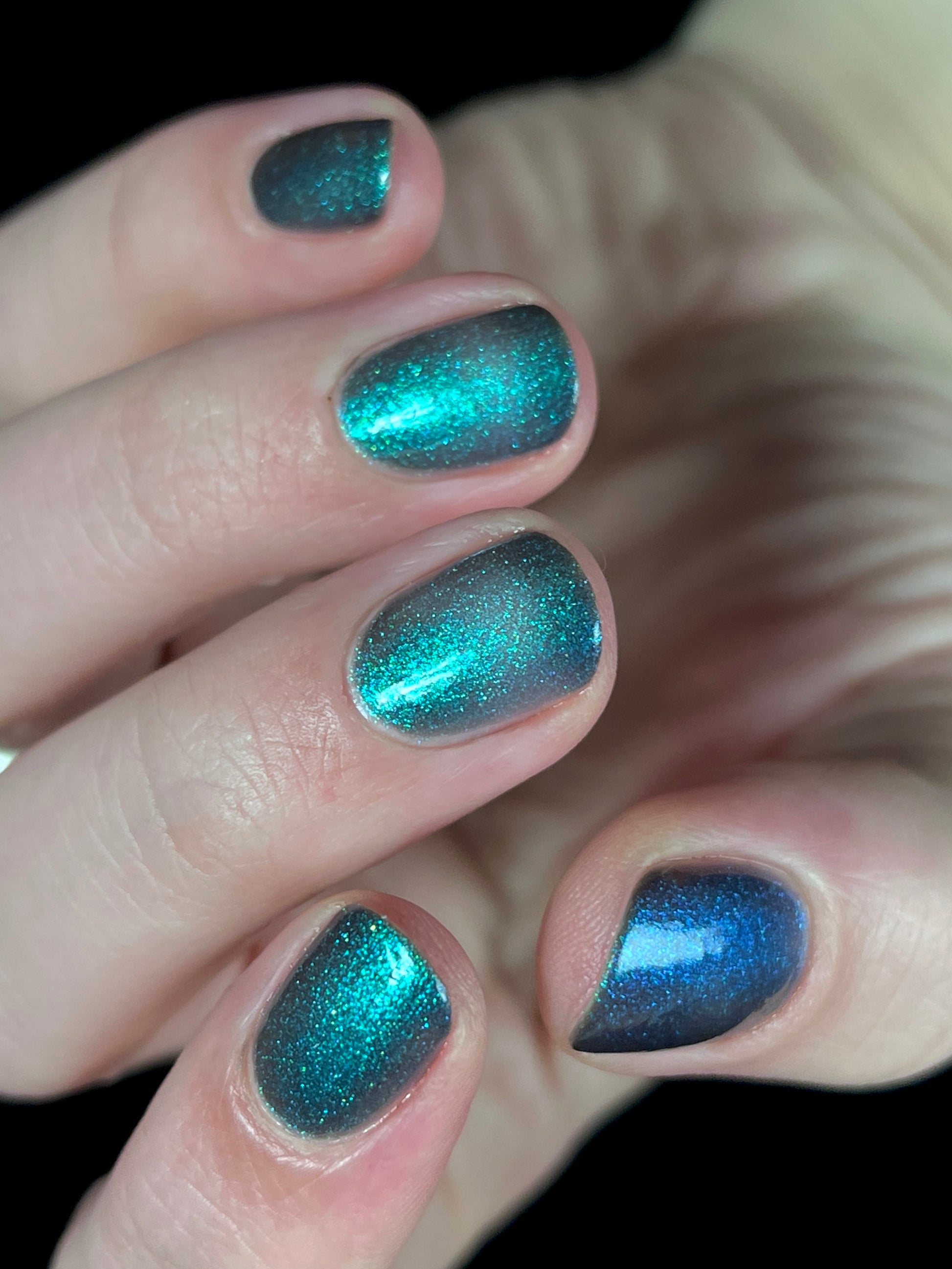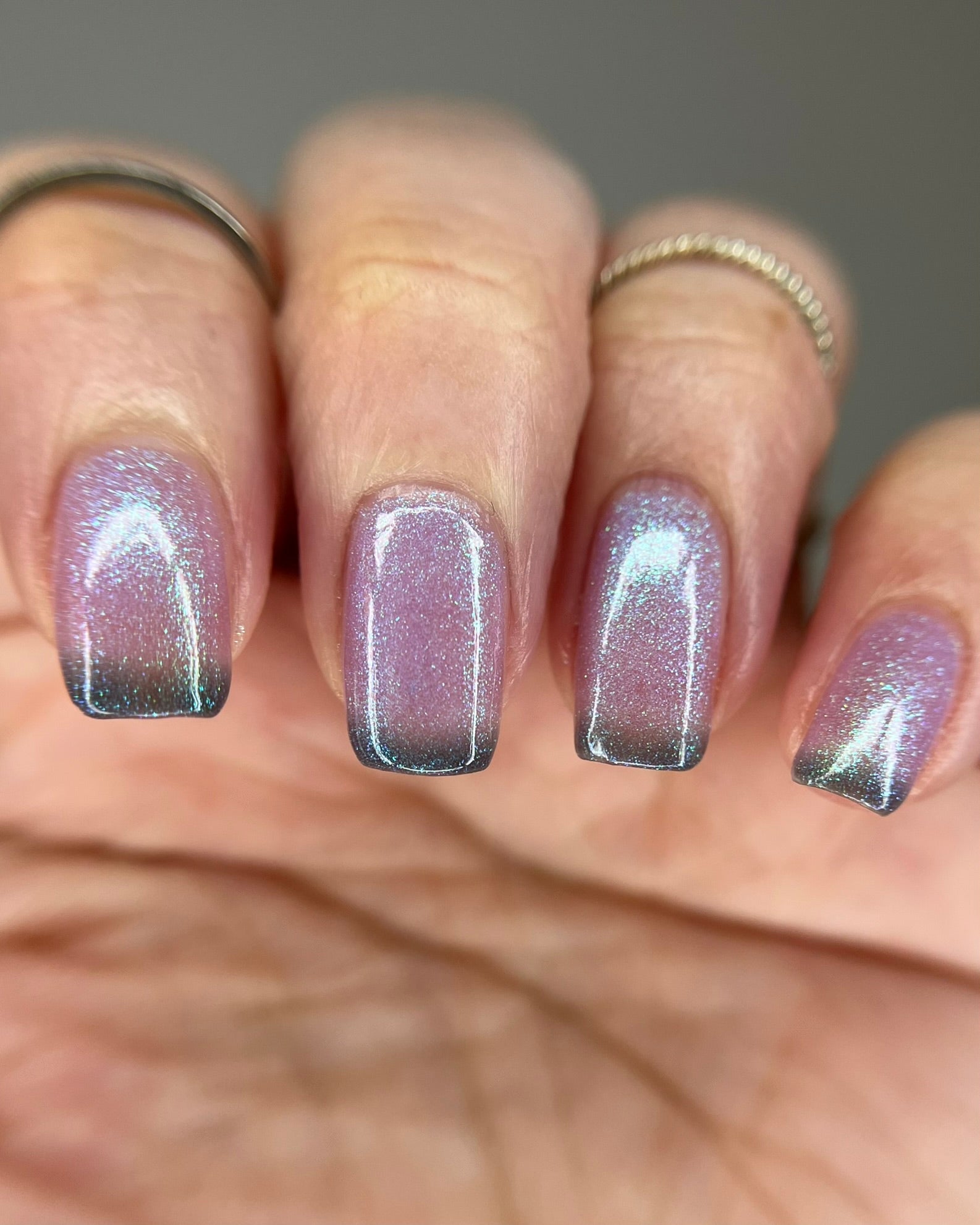 Watch your Sanity is a thermal glow in the dark polish that goes from light pinkish/purple (warm) to very dark purple (cold) with purple glow in the dark pigment and green to blue to purple large particle shimmer!