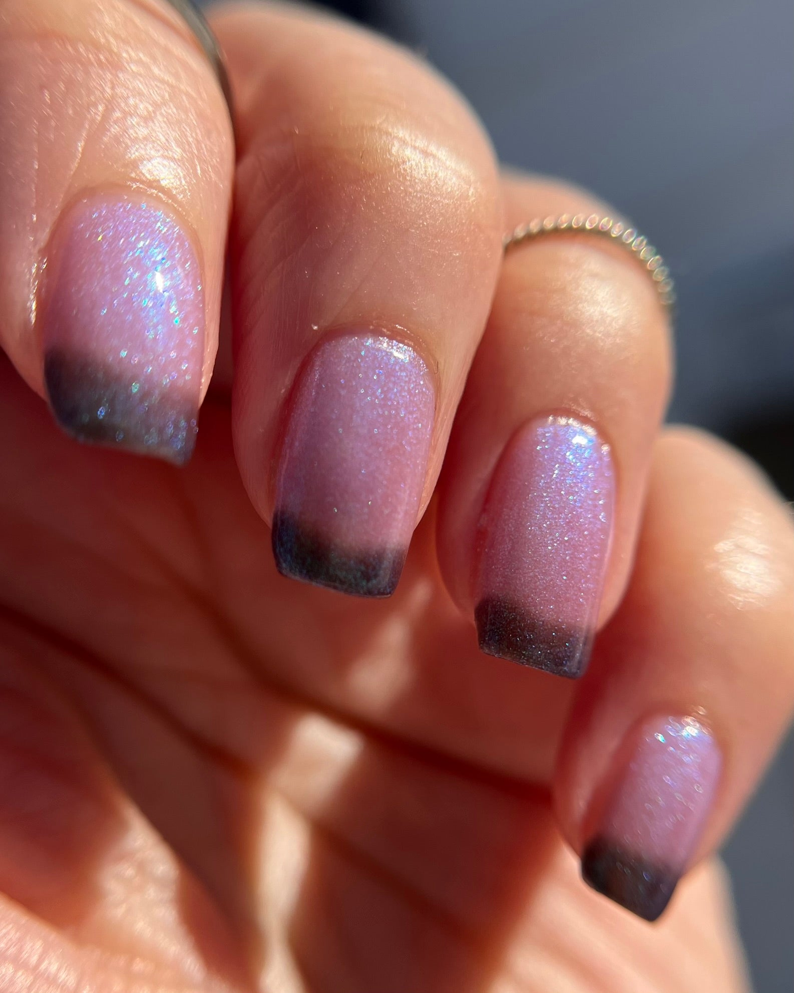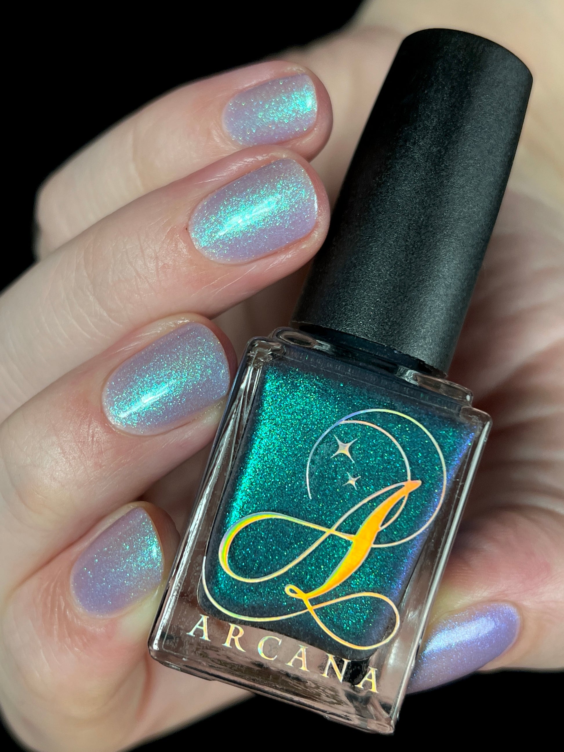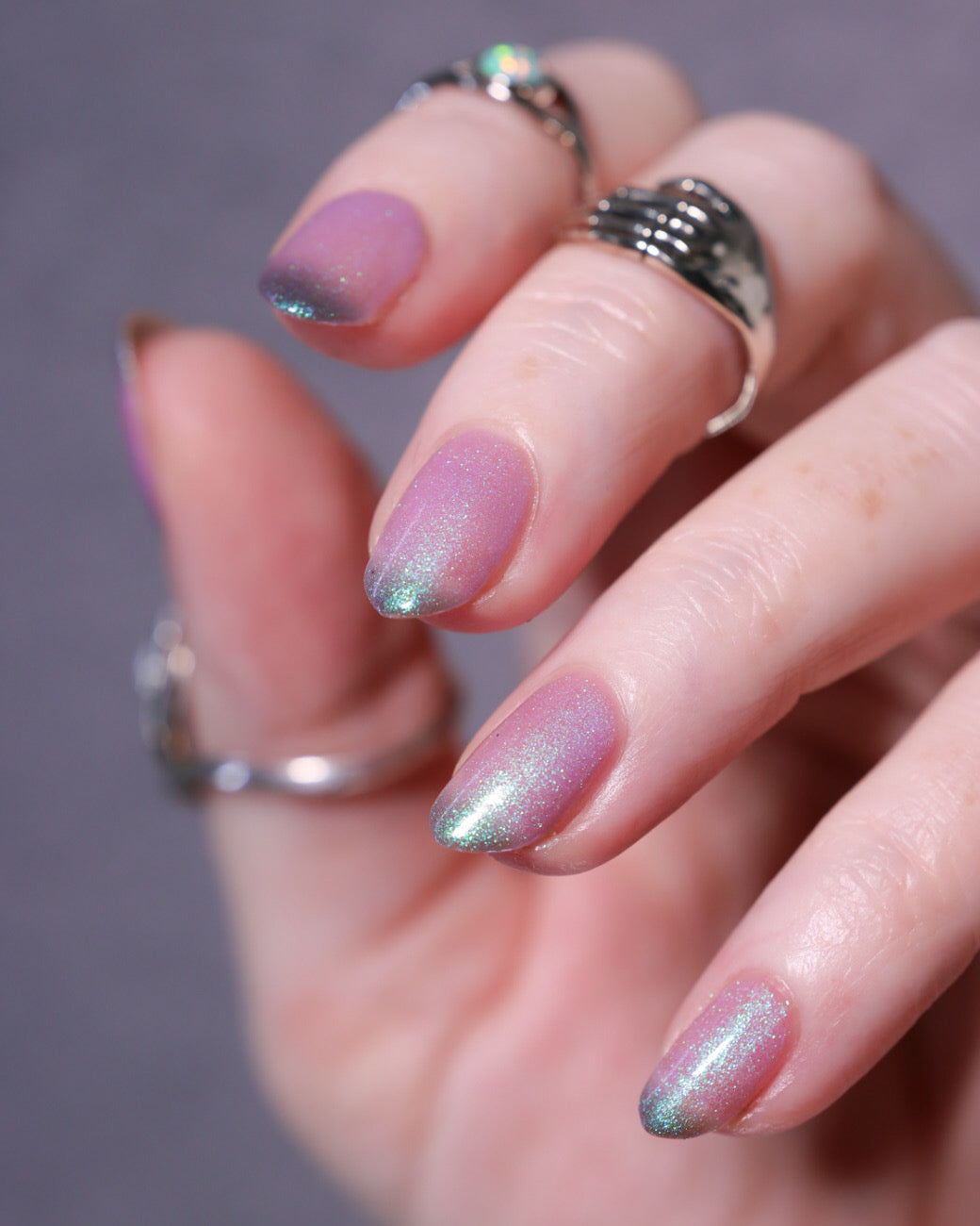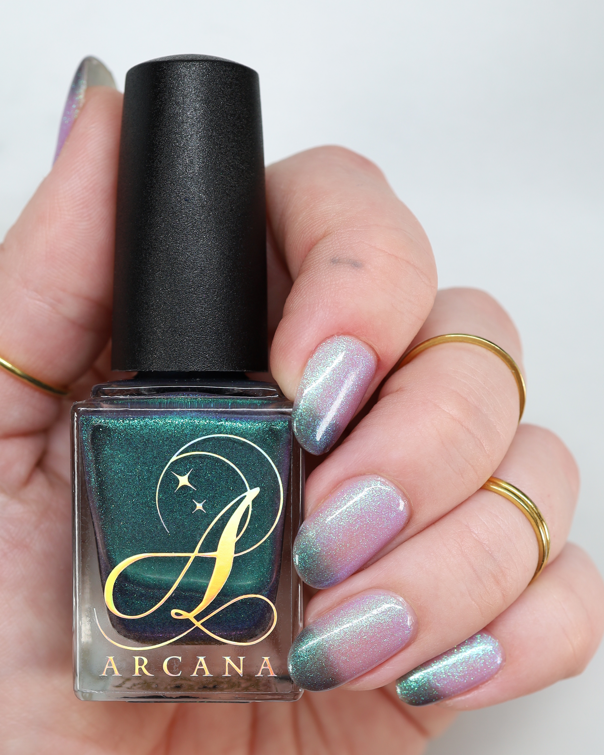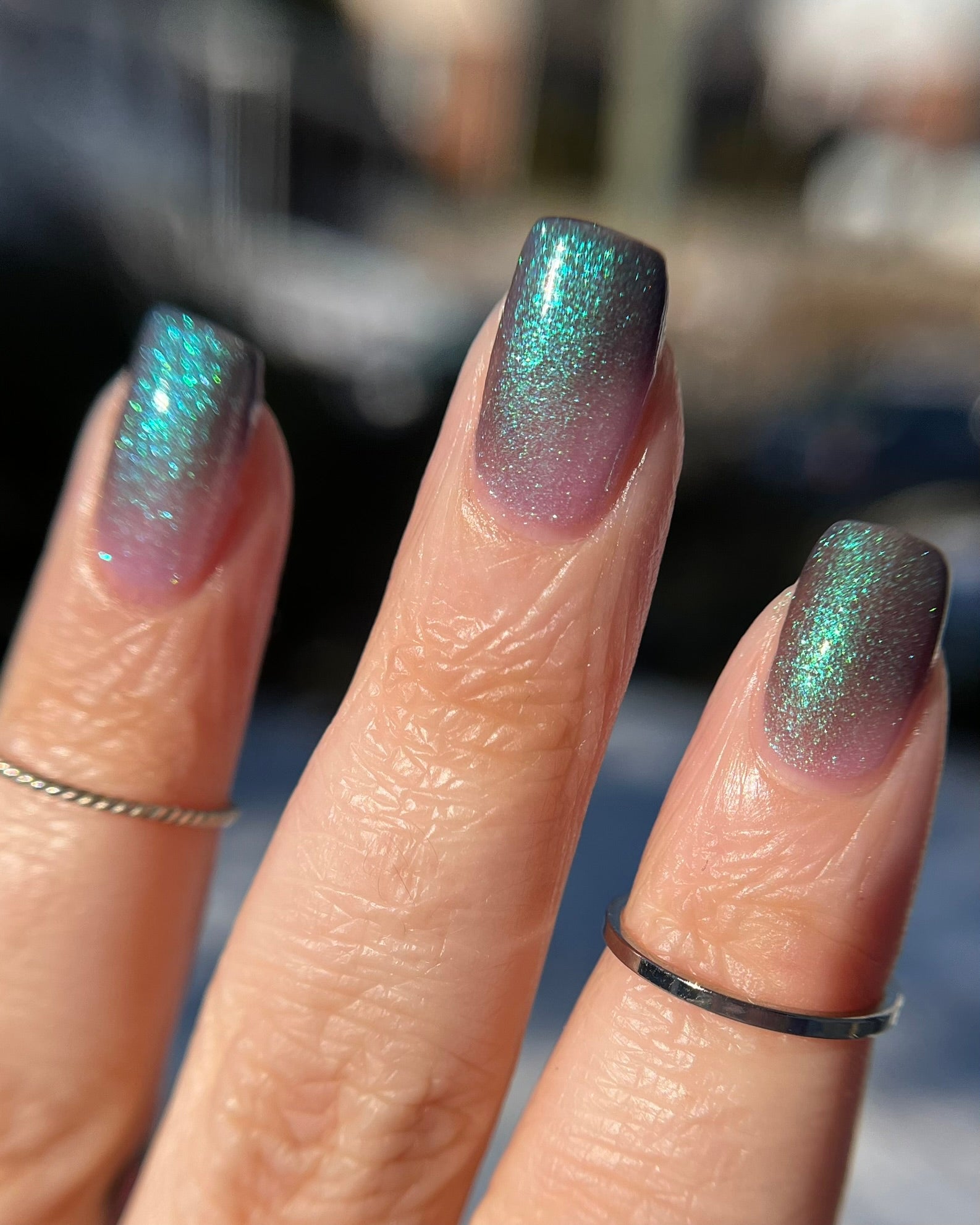 Watch your Sanity is a thermal glow in the dark polish that goes from light pinkish/purple (warm) to very dark purple (cold) with purple glow in the dark pigment and green to blue to purple large particle shimmer!