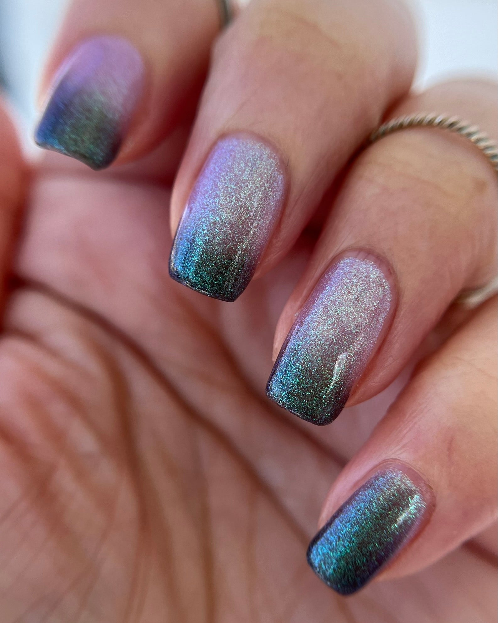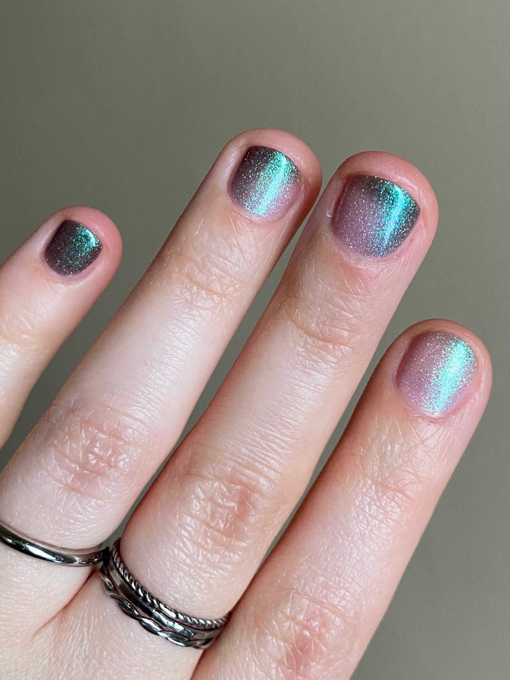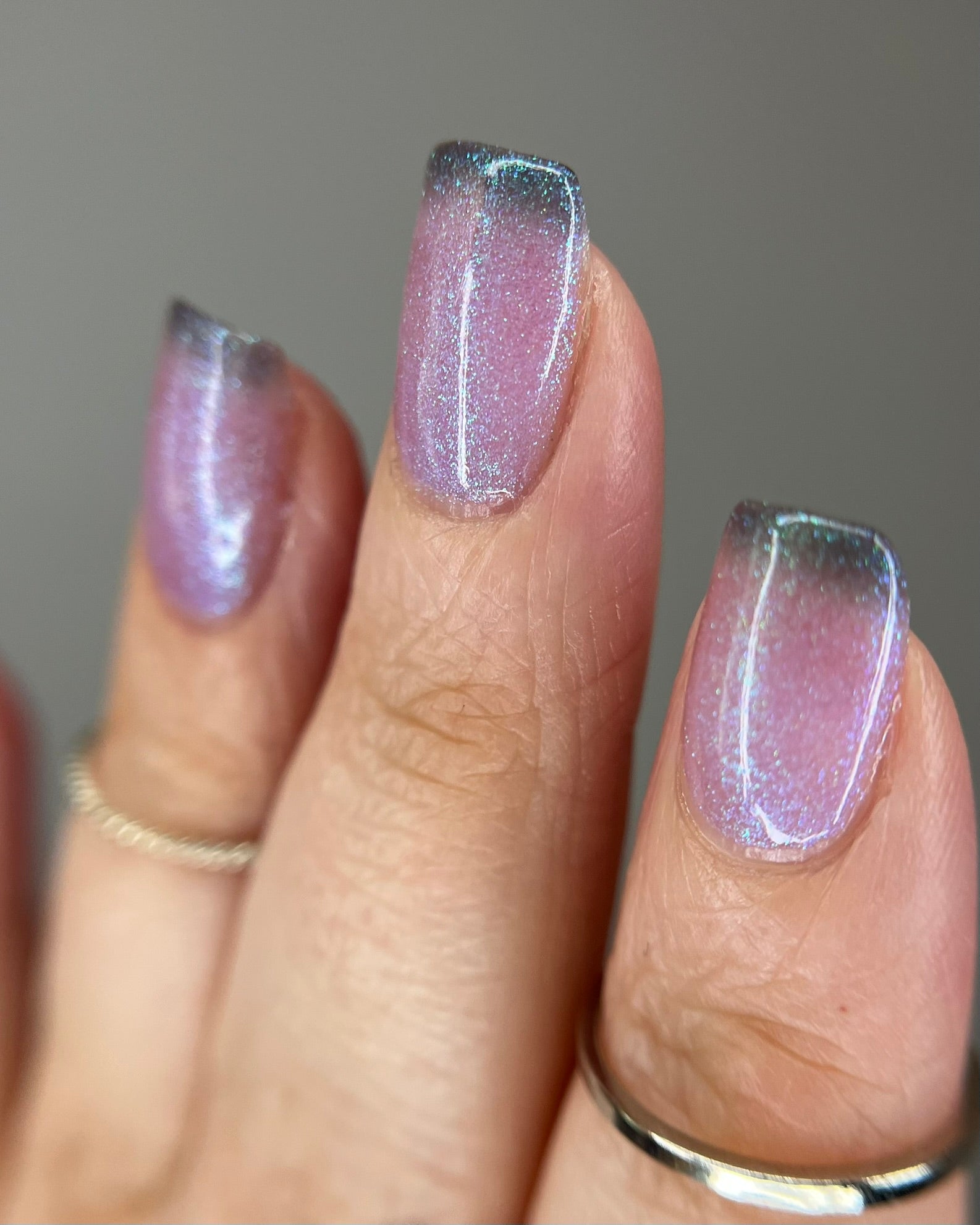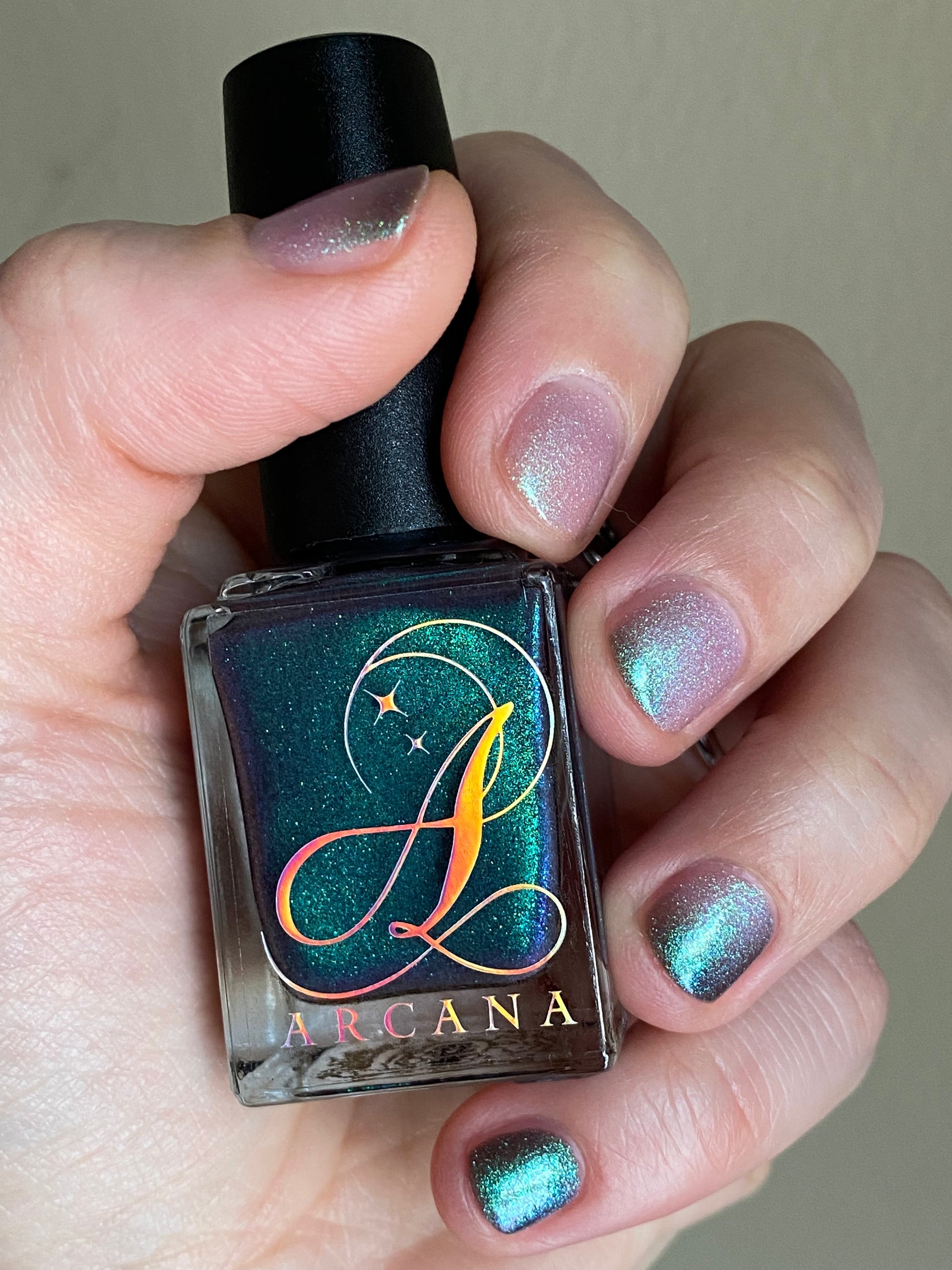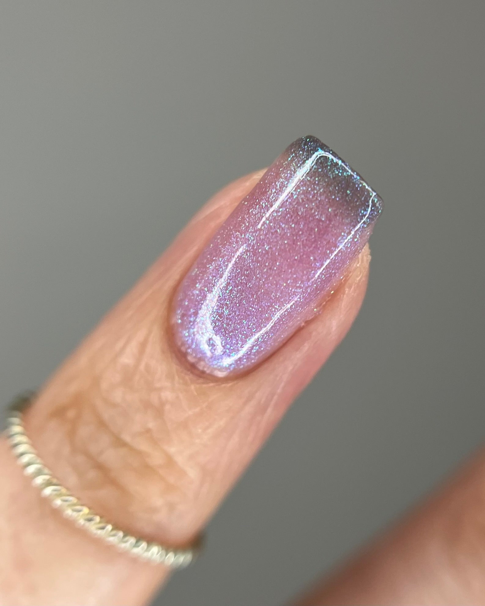 Watch your Sanity is a thermal glow in the dark polish that goes from light pinkish/purple (warm) to very dark purple (cold) with purple glow in the dark pigment and green to blue to purple large particle shimmer!