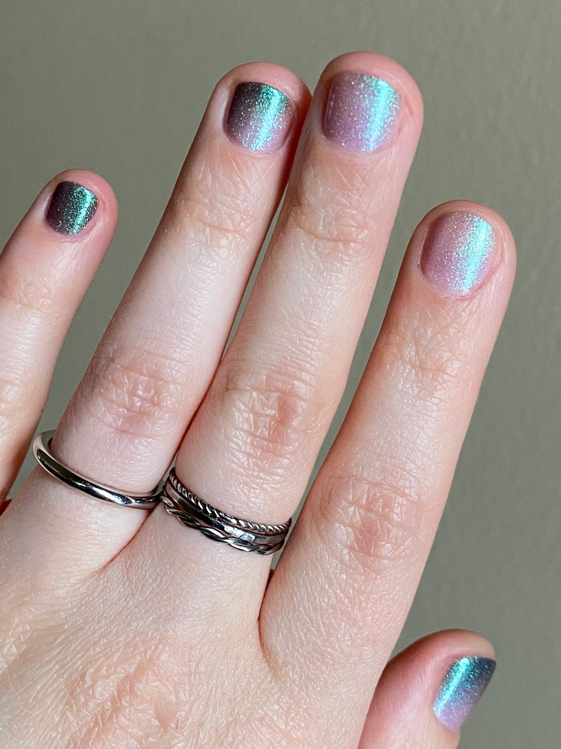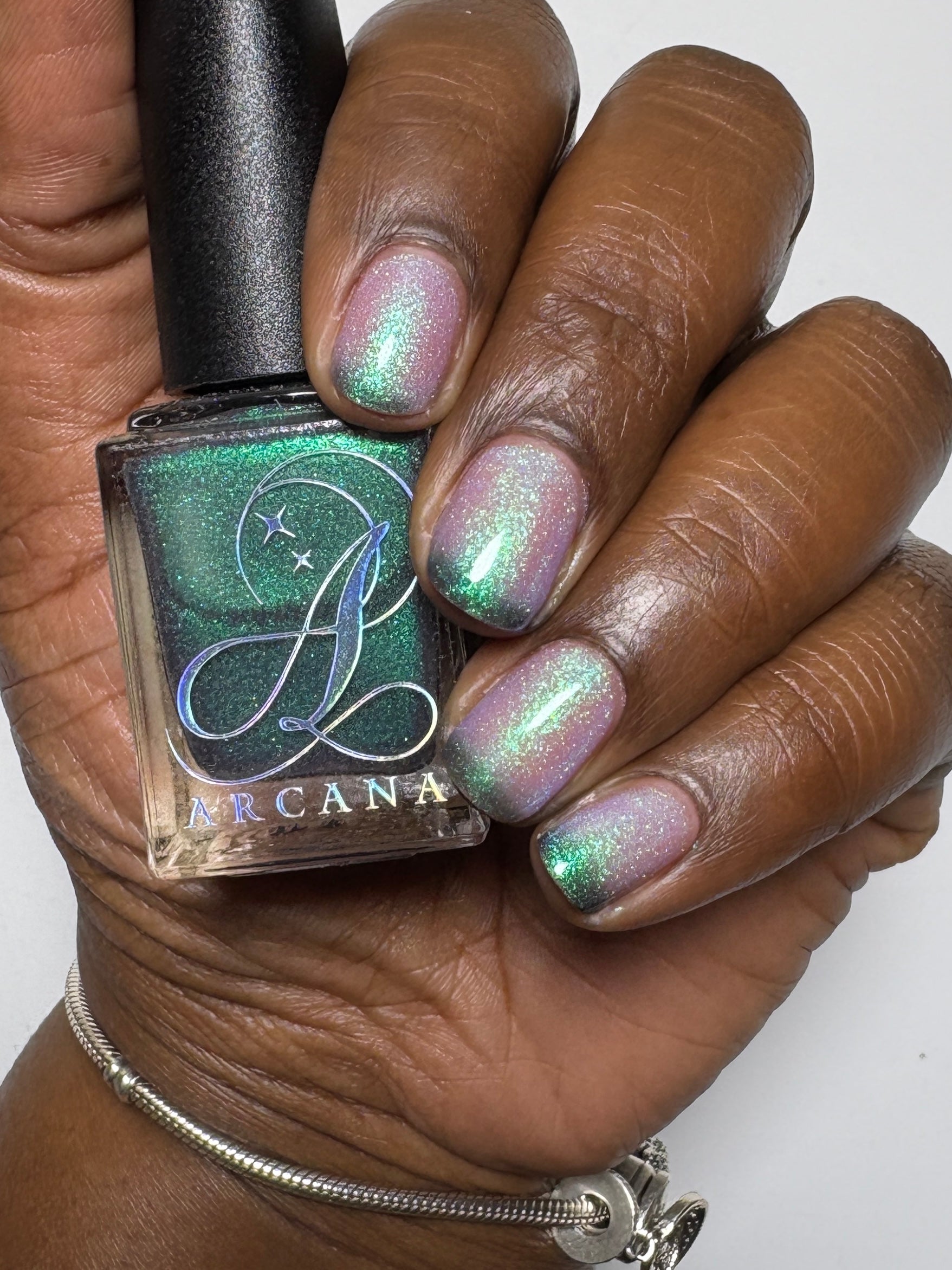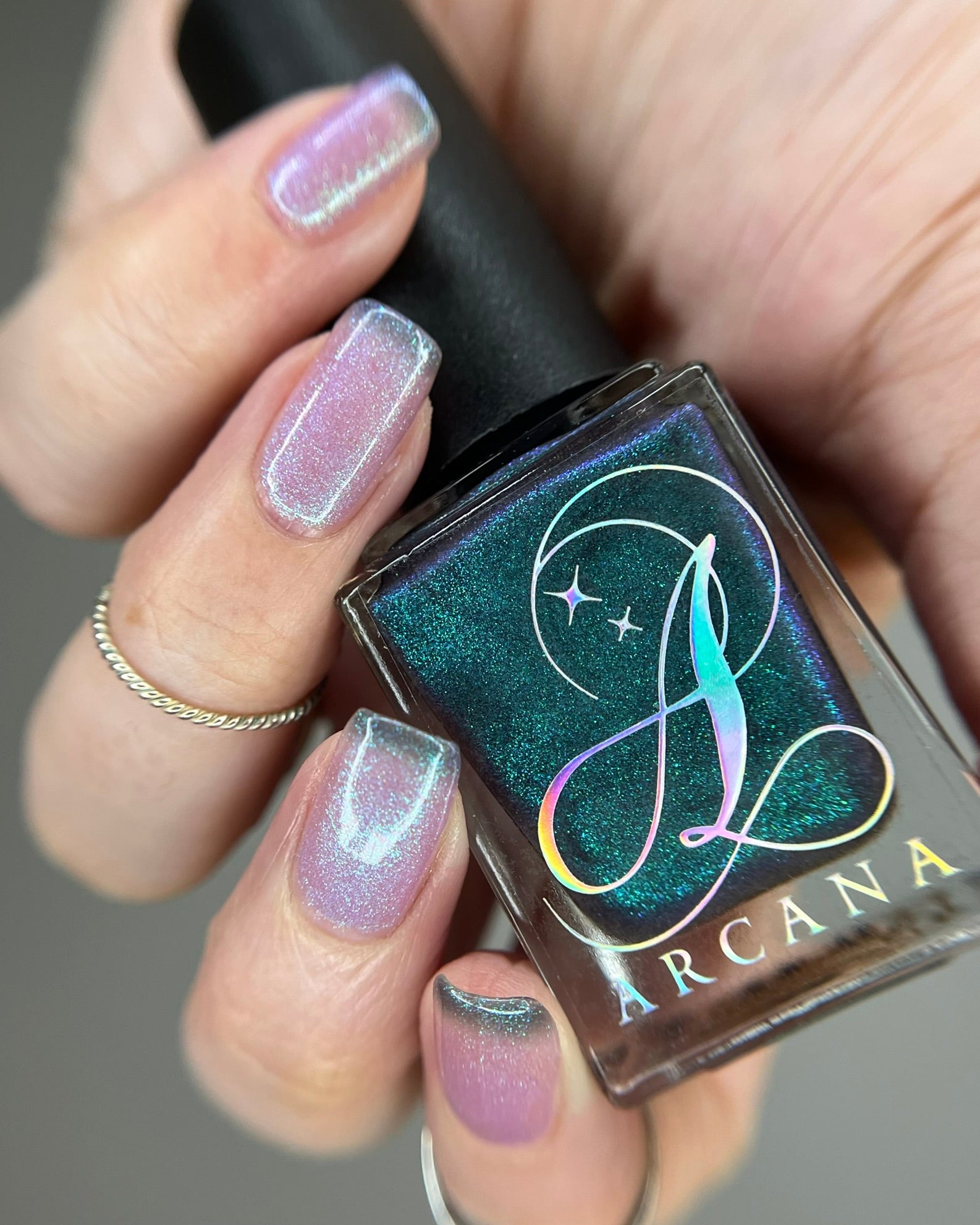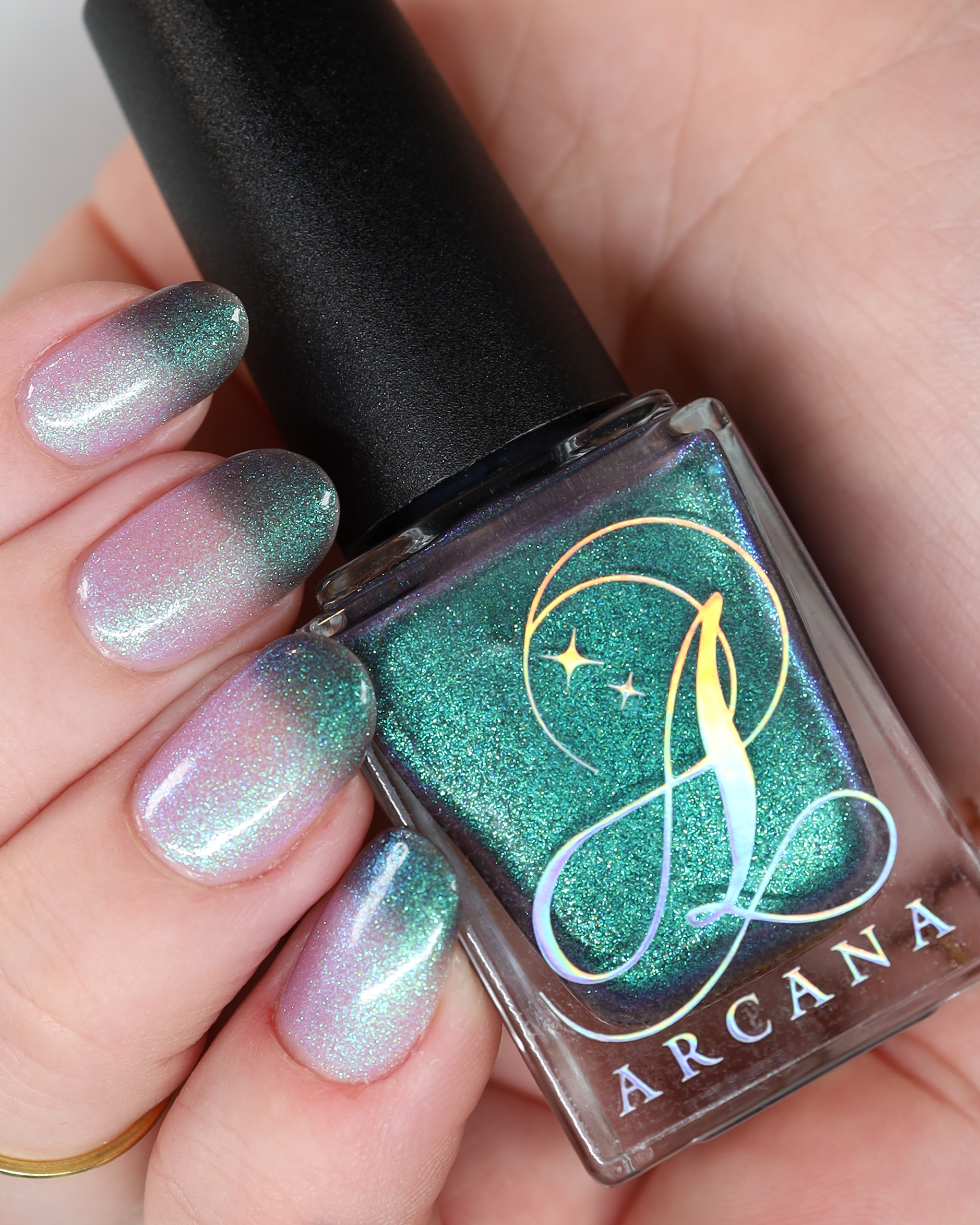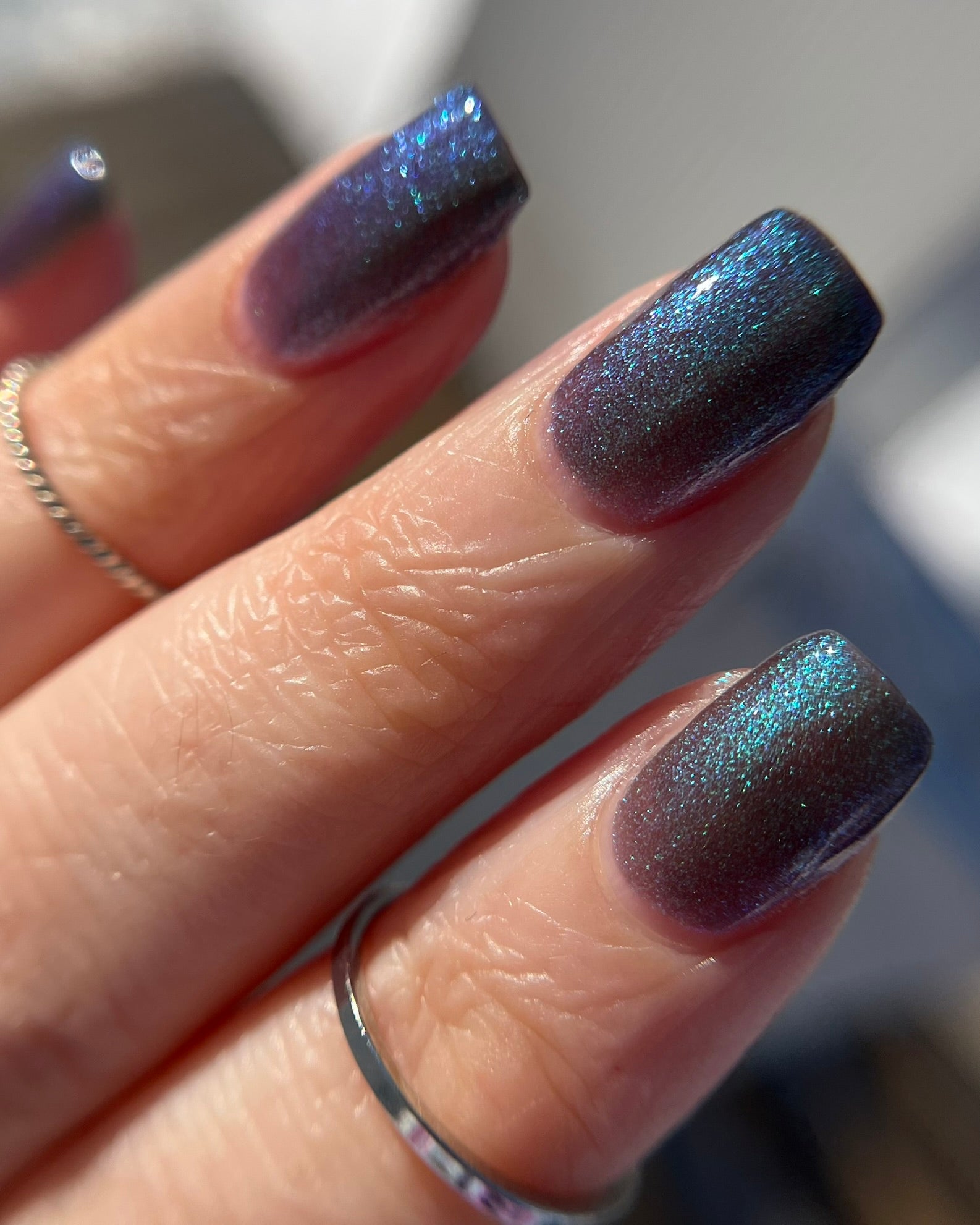 Watch your Sanity is a thermal glow in the dark polish that goes from light pinkish/purple (warm) to very dark purple (cold) with purple glow in the dark pigment and green to blue to purple large particle shimmer!