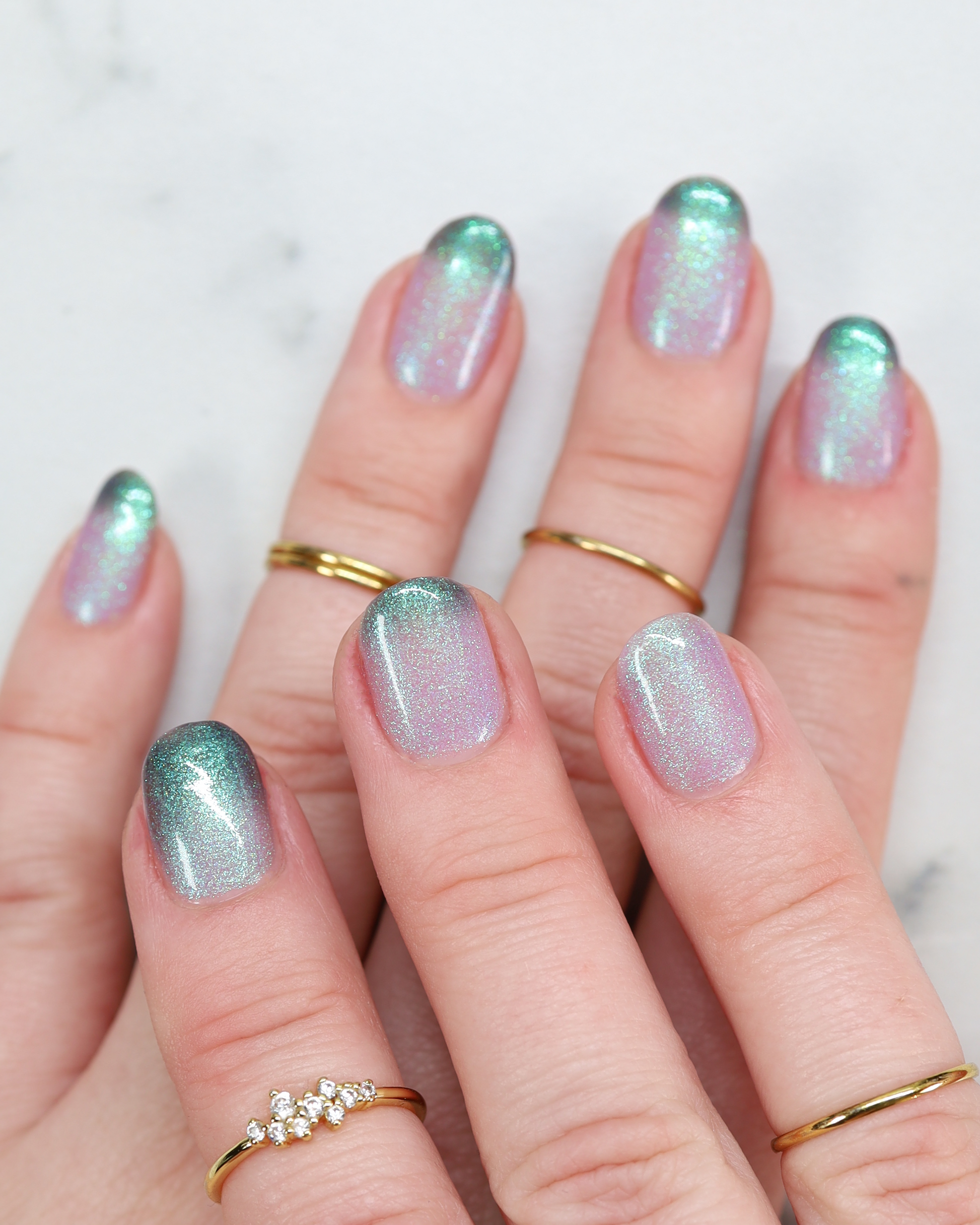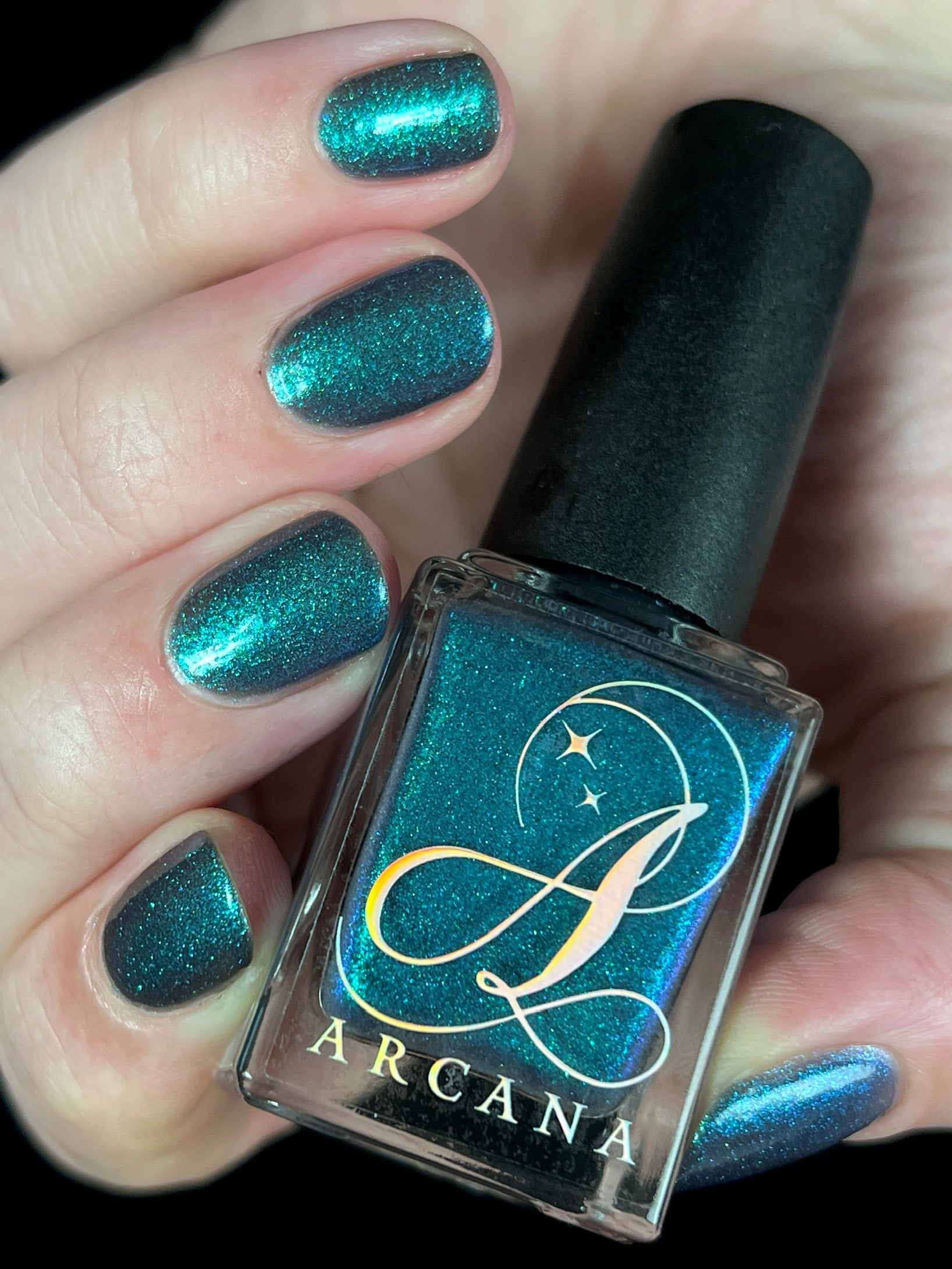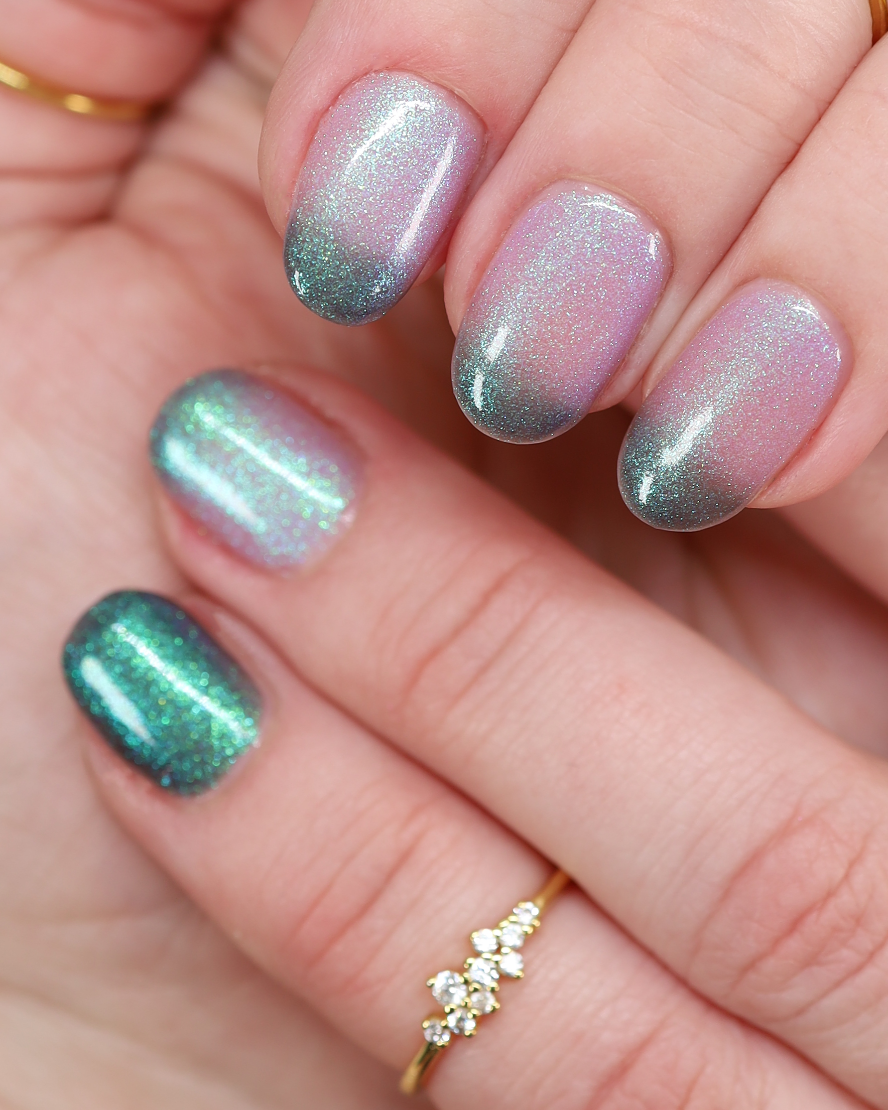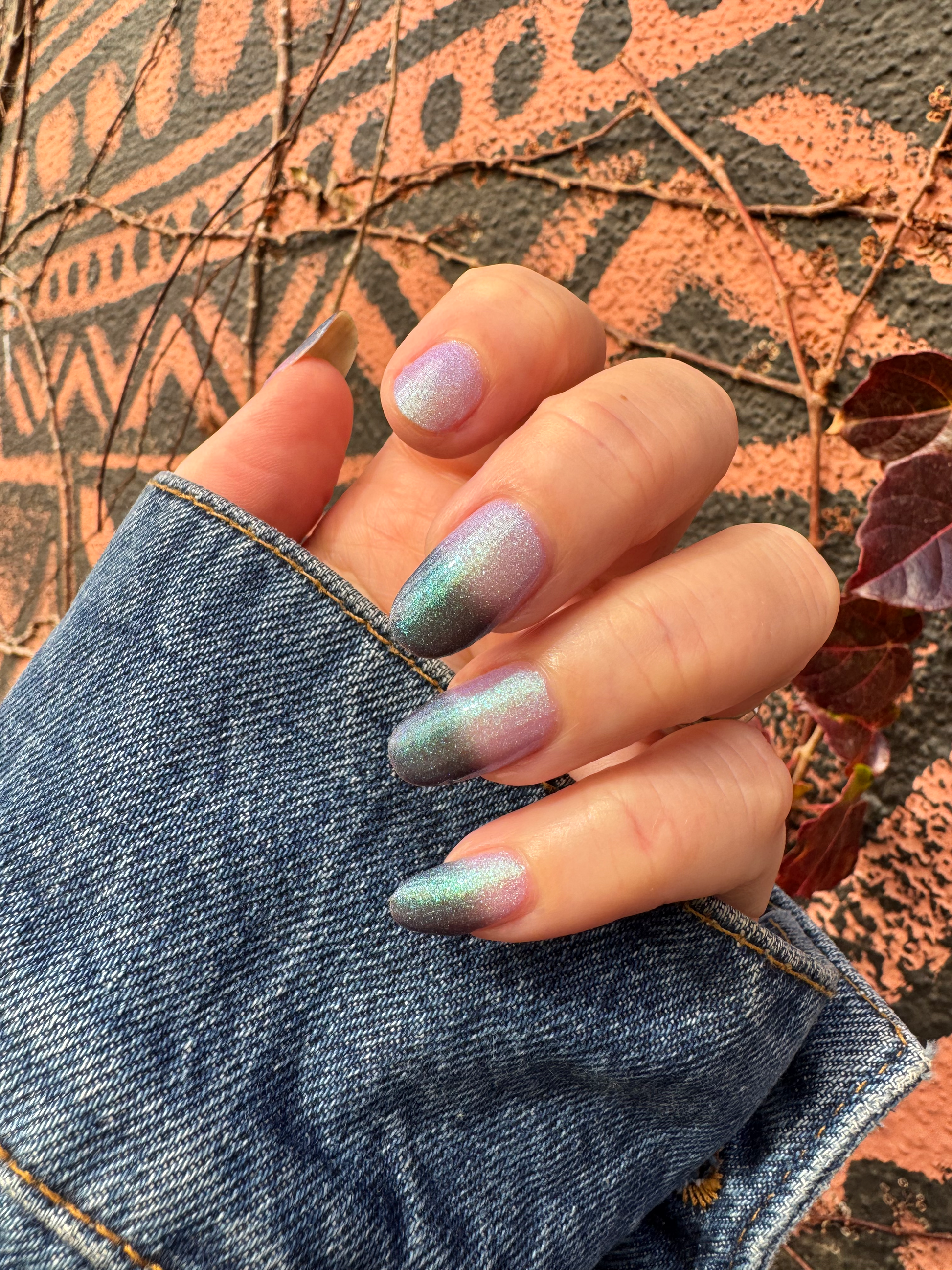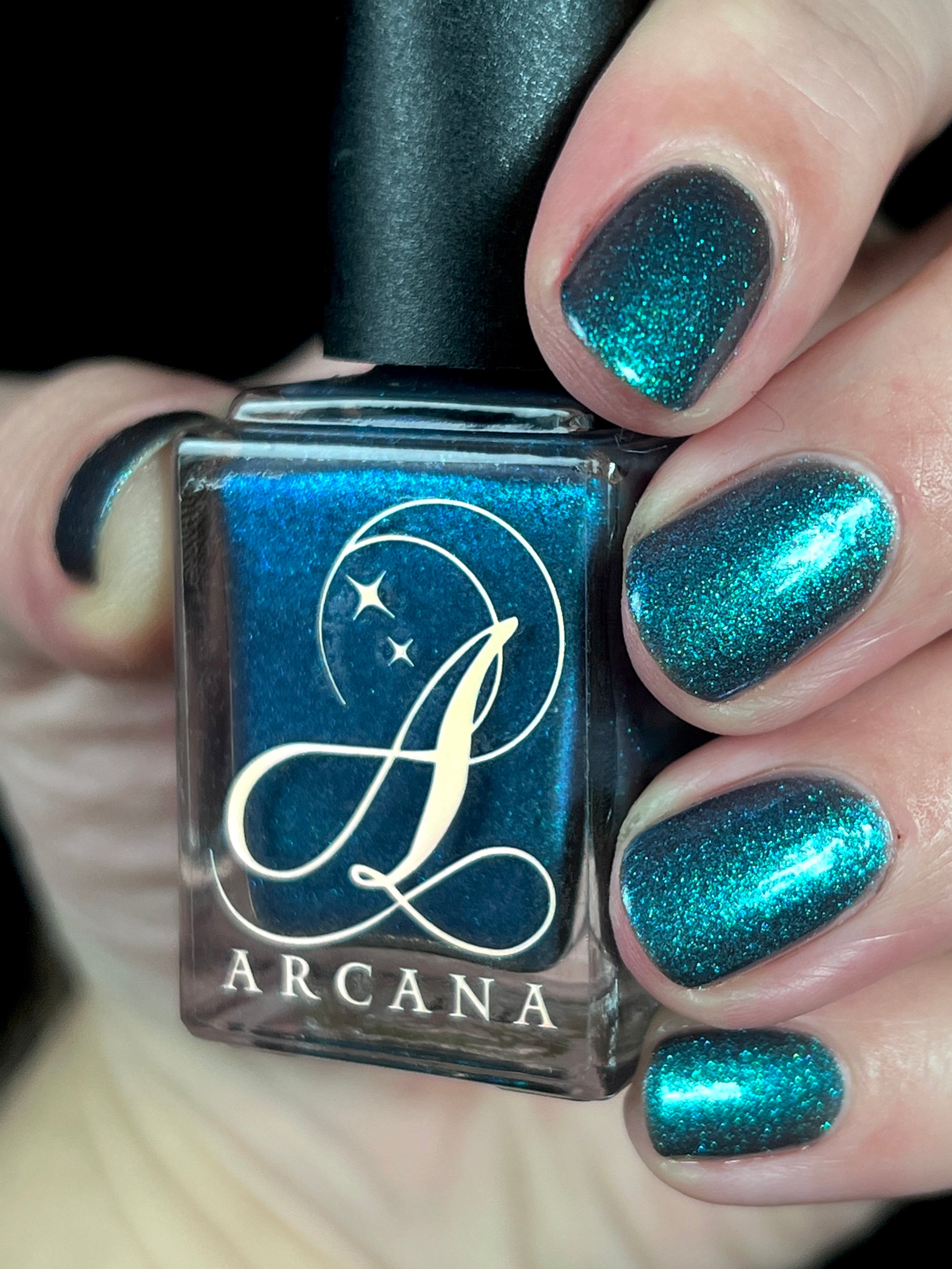 Watch your Sanity is a thermal glow in the dark polish that goes from light pinkish/purple (warm) to very dark purple (cold) with purple glow in the dark pigment and green to blue to purple large particle shimmer!