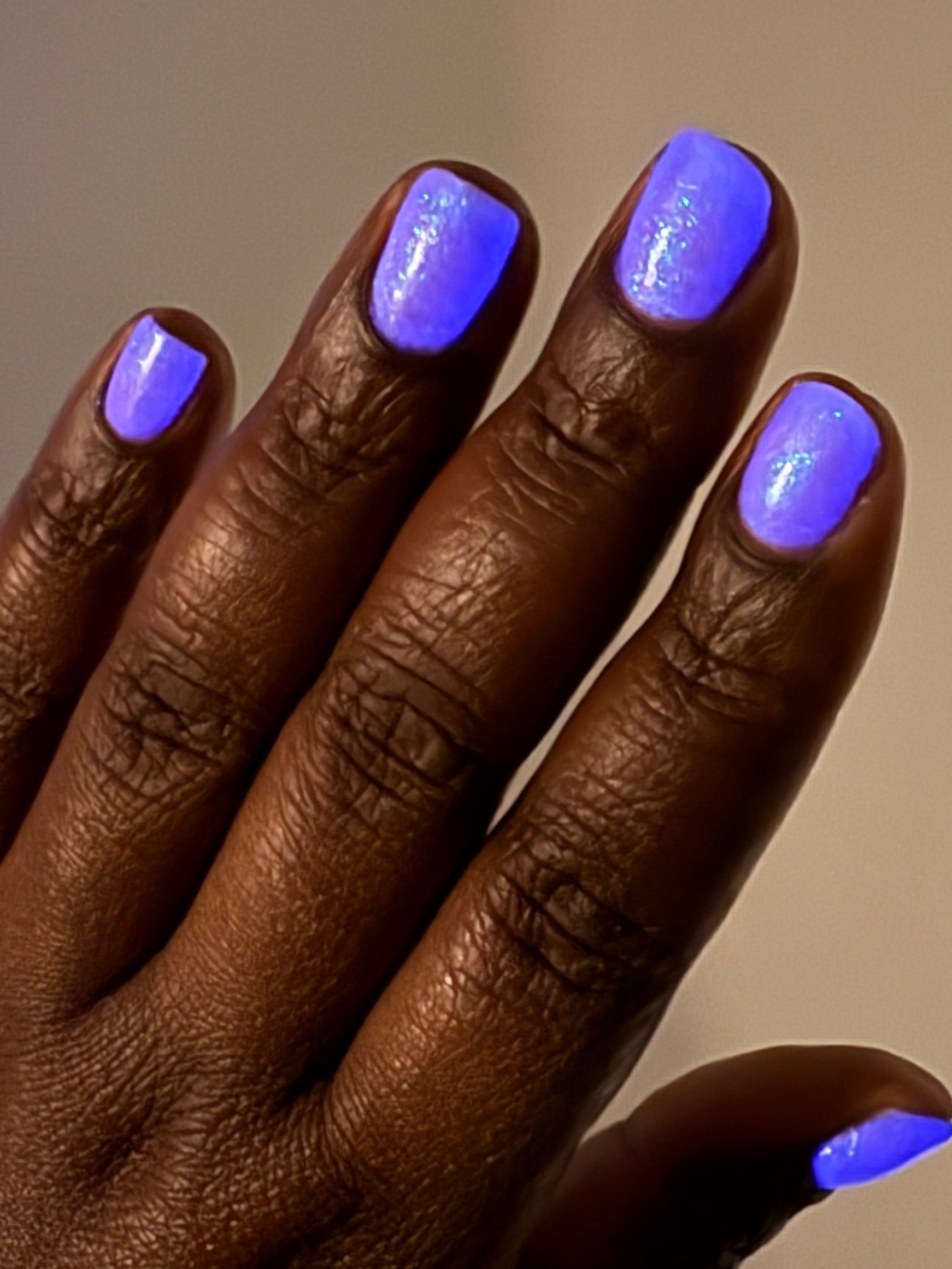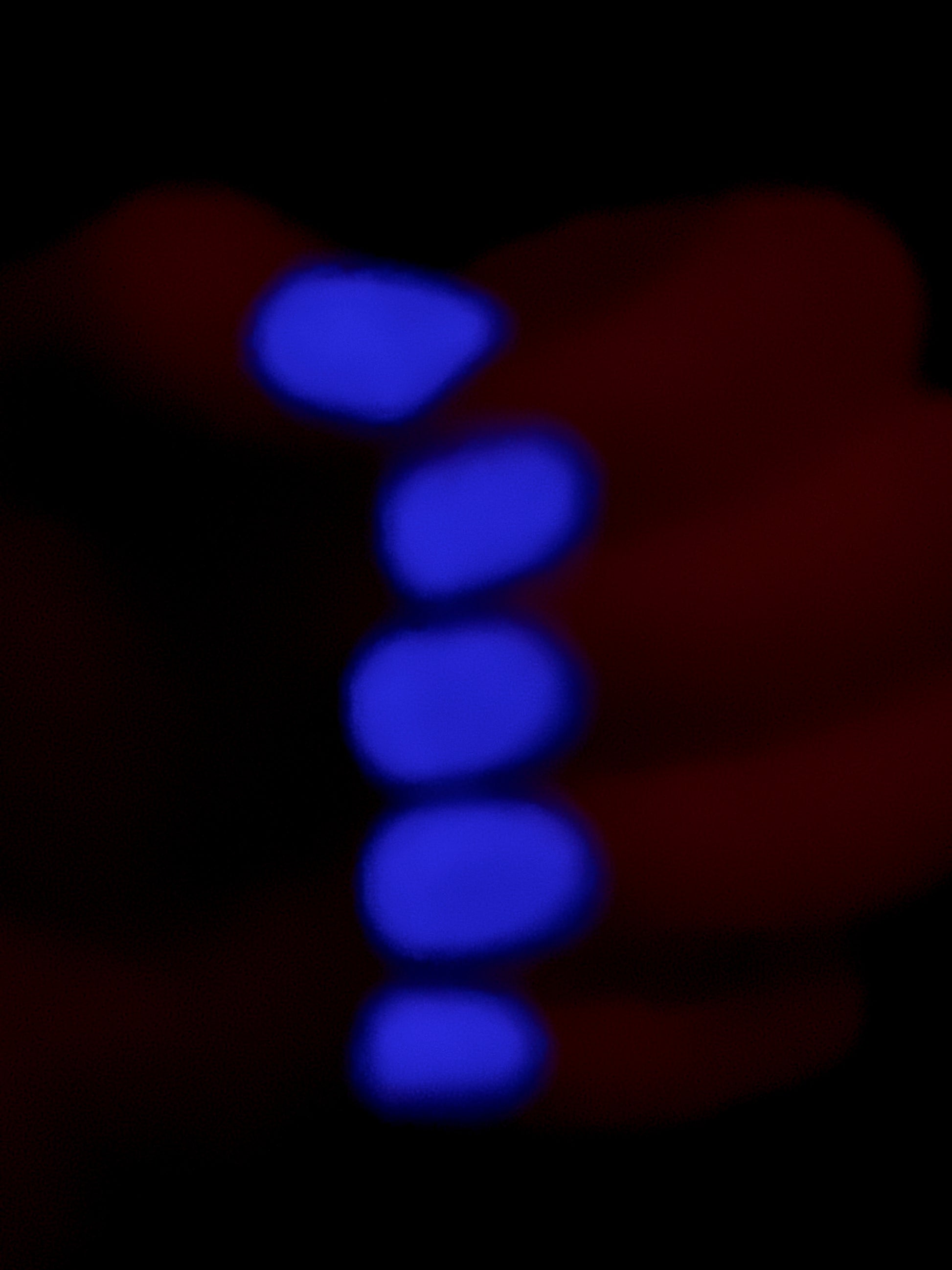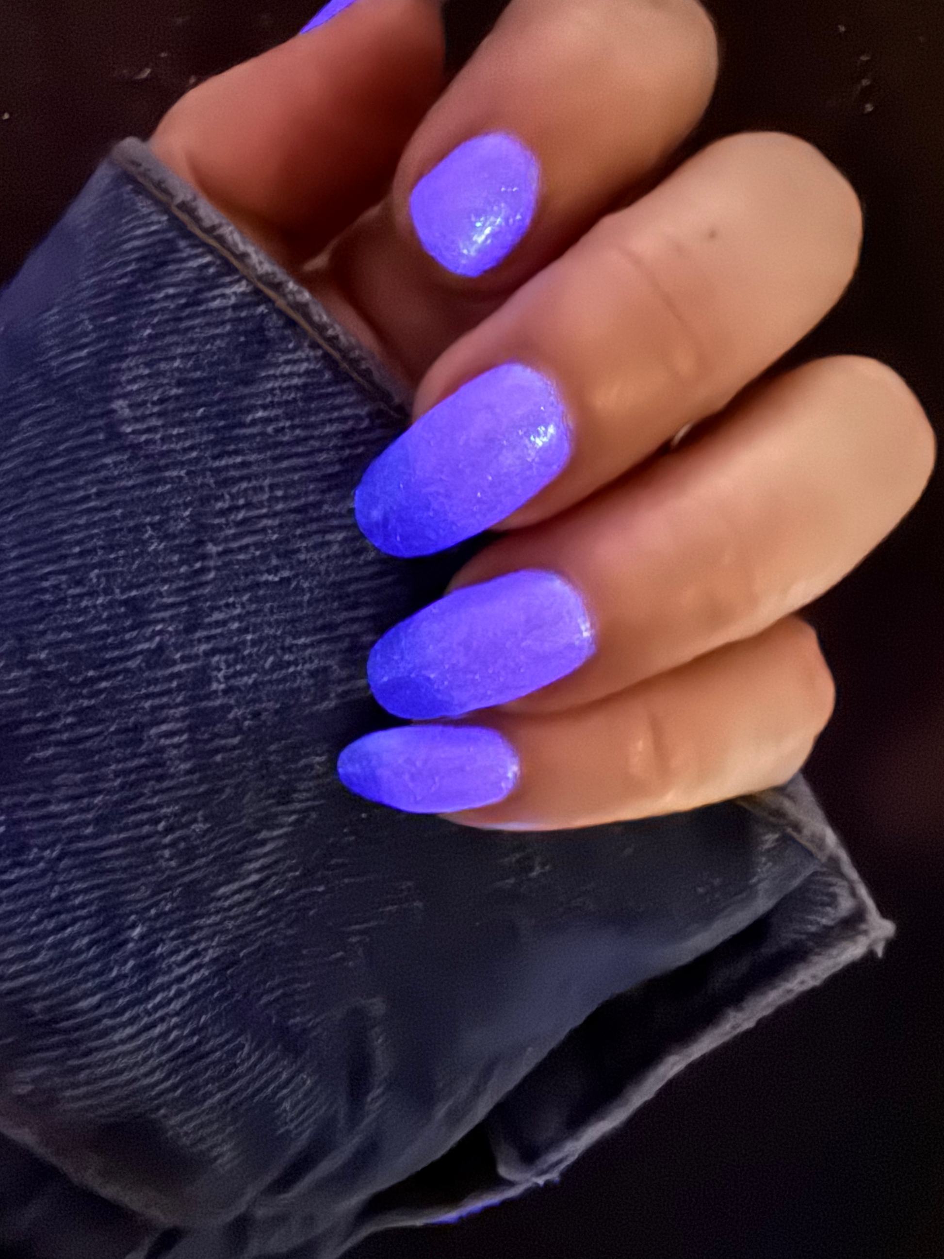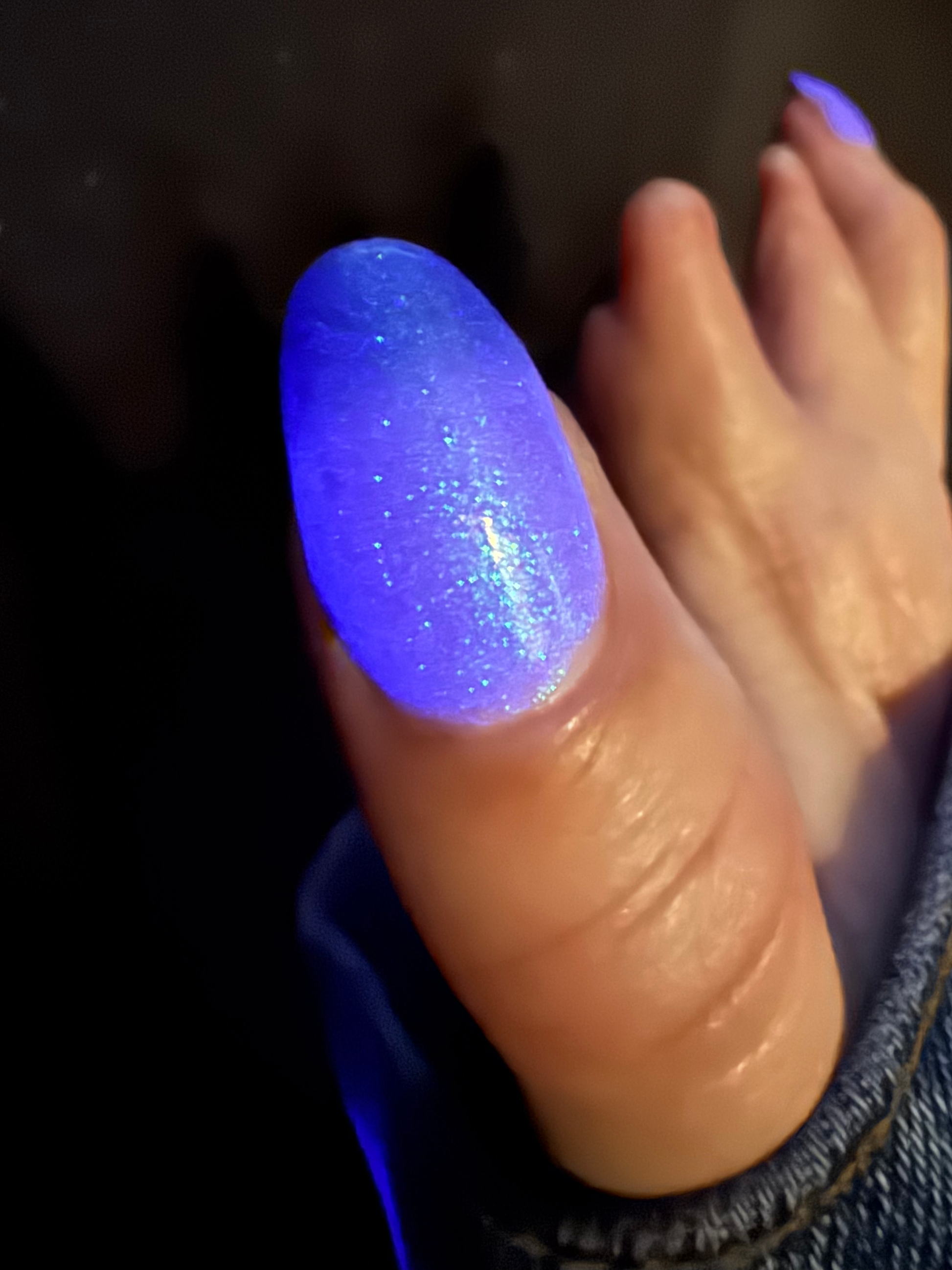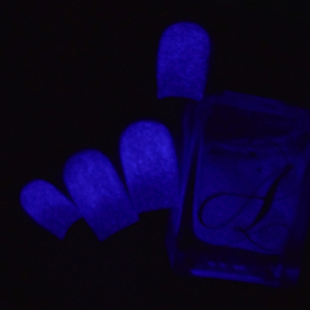 This polish glows best in the warm state! This gives a very cool effect in the dark - with the free edge dark and your nail bed bright purple! Glow pigment can be charged with UV light or direct sunlight.