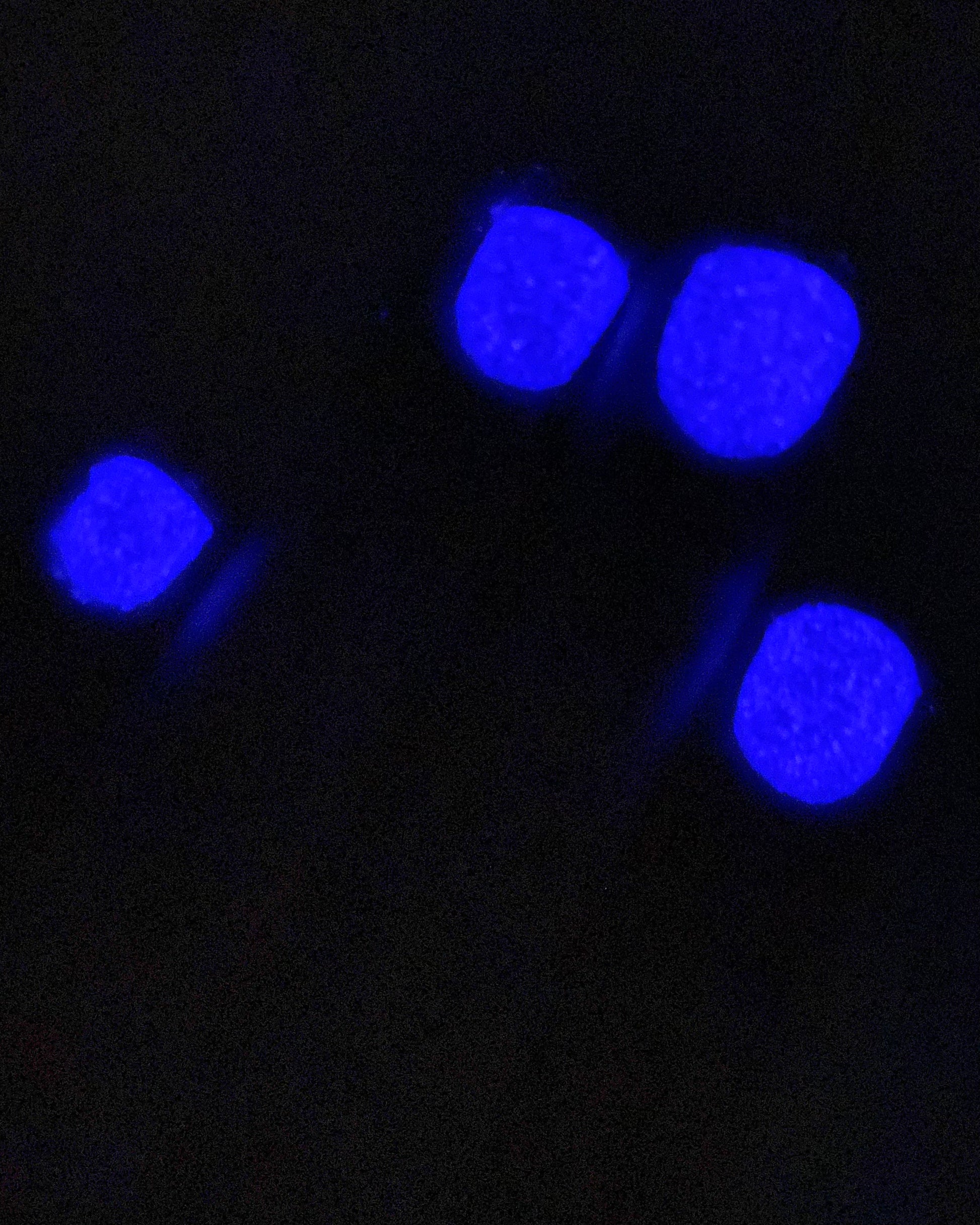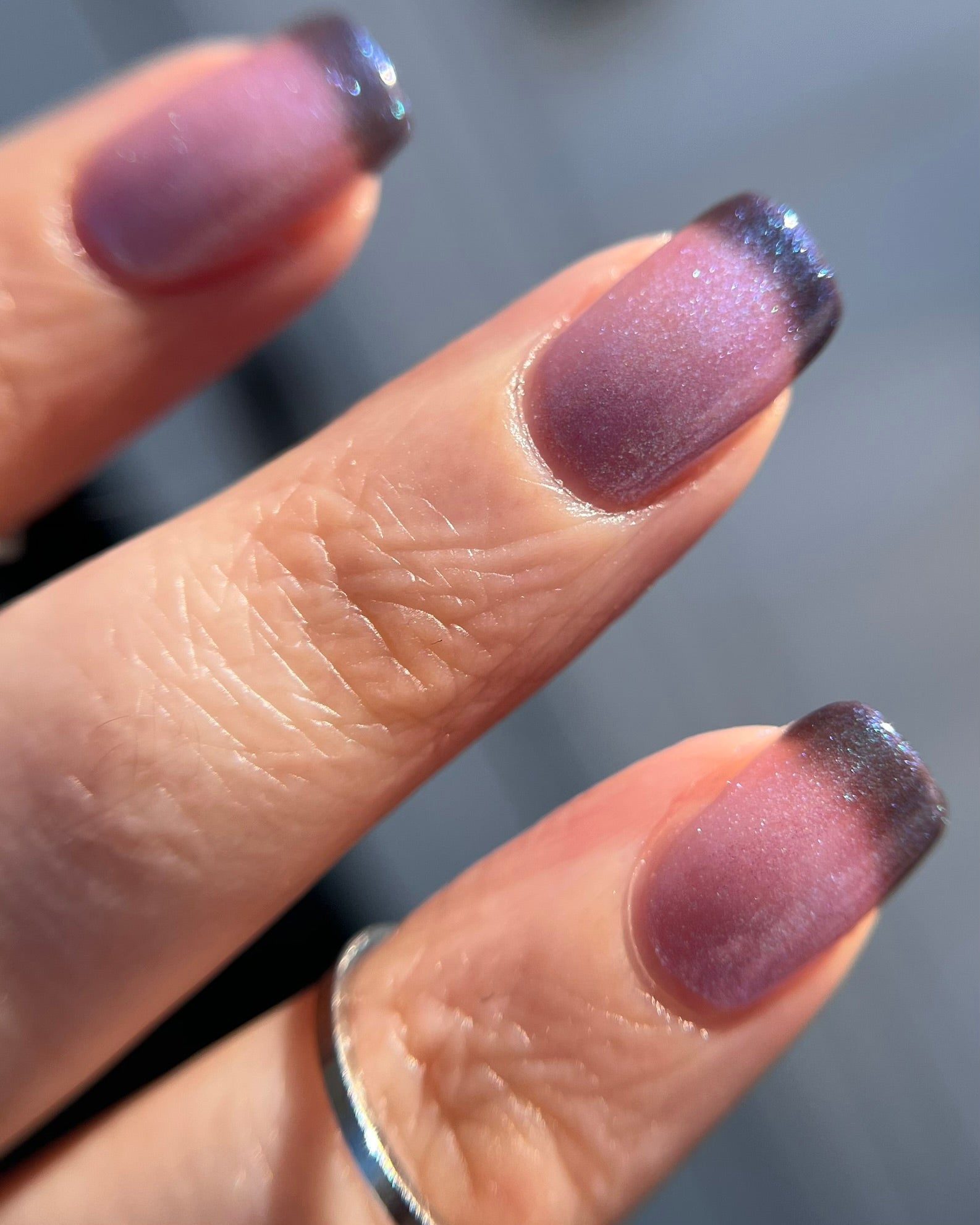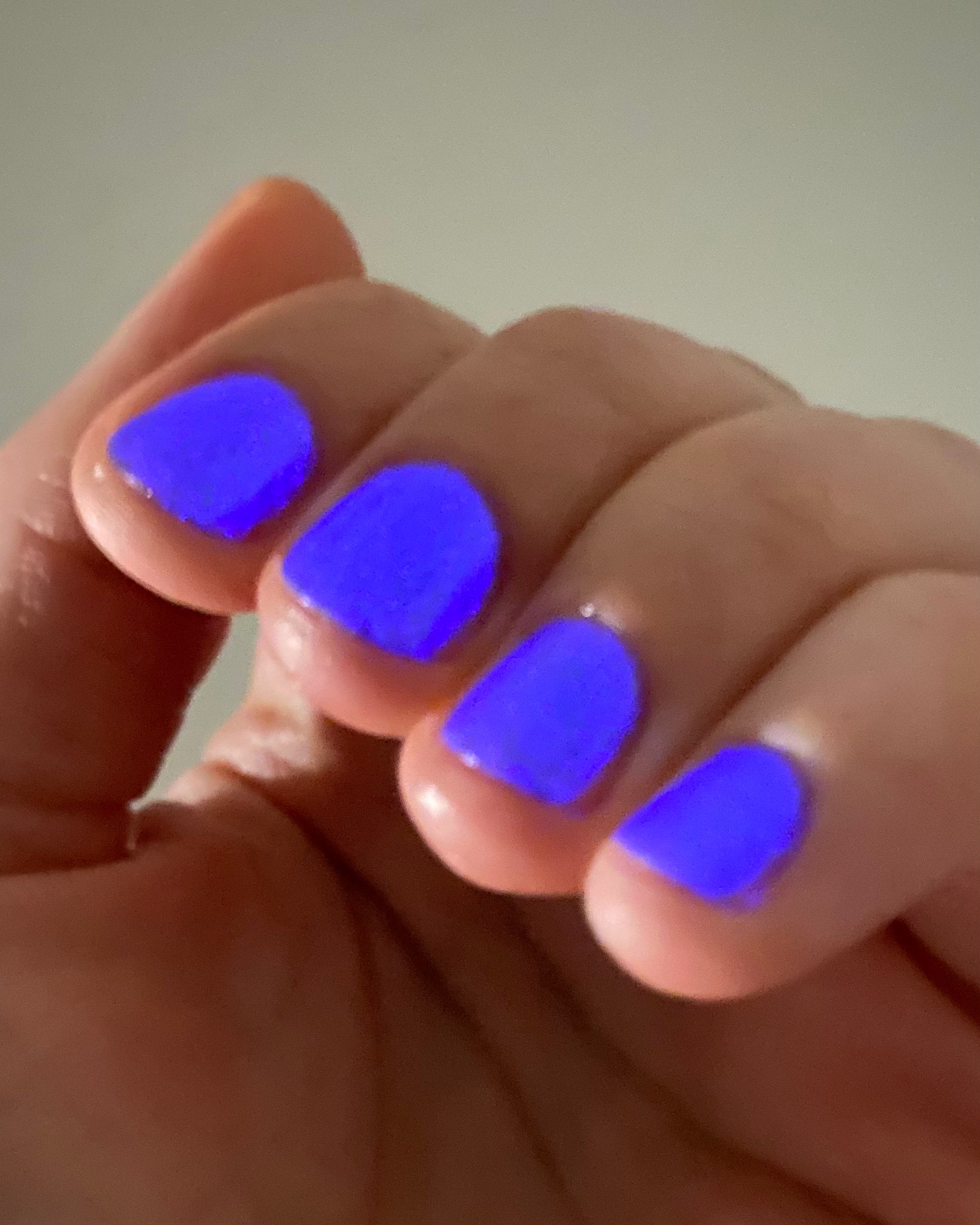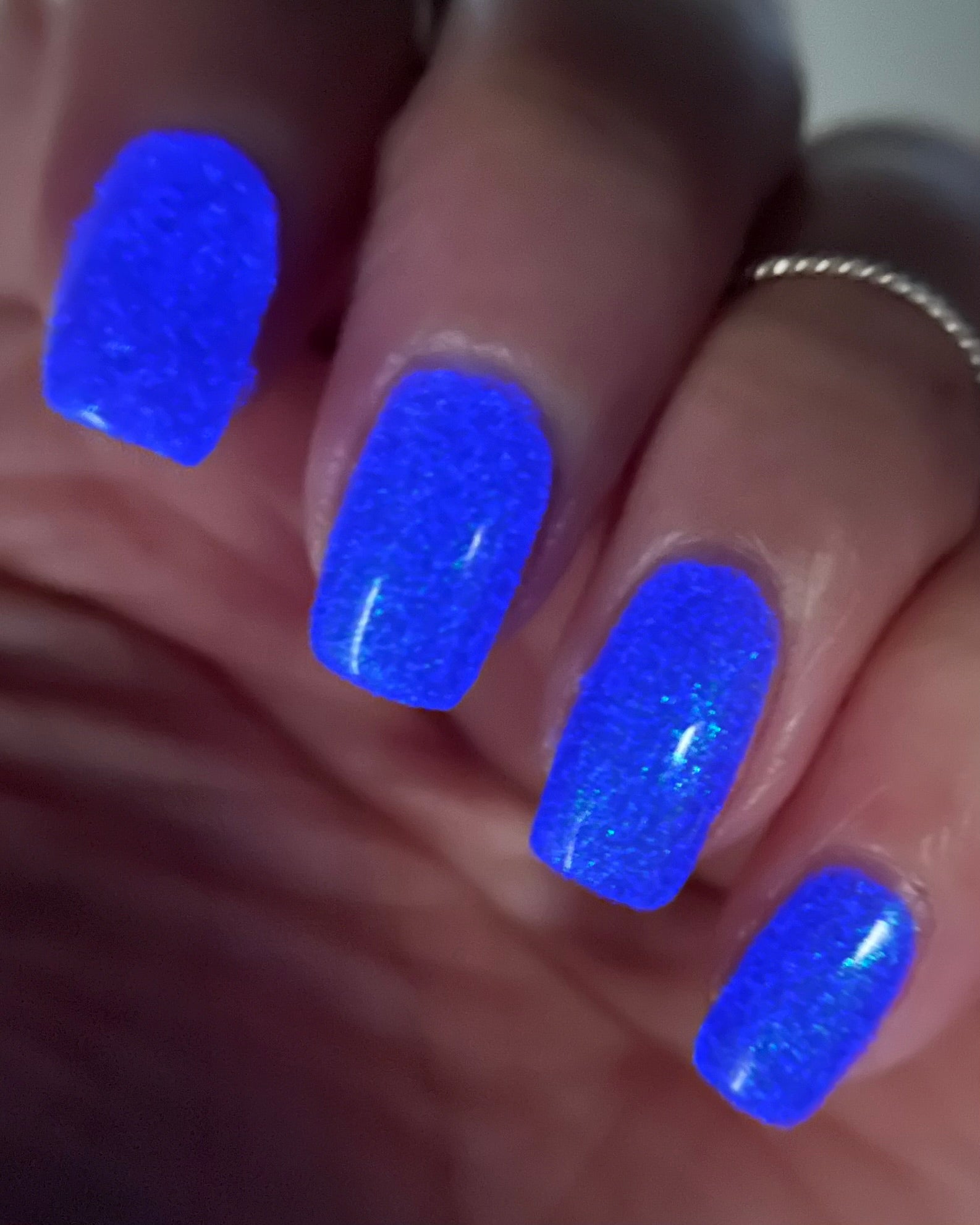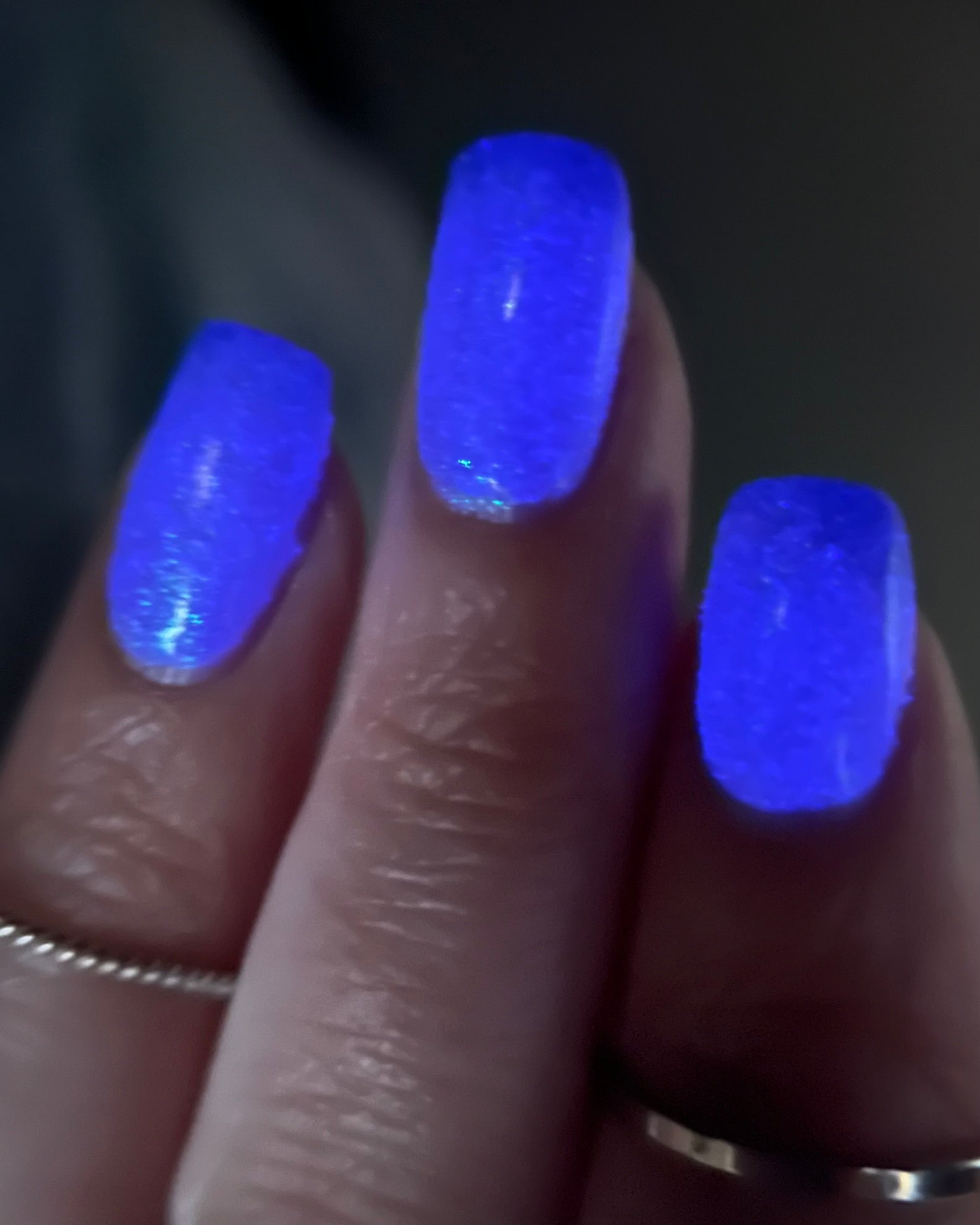 This polish glows best in the warm state! This gives a very cool effect in the dark - with the free edge dark and your nail bed bright purple! Glow pigment can be charged with UV light or direct sunlight.