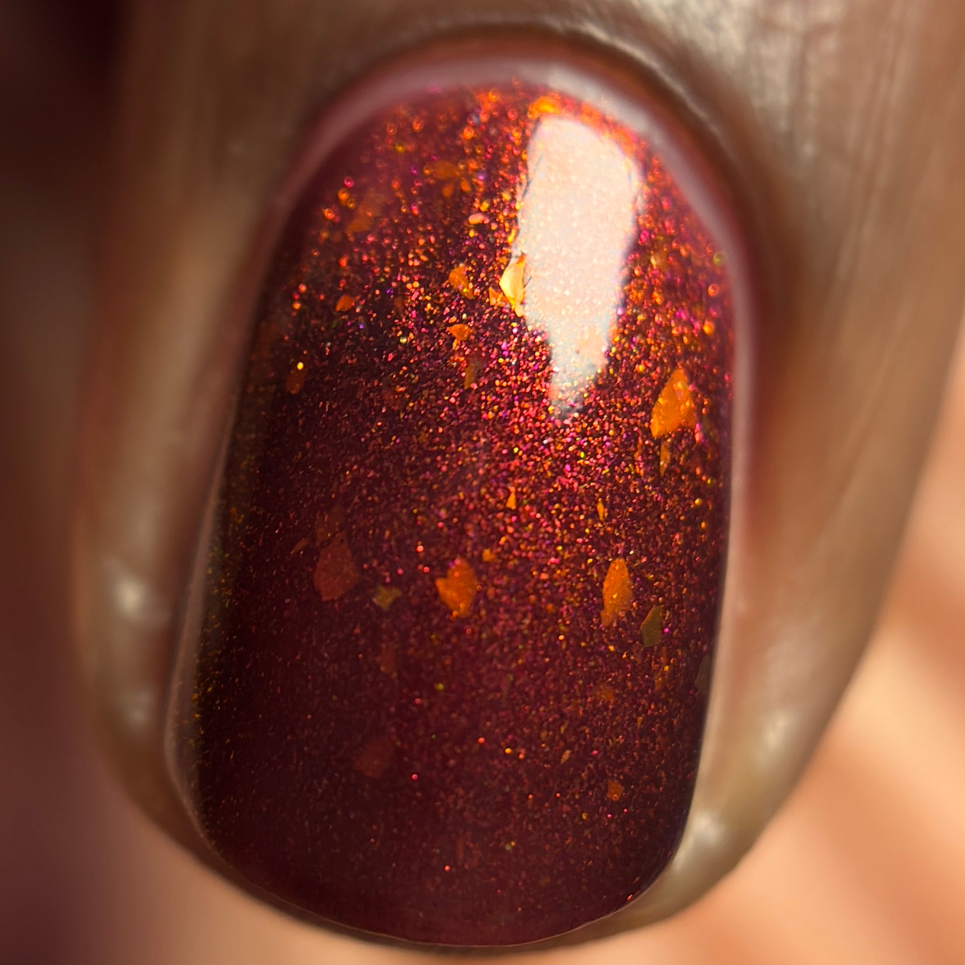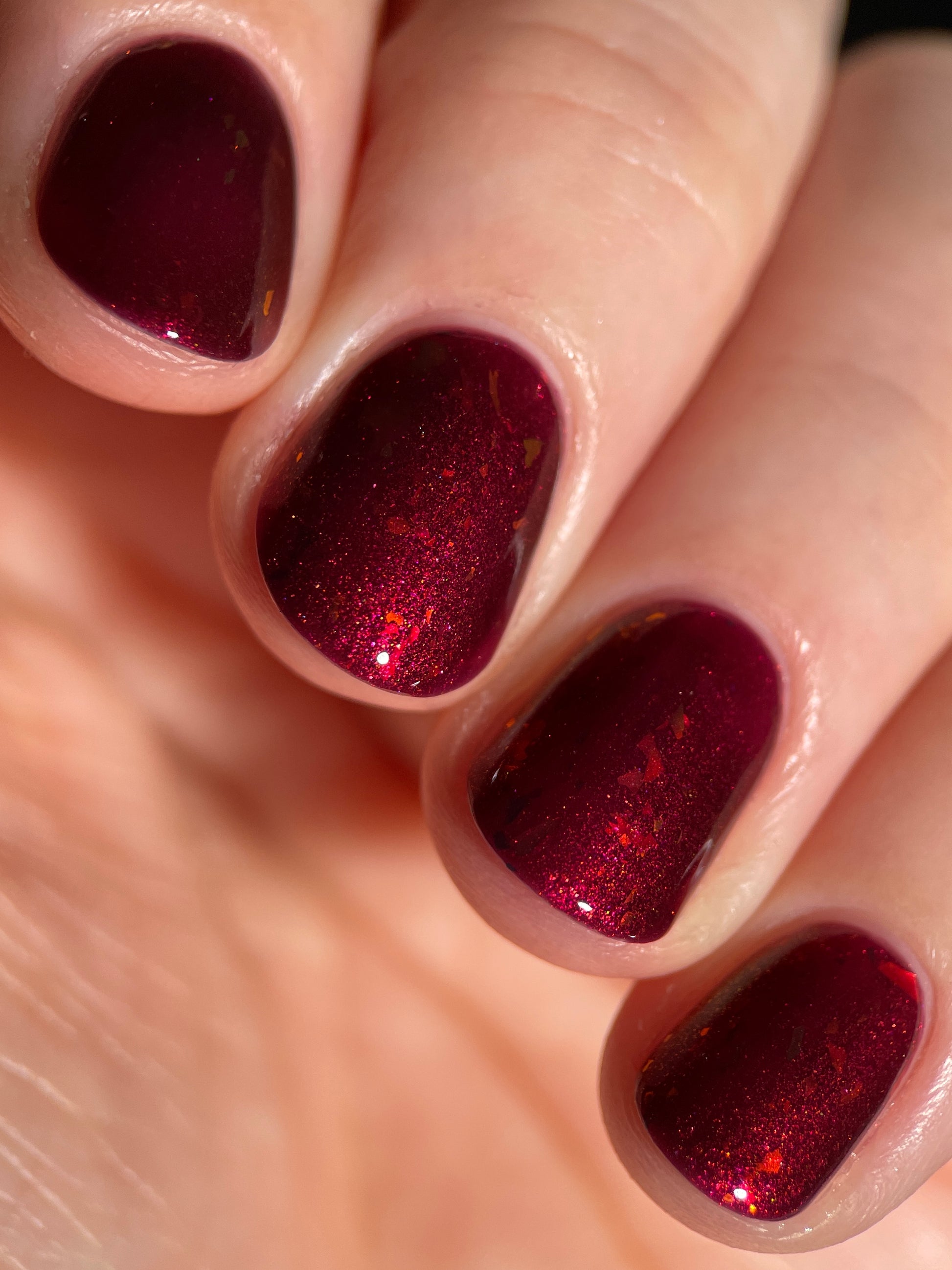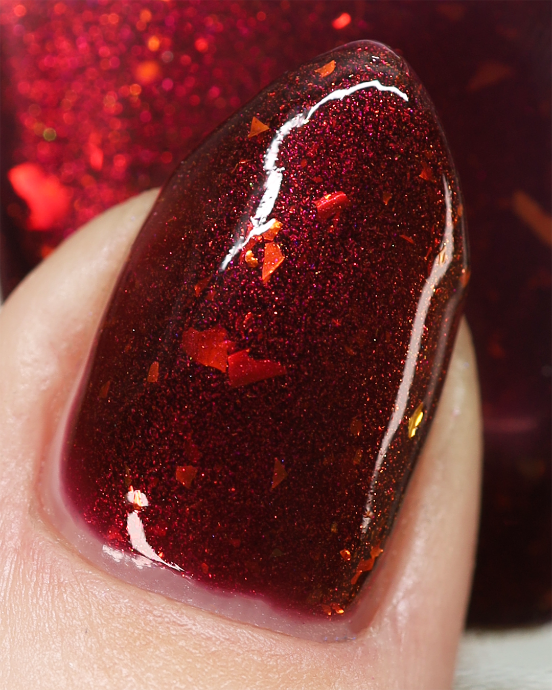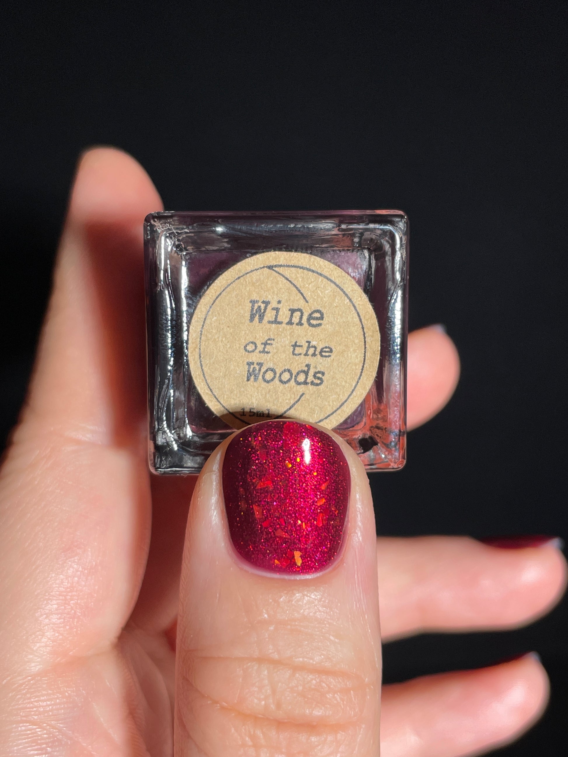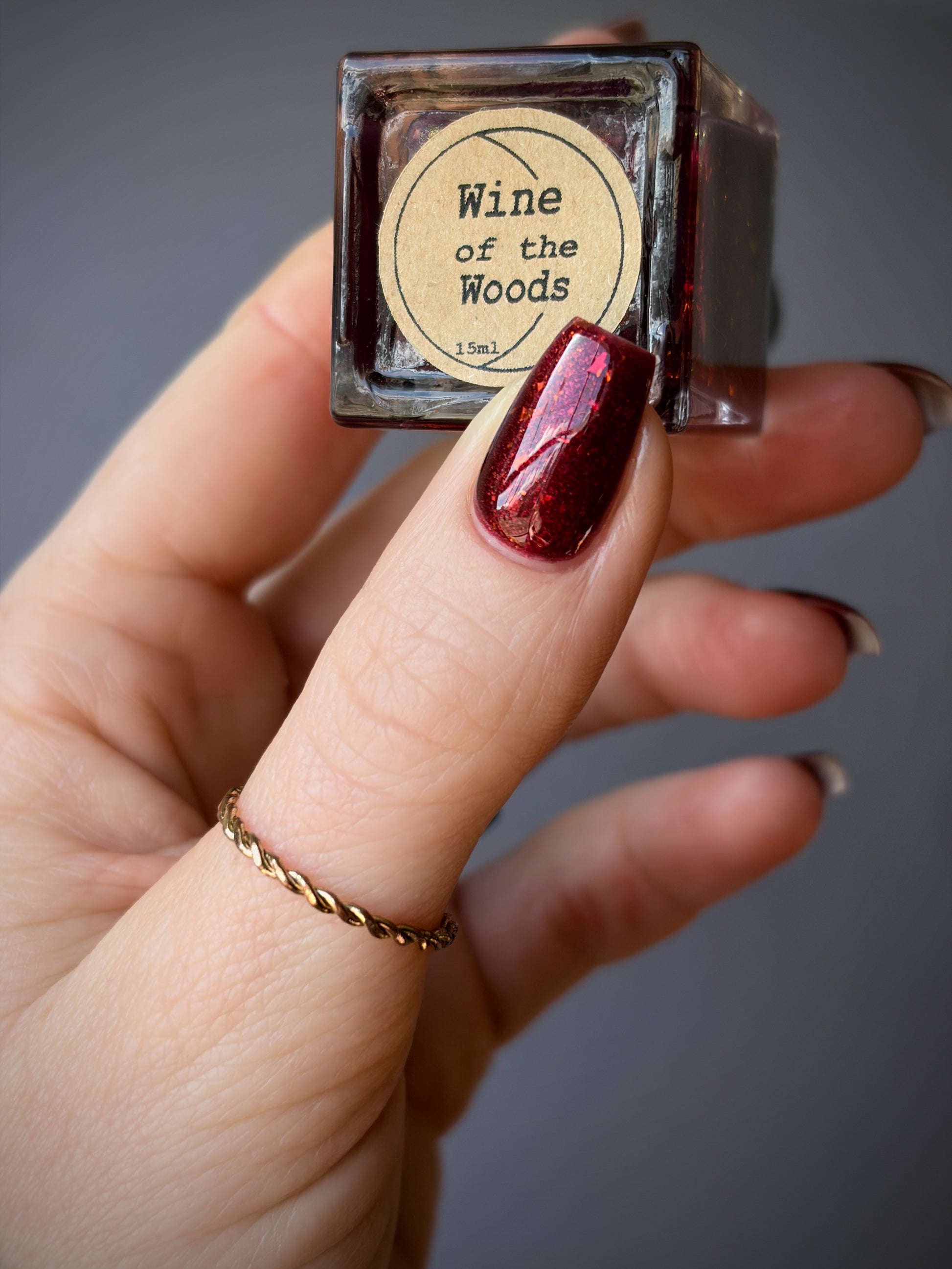 Wine of the Woods is a deep maroon base with red-orange shimmer and red-orange flakes.