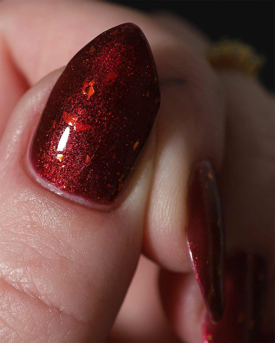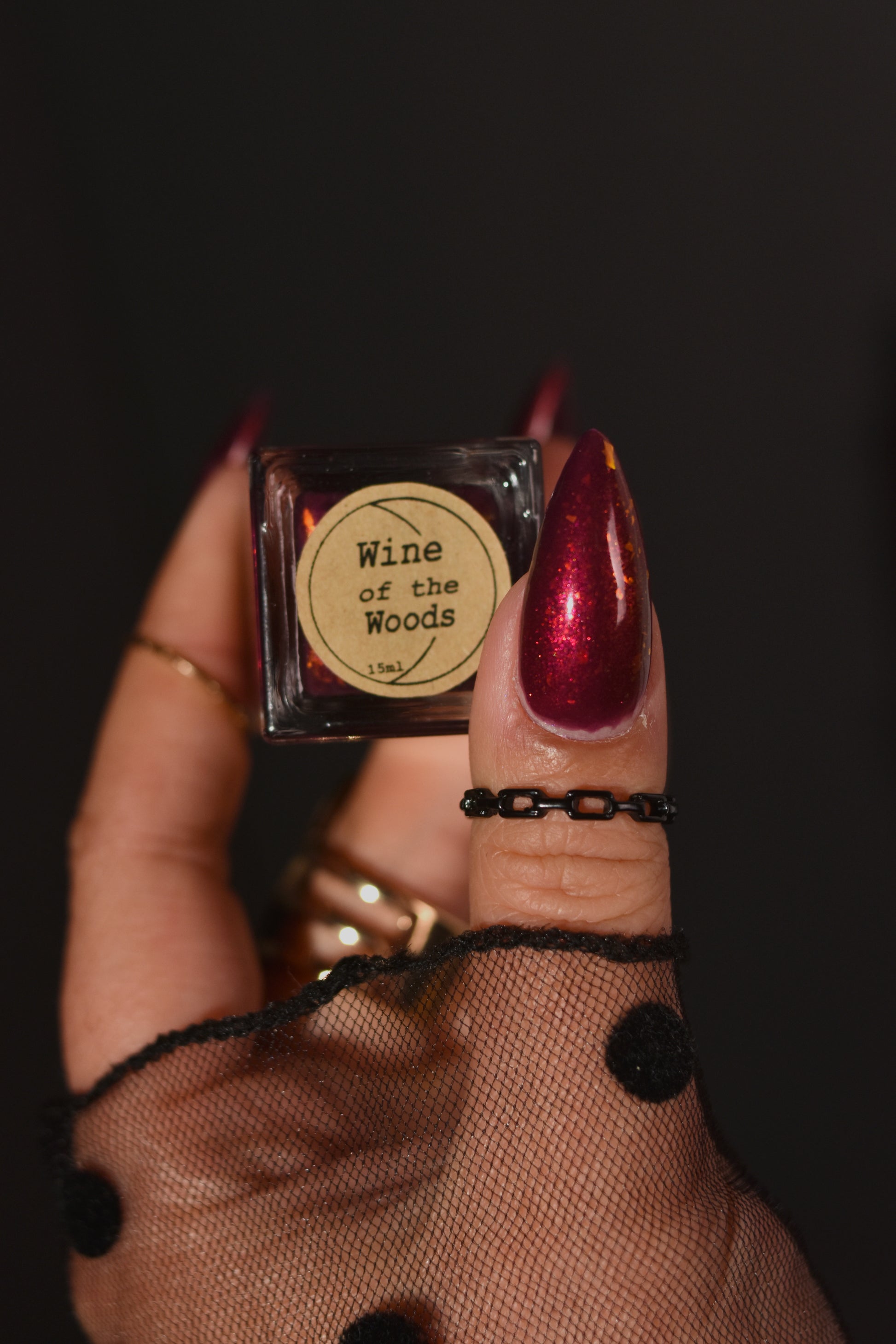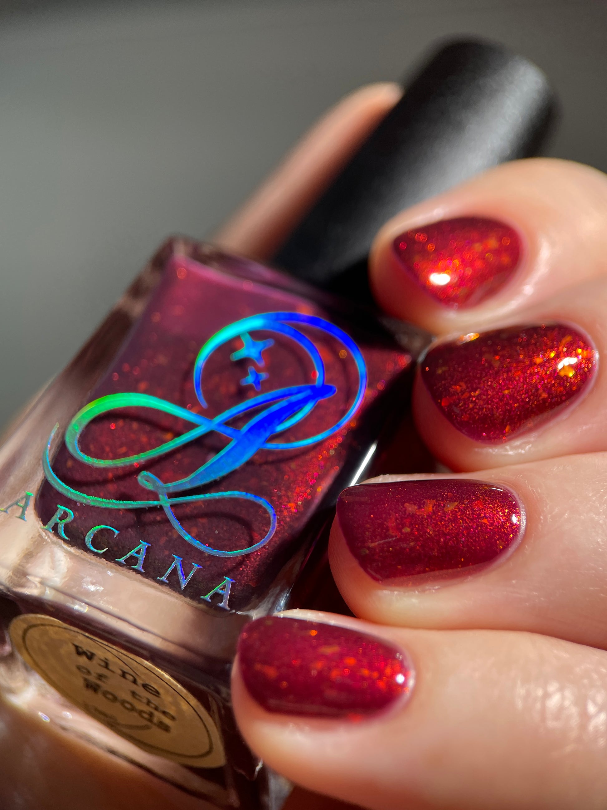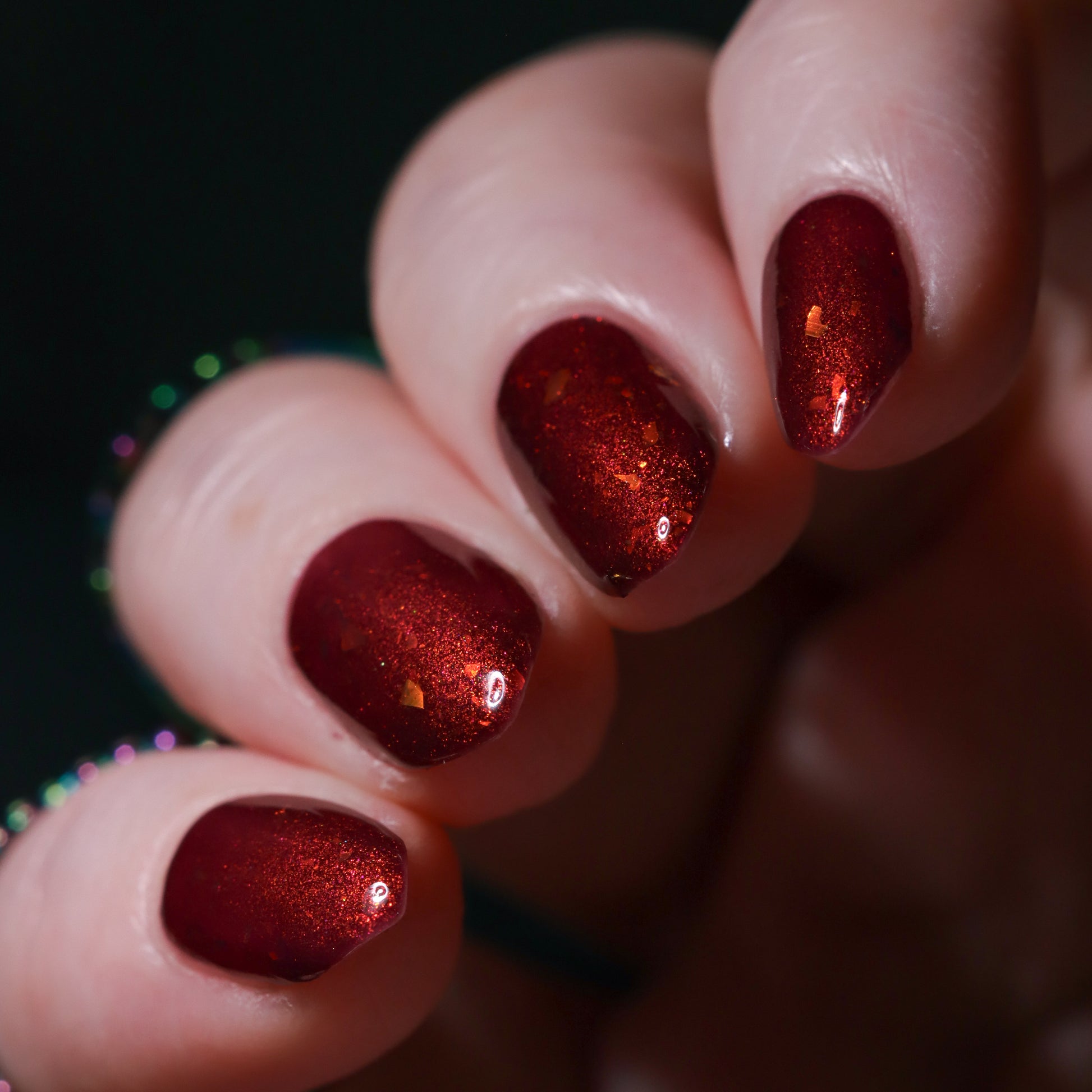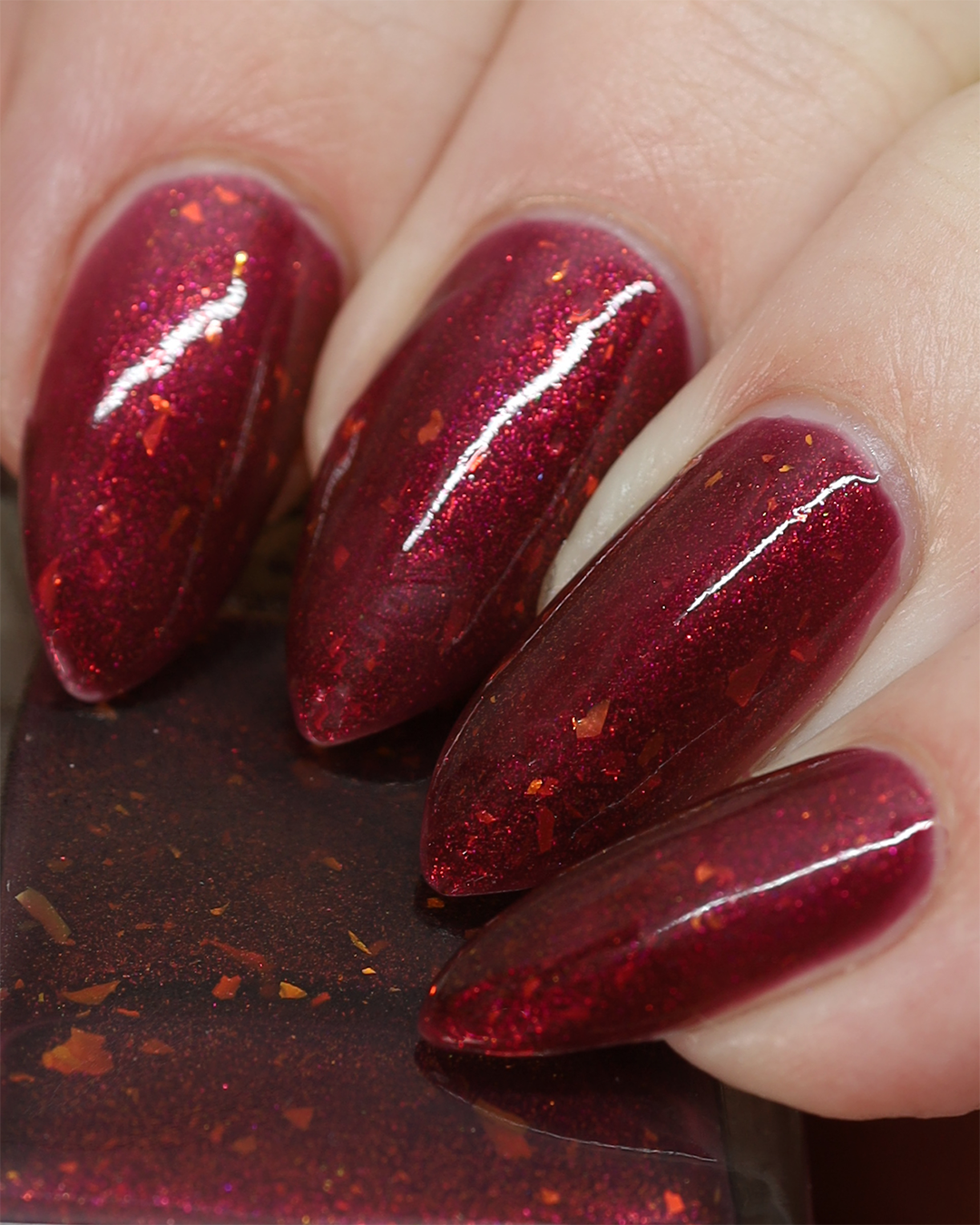 Wine of the Woods is a deep maroon base with red-orange shimmer and red-orange flakes.