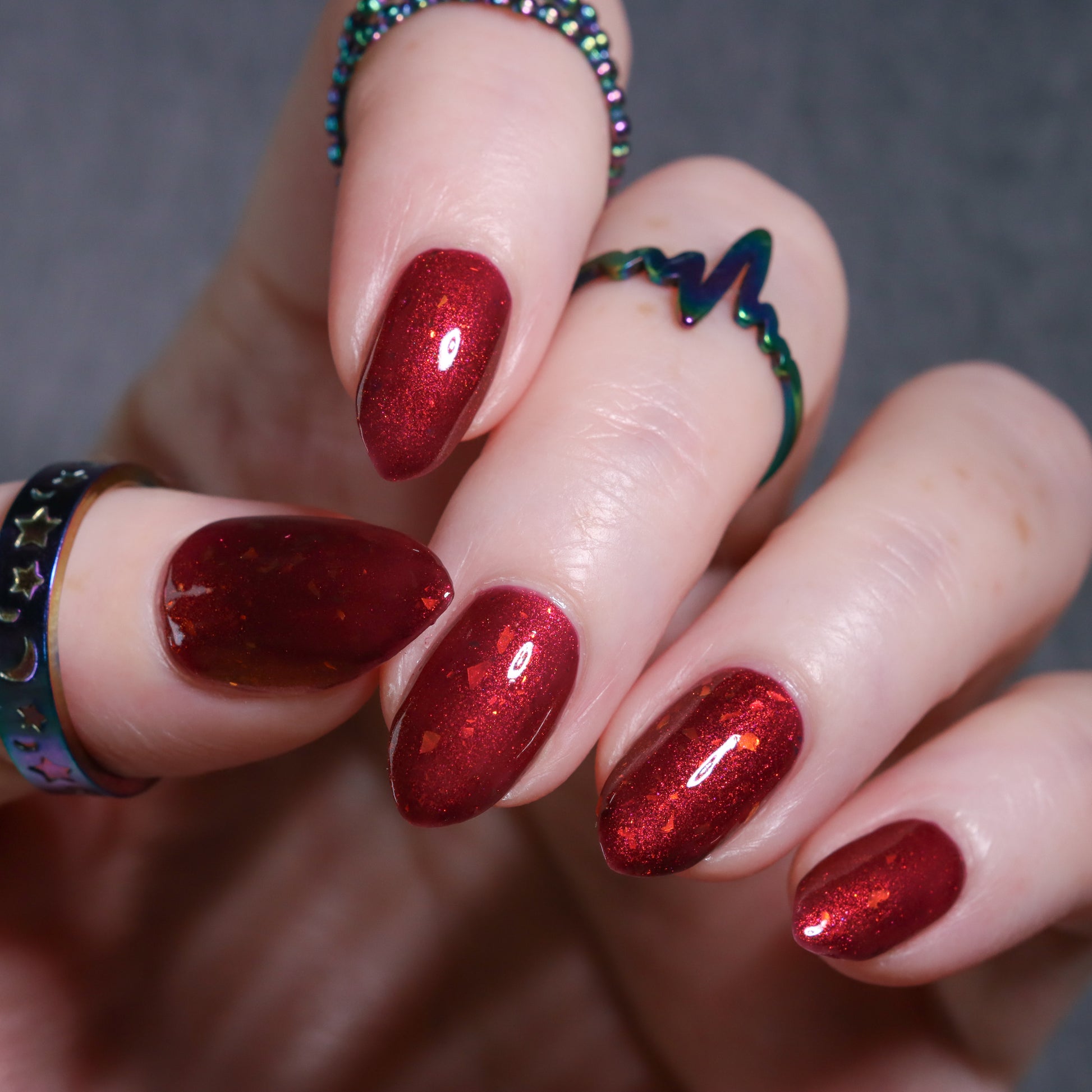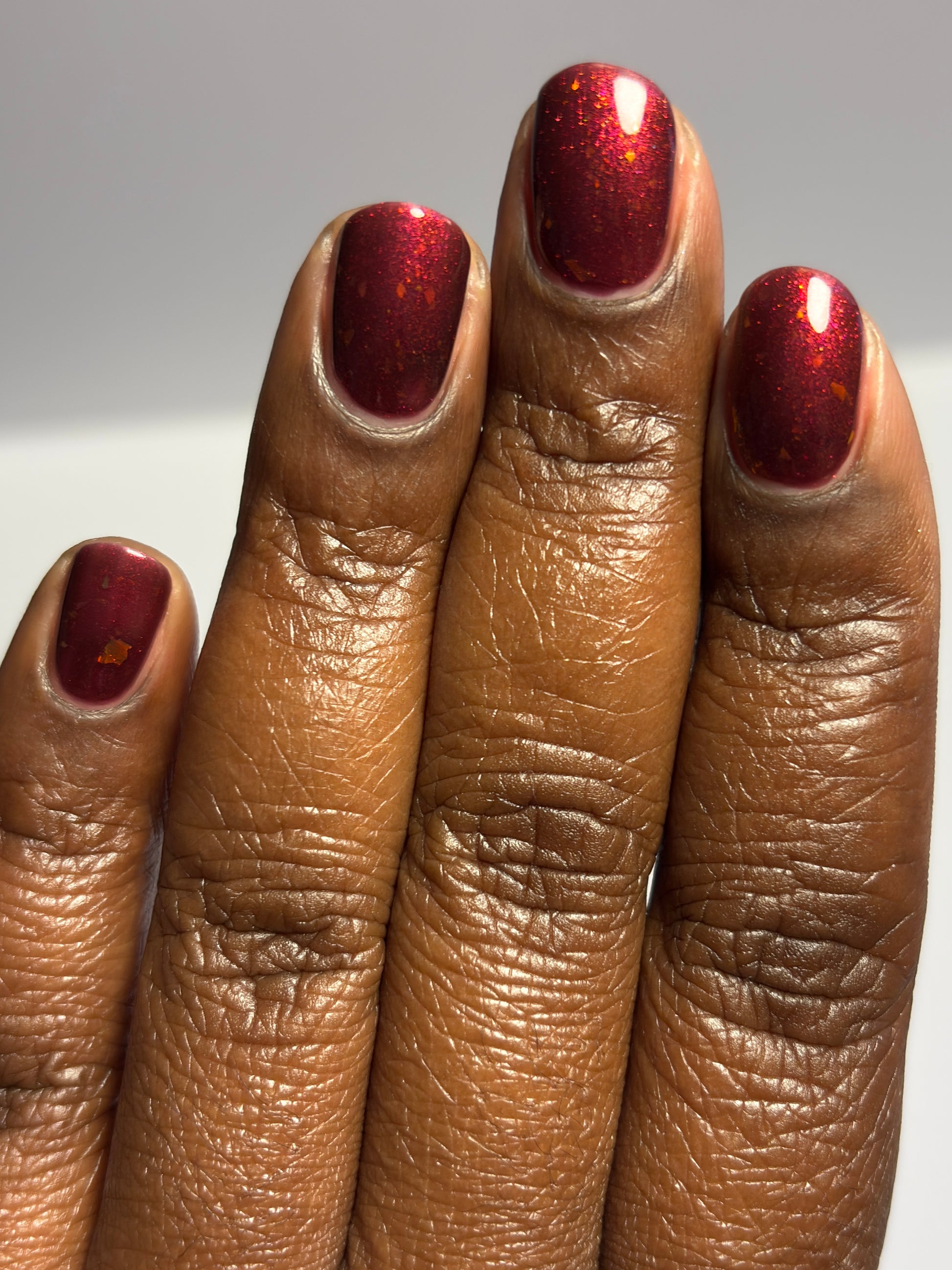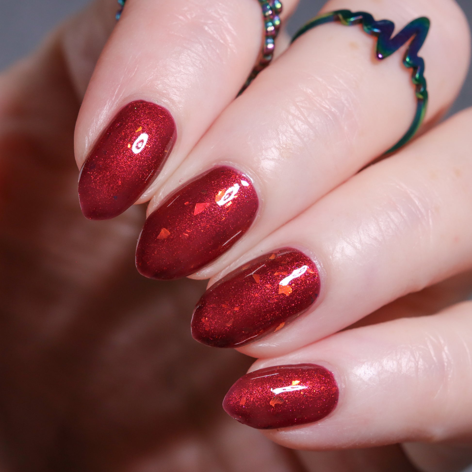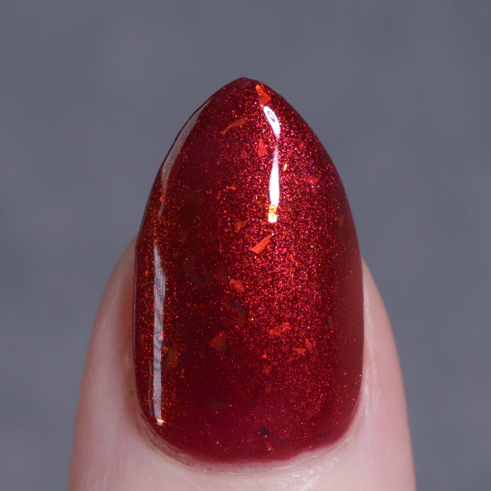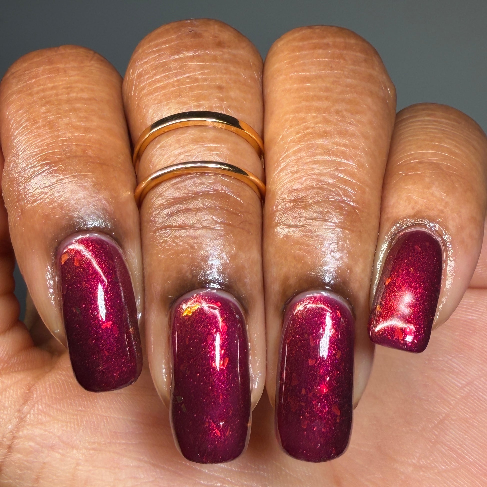 Wine of the Woods is a deep maroon base with red-orange shimmer and red-orange flakes.