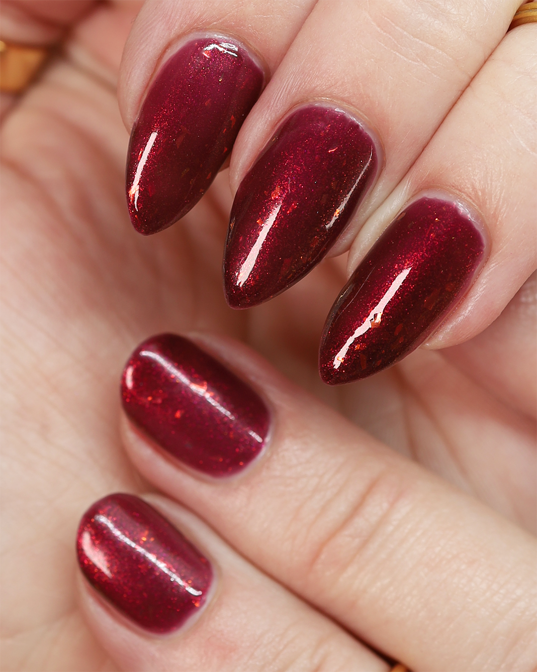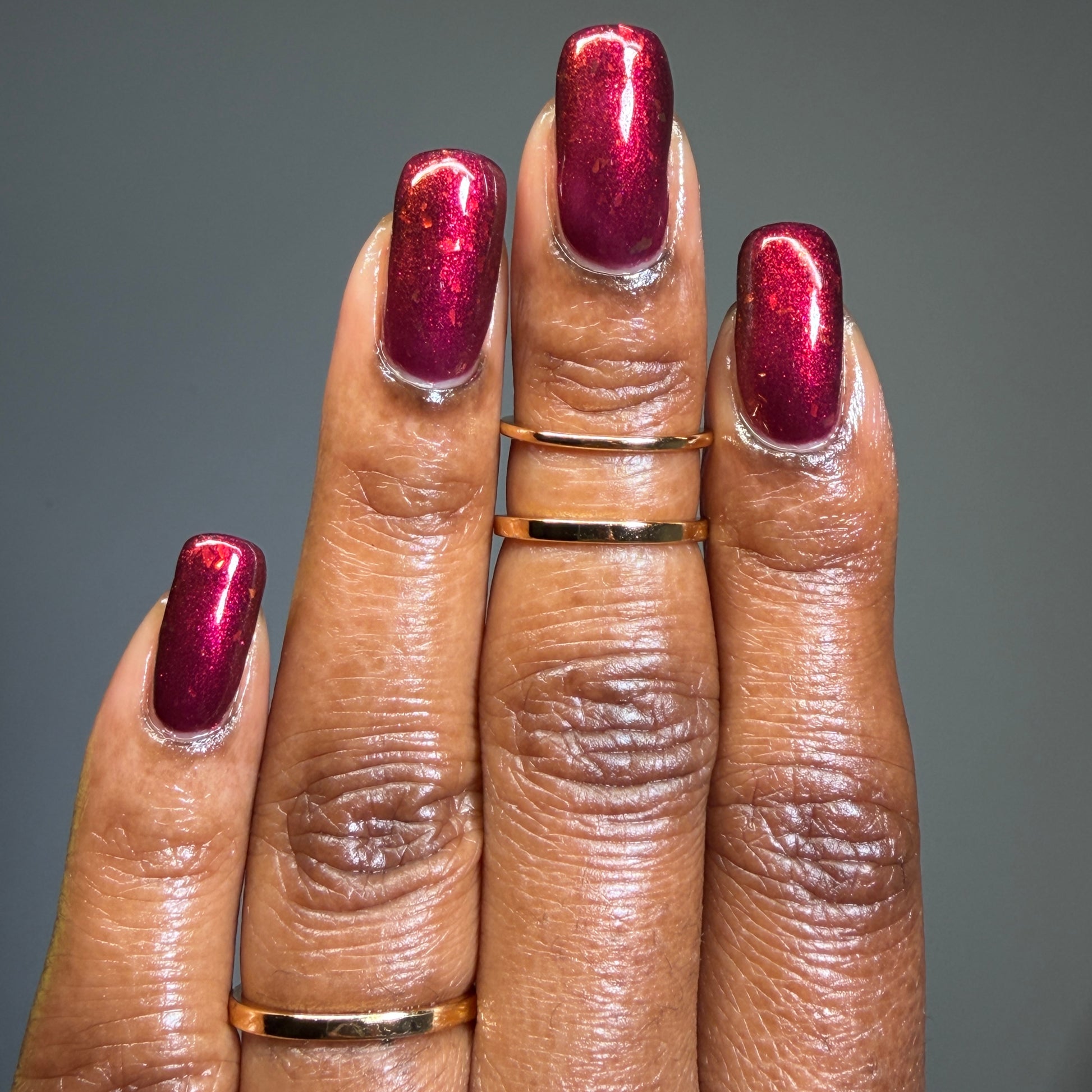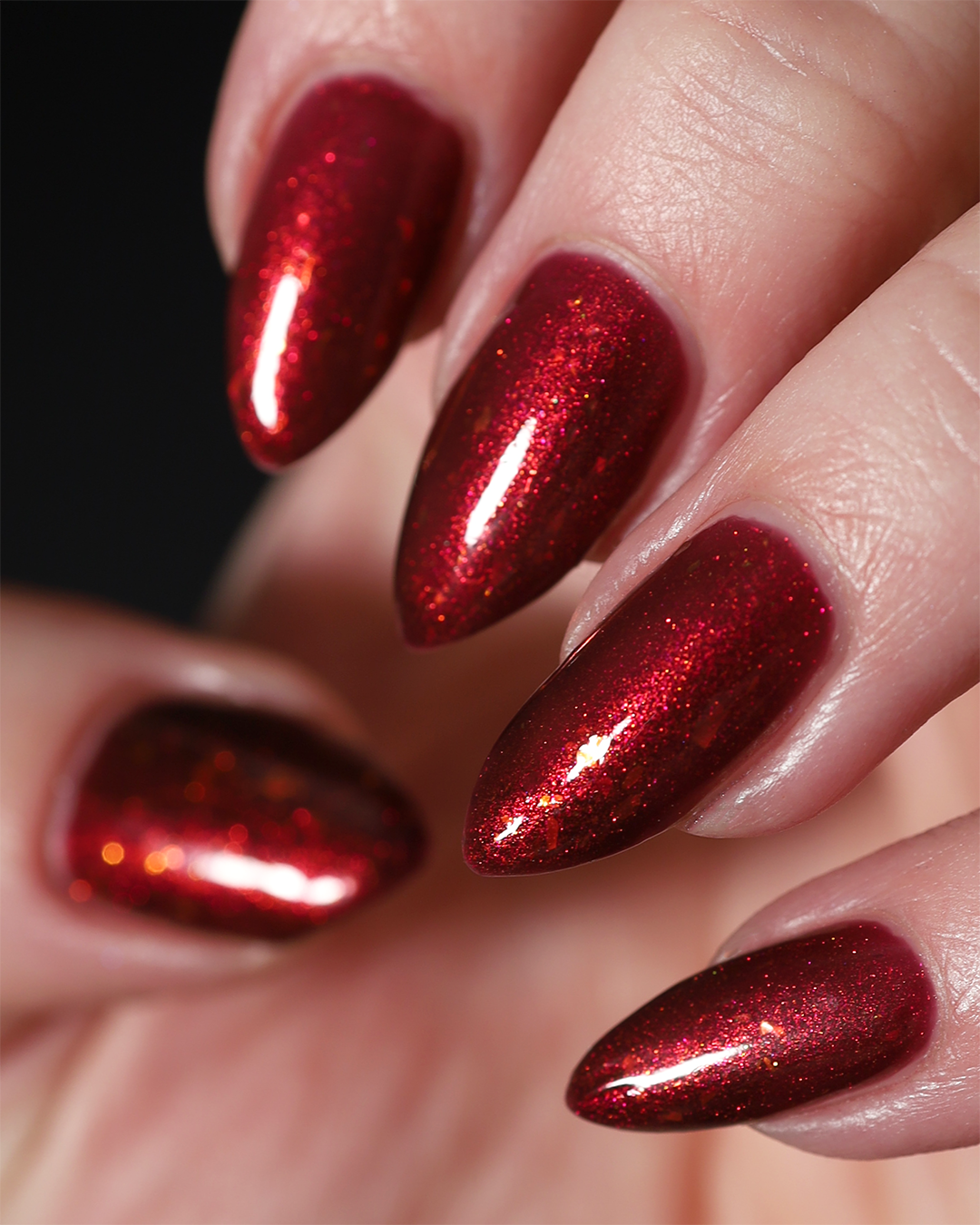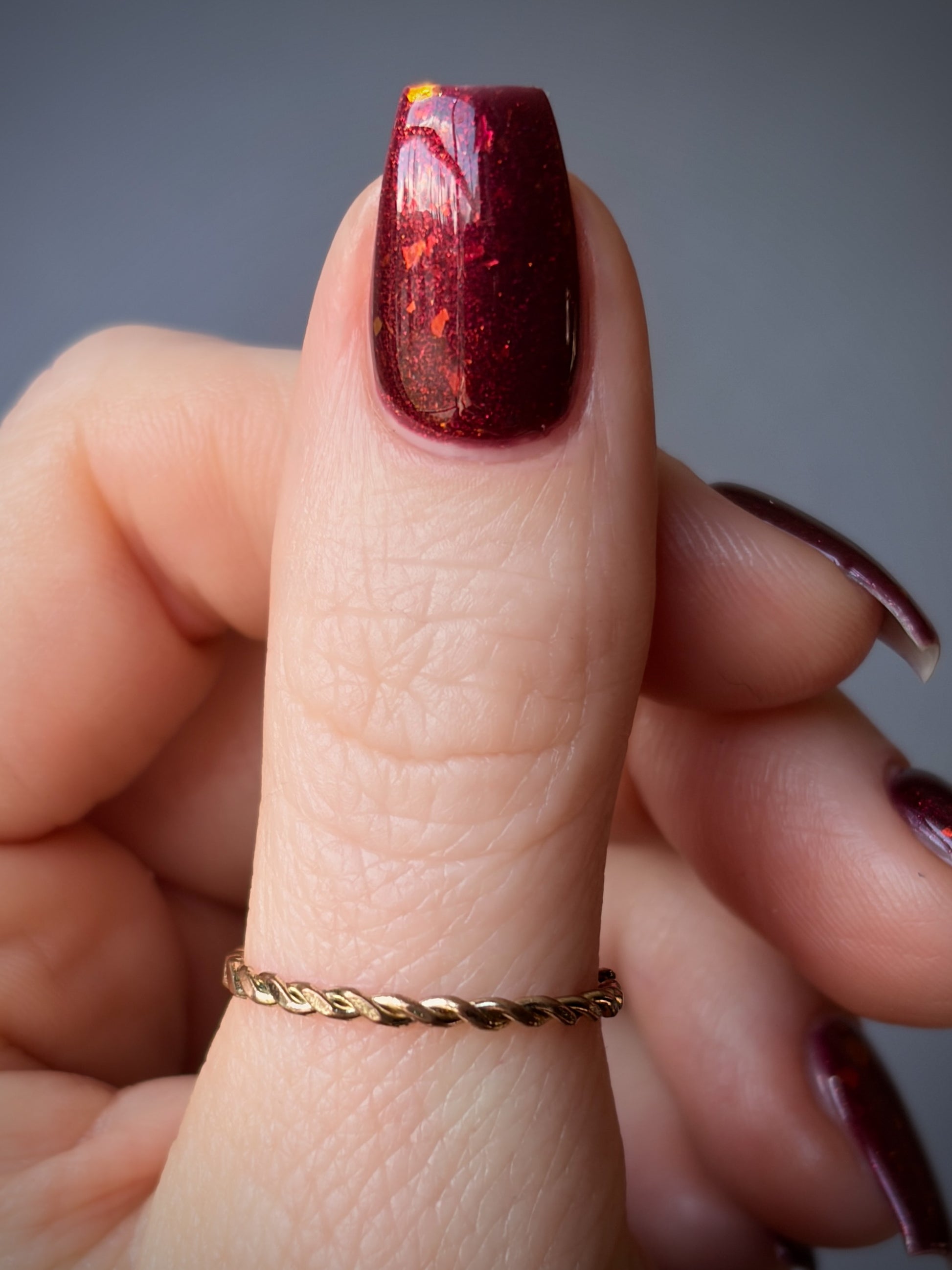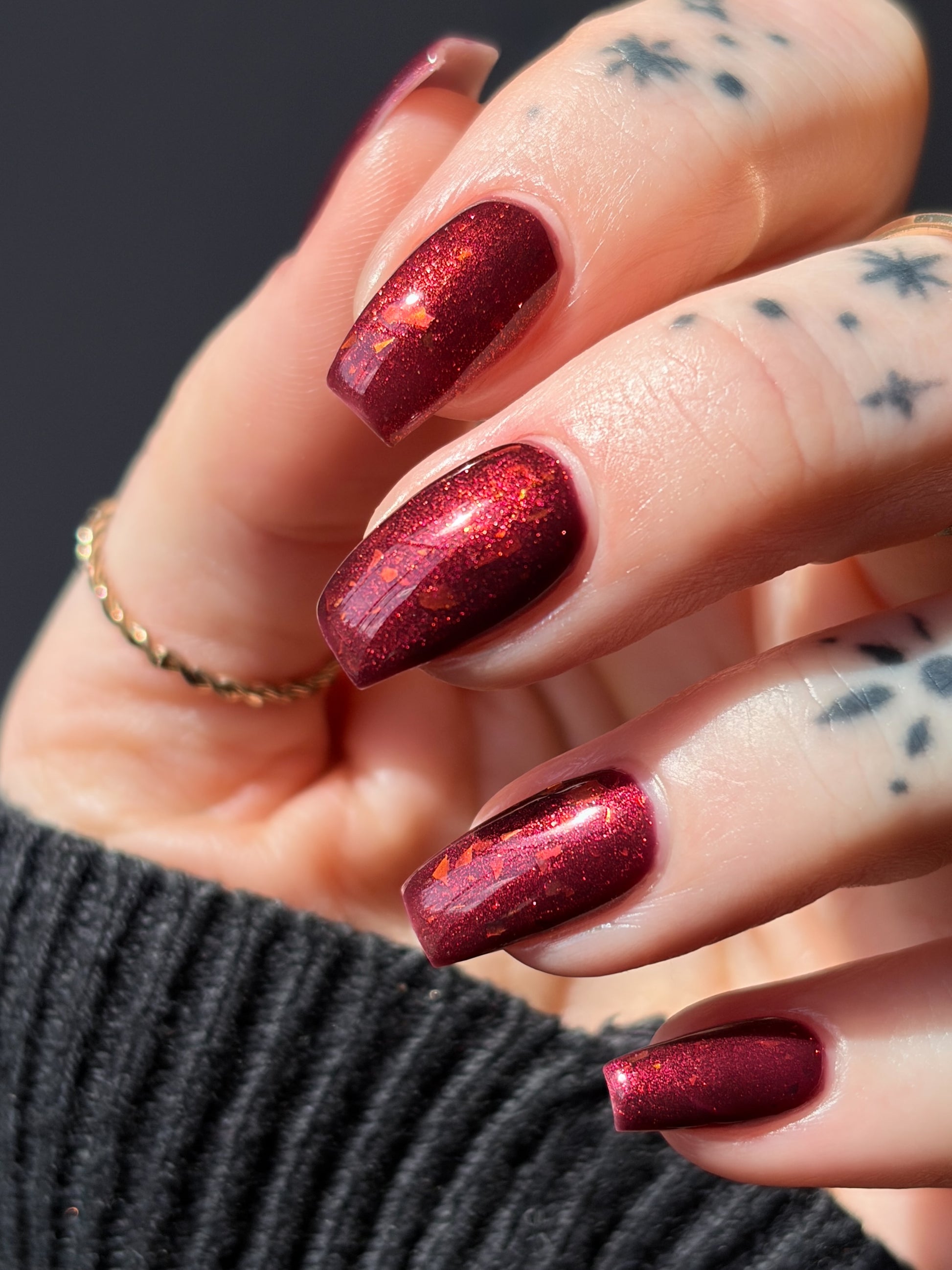 Wine of the Woods is a deep maroon base with red-orange shimmer and red-orange flakes.