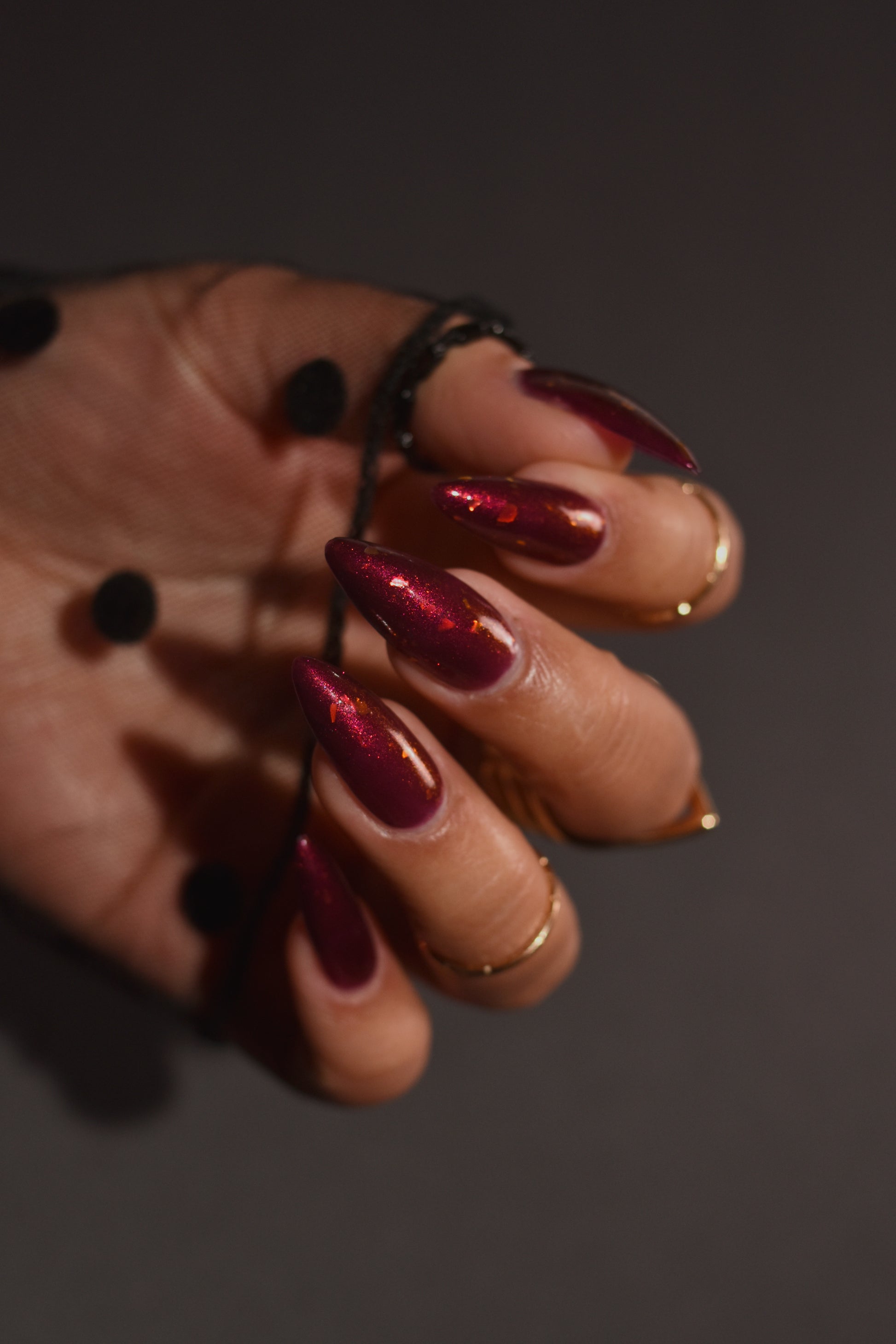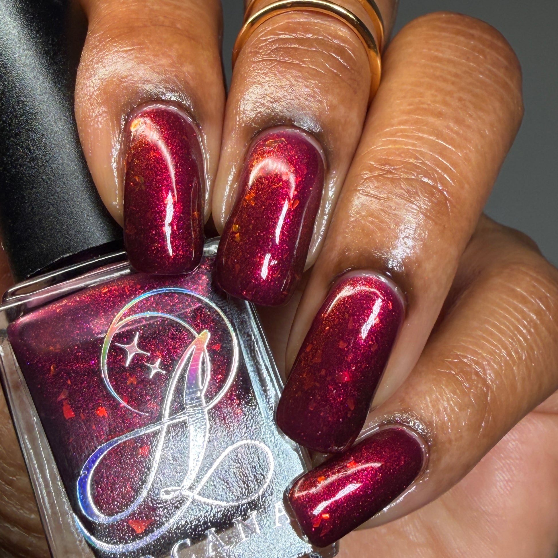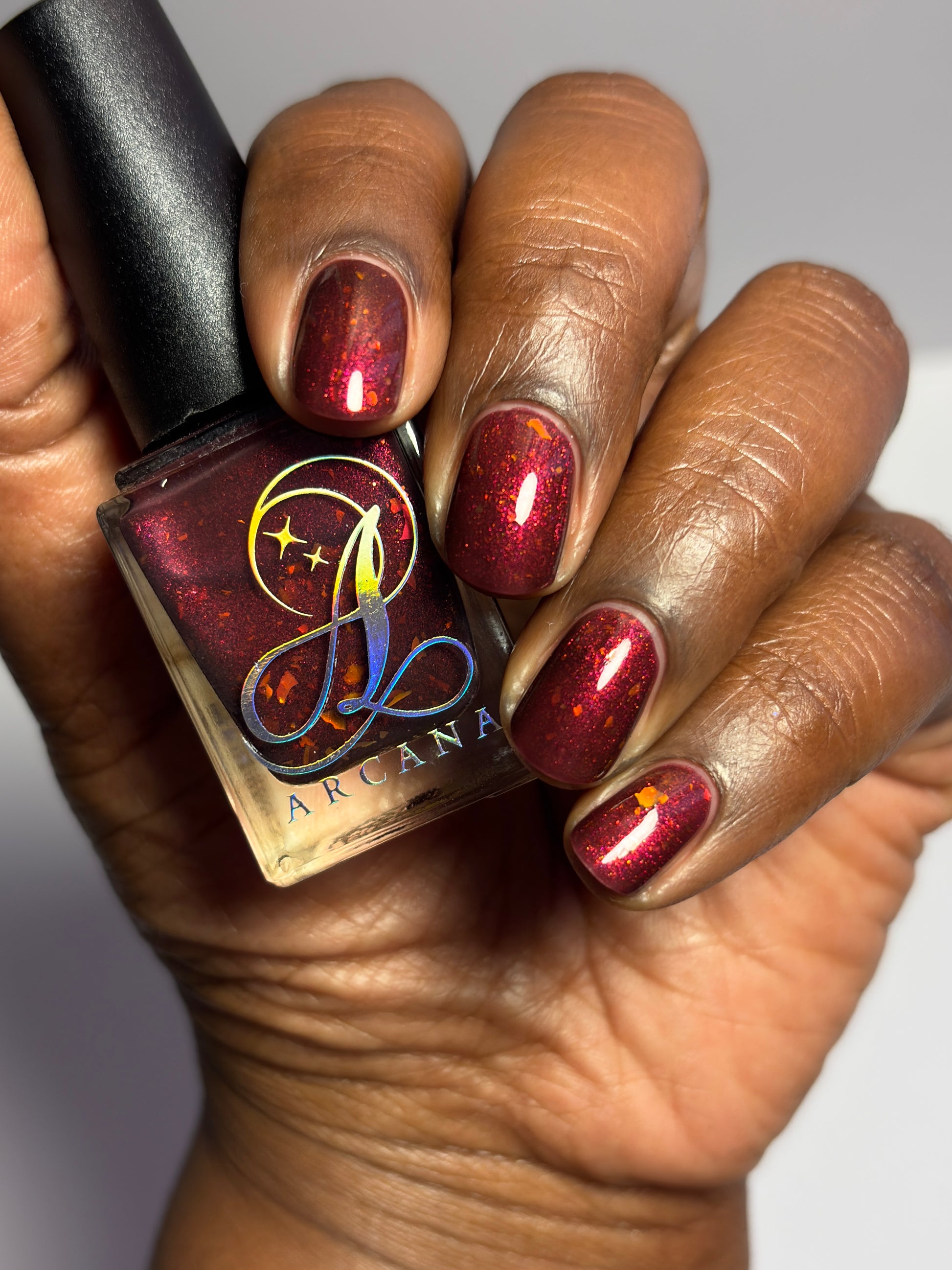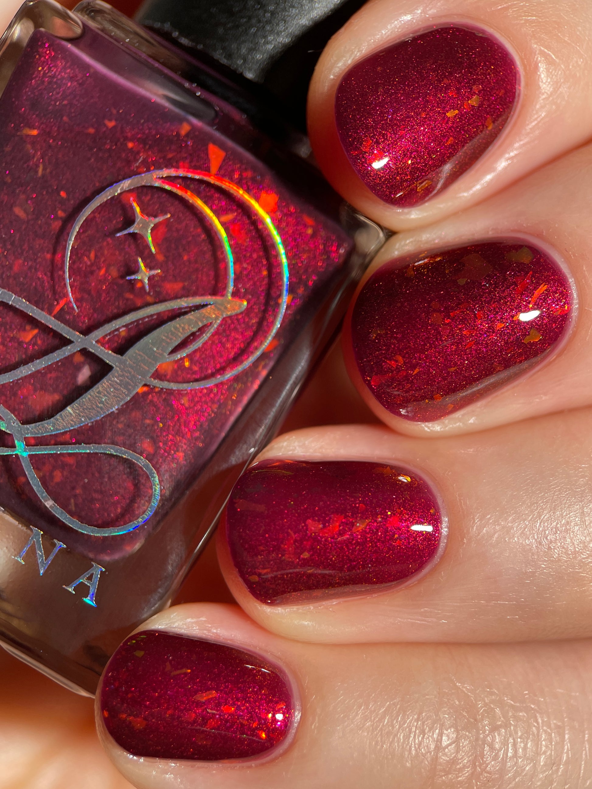Wine of the Woods is a deep maroon base with red-orange shimmer and red-orange flakes.