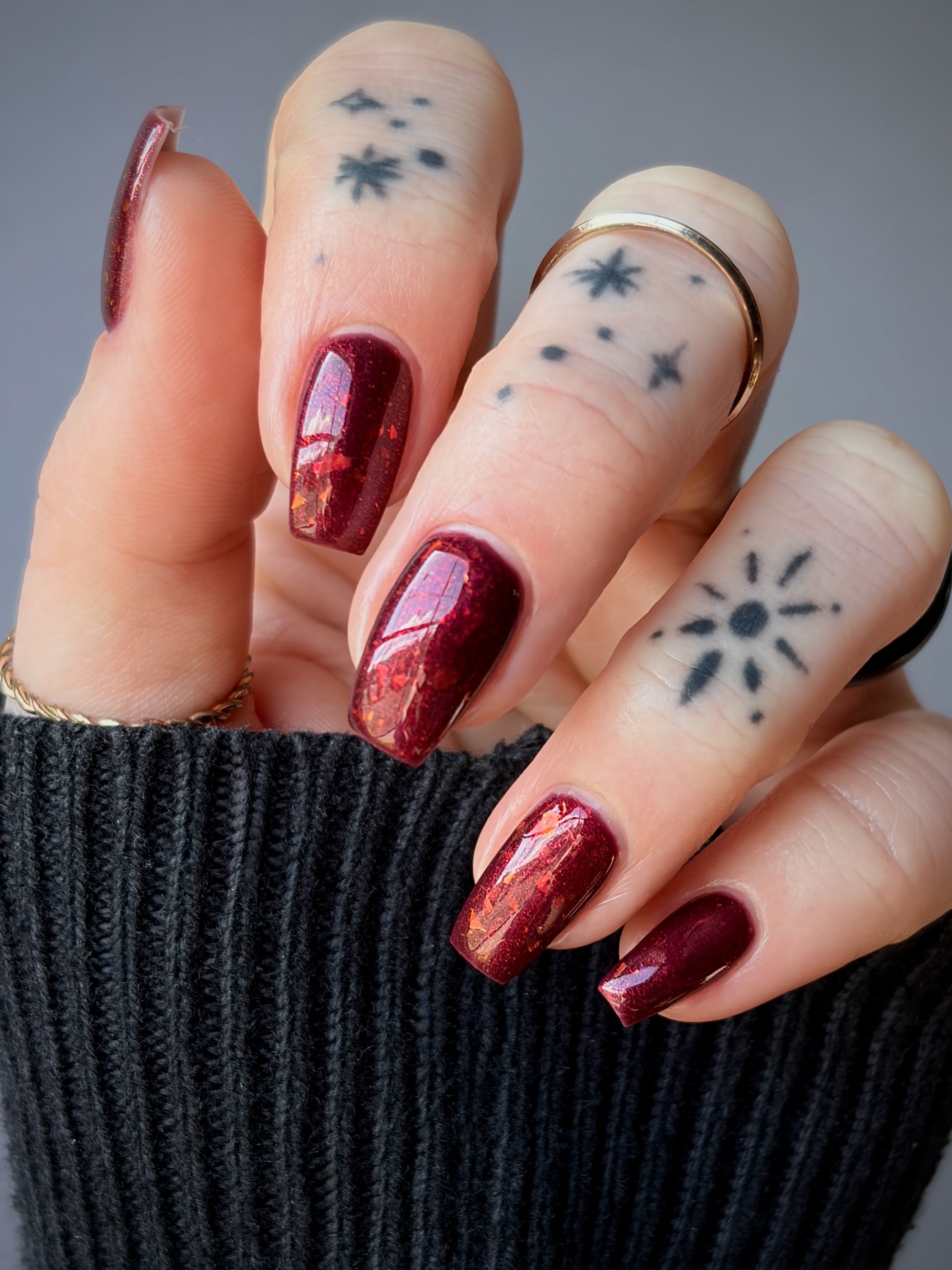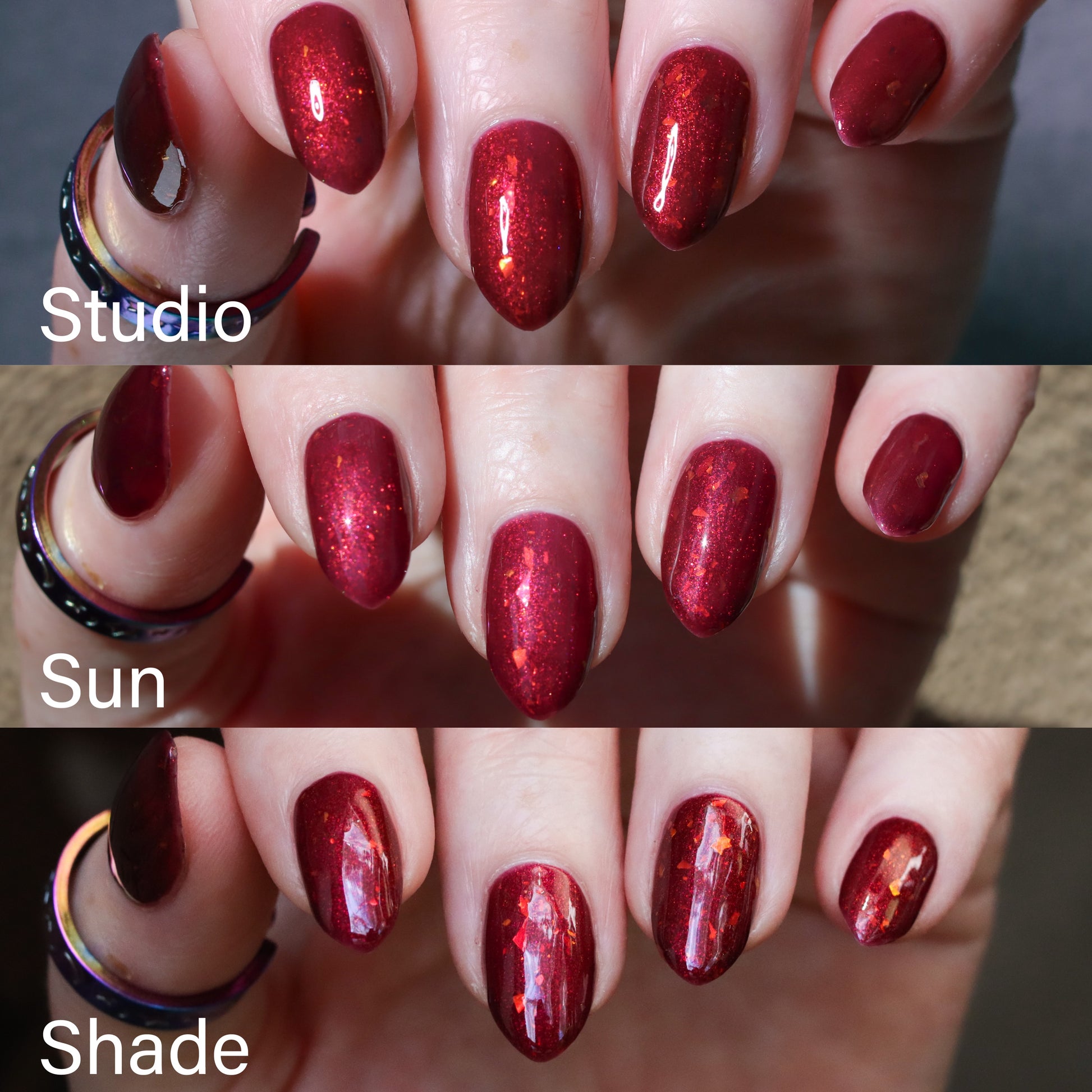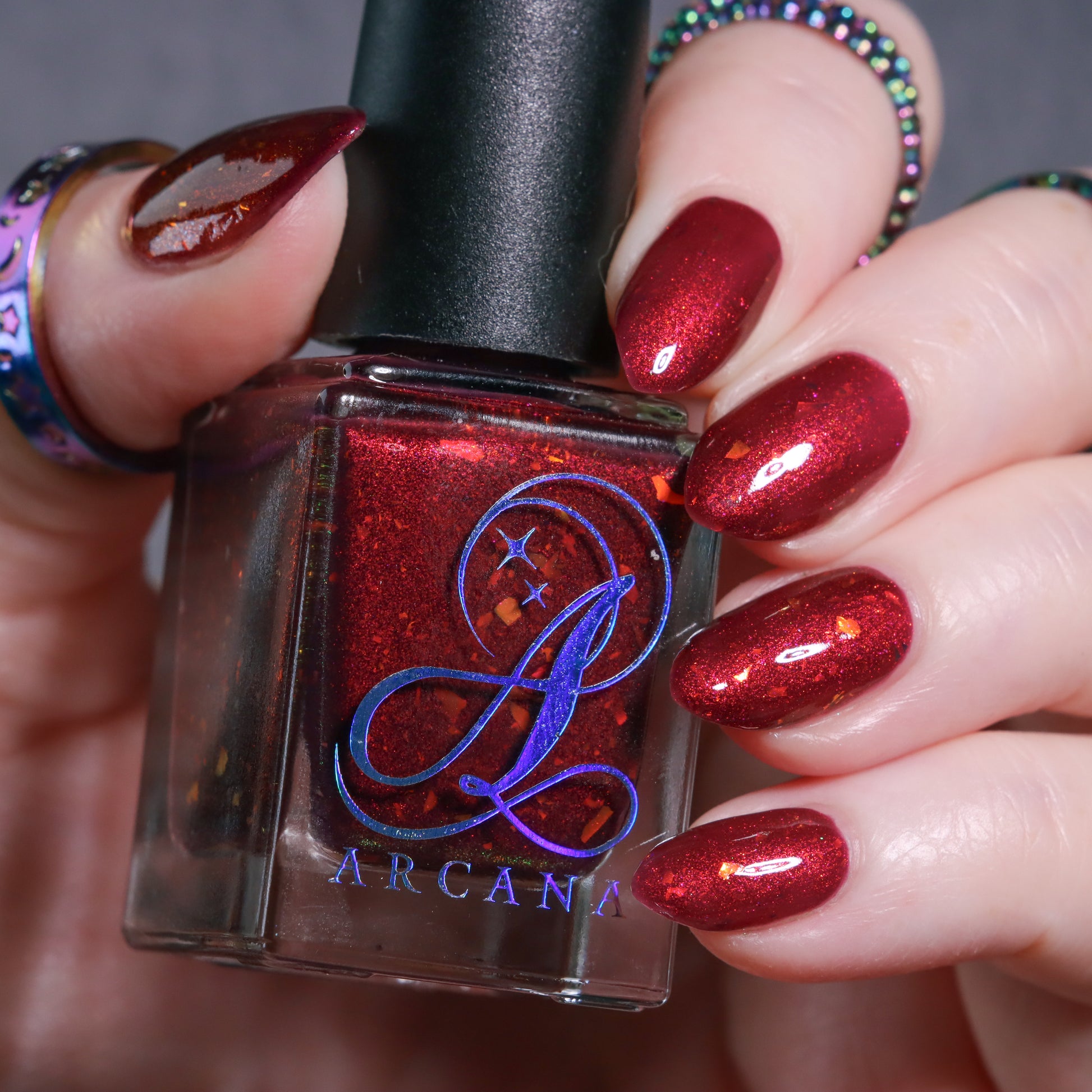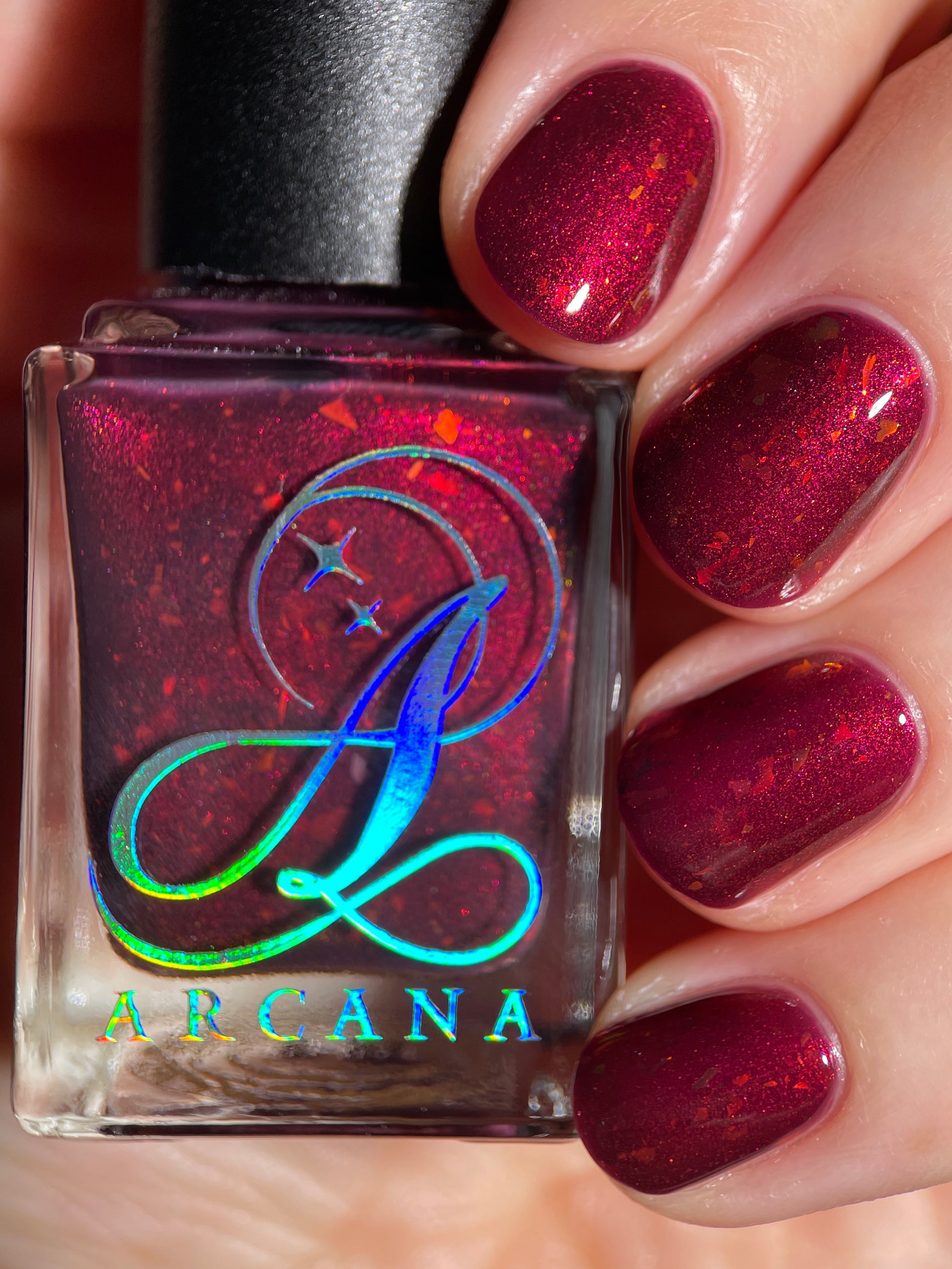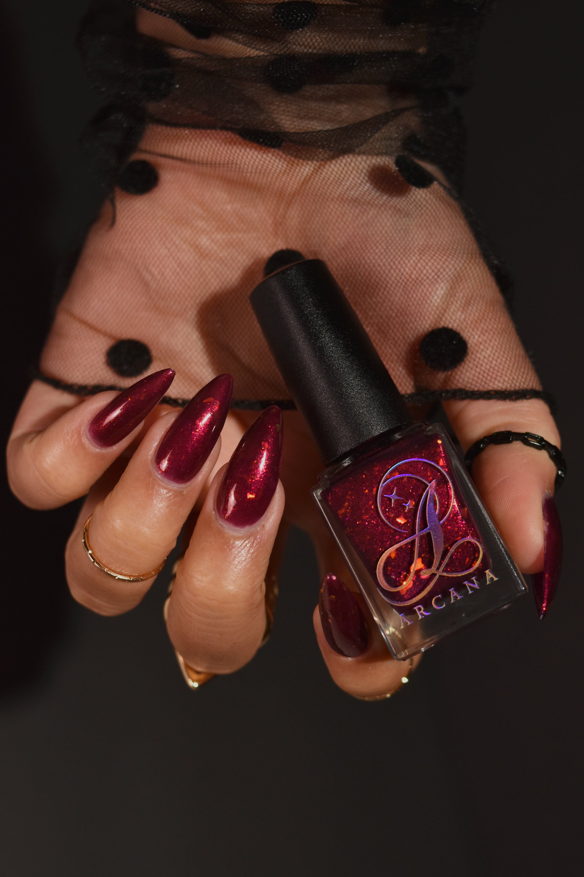 Wine of the Woods is a deep maroon base with red-orange shimmer and red-orange flakes.