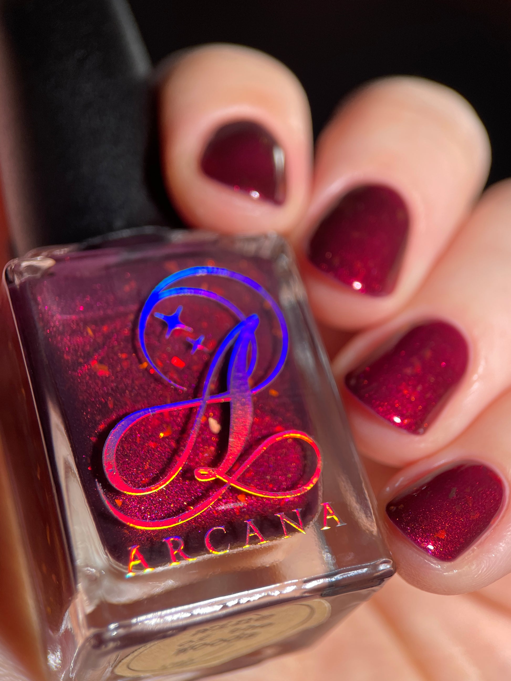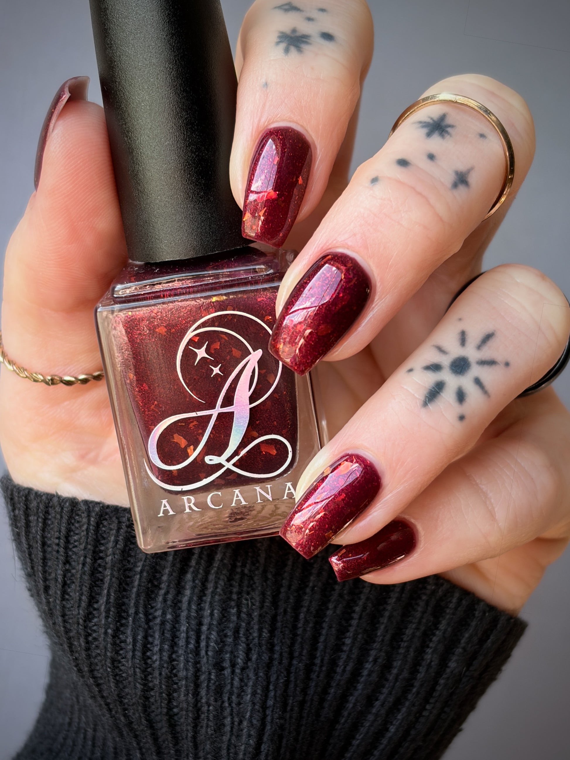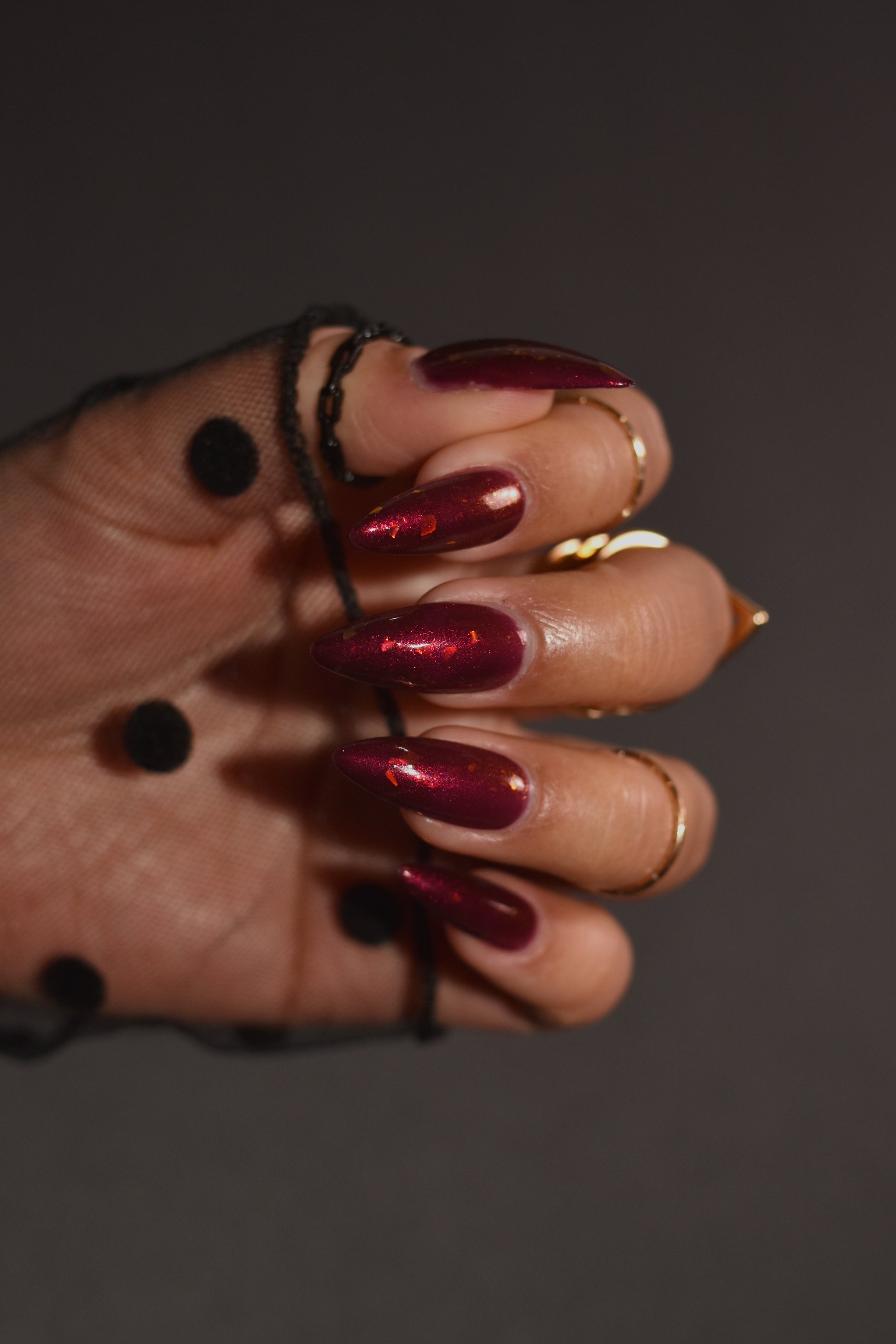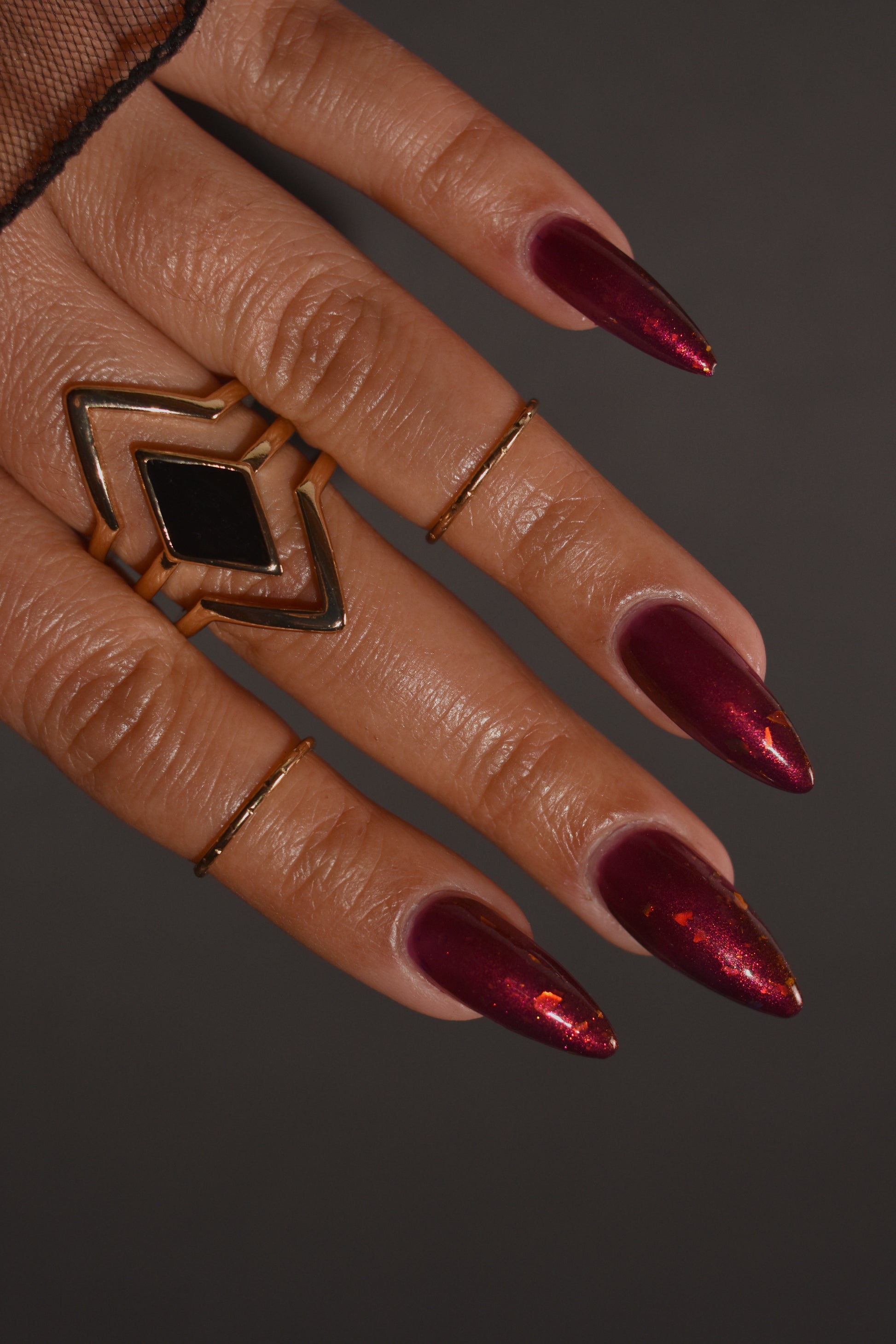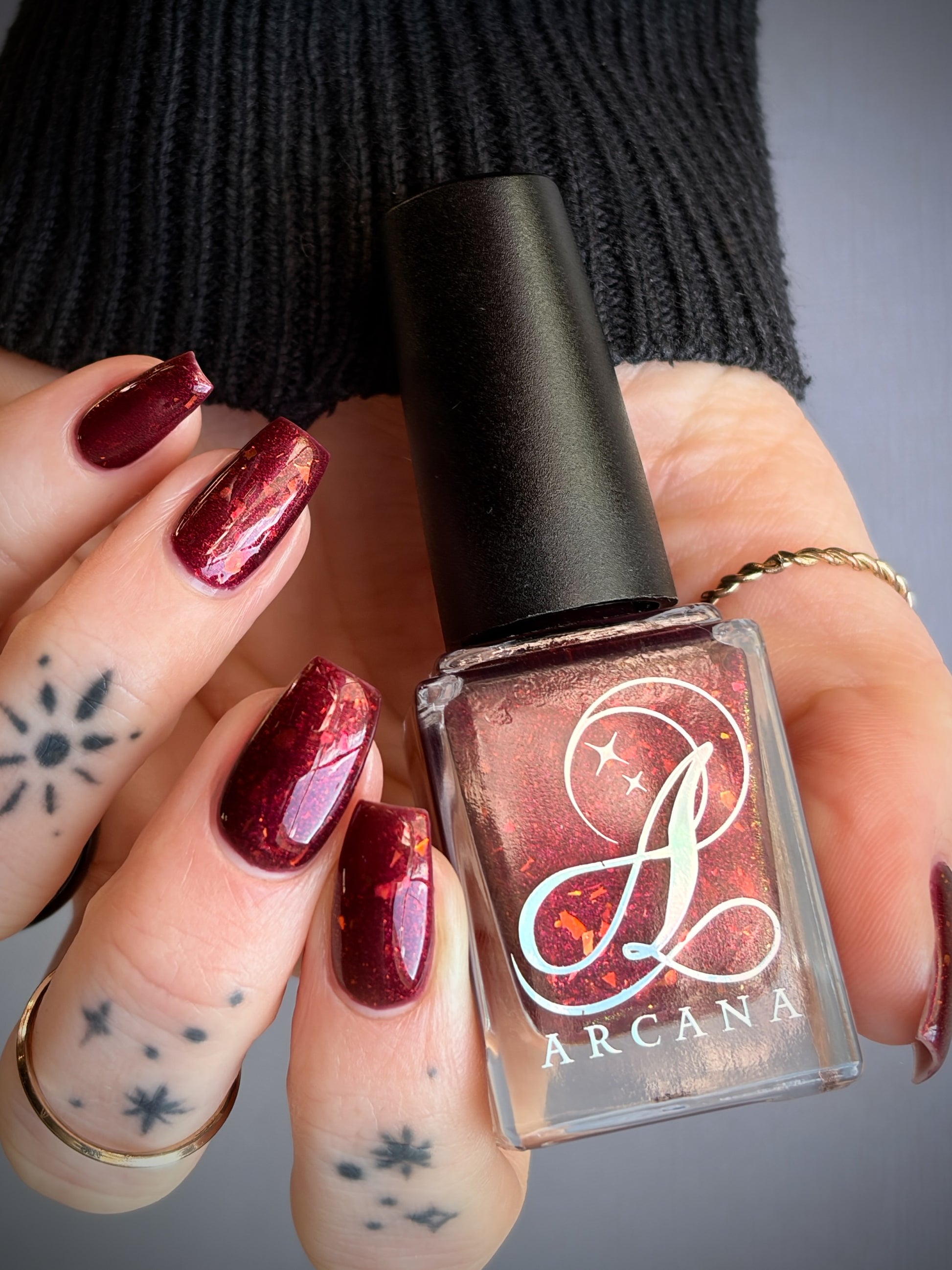 Wine of the Woods is a deep maroon base with red-orange shimmer and red-orange flakes.