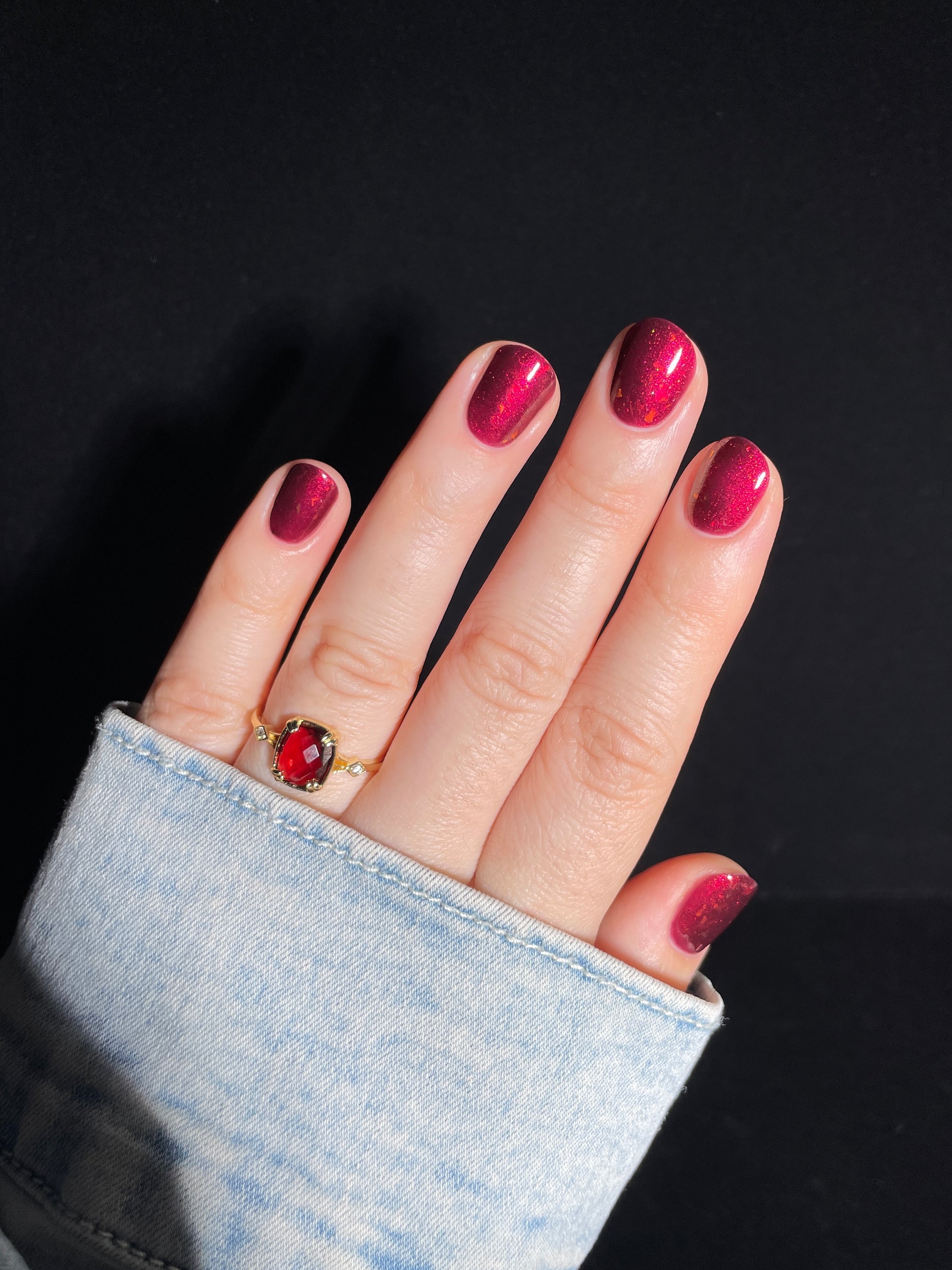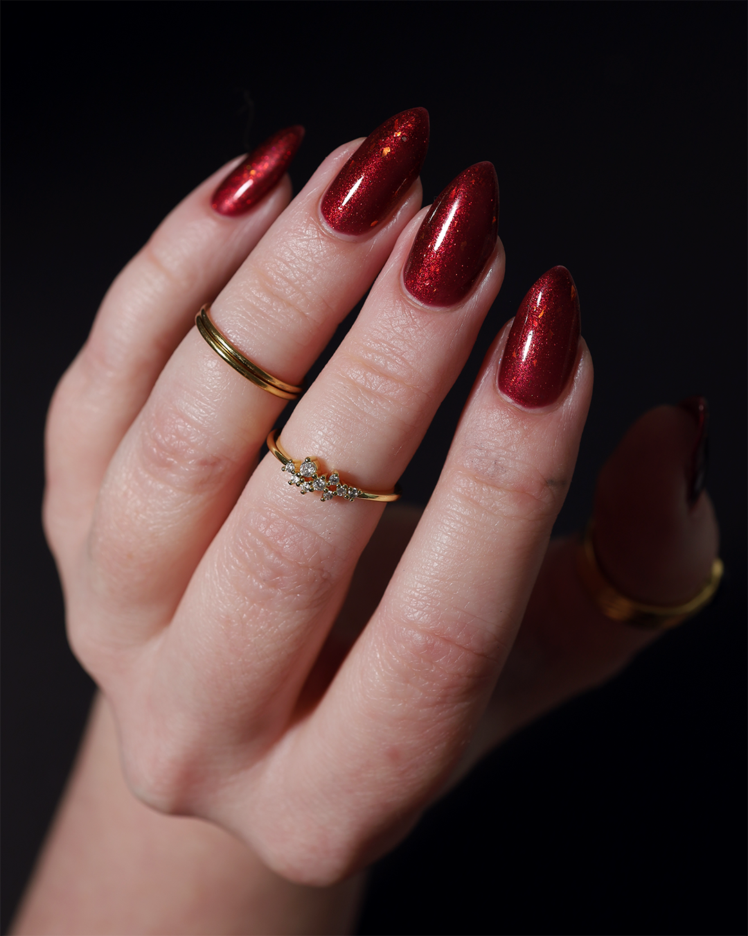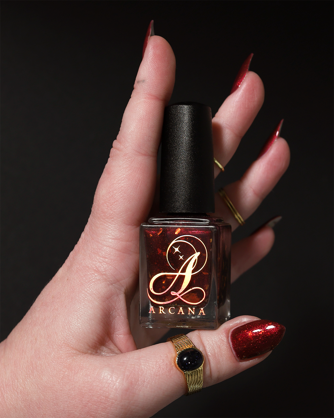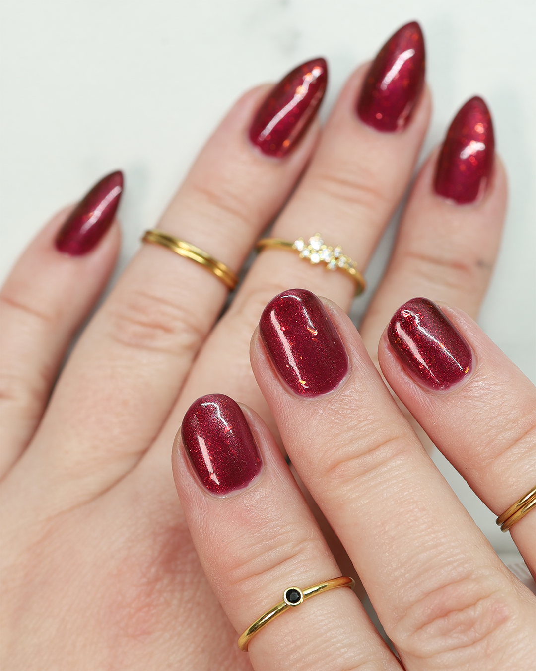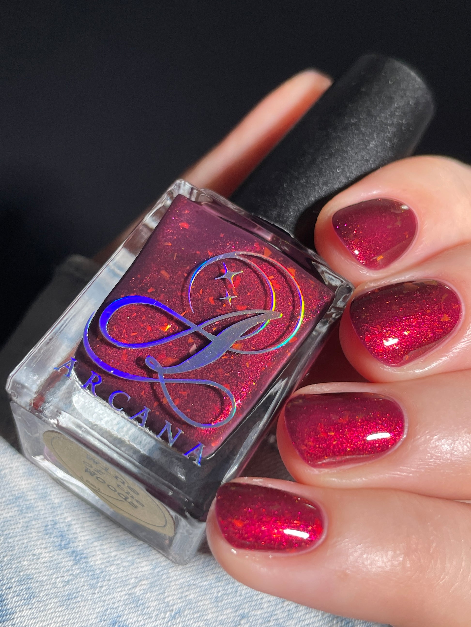Wine of the Woods is a deep maroon base with red-orange shimmer and red-orange flakes.