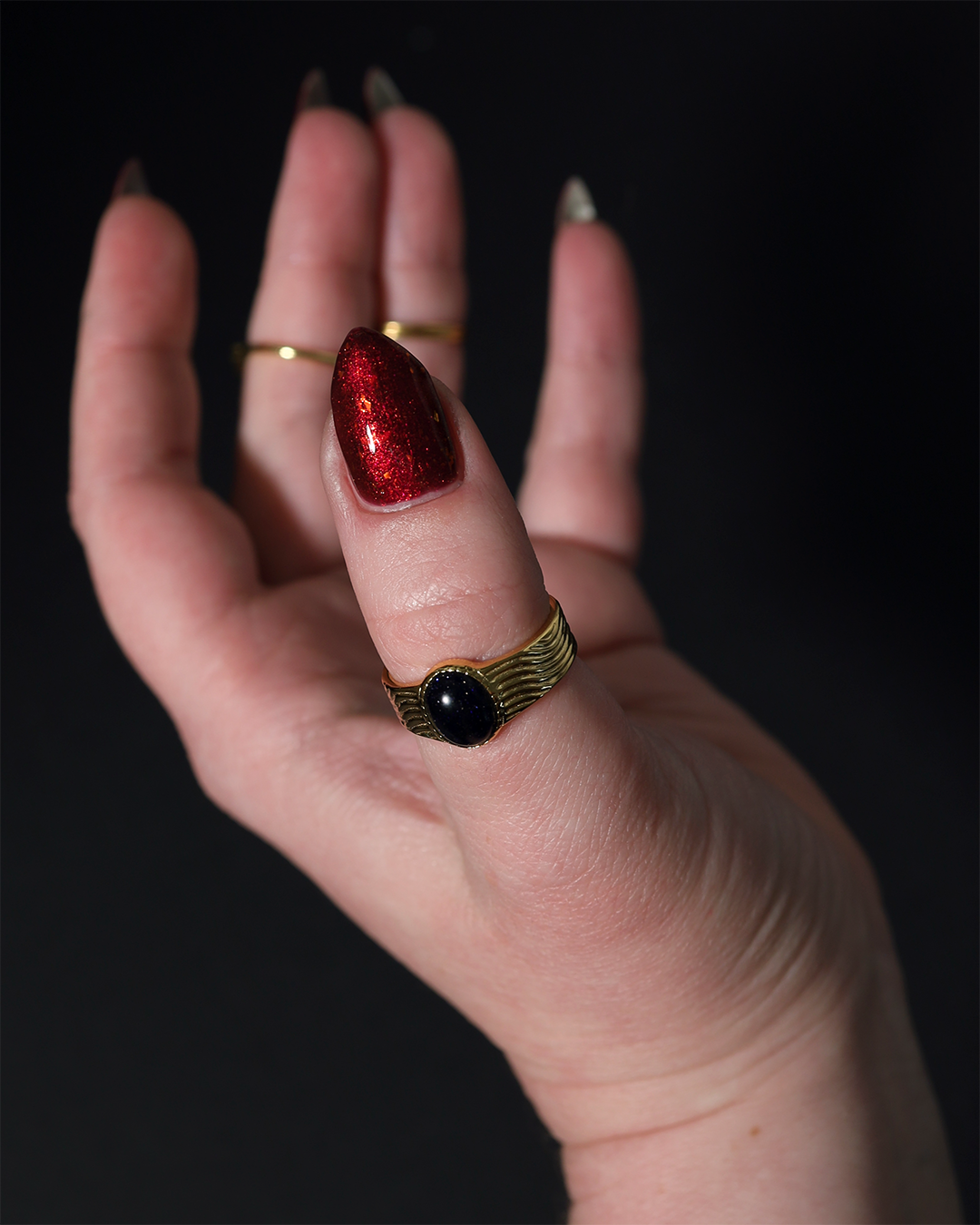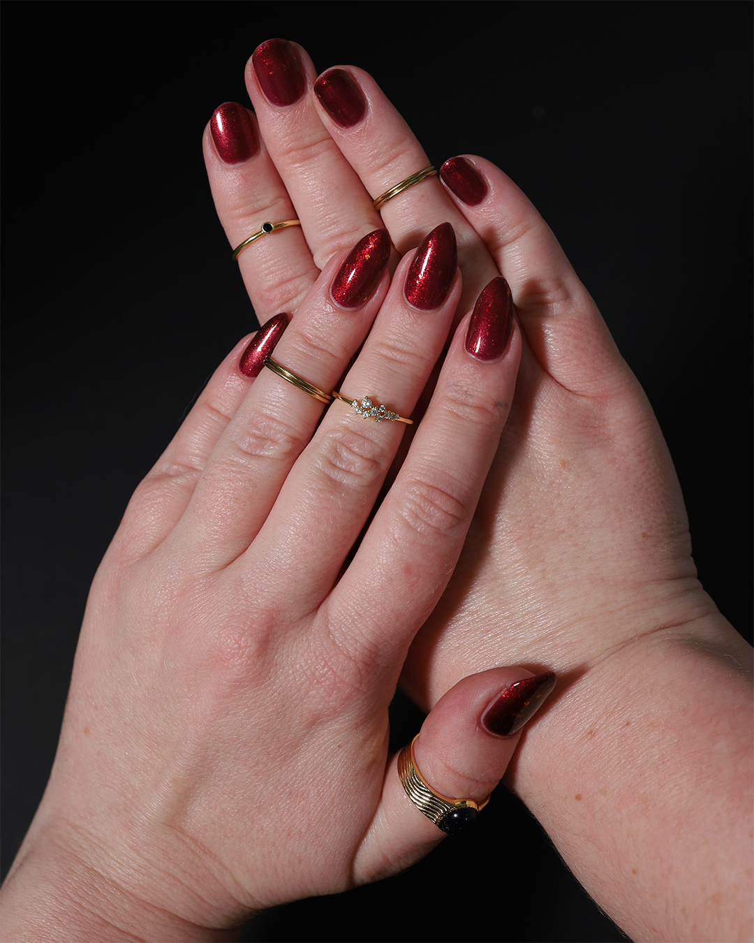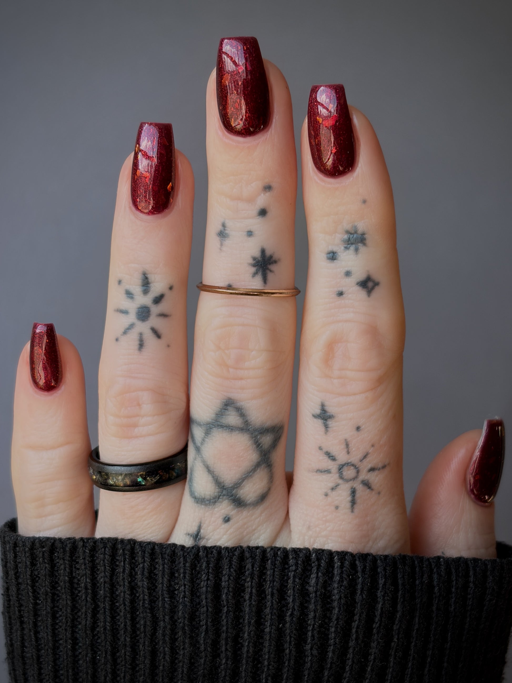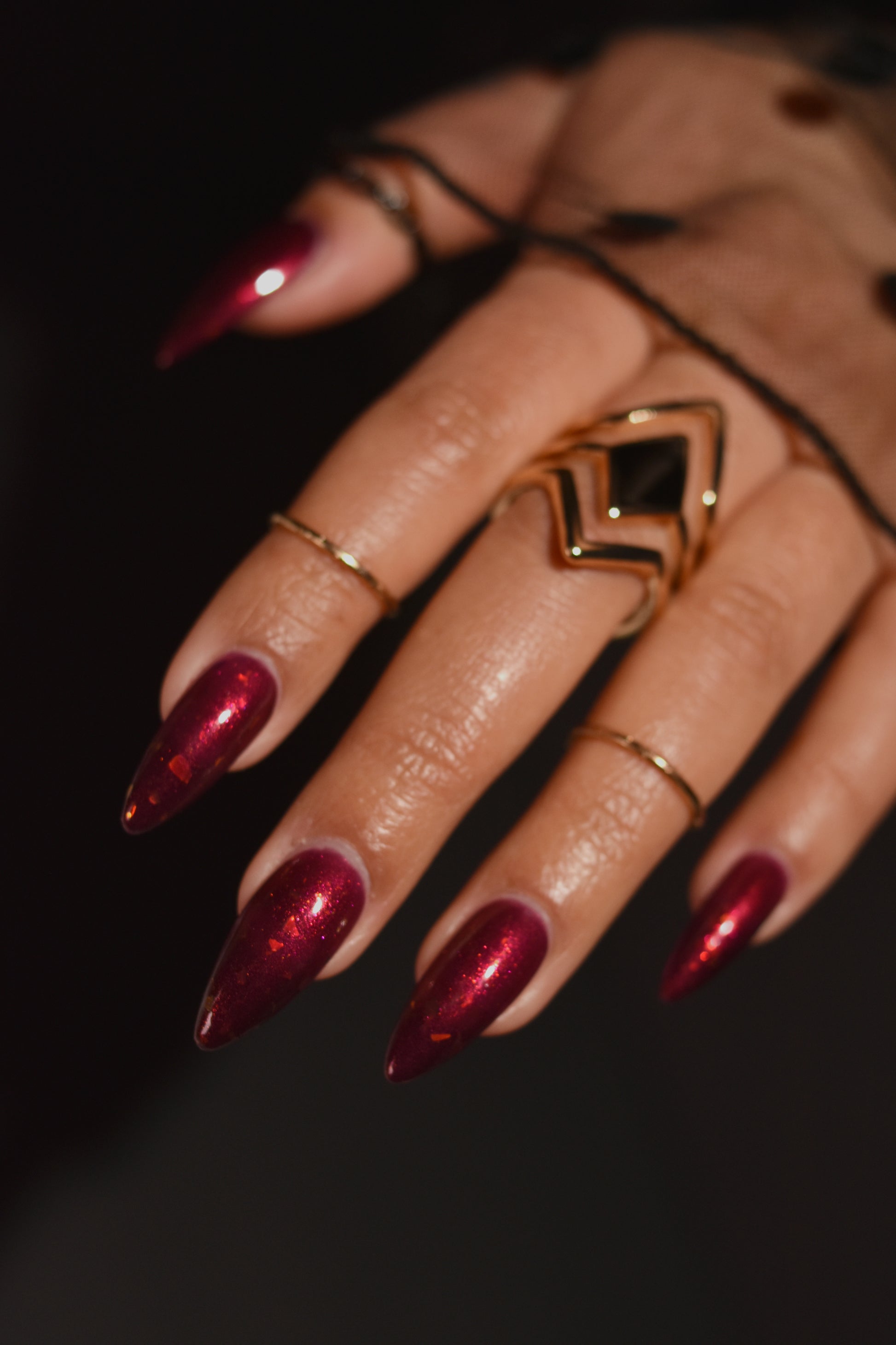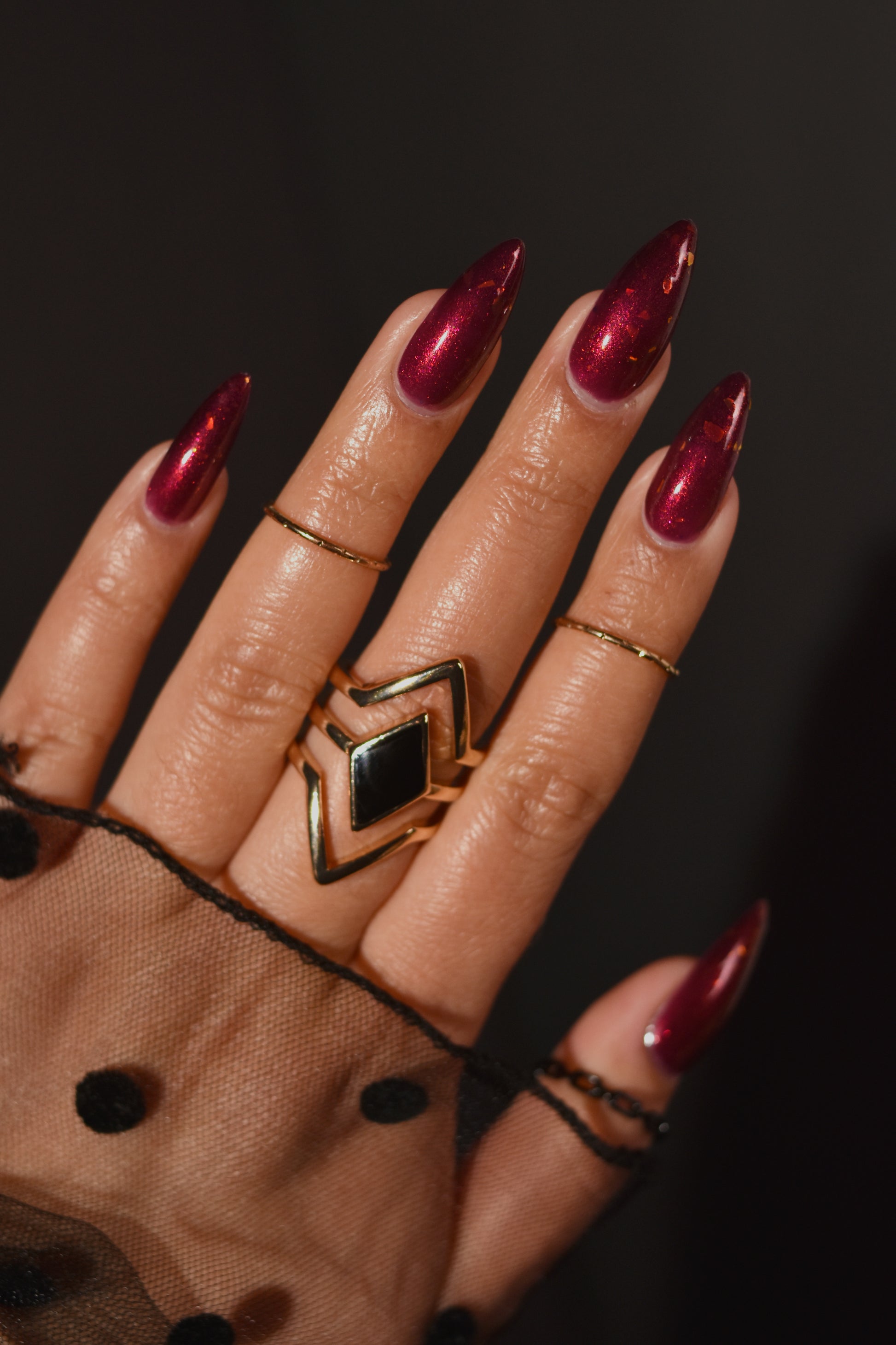 Wine of the Woods is a deep maroon base with red-orange shimmer and red-orange flakes.