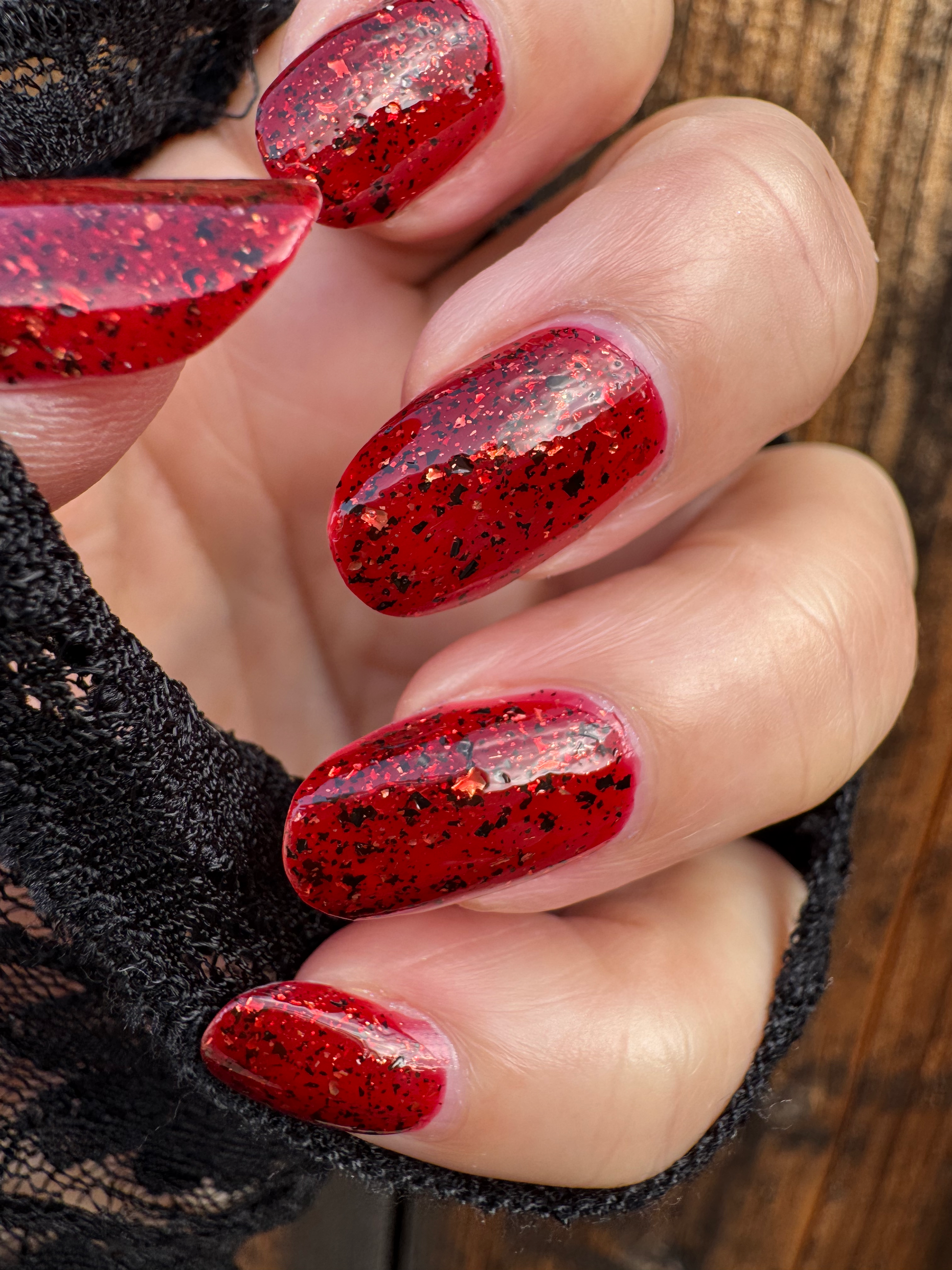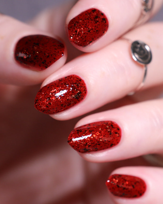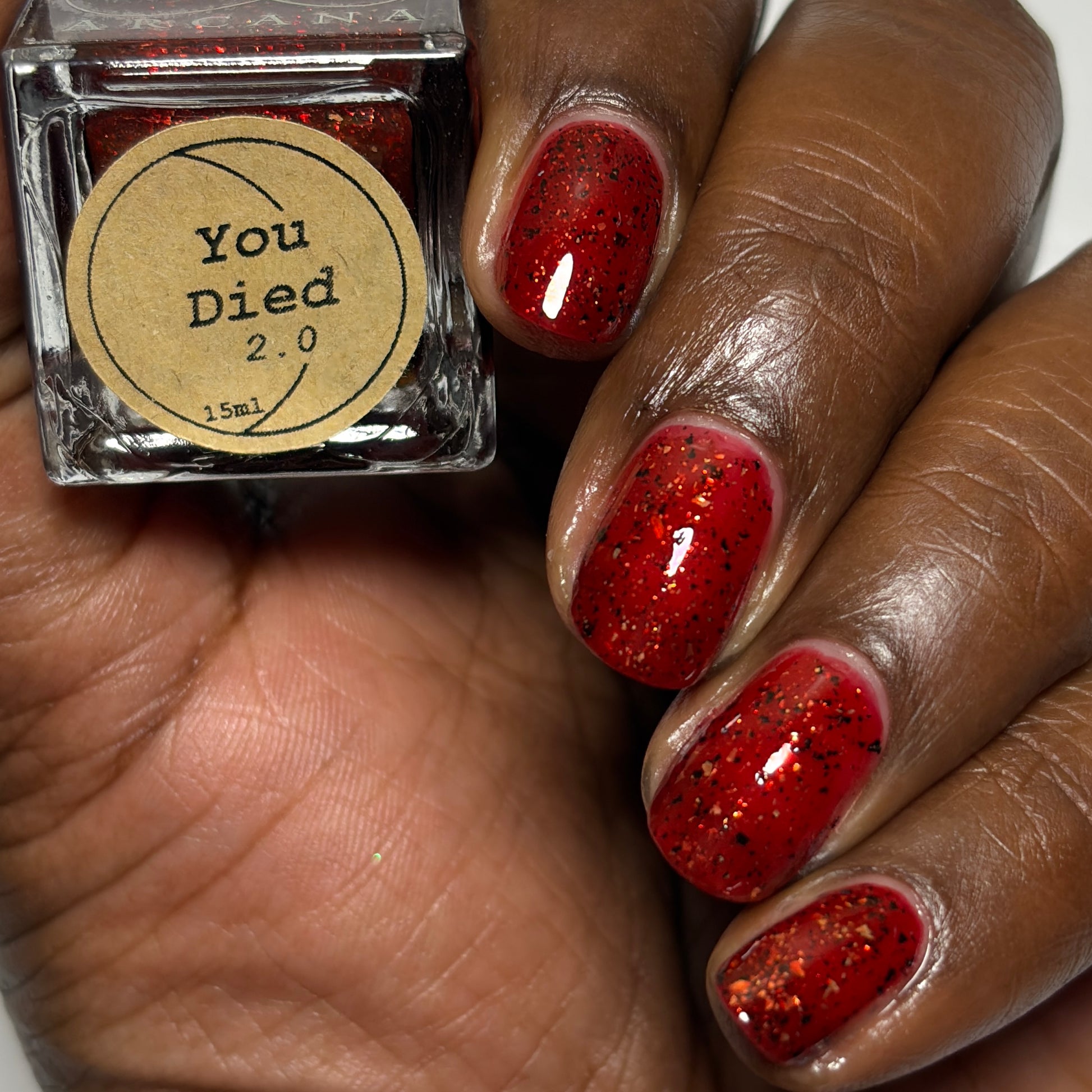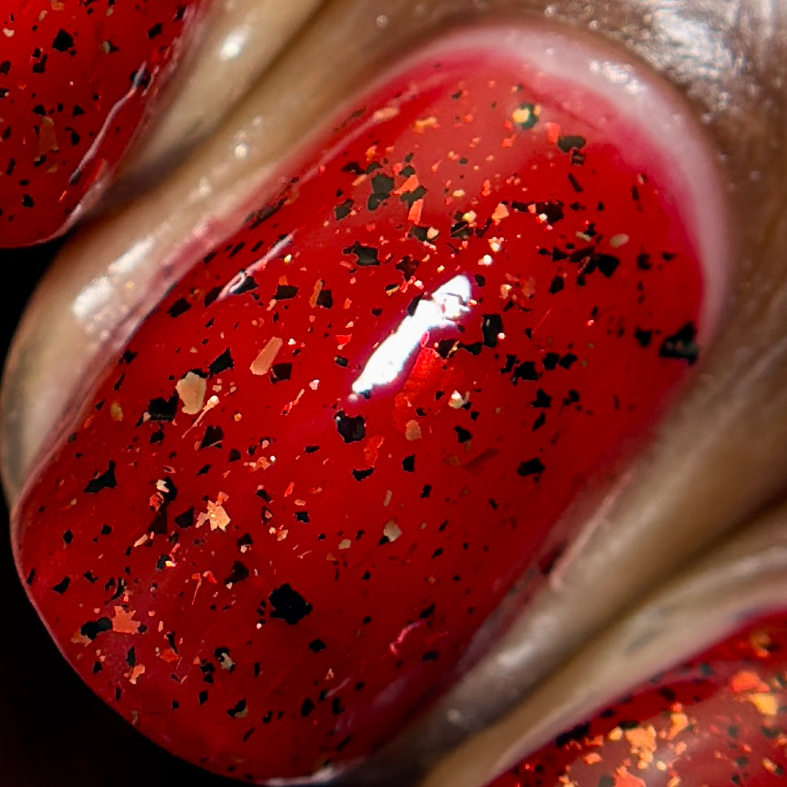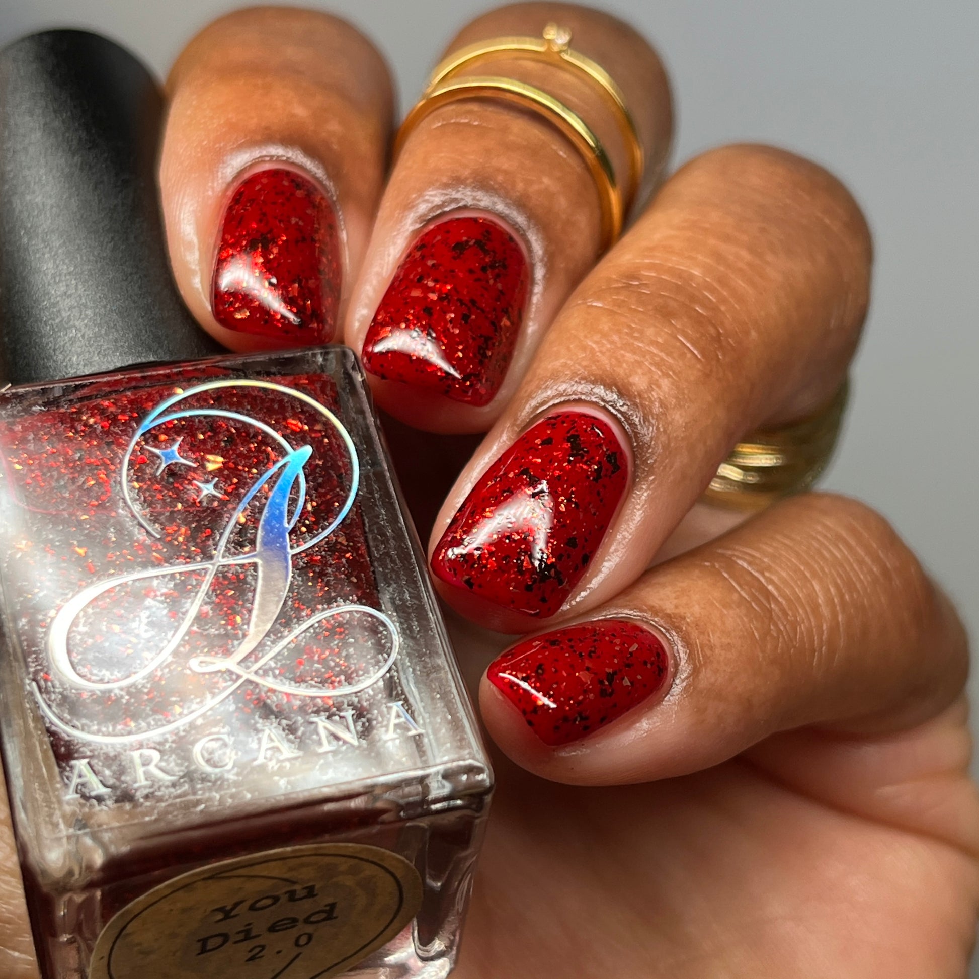 You Died 2.0 is our remixed version of You Died. This polish is a deep red jelly with gold metallic flakes and black metallic flakes.
