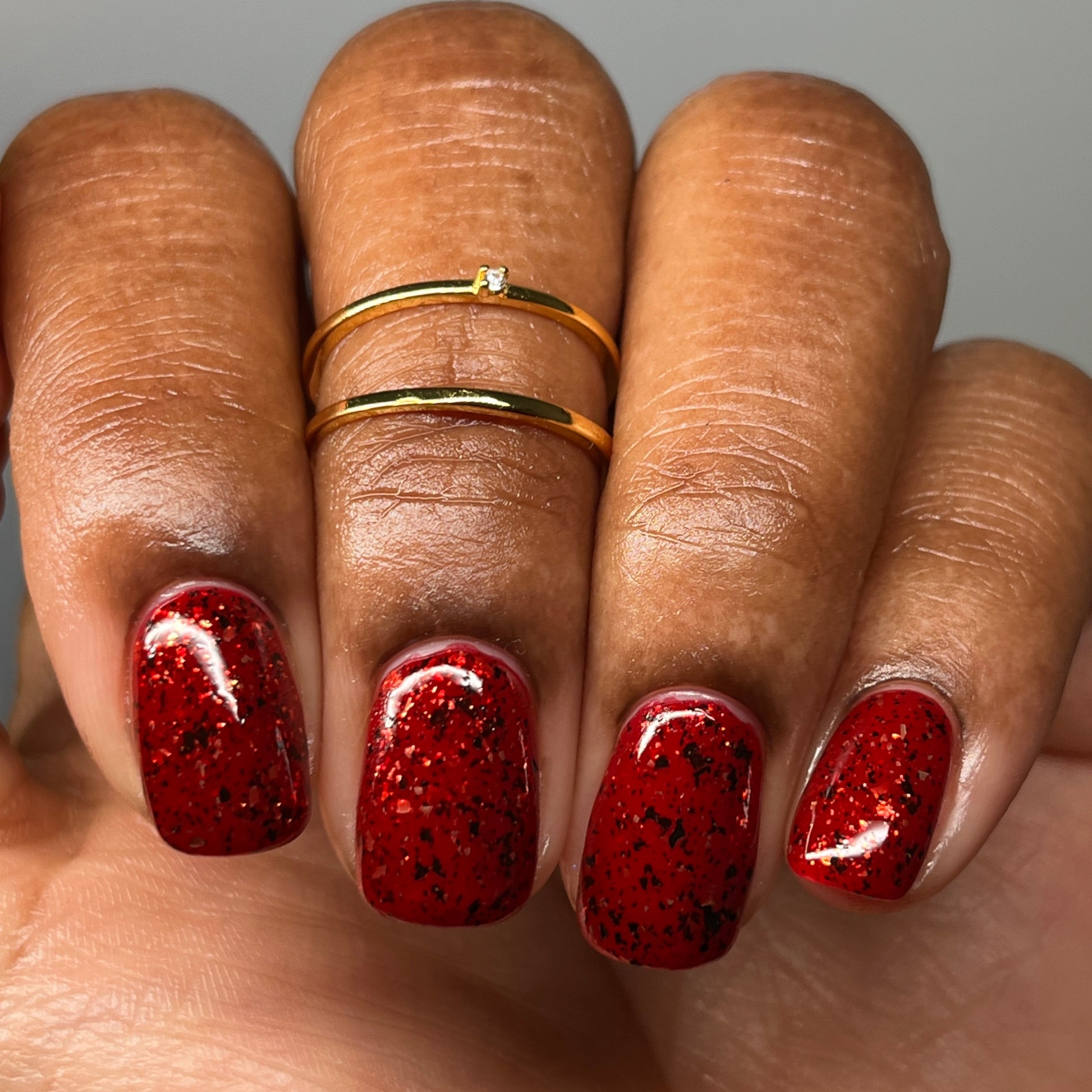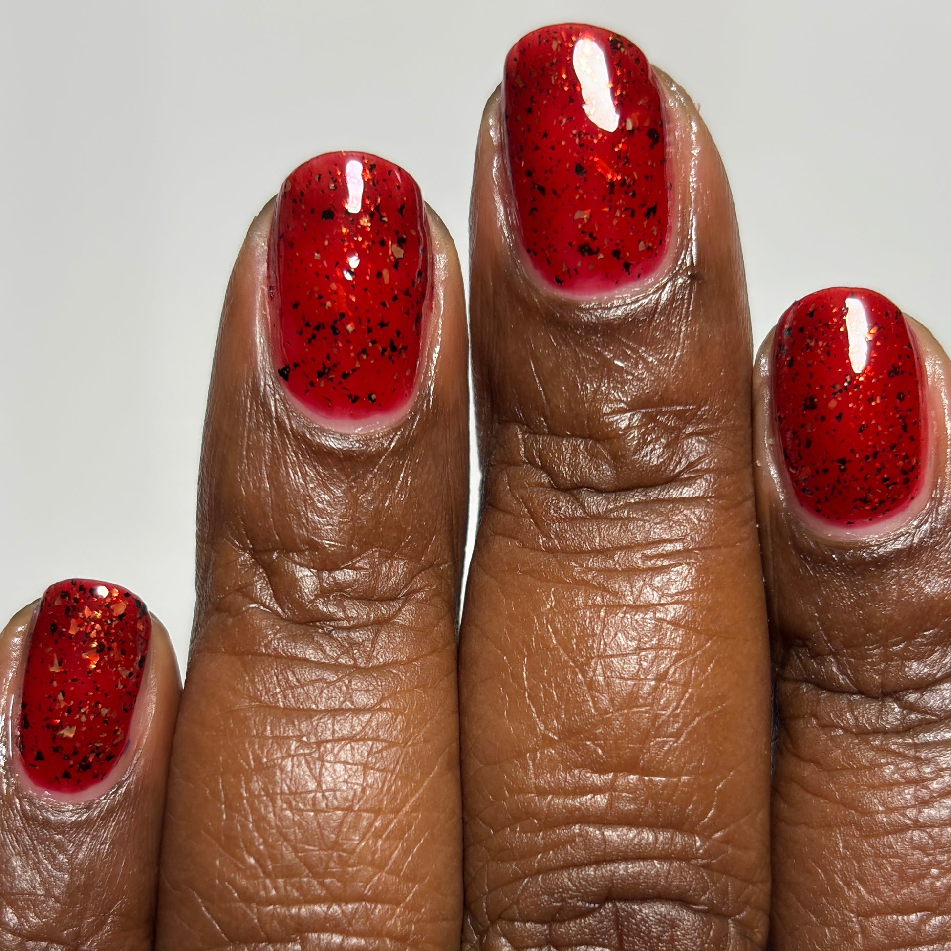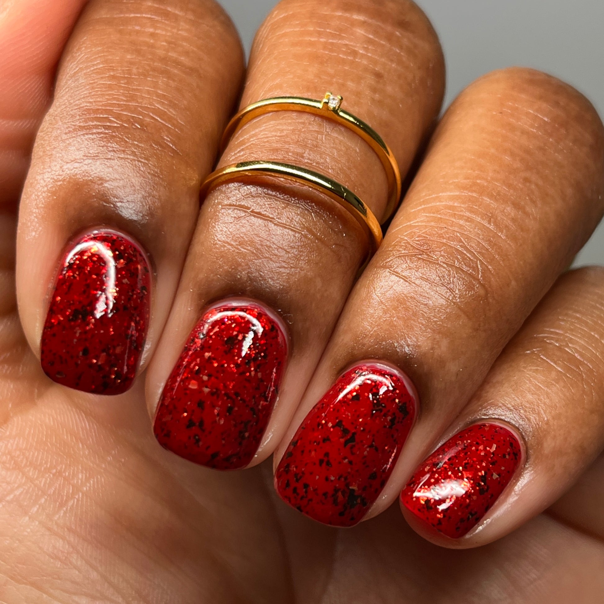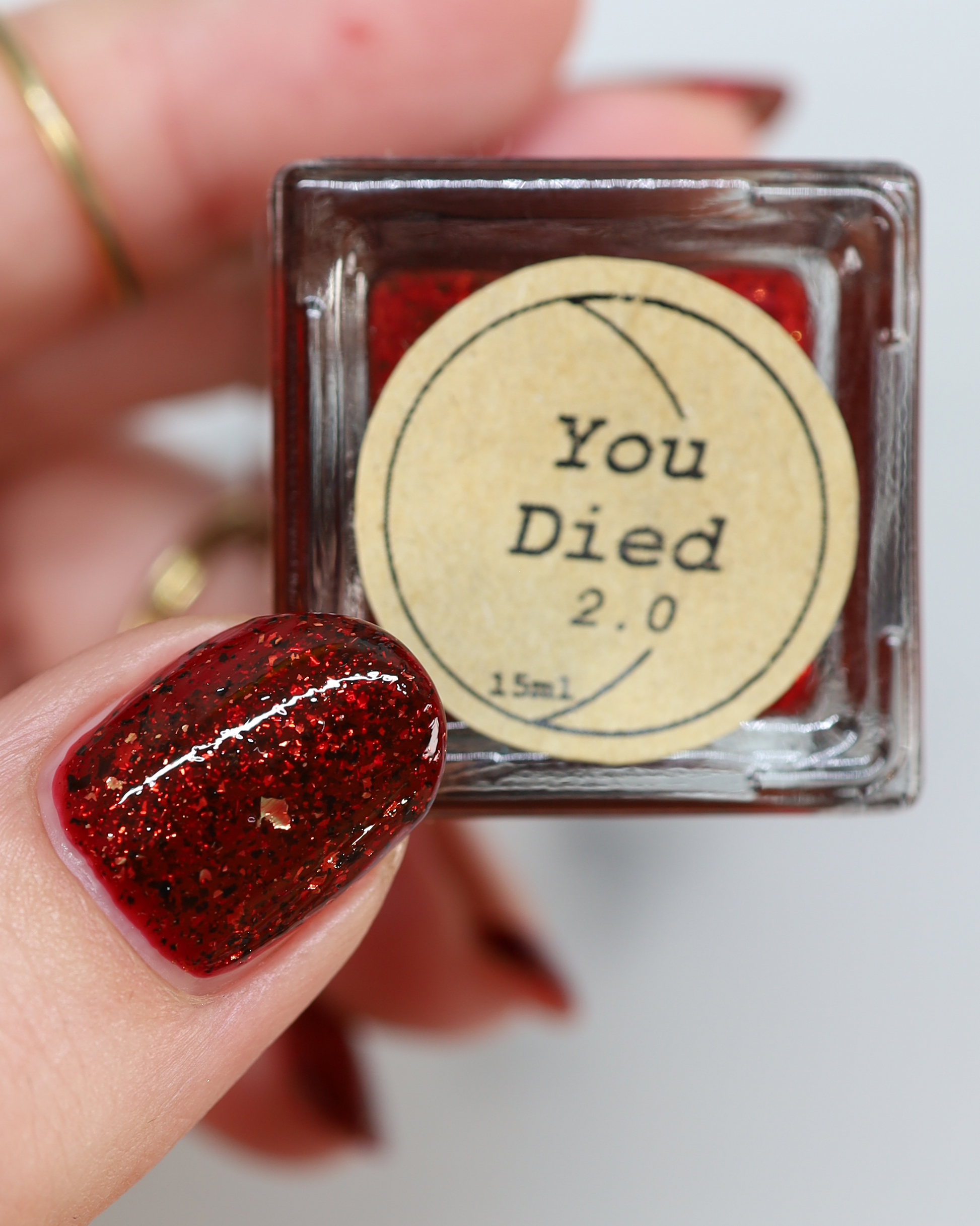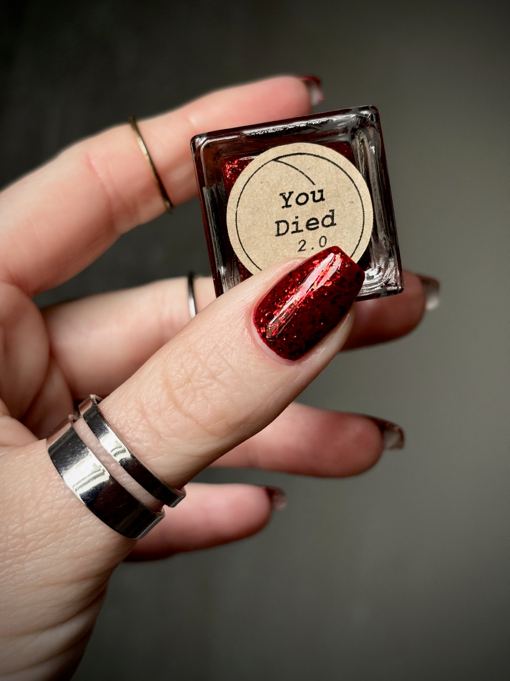 You Died 2.0 is our remixed version of You Died. This polish is a deep red jelly with gold metallic flakes and black metallic flakes.