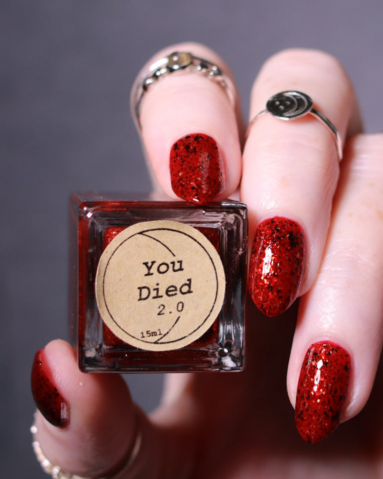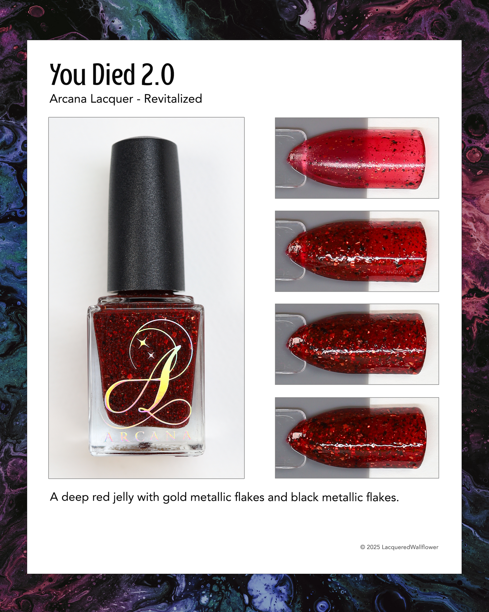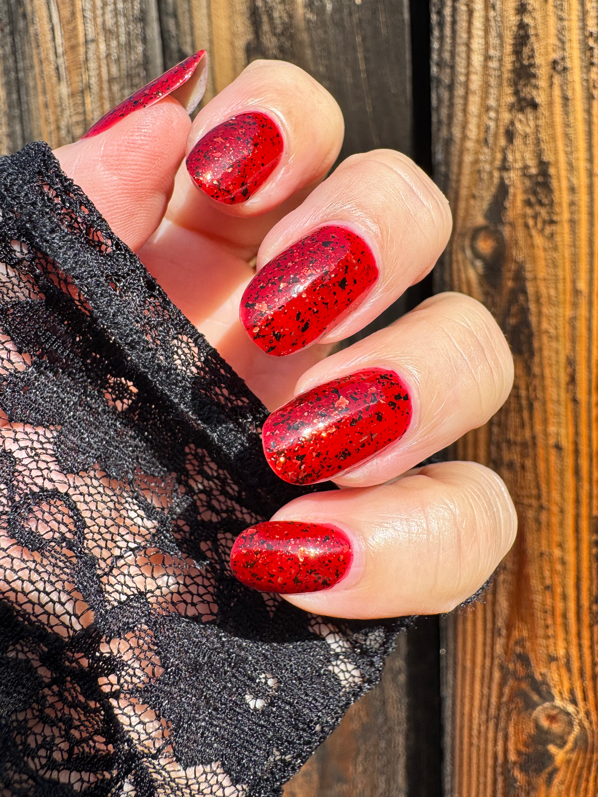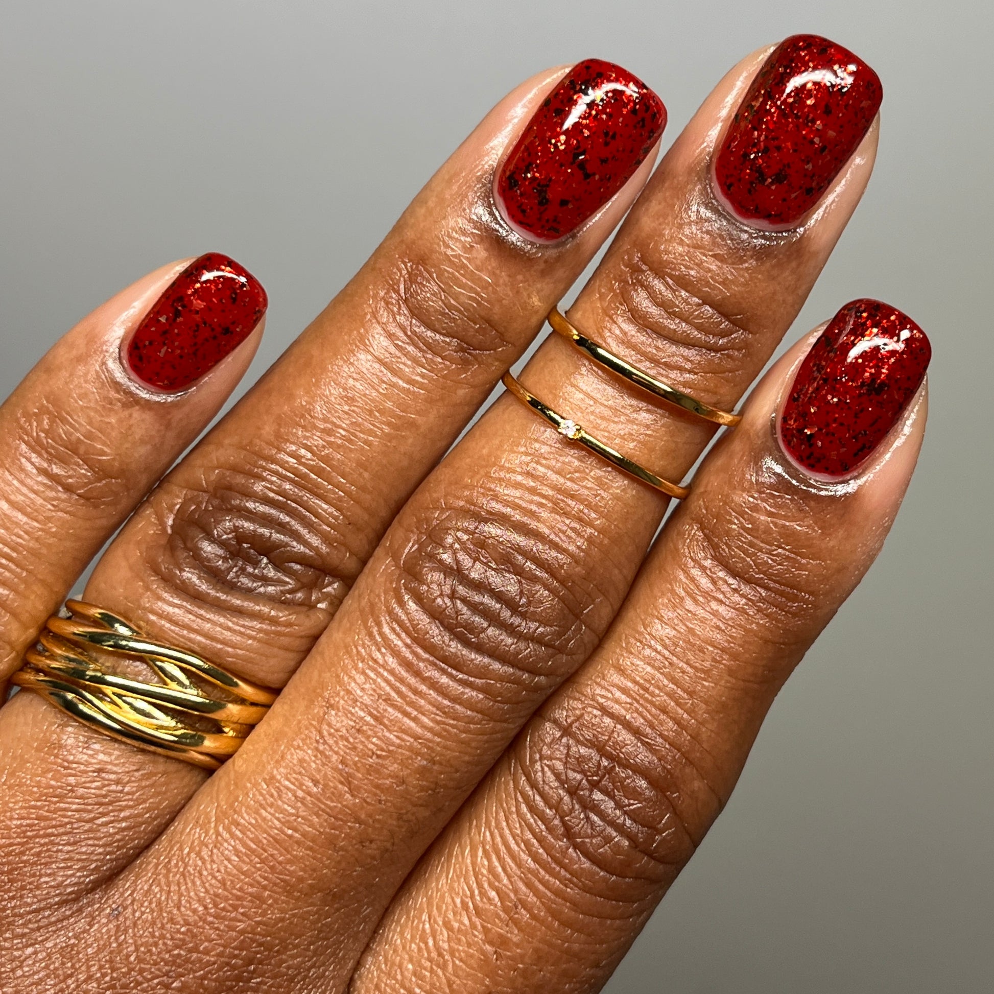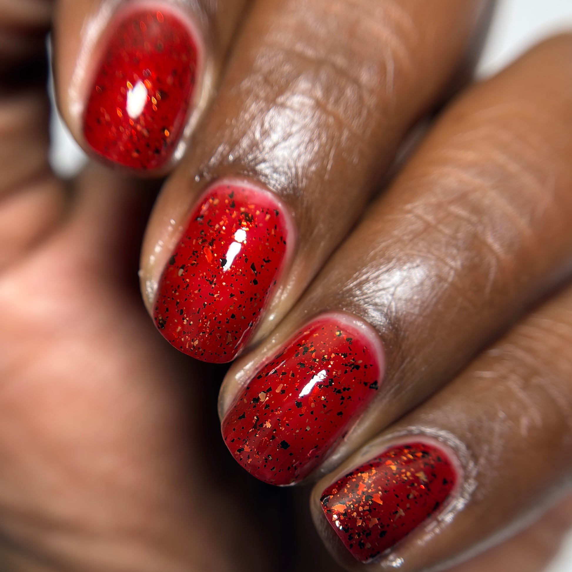 You Died 2.0 is our remixed version of You Died. This polish is a deep red jelly with gold metallic flakes and black metallic flakes.