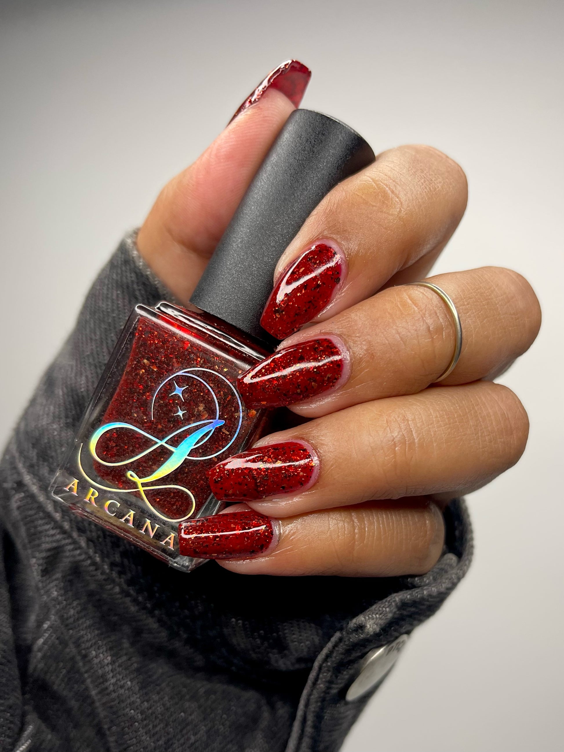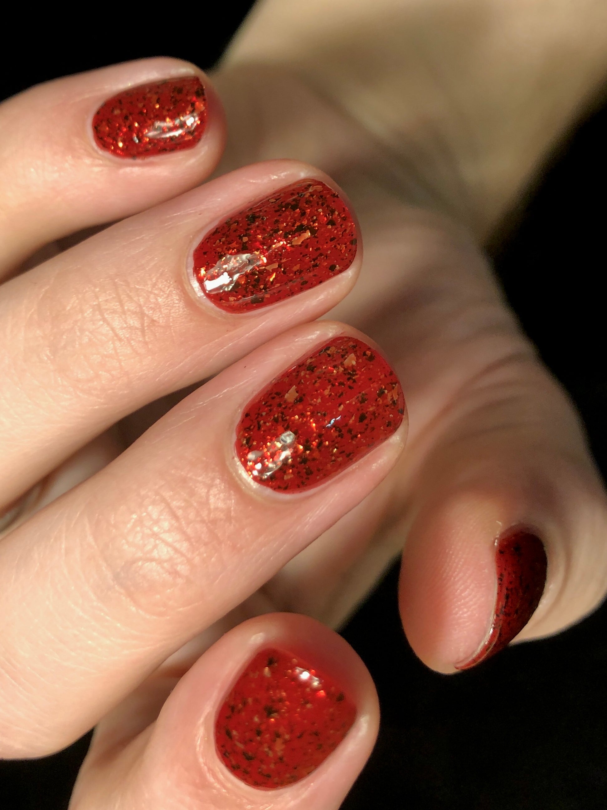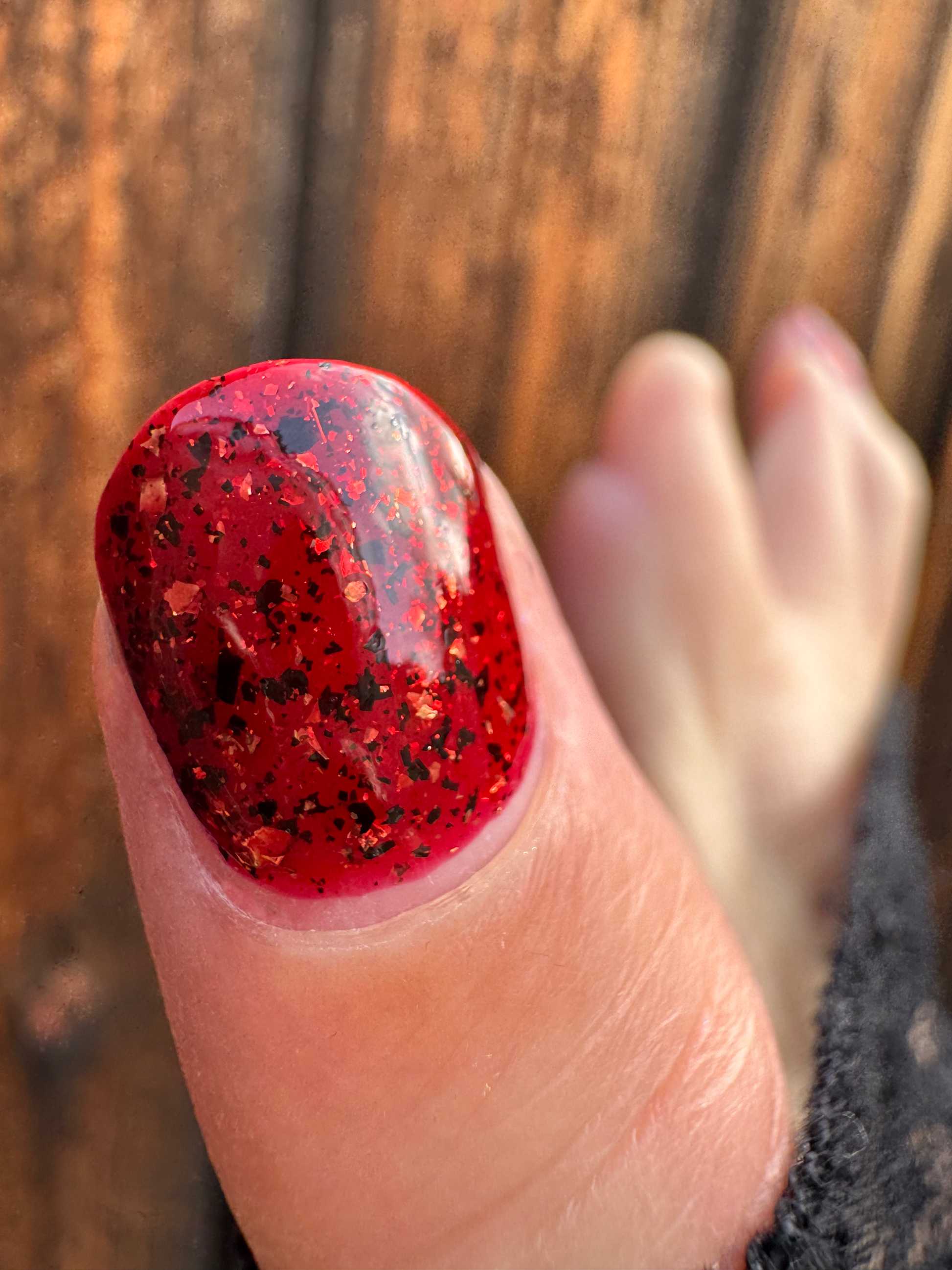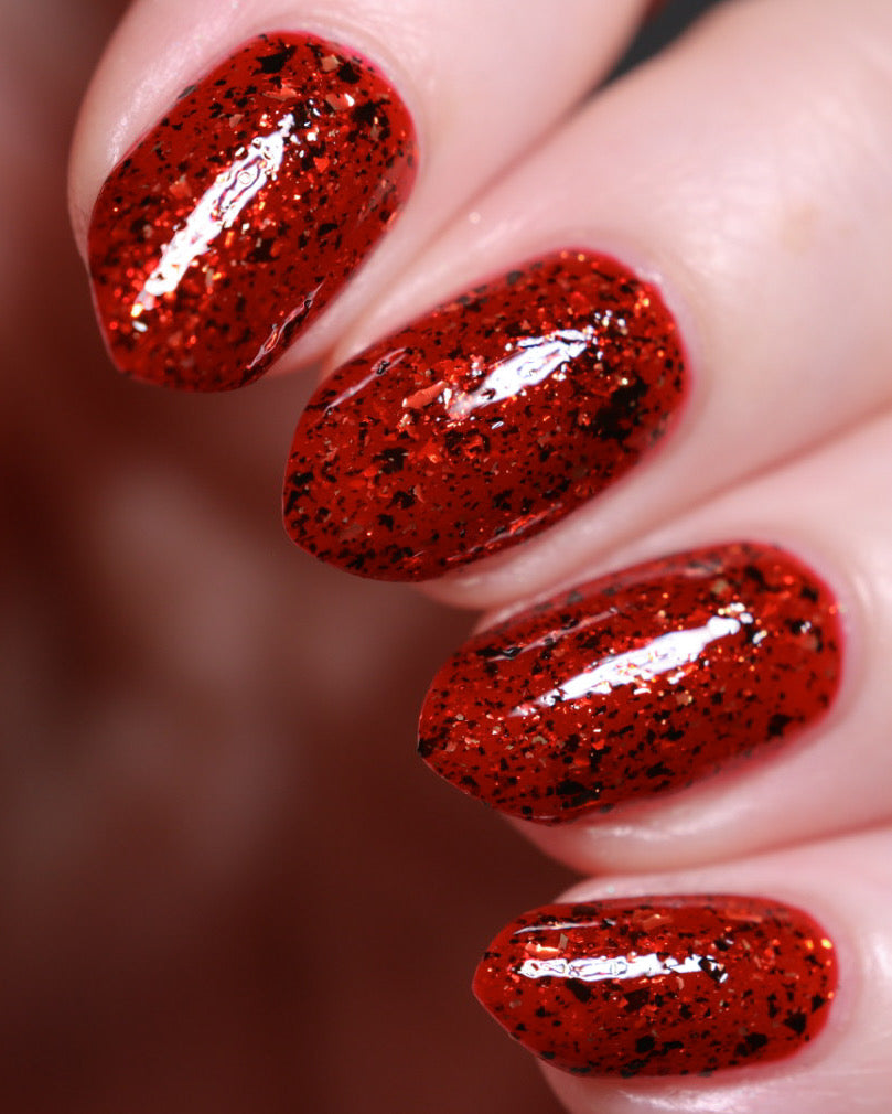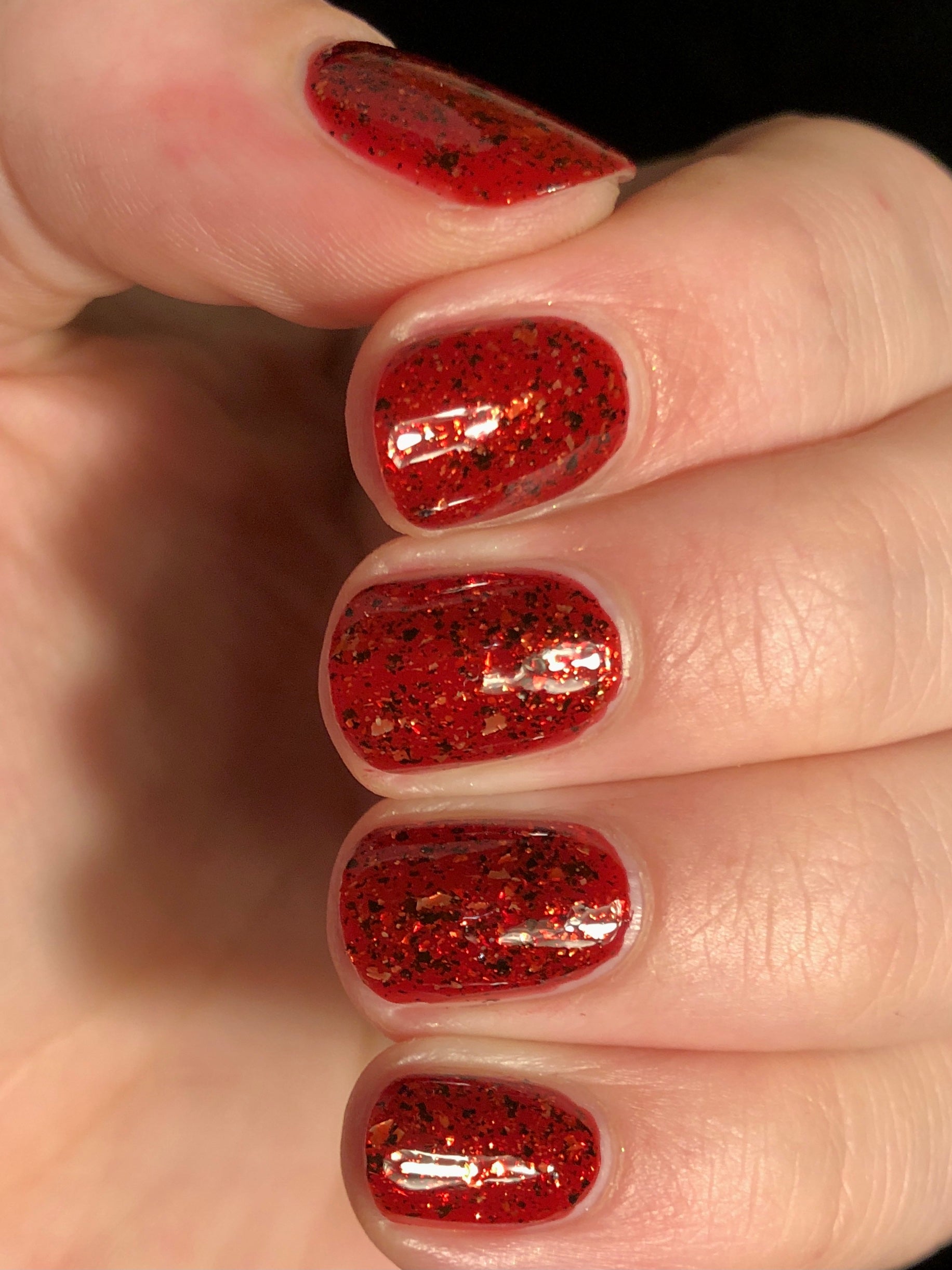 You Died 2.0 is our remixed version of You Died. This polish is a deep red jelly with gold metallic flakes and black metallic flakes.