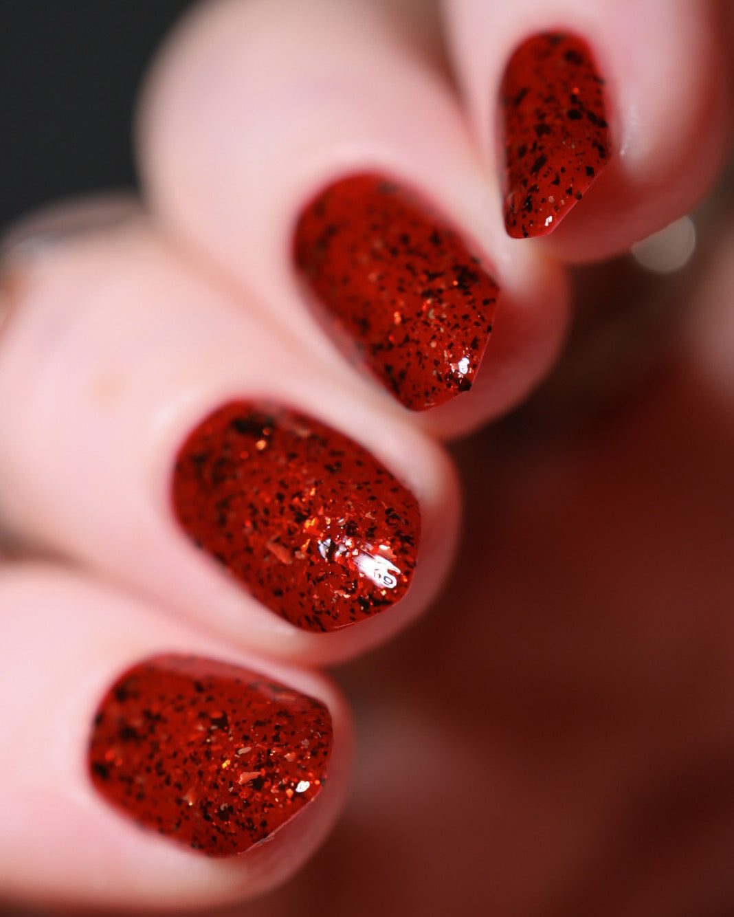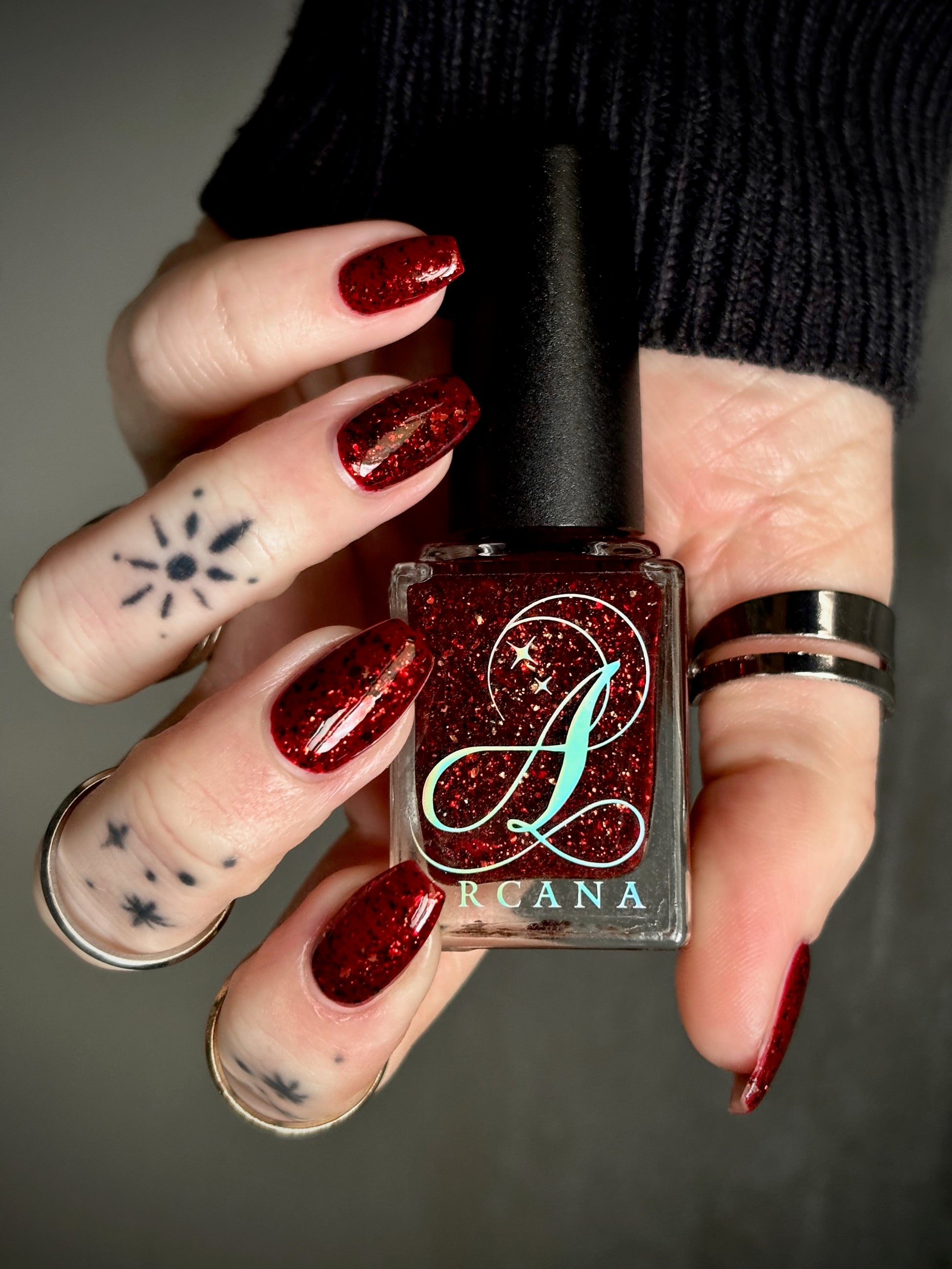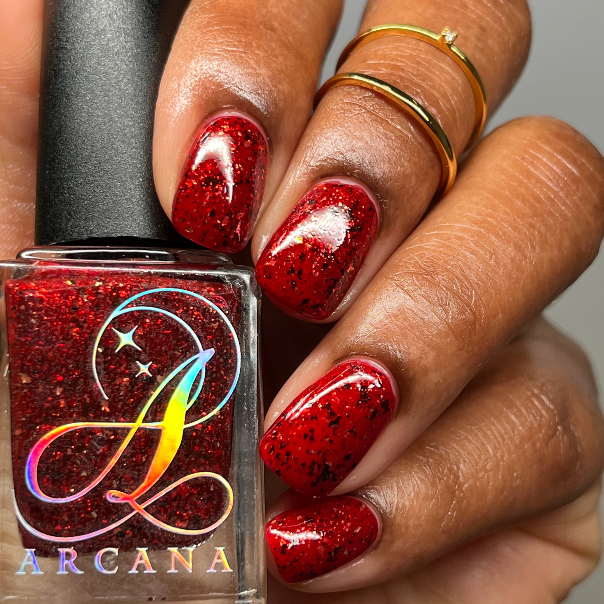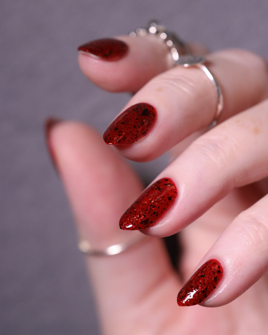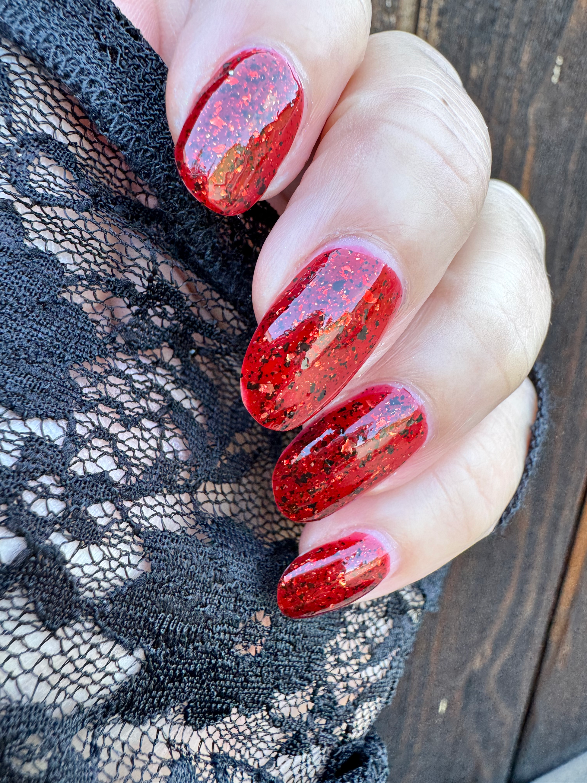 You Died 2.0 is our remixed version of You Died. This polish is a deep red jelly with gold metallic flakes and black metallic flakes.