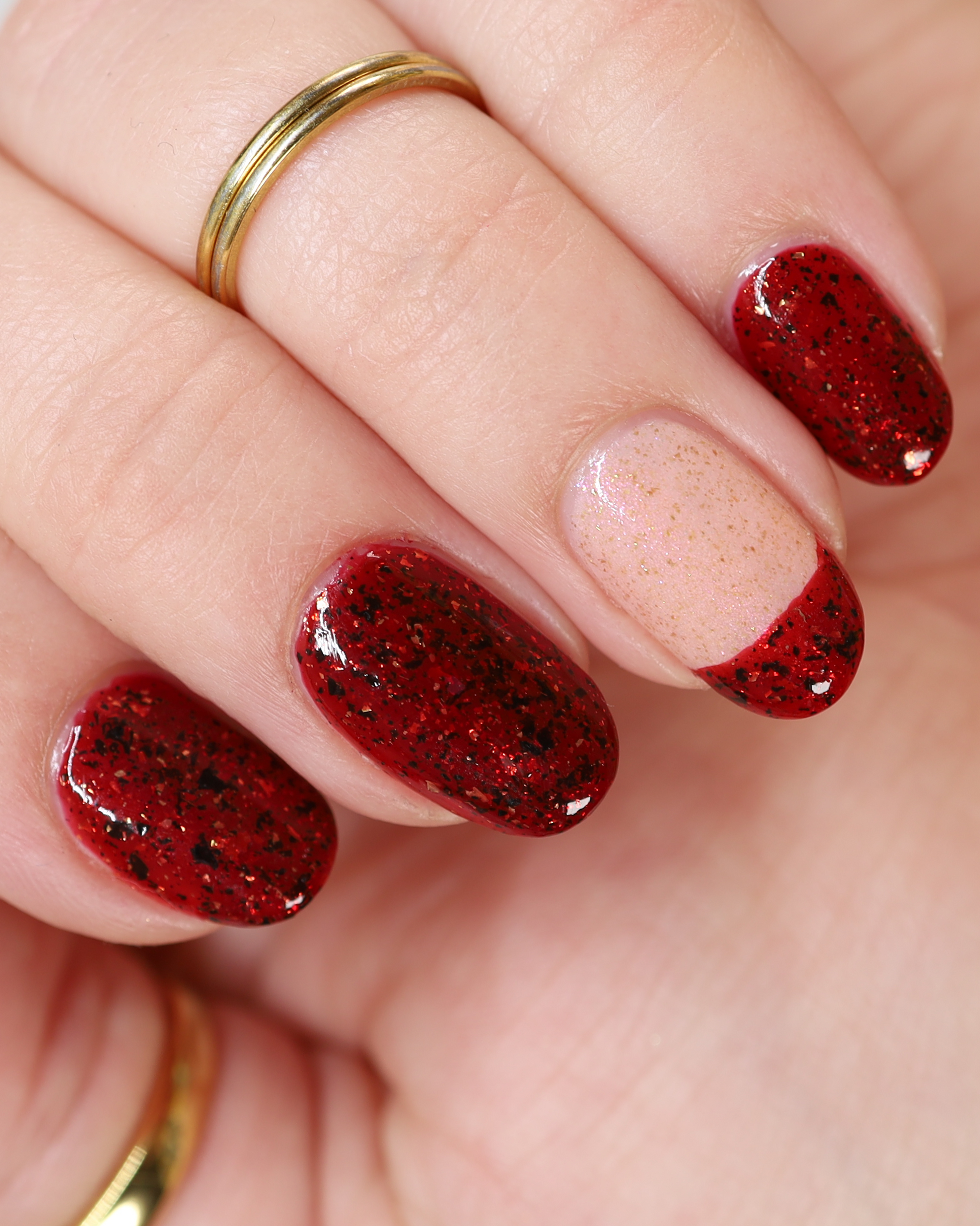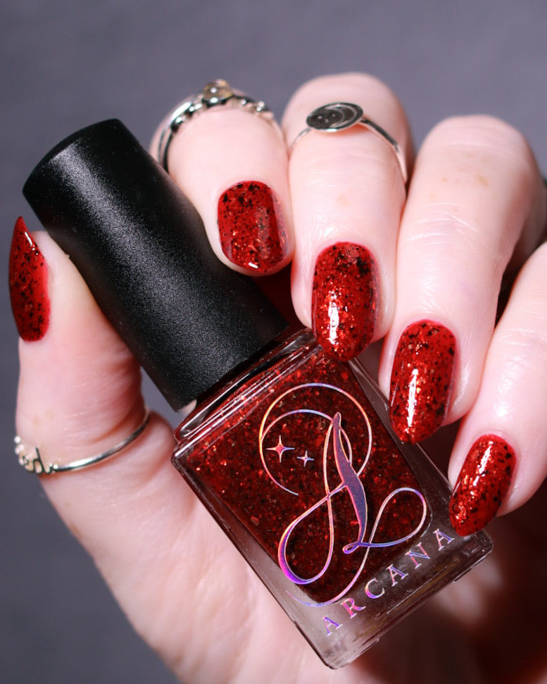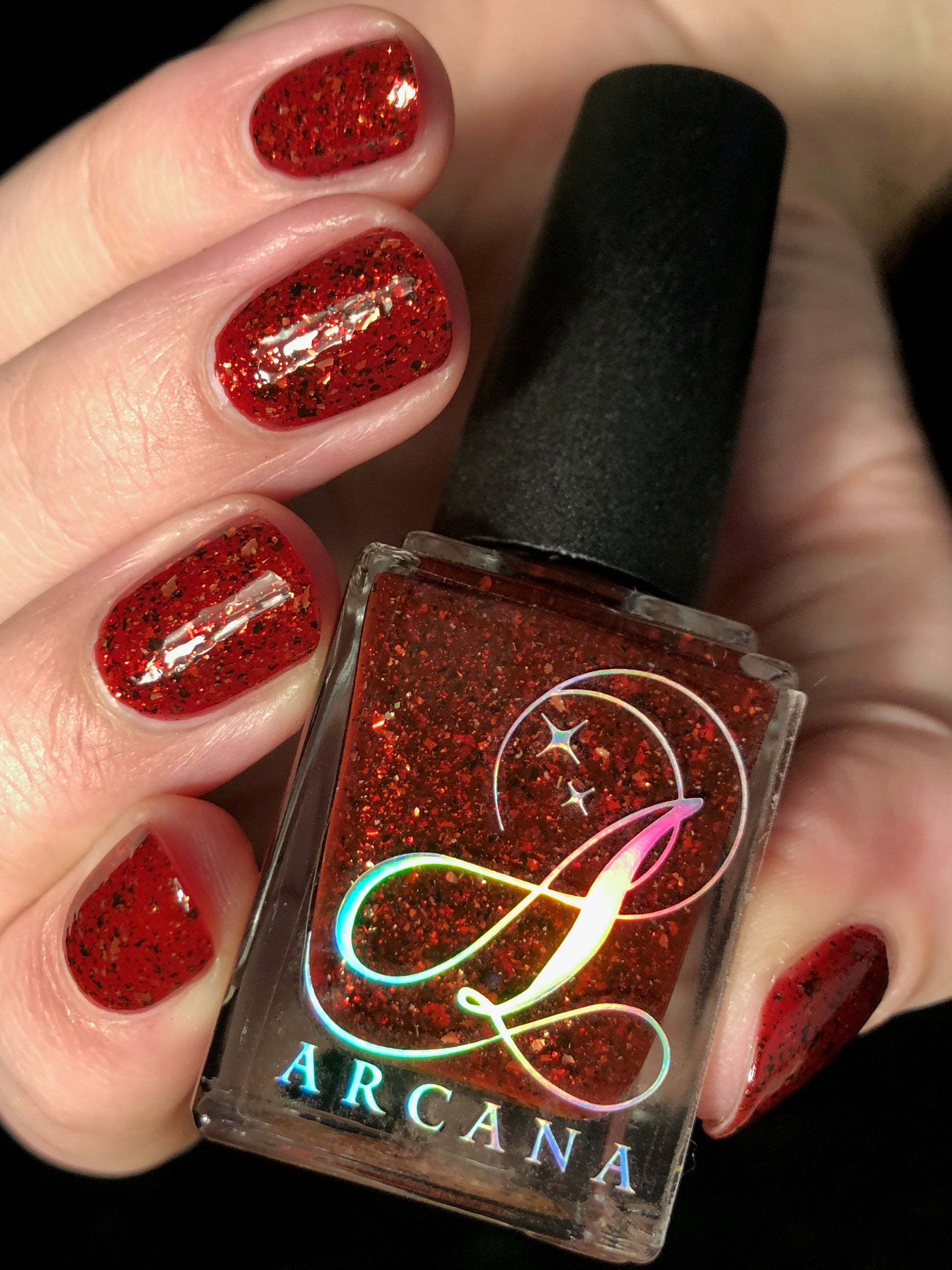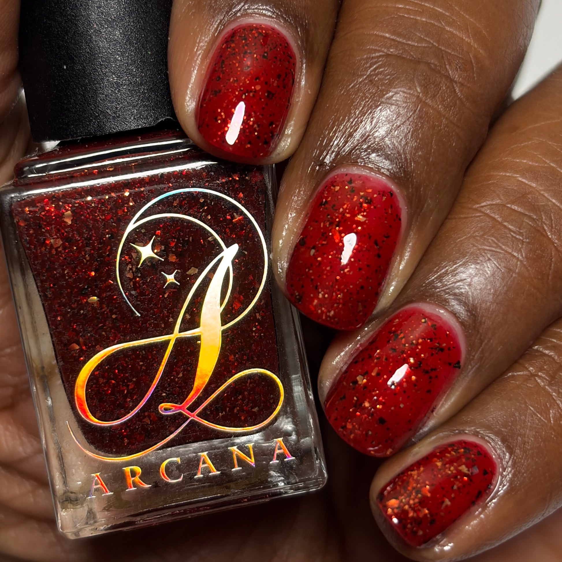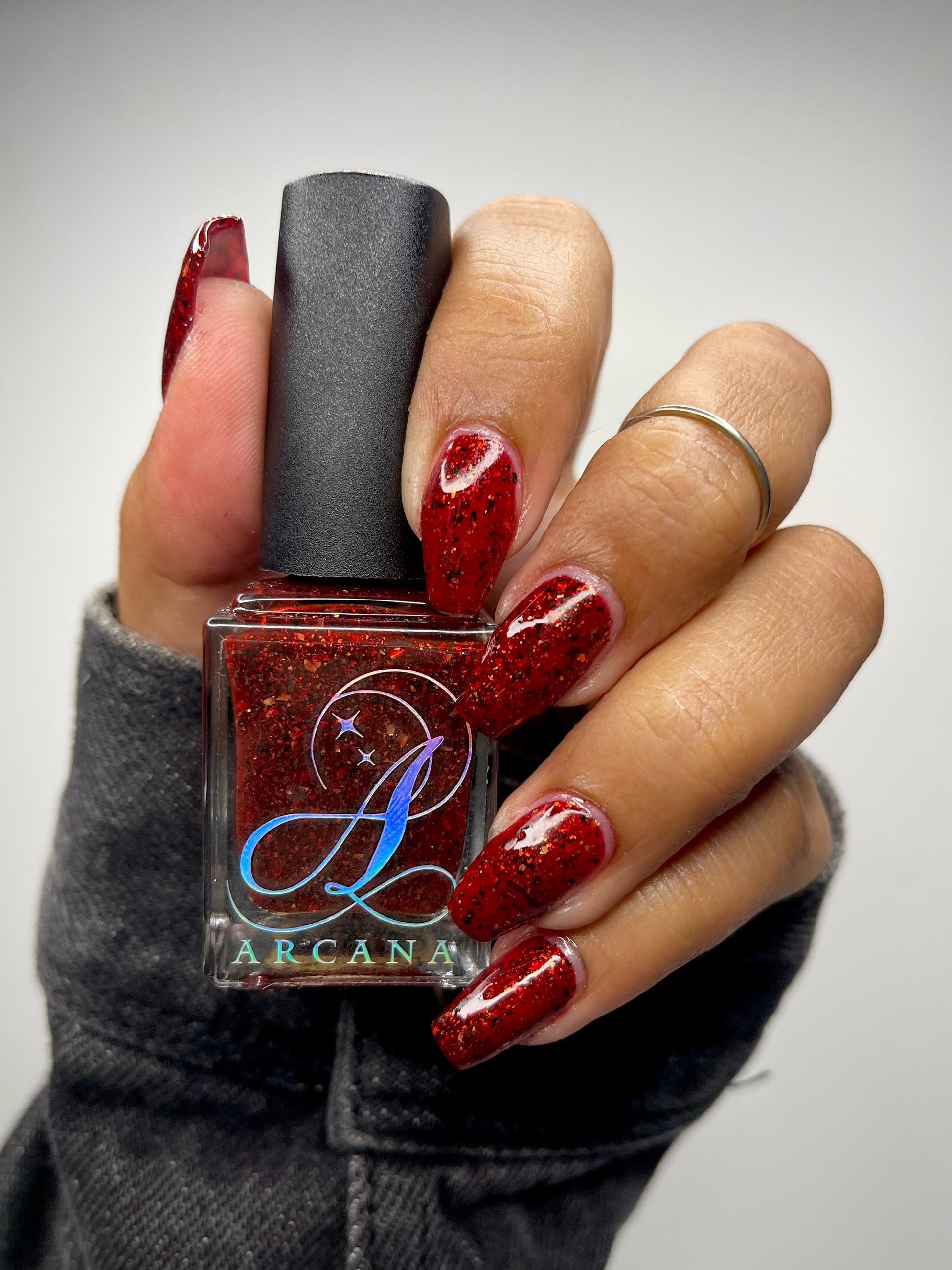 You Died 2.0 is our remixed version of You Died. This polish is a deep red jelly with gold metallic flakes and black metallic flakes.