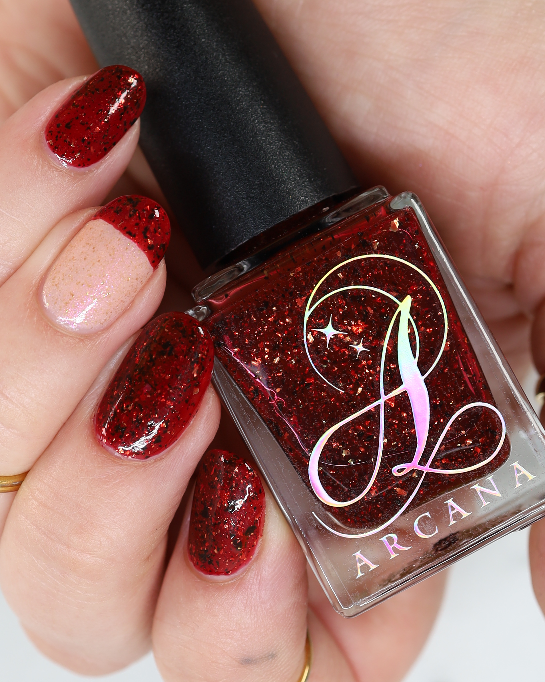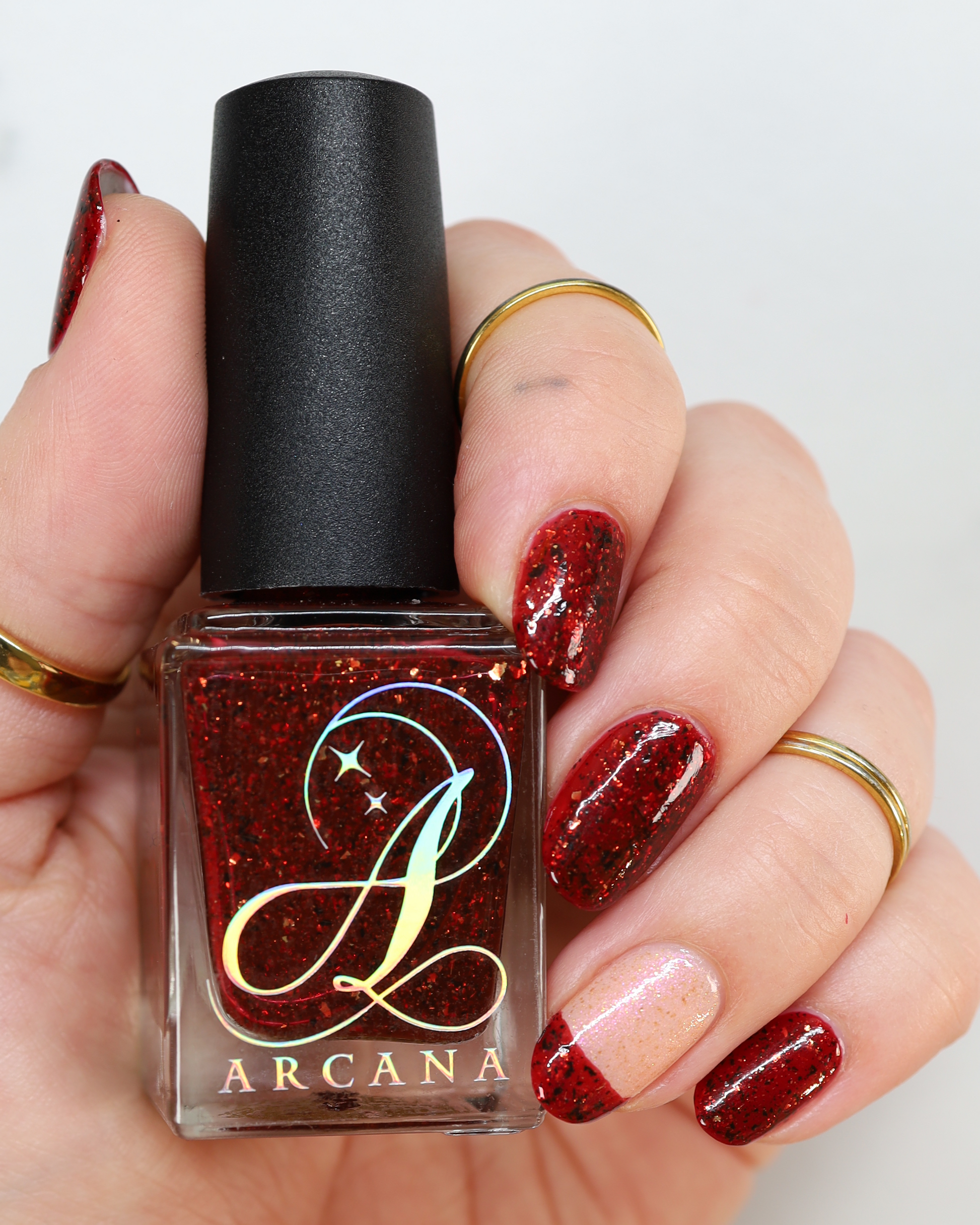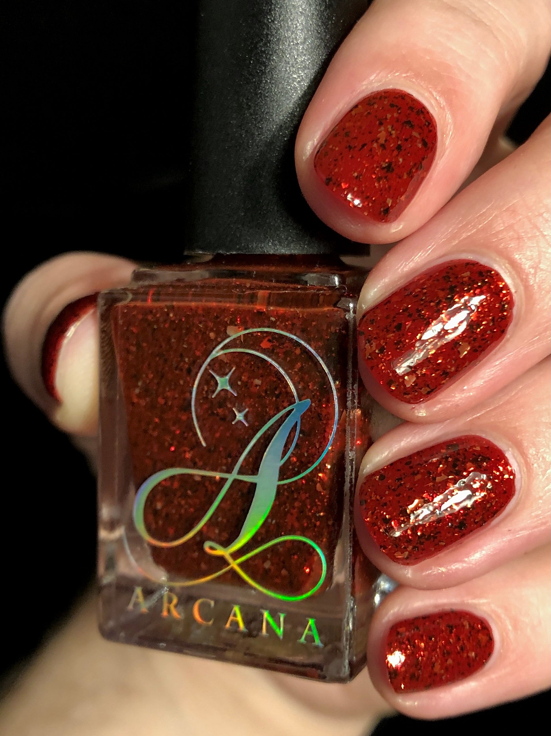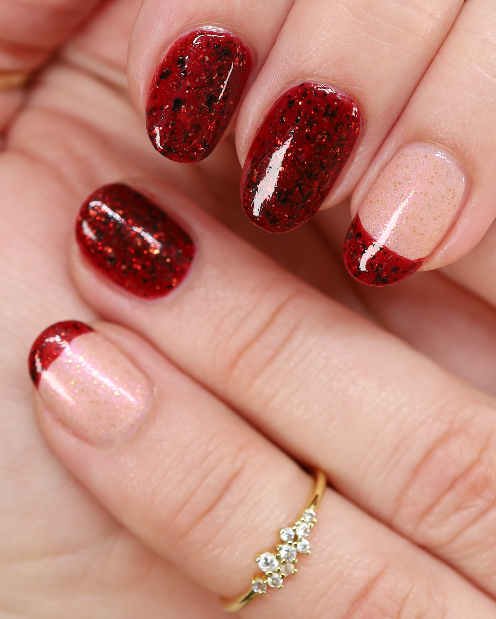 You Died 2.0 is our remixed version of You Died. This polish is a deep red jelly with gold metallic flakes and black metallic flakes.