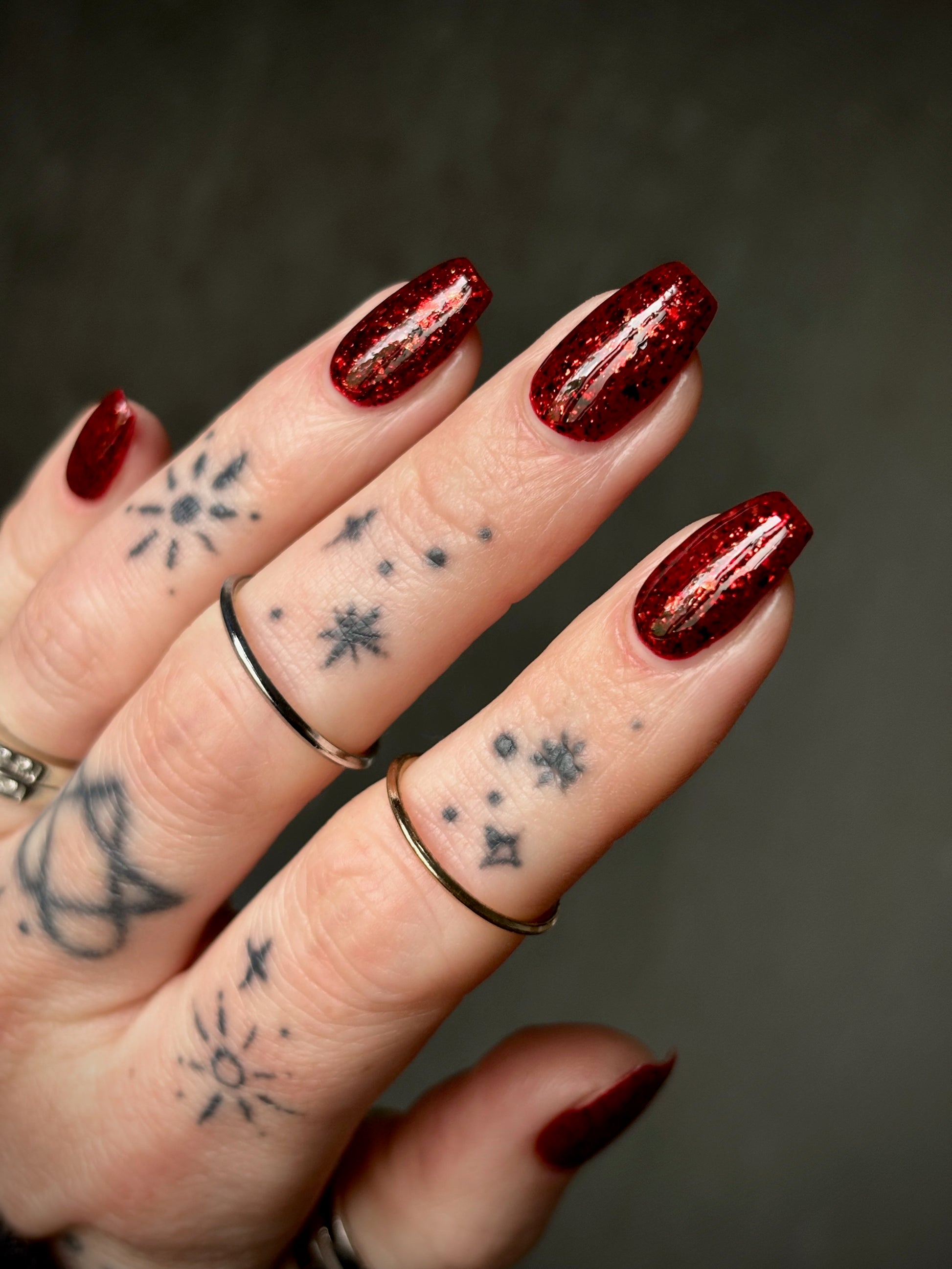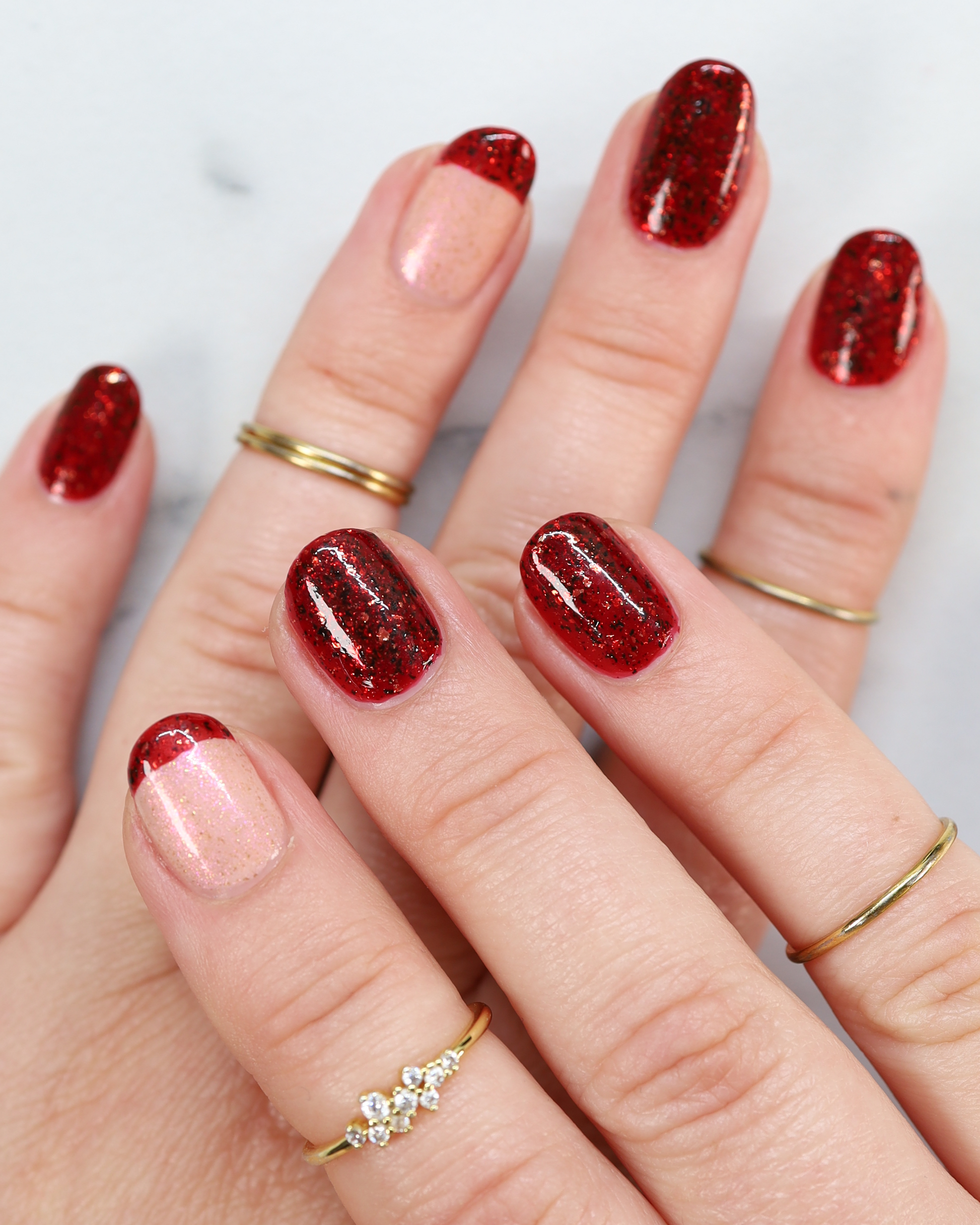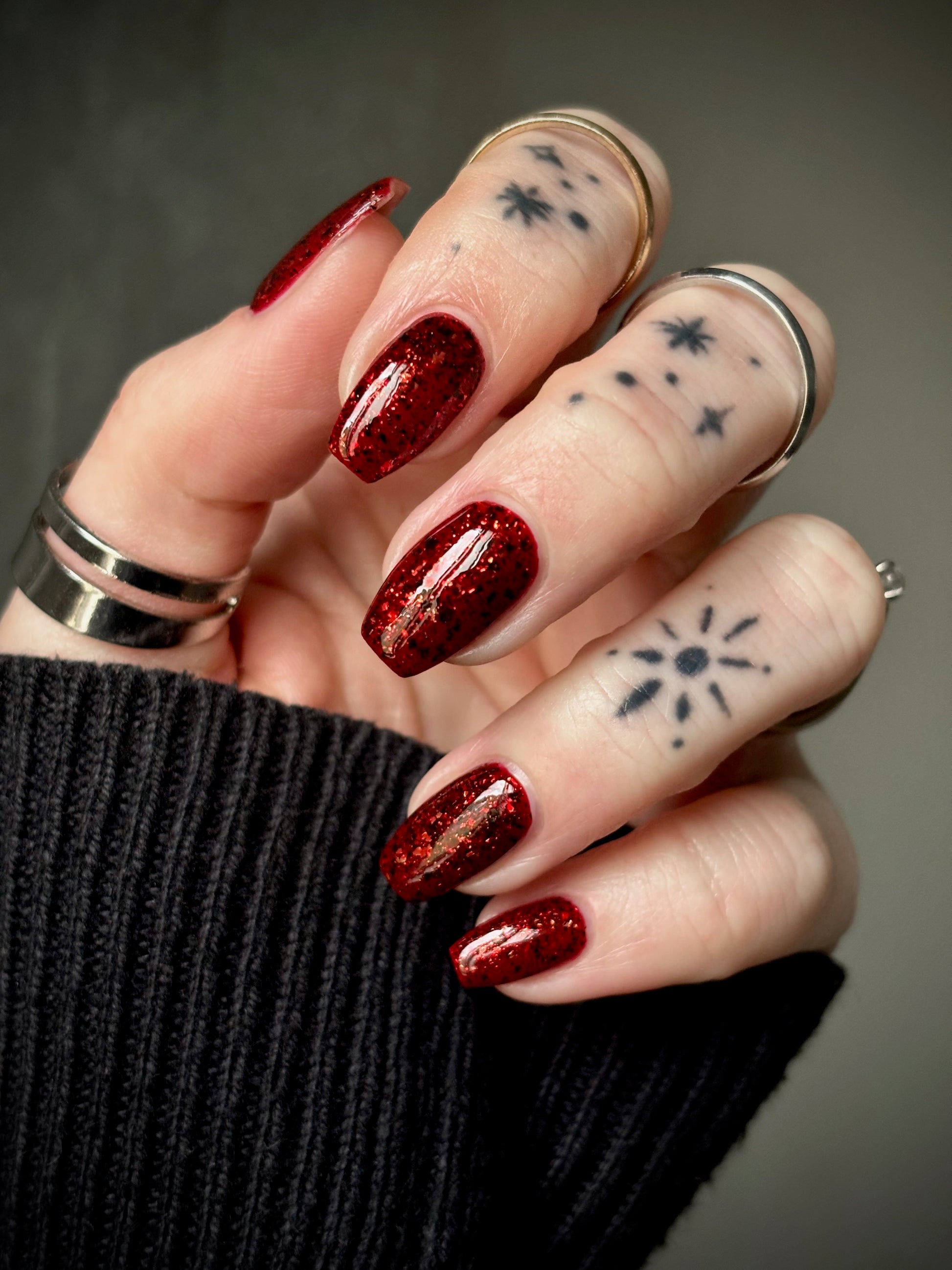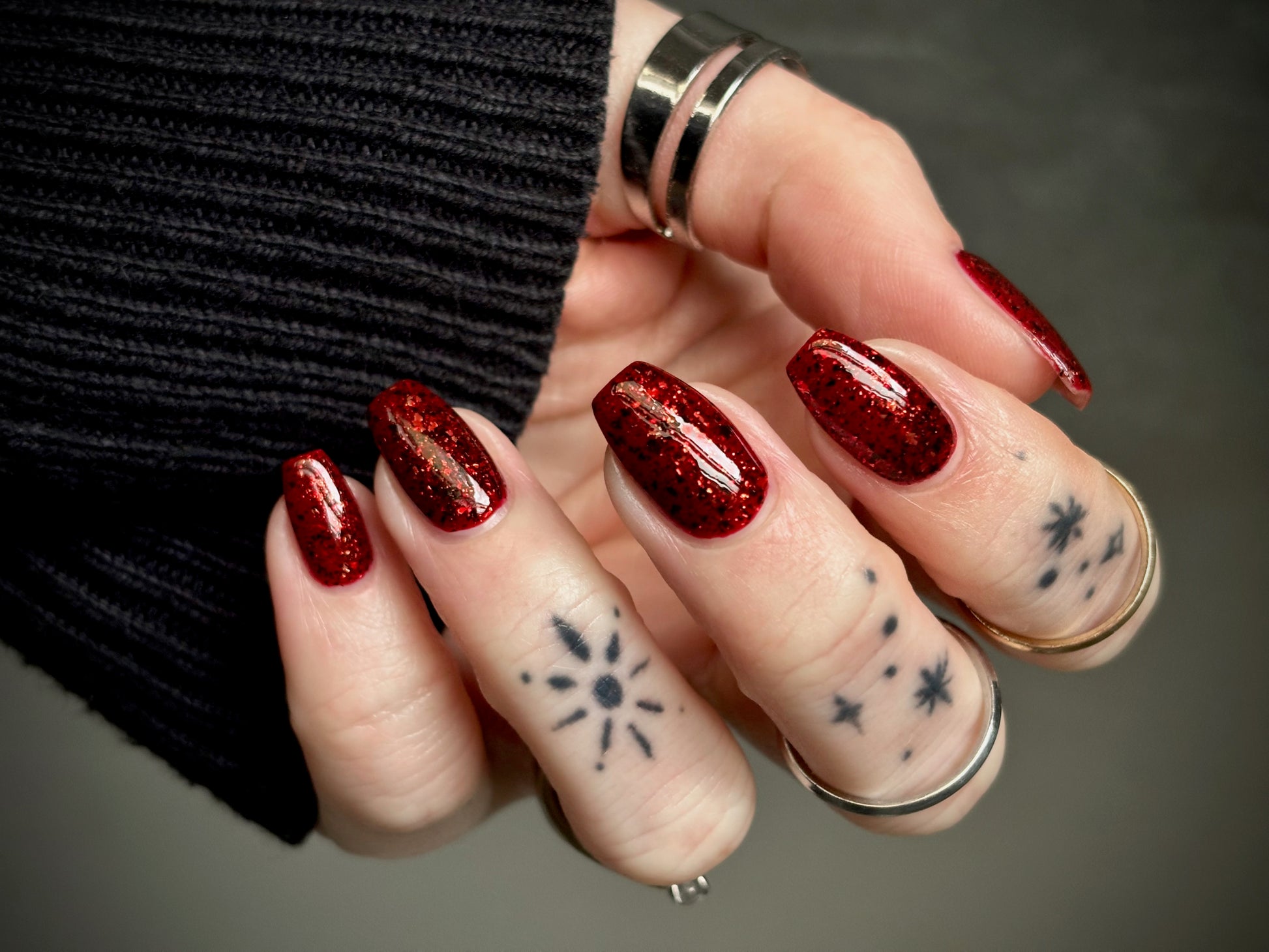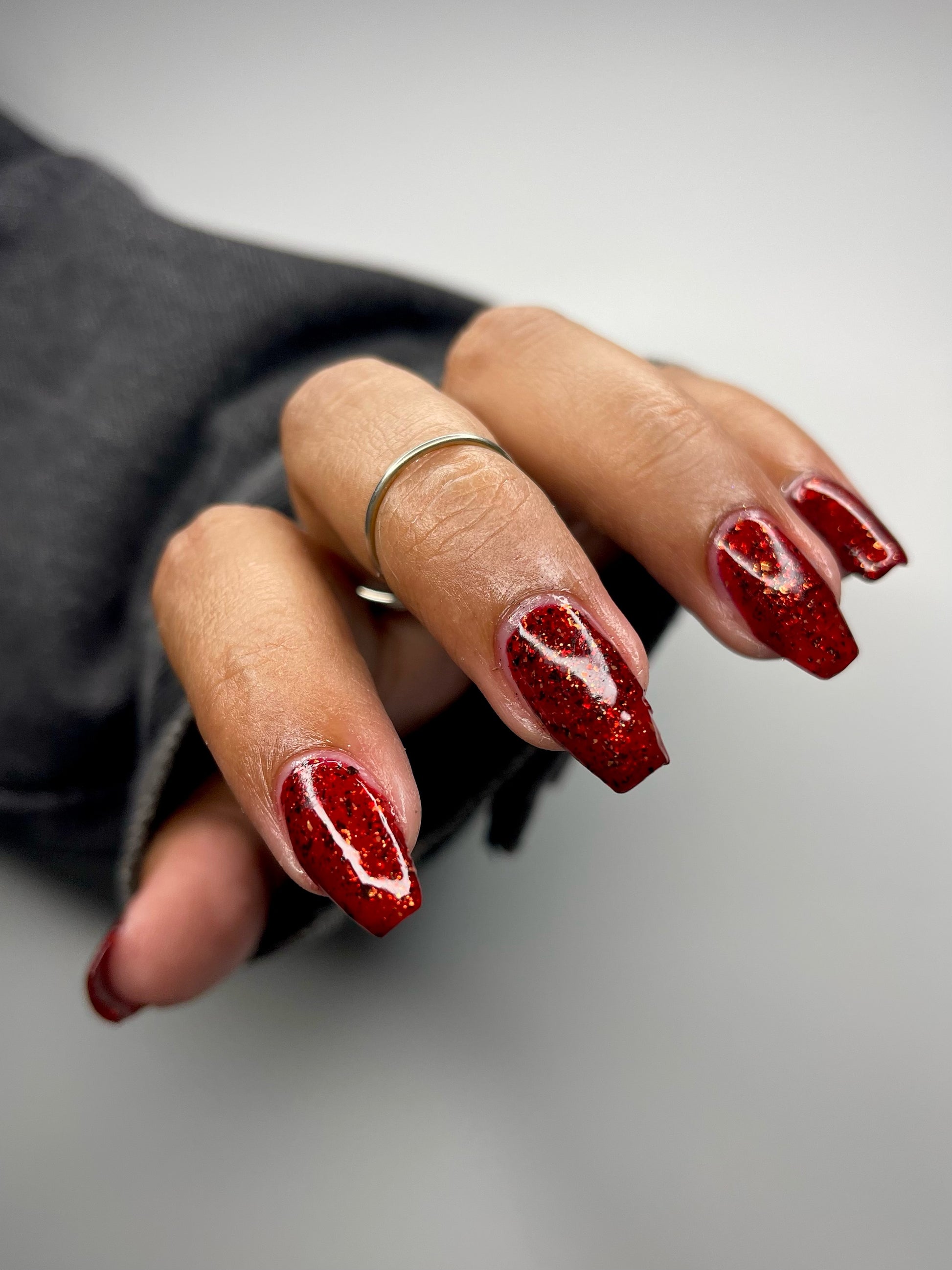 You Died 2.0 is our remixed version of You Died. This polish is a deep red jelly with gold metallic flakes and black metallic flakes.